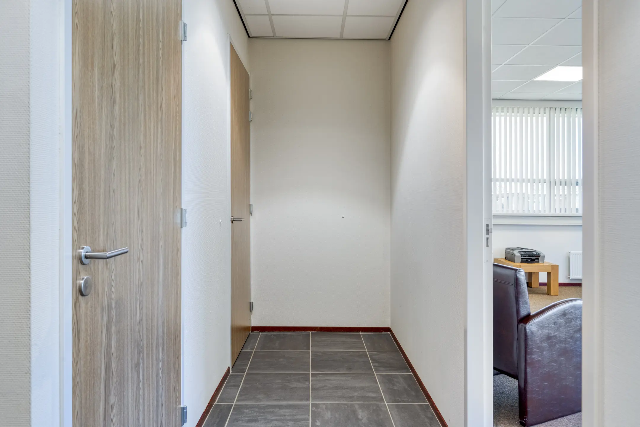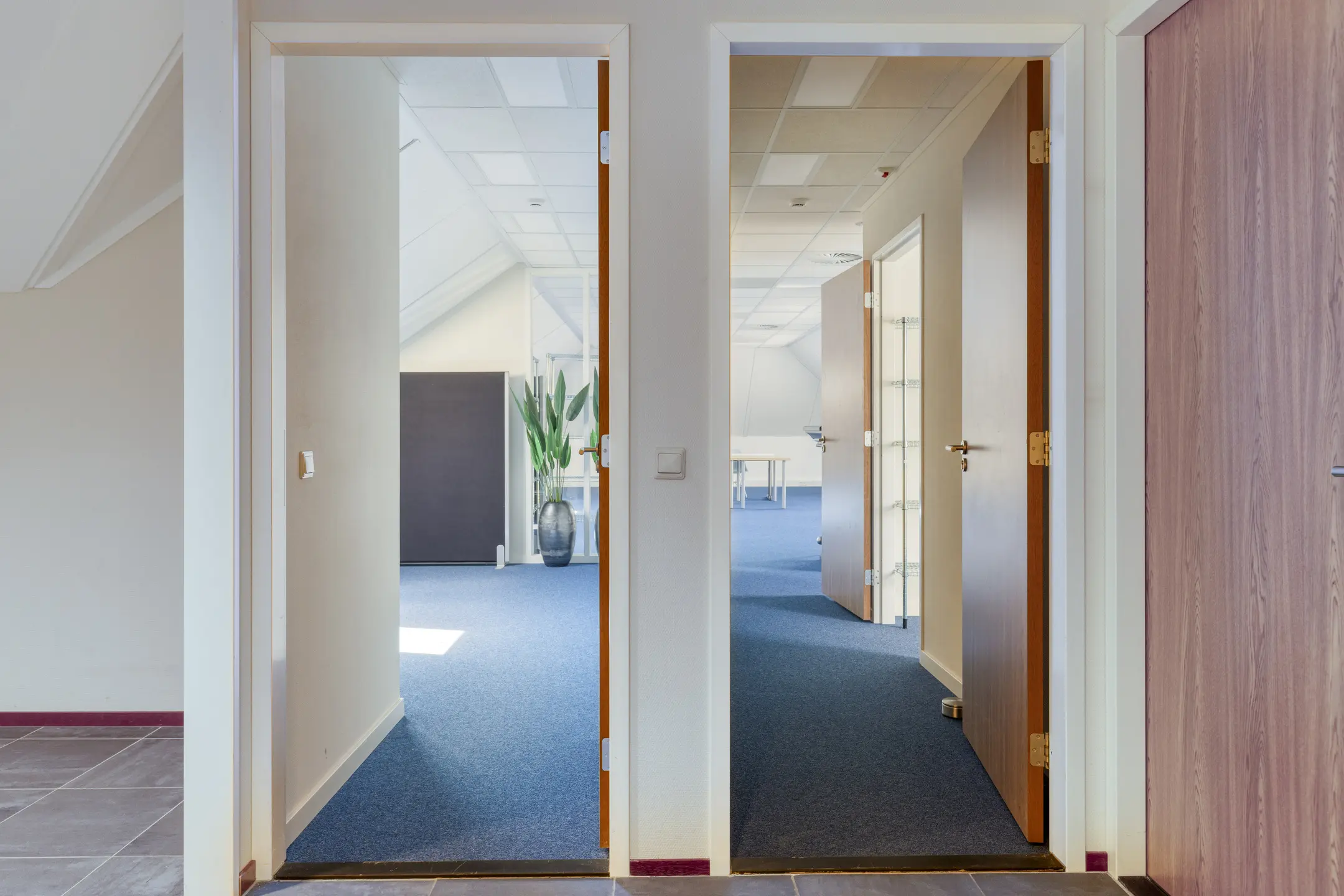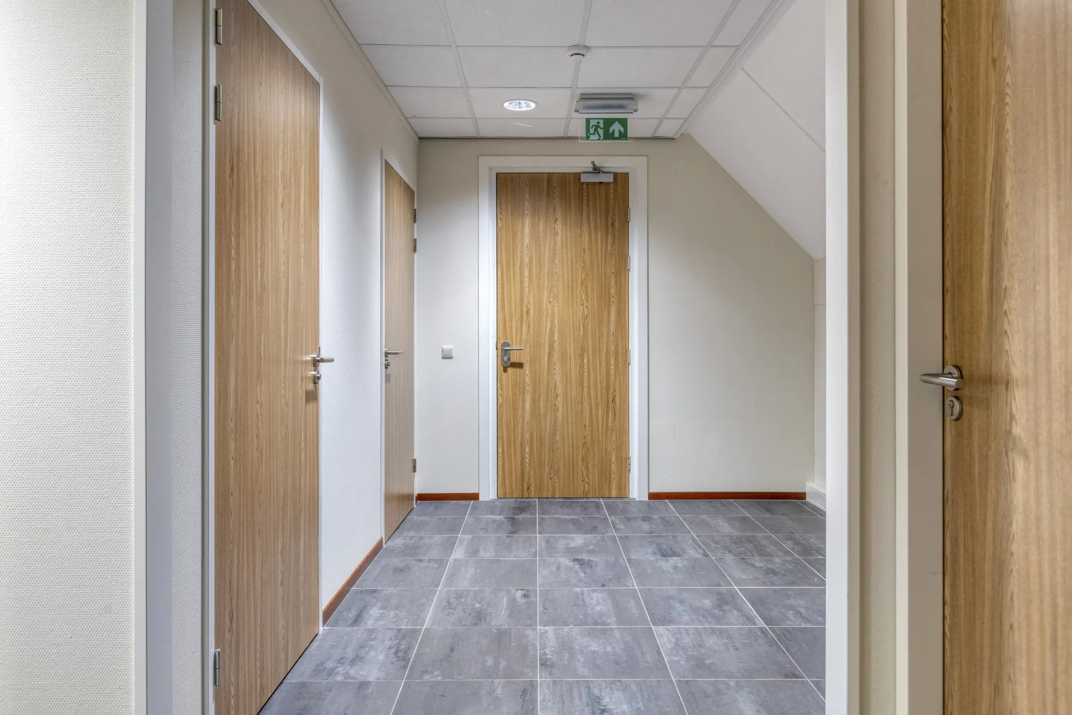 Overloop met toegang tot twee kantoorruimtes en de toiletruimtes. Trap naar de 2e verdieping.