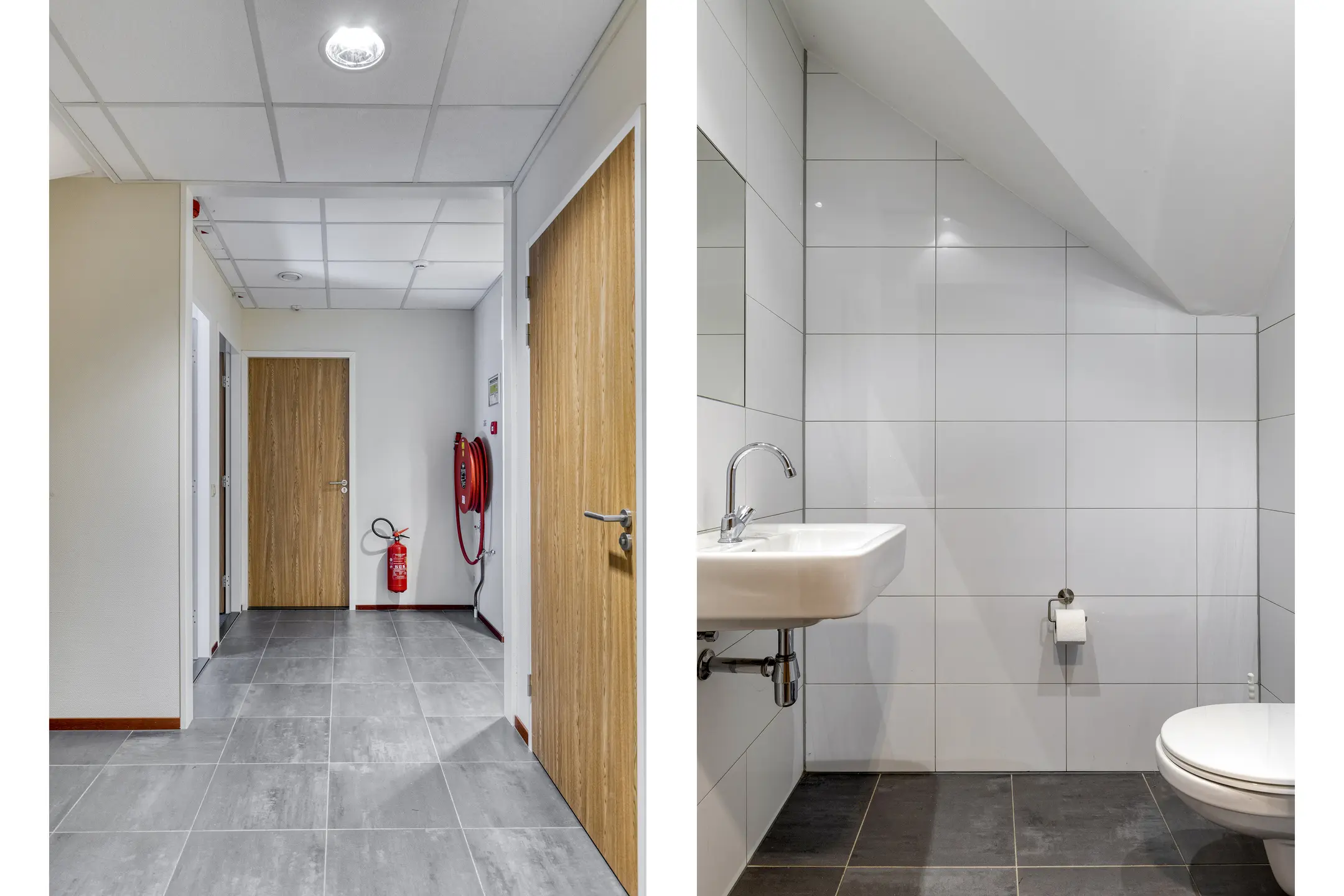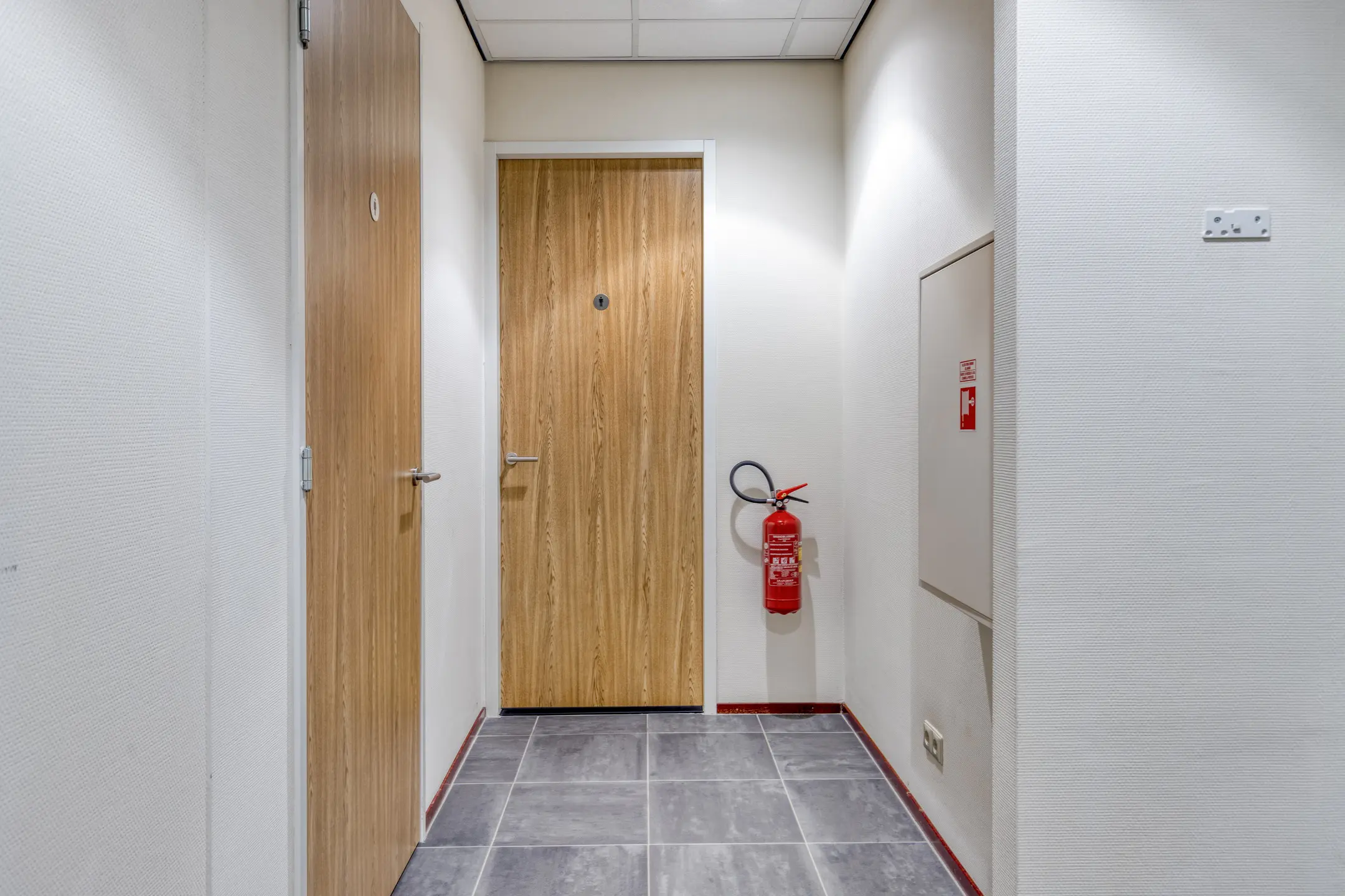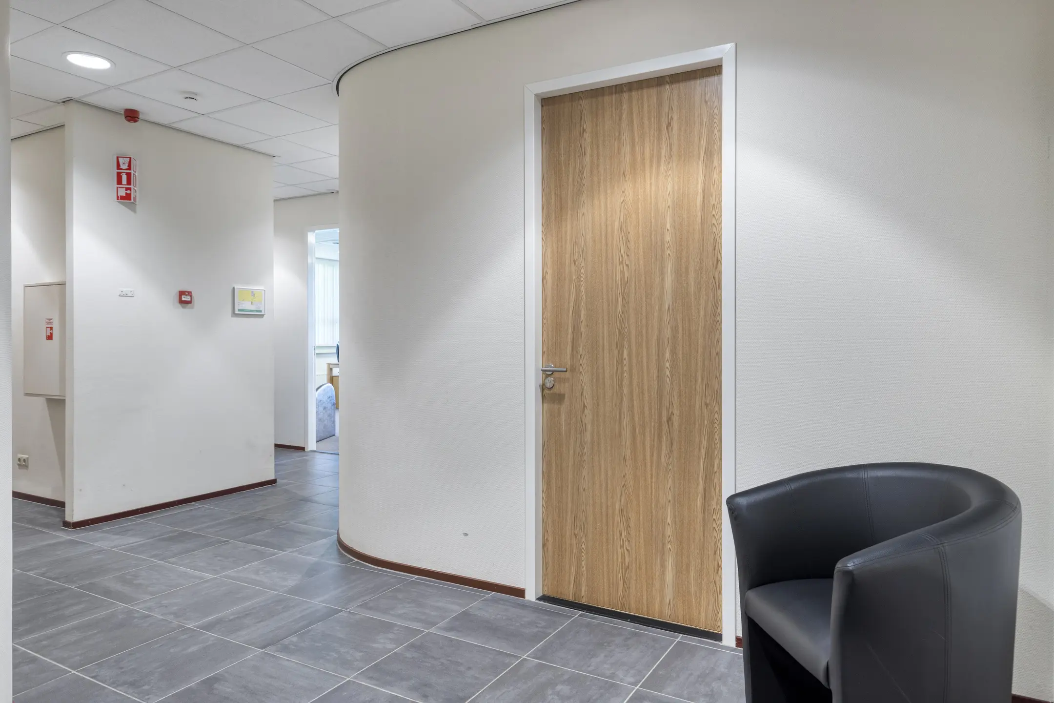 Overloop met toegang tot twee kantoorruimtes en de toiletruimtes. Trap naar de 2e verdieping.