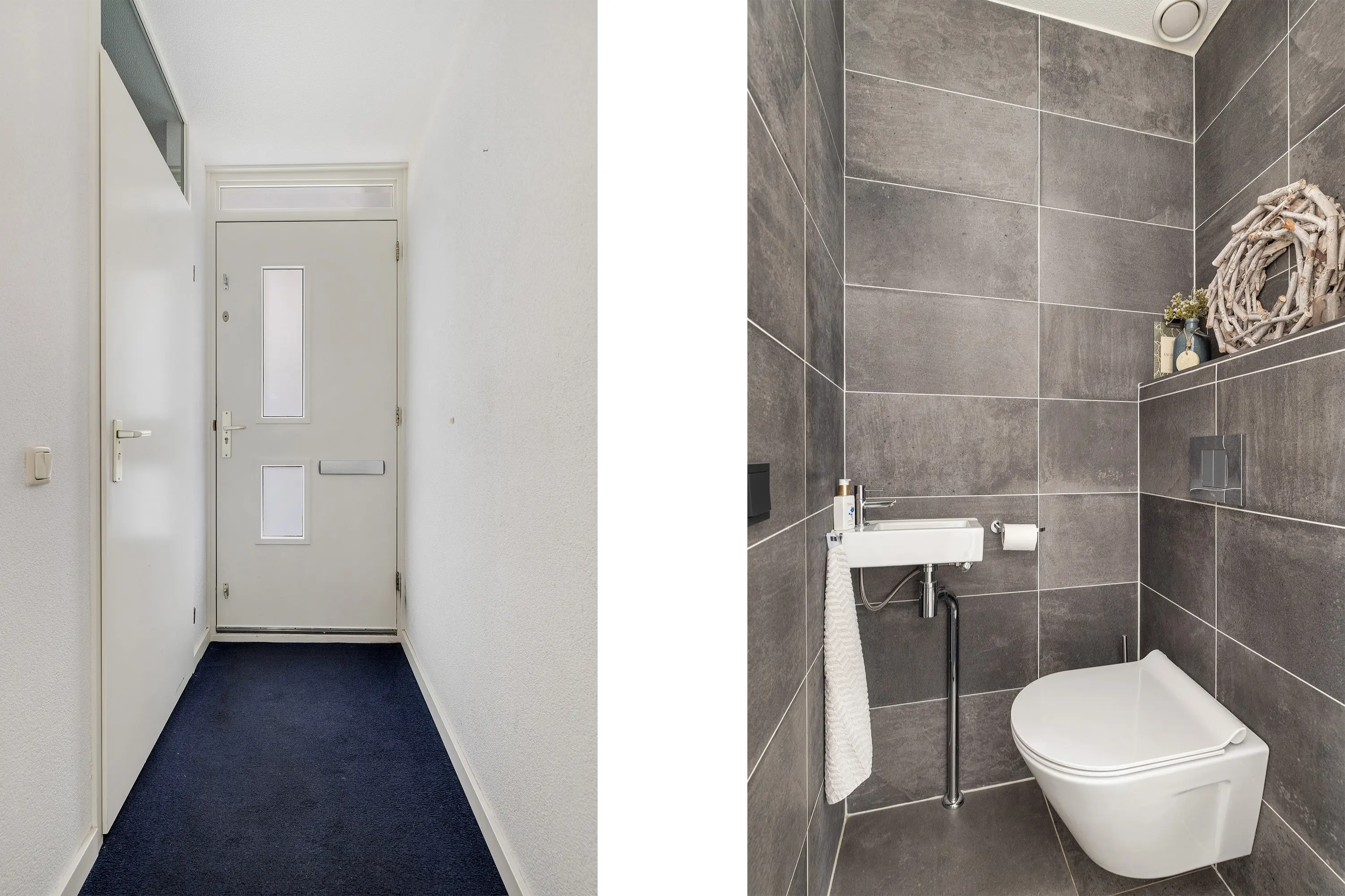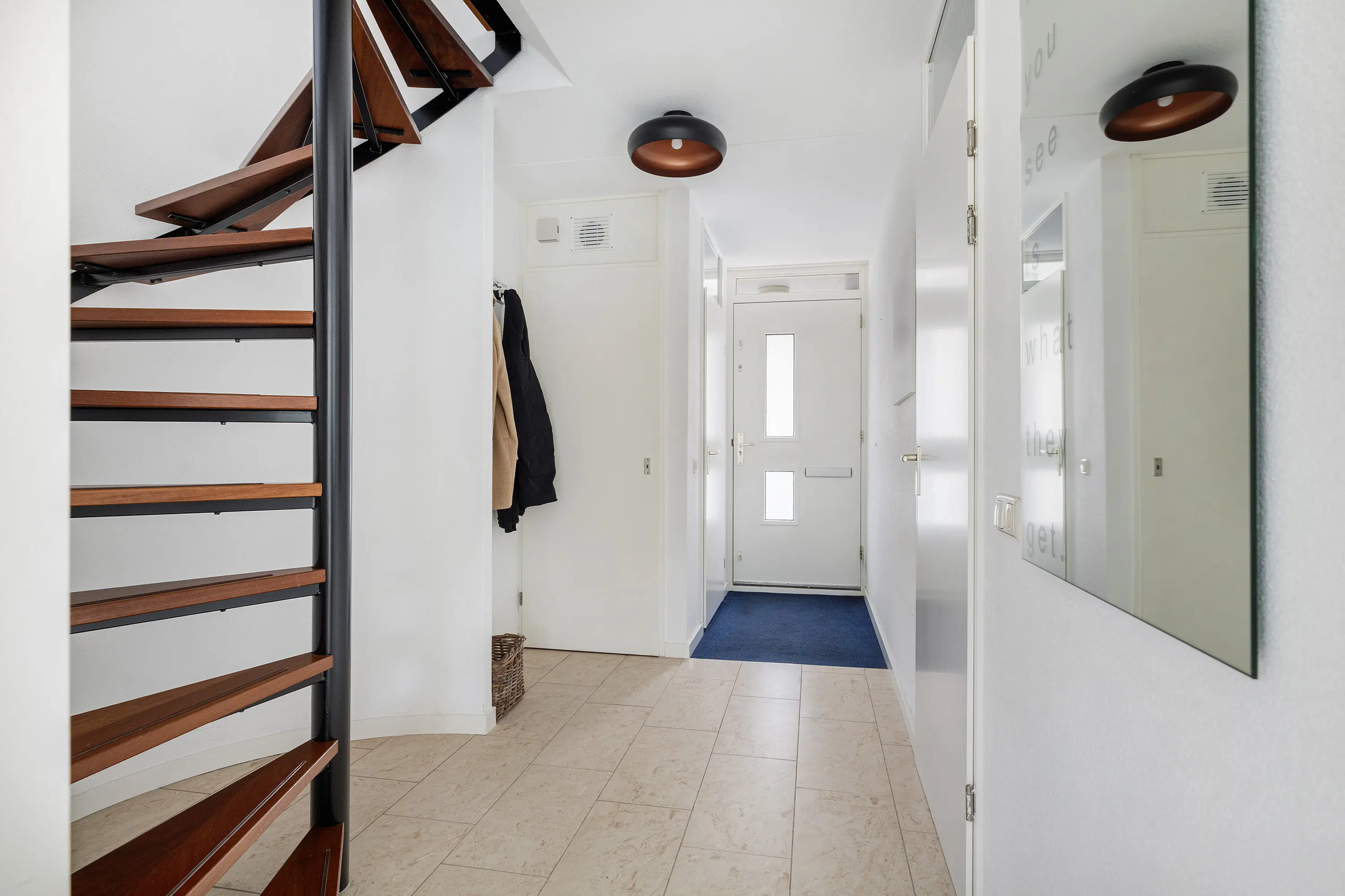 Bij binnenkomst valt direct de ruimte en het licht op. De royale hal biedt toegang tot de garage, het toilet en de woonkamer.