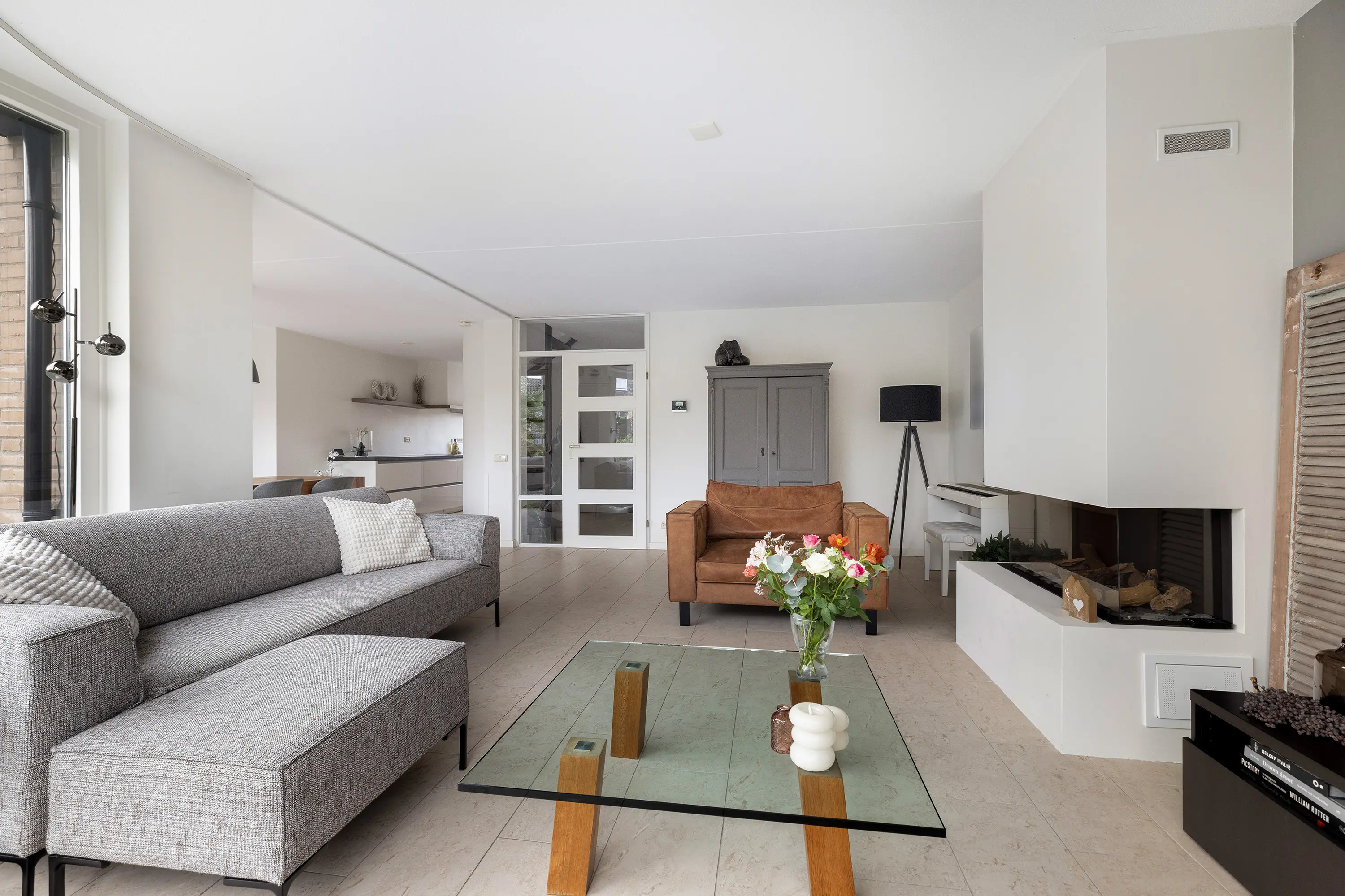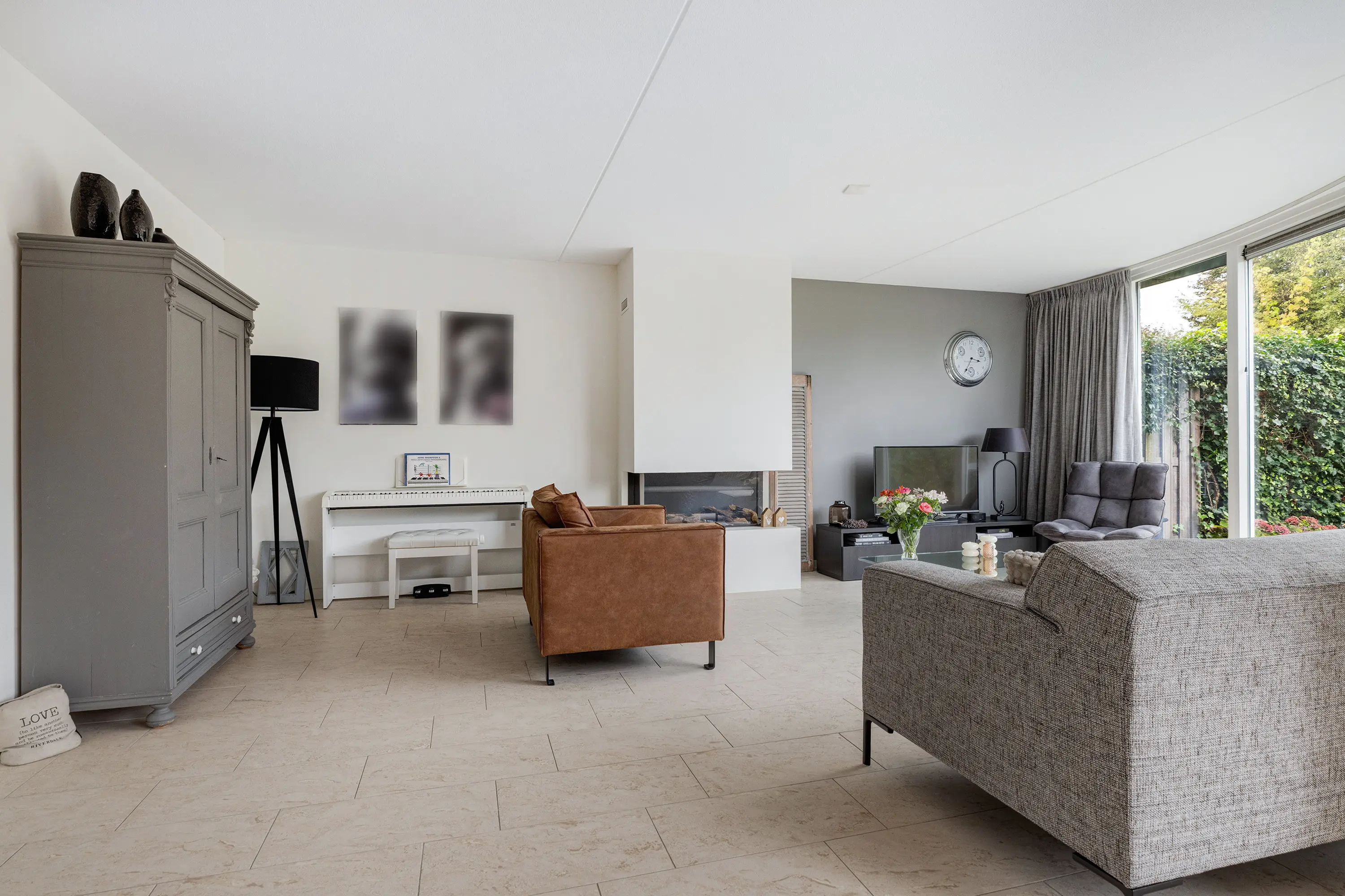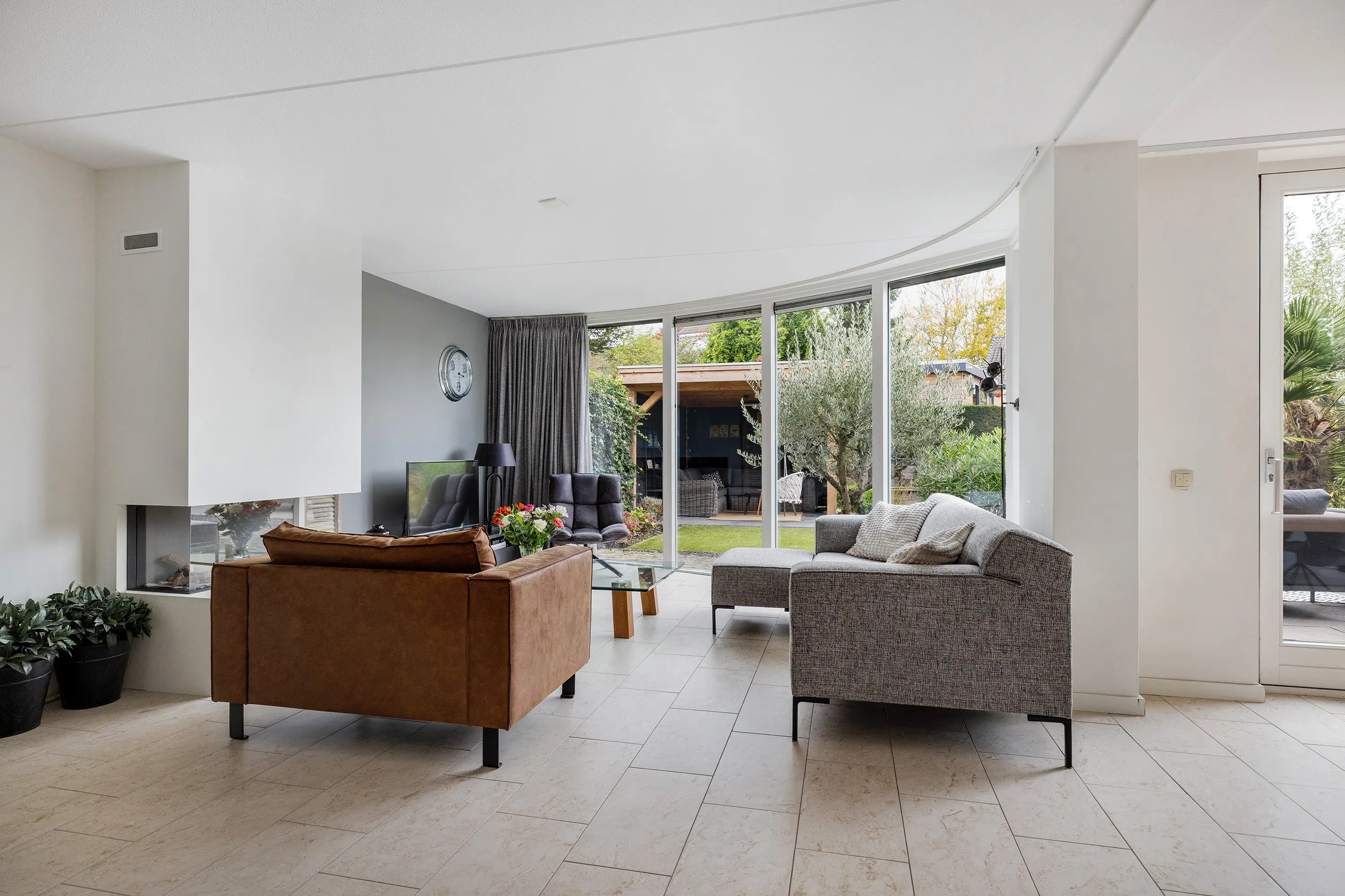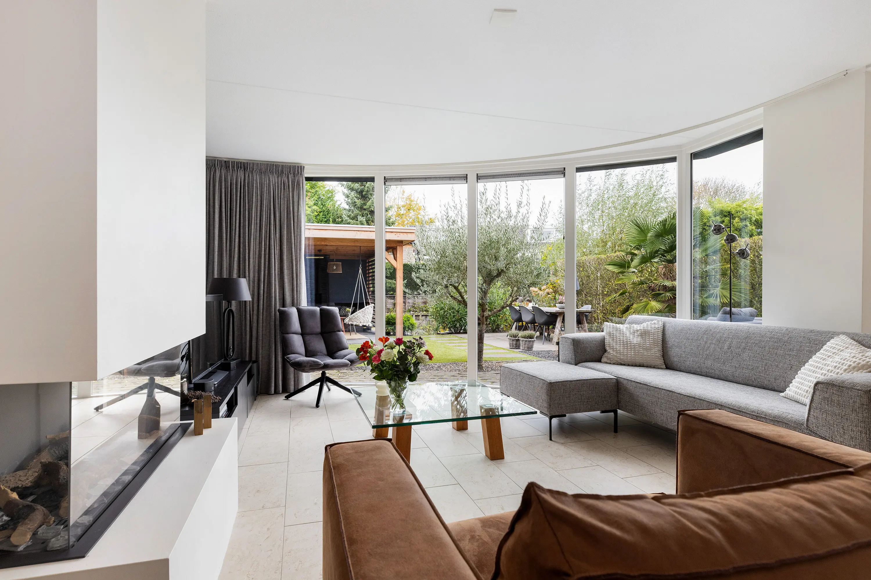 De glazen paneeldeur geeft toegang tot de sfeervolle woonkamer. De lichte plavuizen vloer met vloerverwarming zorgt voor comfort, terwijl de grote raampartijen en de ronde glazen pui aan de tuinzijde een prachtig uitzicht bieden over de achtertuin. De moderne schouw met gashaard en airconditioning (koeling/verwarming) maken het geheel compleet.