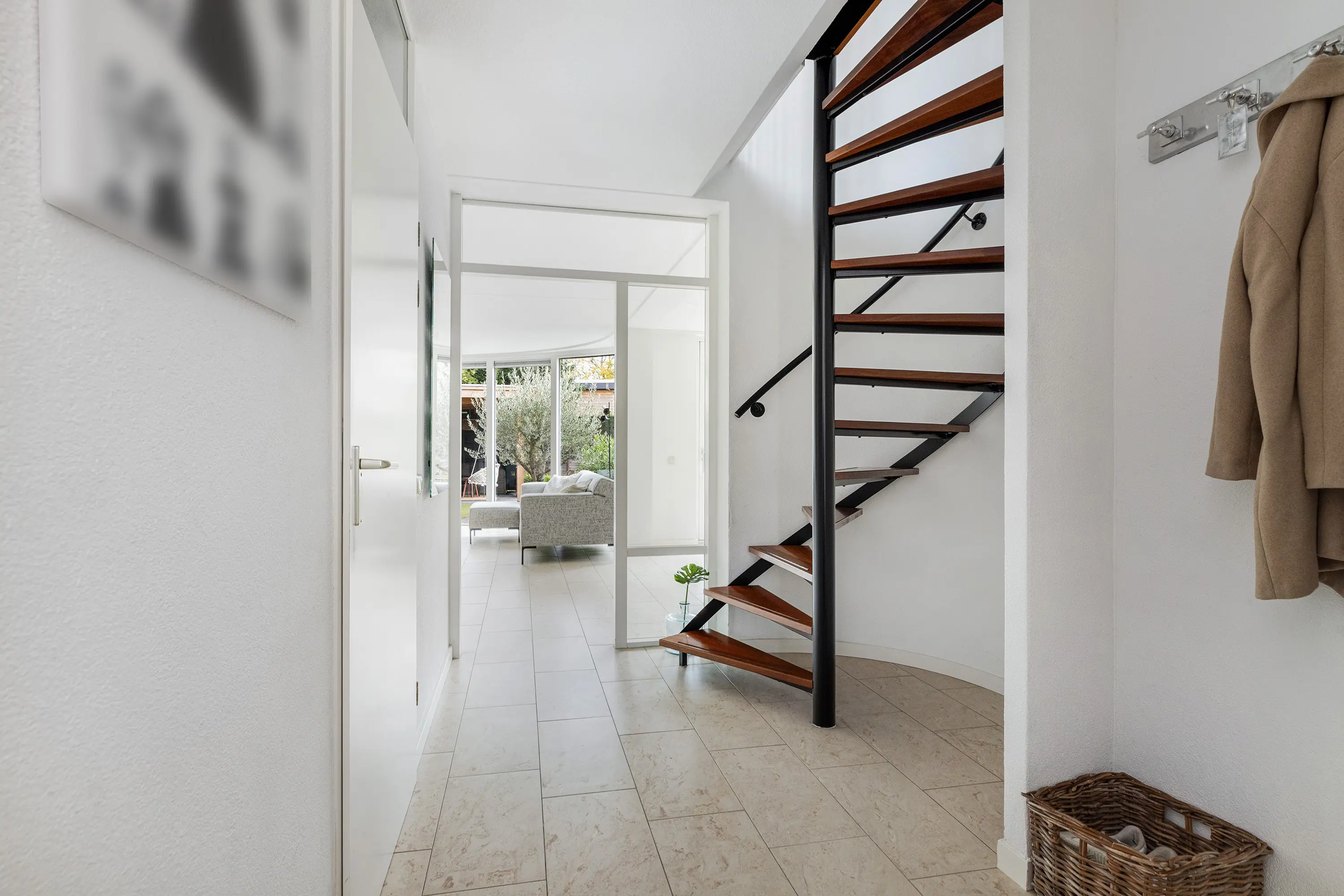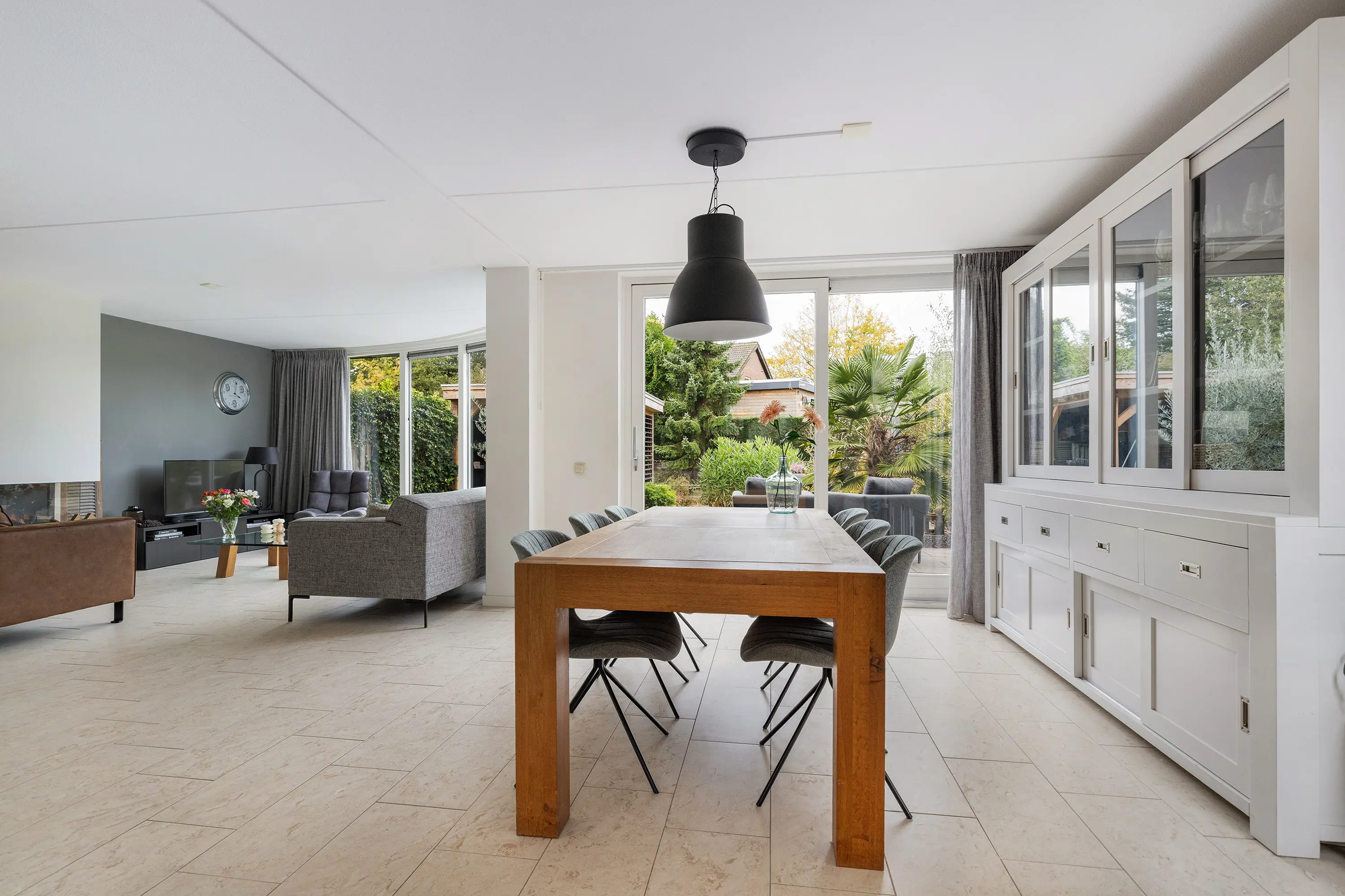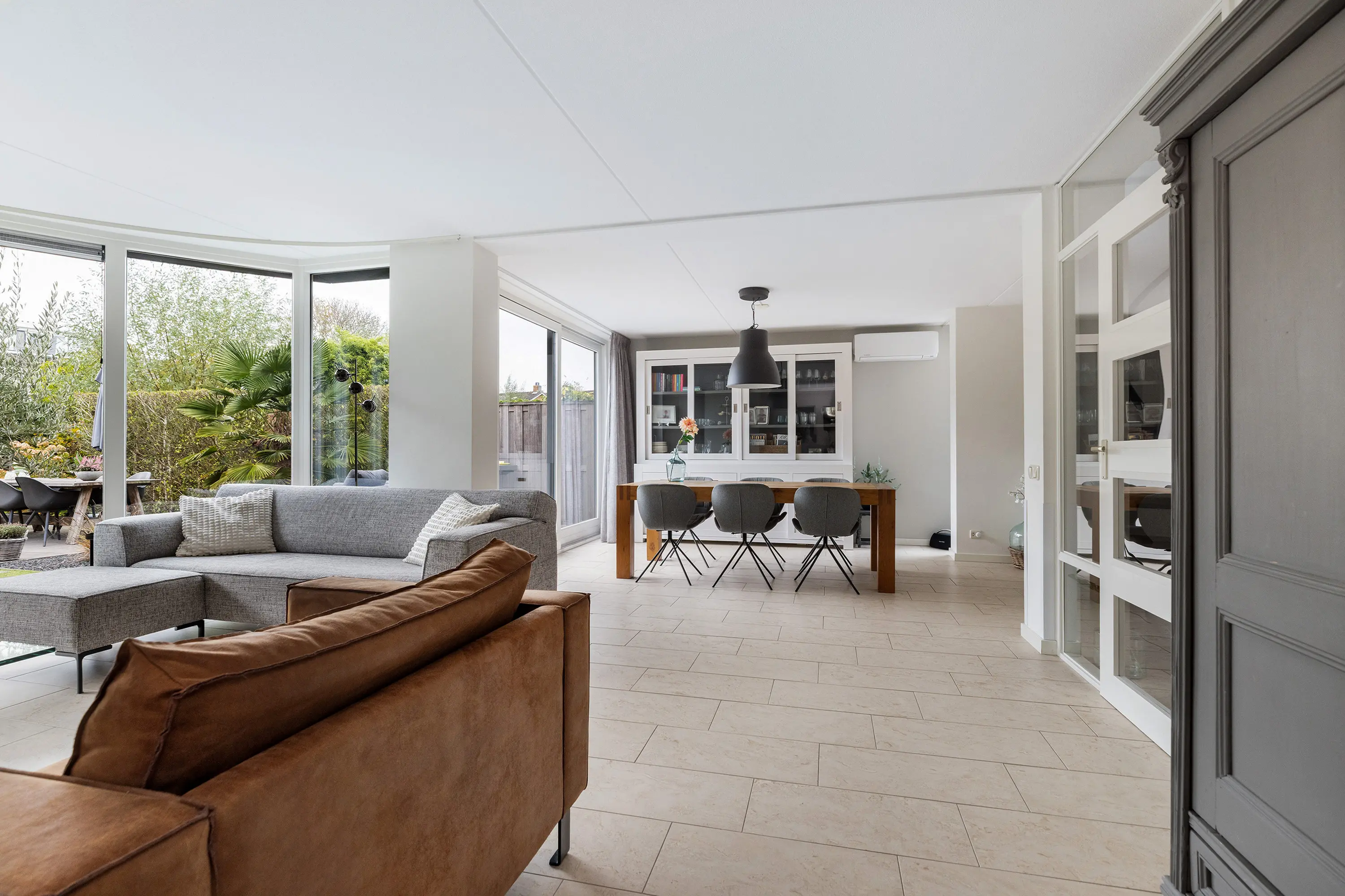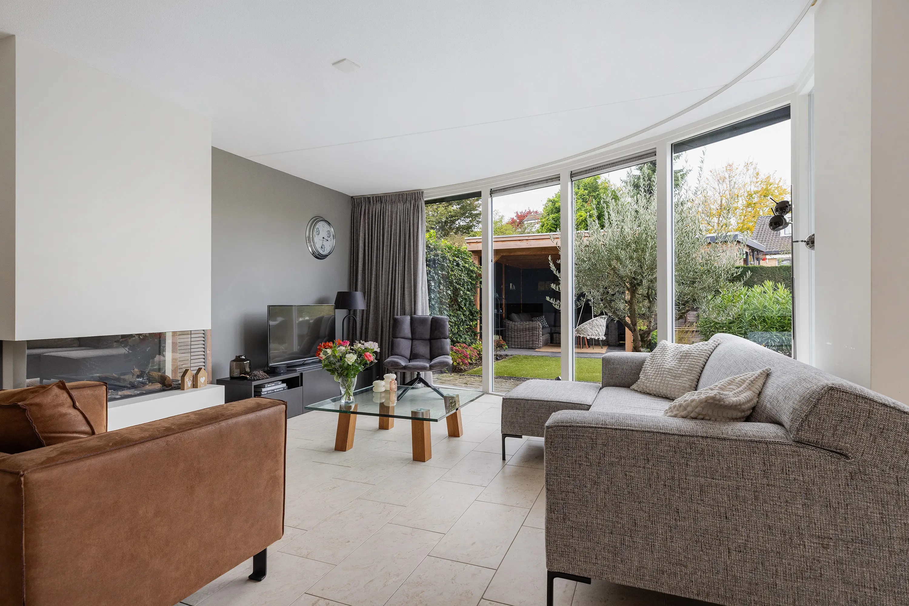 De glazen paneeldeur geeft toegang tot de sfeervolle woonkamer. De lichte plavuizen vloer met vloerverwarming zorgt voor comfort, terwijl de grote raampartijen en de ronde glazen pui aan de tuinzijde een prachtig uitzicht bieden over de achtertuin. De moderne schouw met gashaard en airconditioning (koeling/verwarming) maken het geheel compleet.