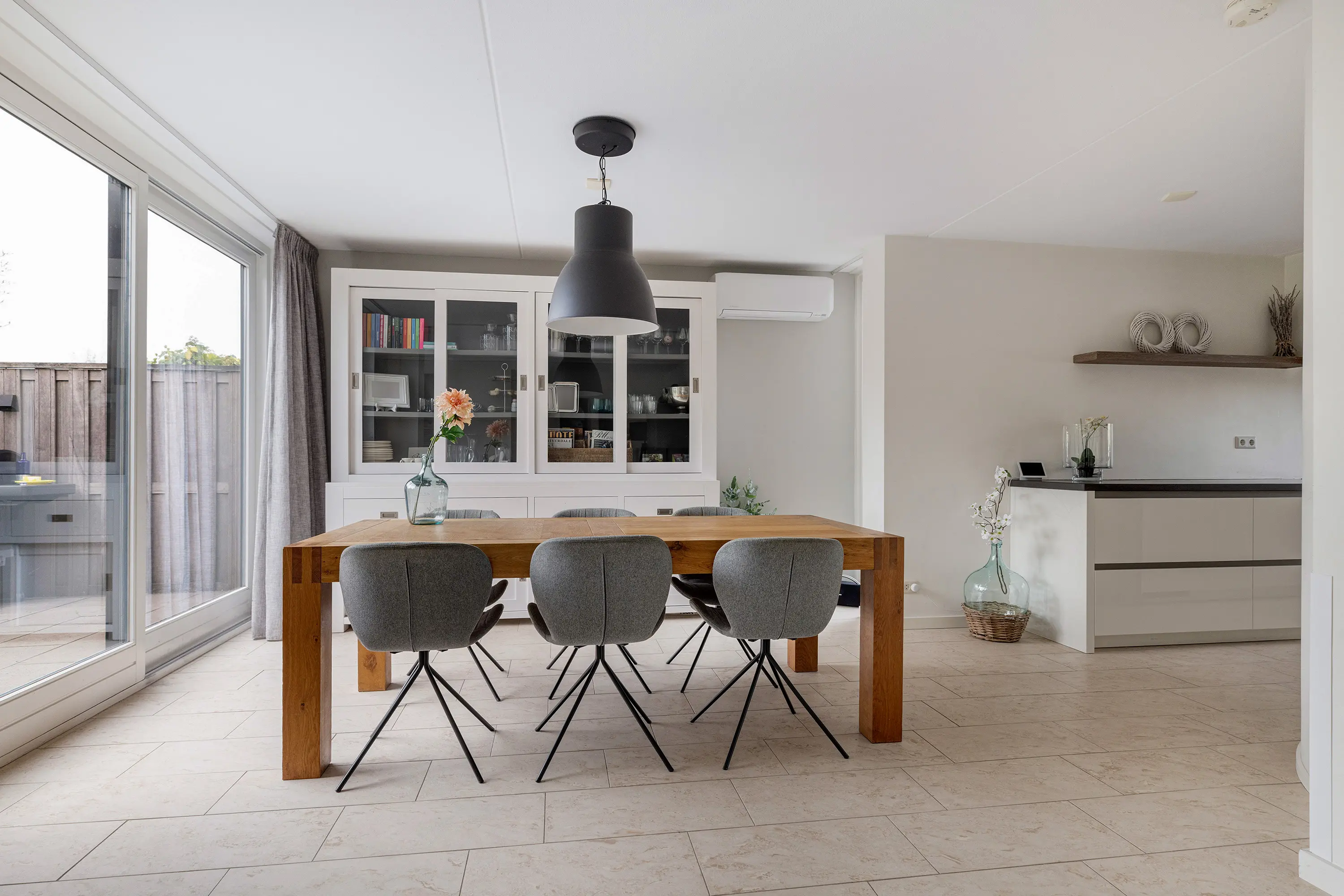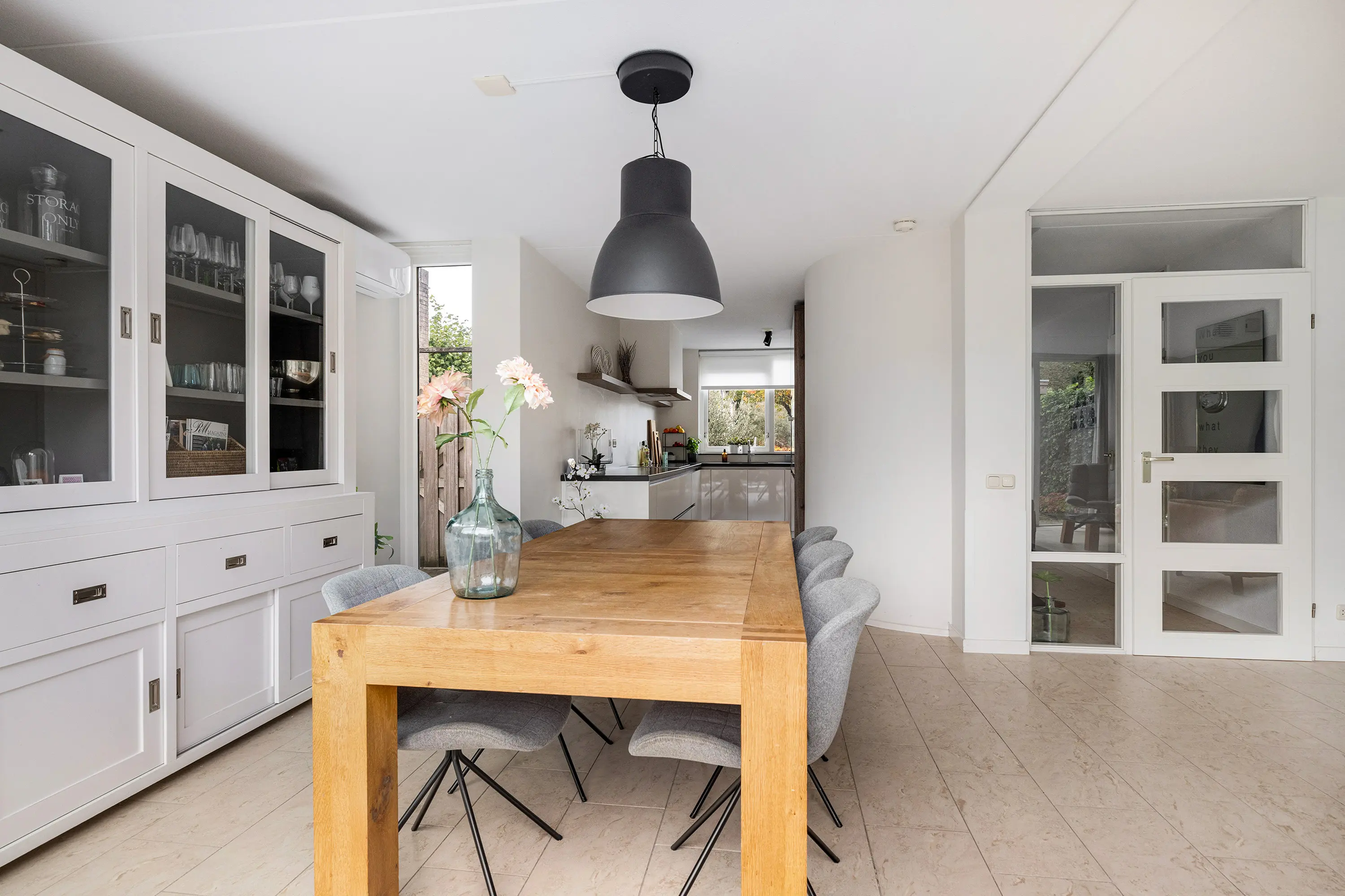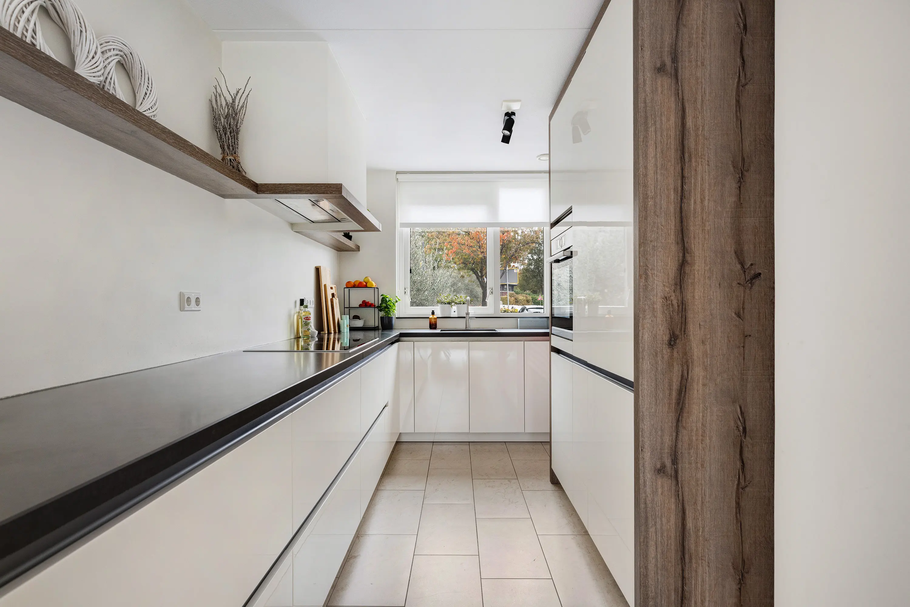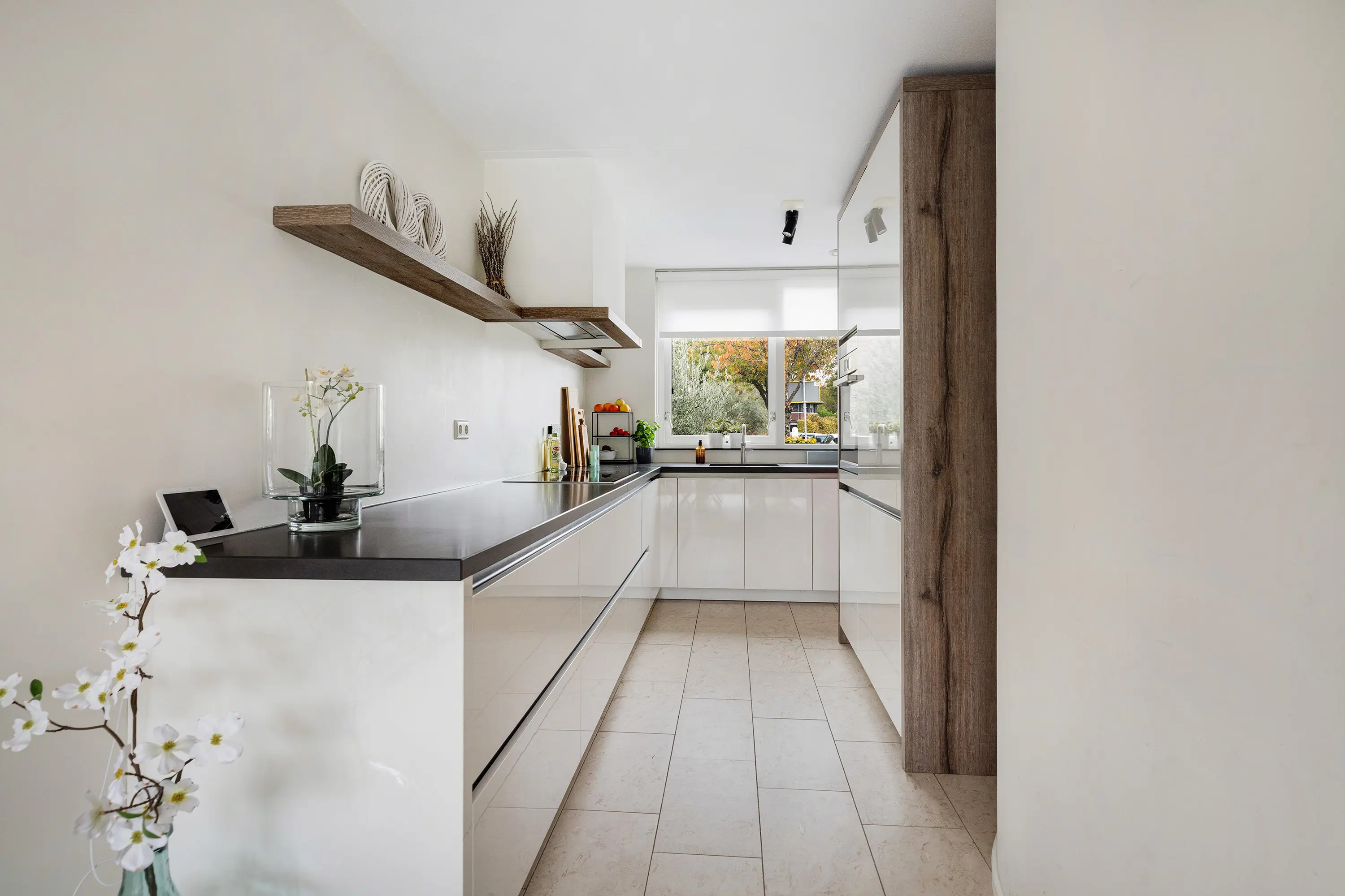 Het eetgedeelte grenst aan de schuifpui naar de tuin (voorzien van elektrisch rolluik), ideaal voor lange zomeravonden. De halfopen keuken aan de voorzijde is luxe uitgevoerd in wit hoogglans met een donkergrijs composiet werkblad. De keuken is voorzien van hoogwaardige inbouwapparatuur, waaronder een combi-oven, koel-vriescombinatie, vaatwasser, 5-pits inductiekookplaat met geïntegreerde afzuigkap, Quooker-kraan, apothekerskast en praktische LeMans-carrouselkast.