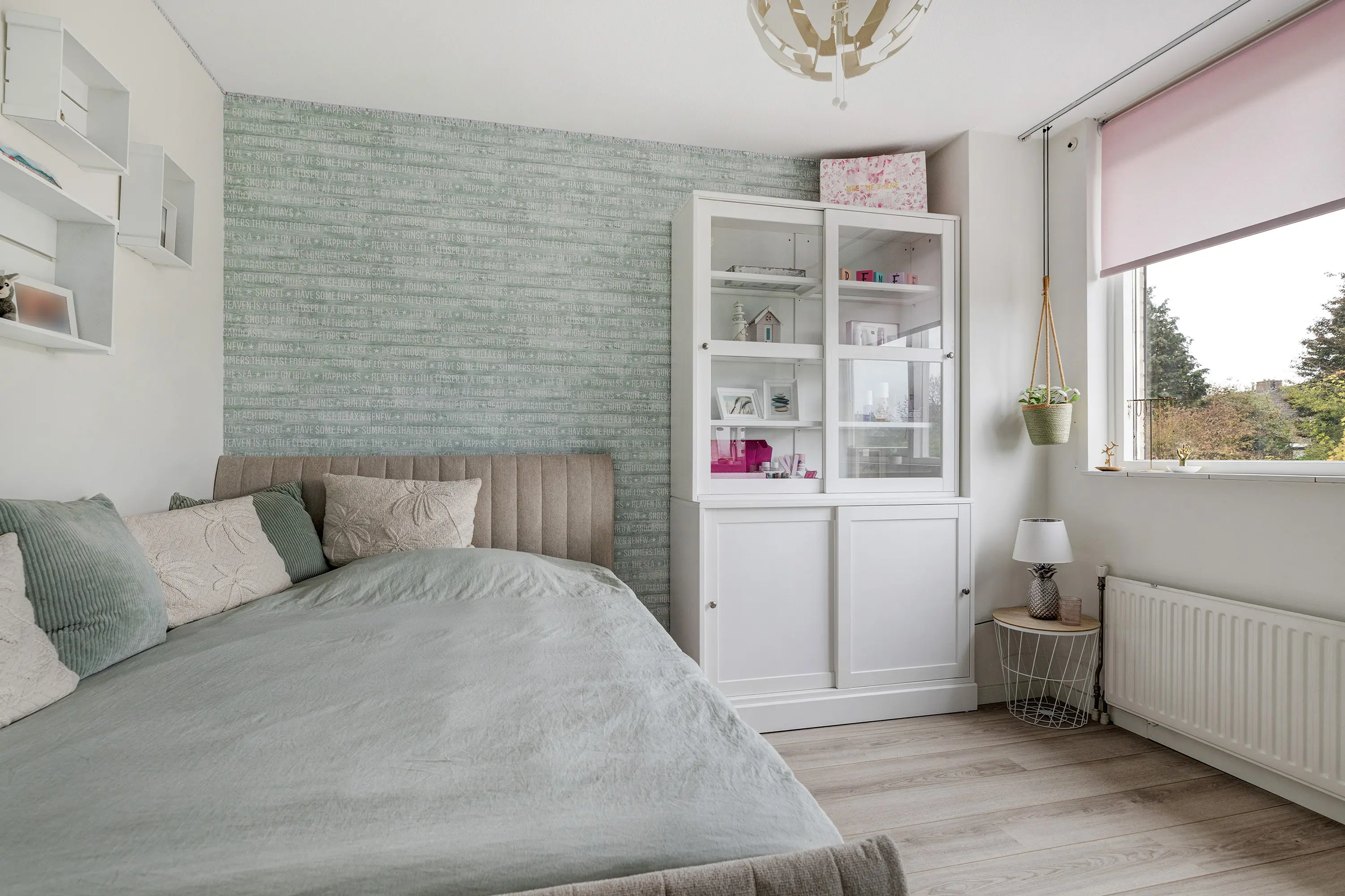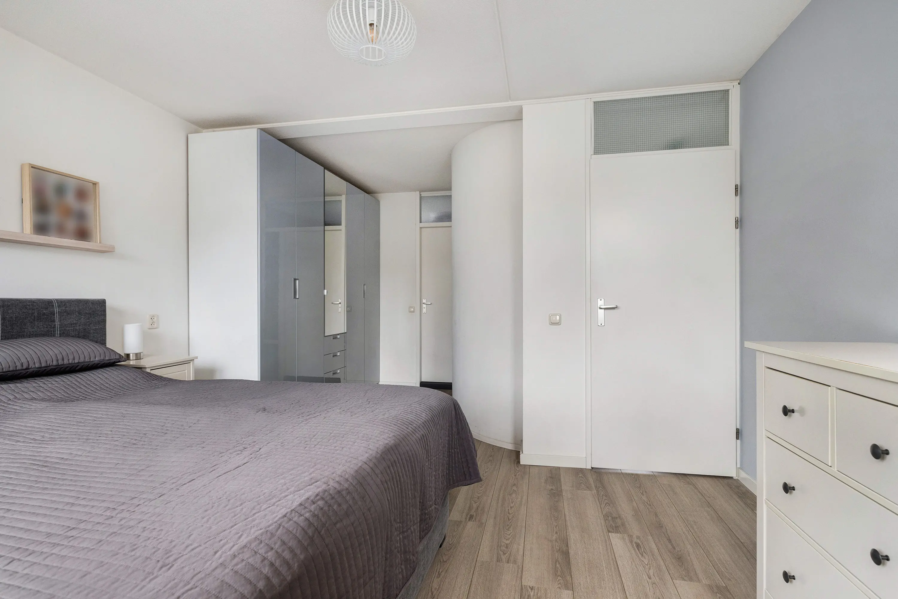 Slaapkamer 2 ligt aan de voorzijde, heeft een vaste kast en toegang tot het balkon.