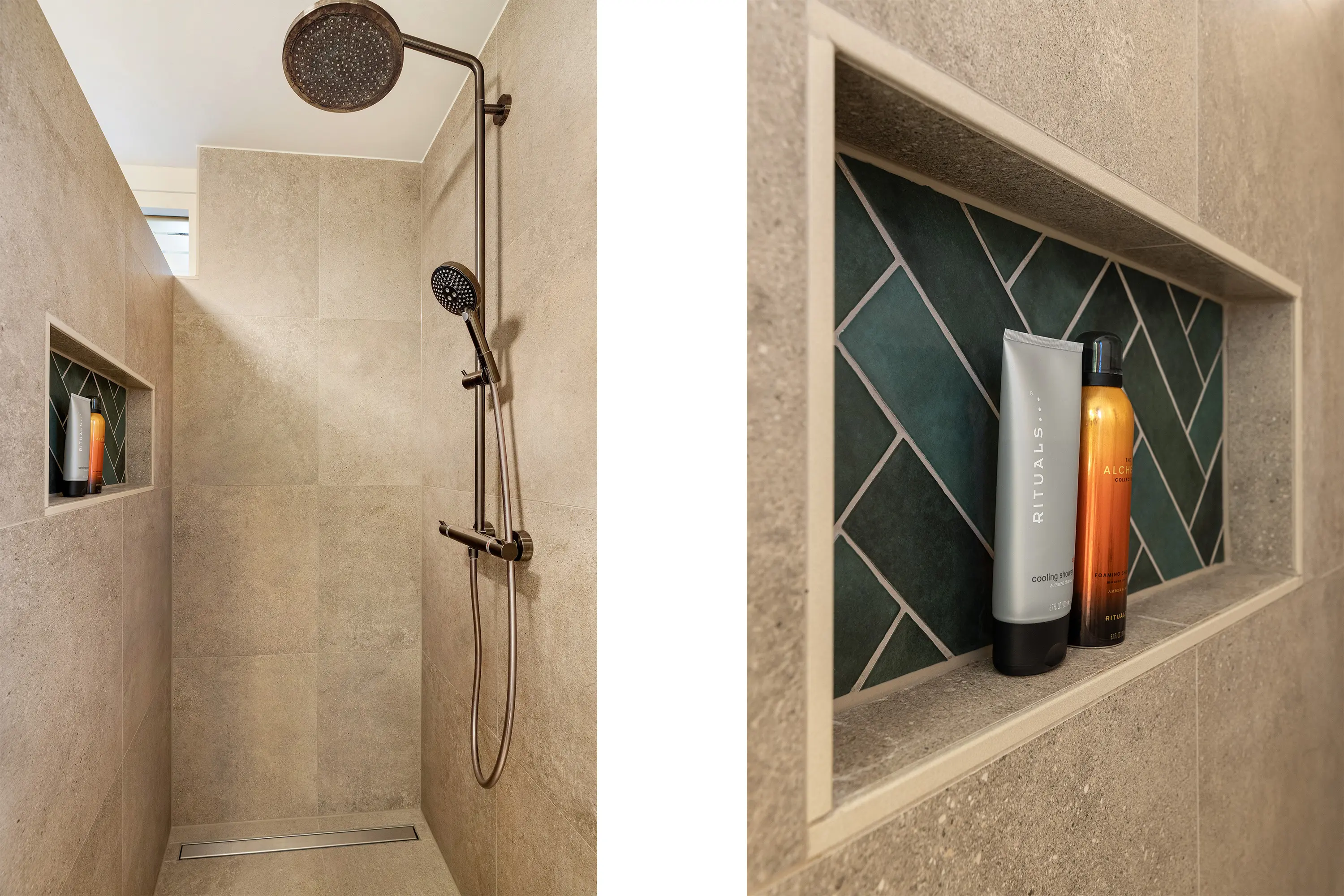 Slaapkamer 1 ligt aan de achterzijde en beschikt over een ruime kastenwand en een luxe badkamer en suite. Deze badkamer is uitgevoerd in warme beige tinten en voorzien van een ligbad, inloopdouche, hangend toilet, dubbel wastafelmeubel met twee waskommen, verwarmde en verlichte spiegel en stijlvolle gunmetal kranen.