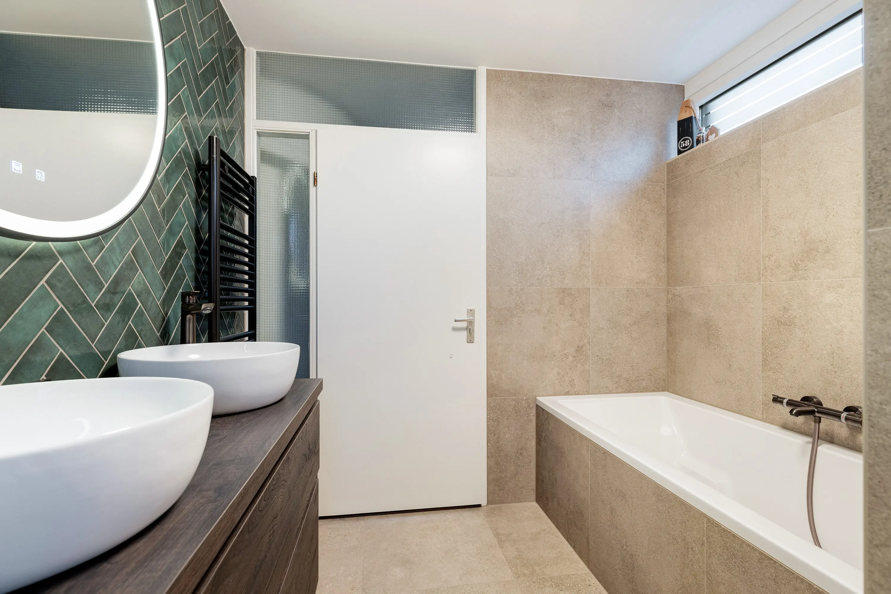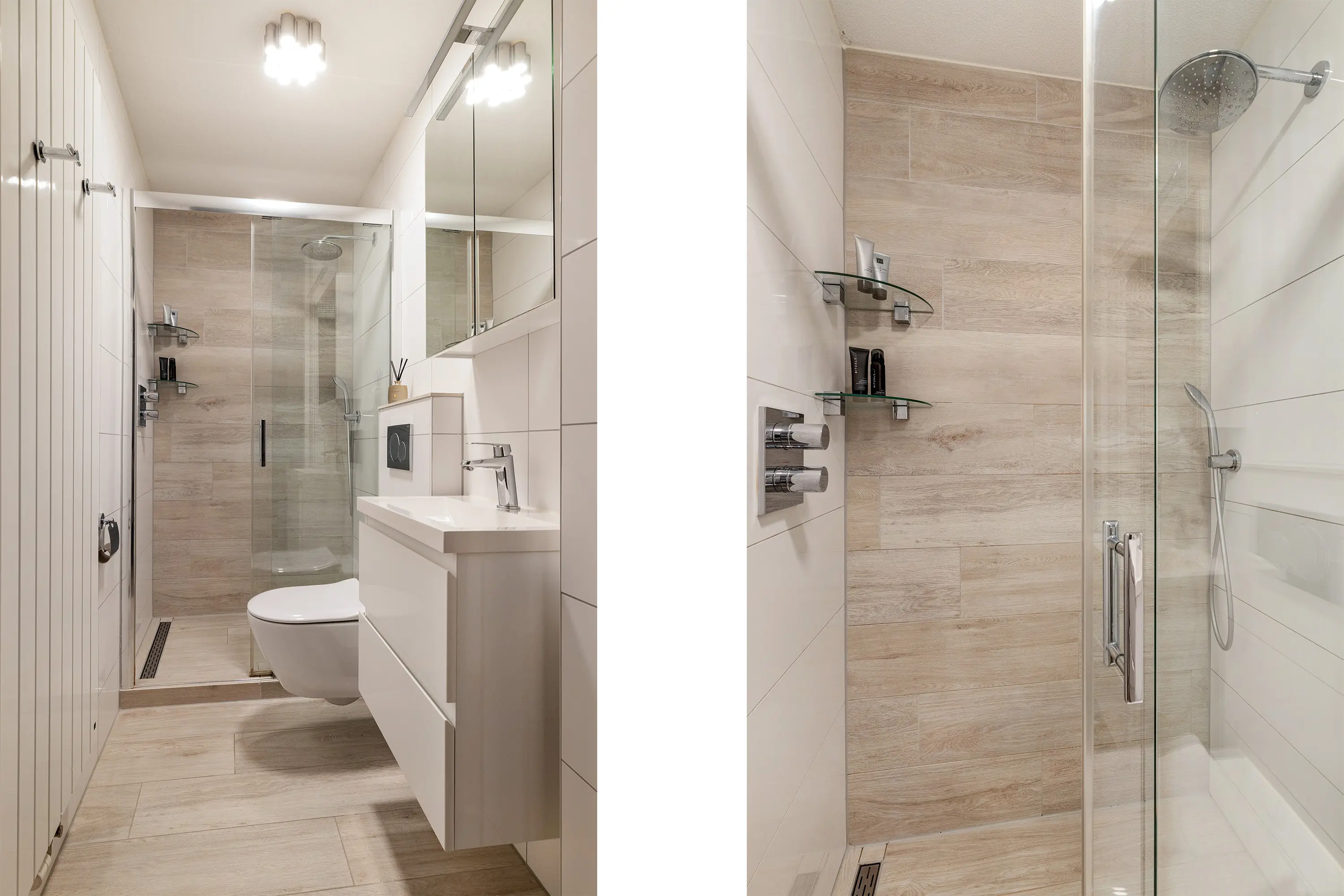 De tweede badkamer is volledig betegeld in wit/beige tinten en voorzien van een inloopdouche, wastafelmeubel met spiegelkast en hangend toilet – perfect voor gezinnen of gasten.