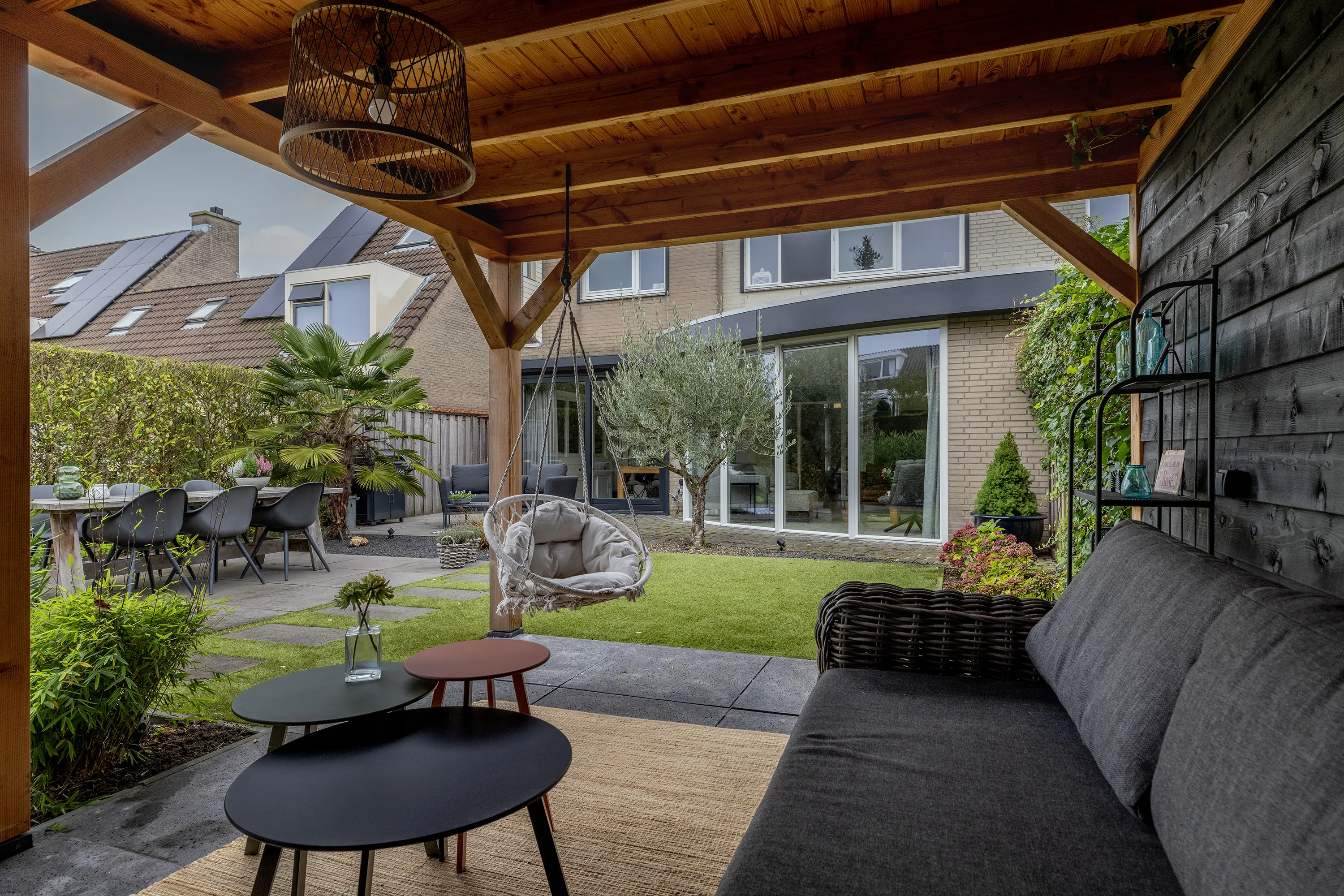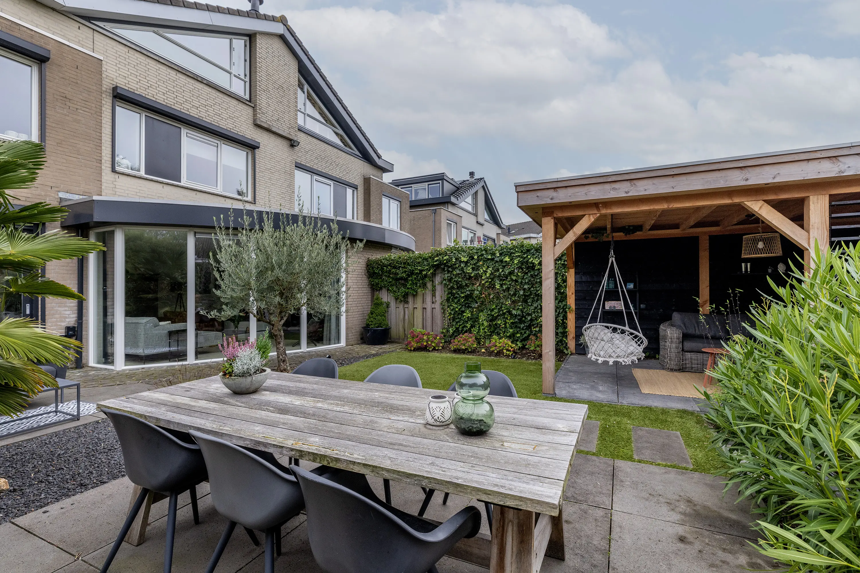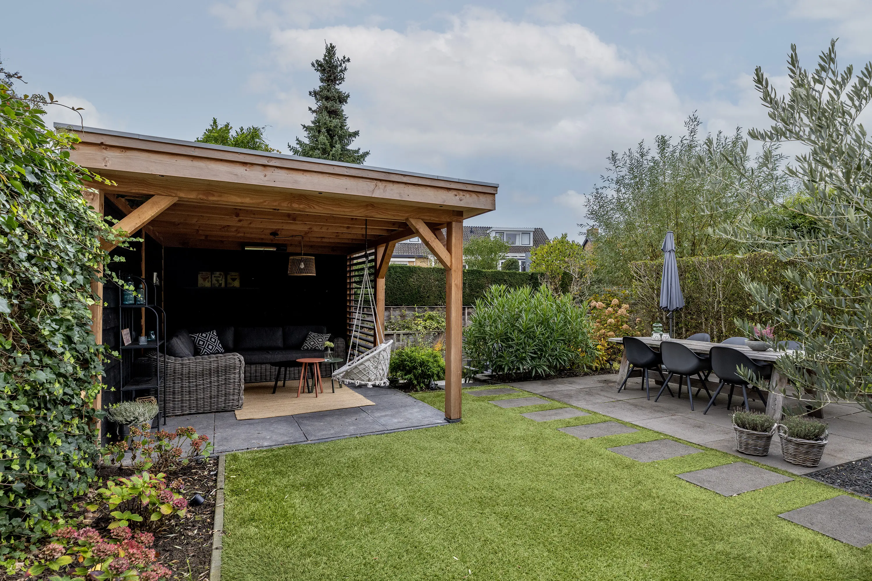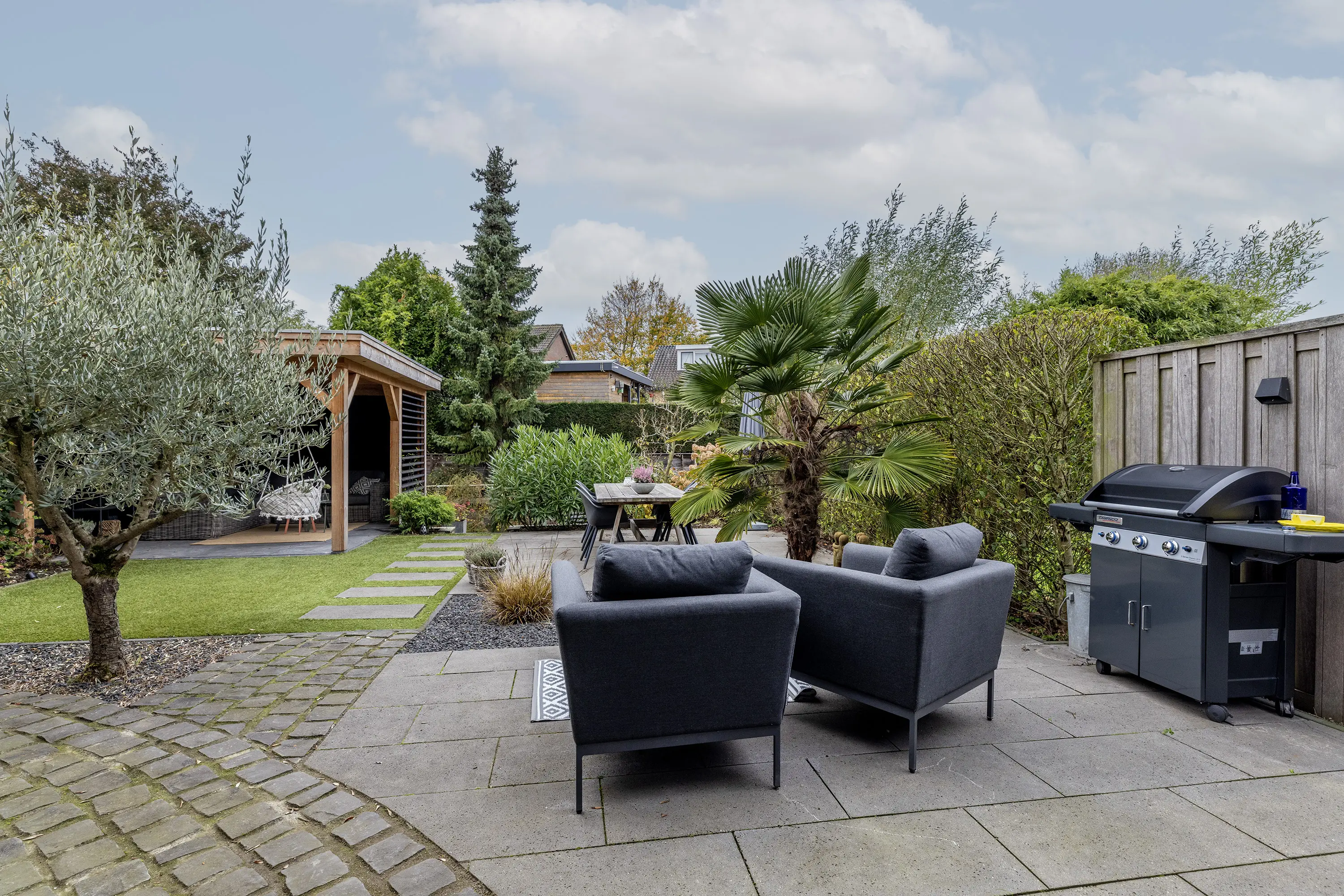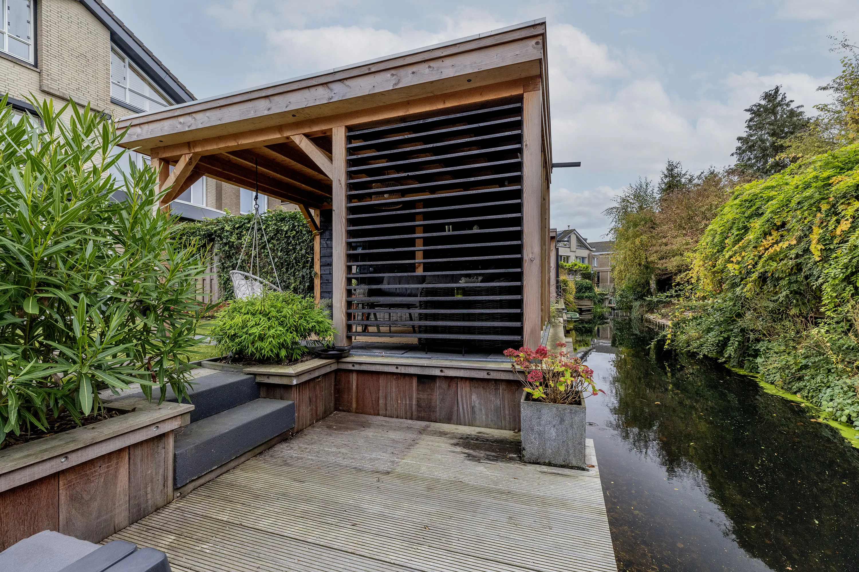 De achtertuin ligt op het westen en is een ware oase van rust. Fraai aangelegd met kunstgras, volwassen groen – waaronder een olijfboom, palm en perenboom – en een recent vernieuwde beschoeiing en vlonderterras aan de waterkant. Achter in de tuin bevindt zich een sfeervolle veranda van Douglas hout, perfect voor een loungehoek met uitzicht over de gezellige tuin.