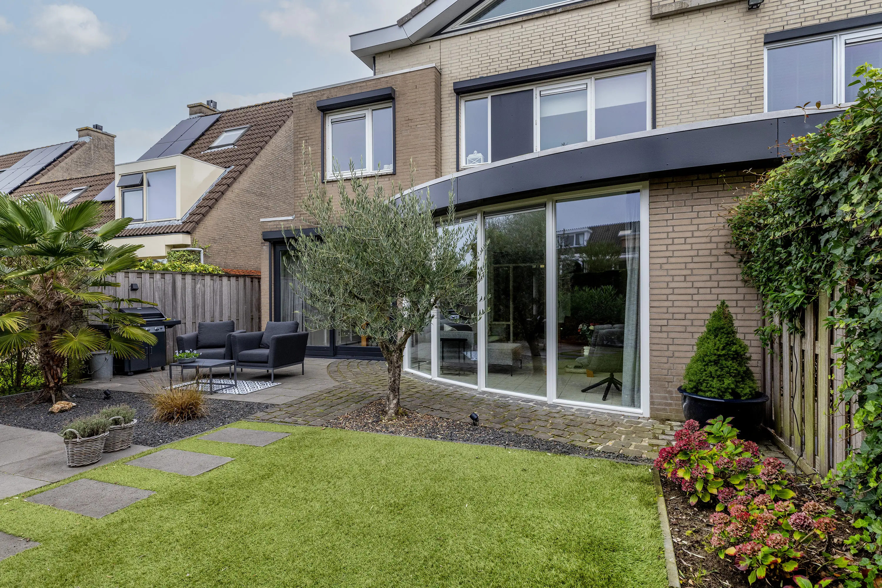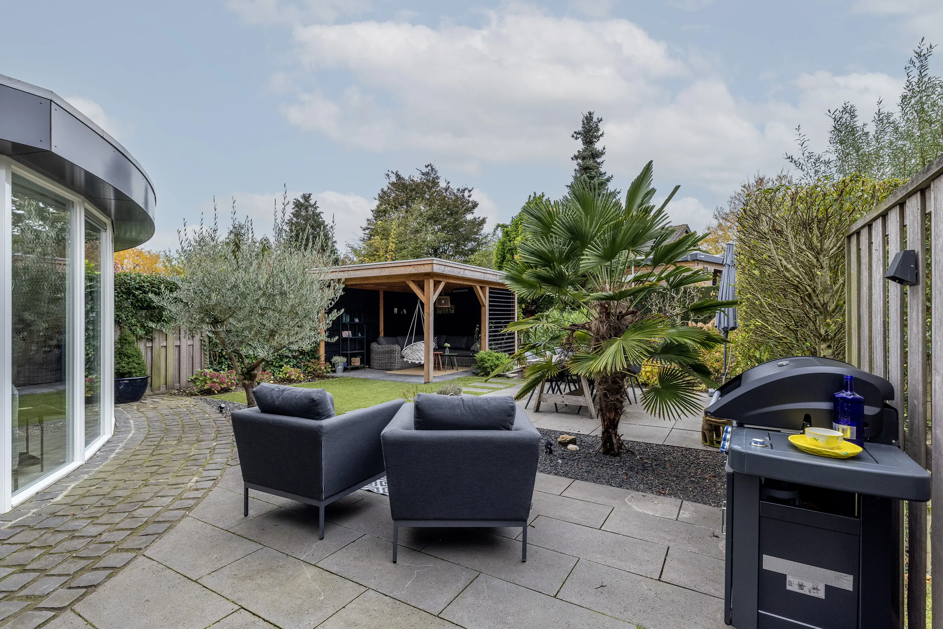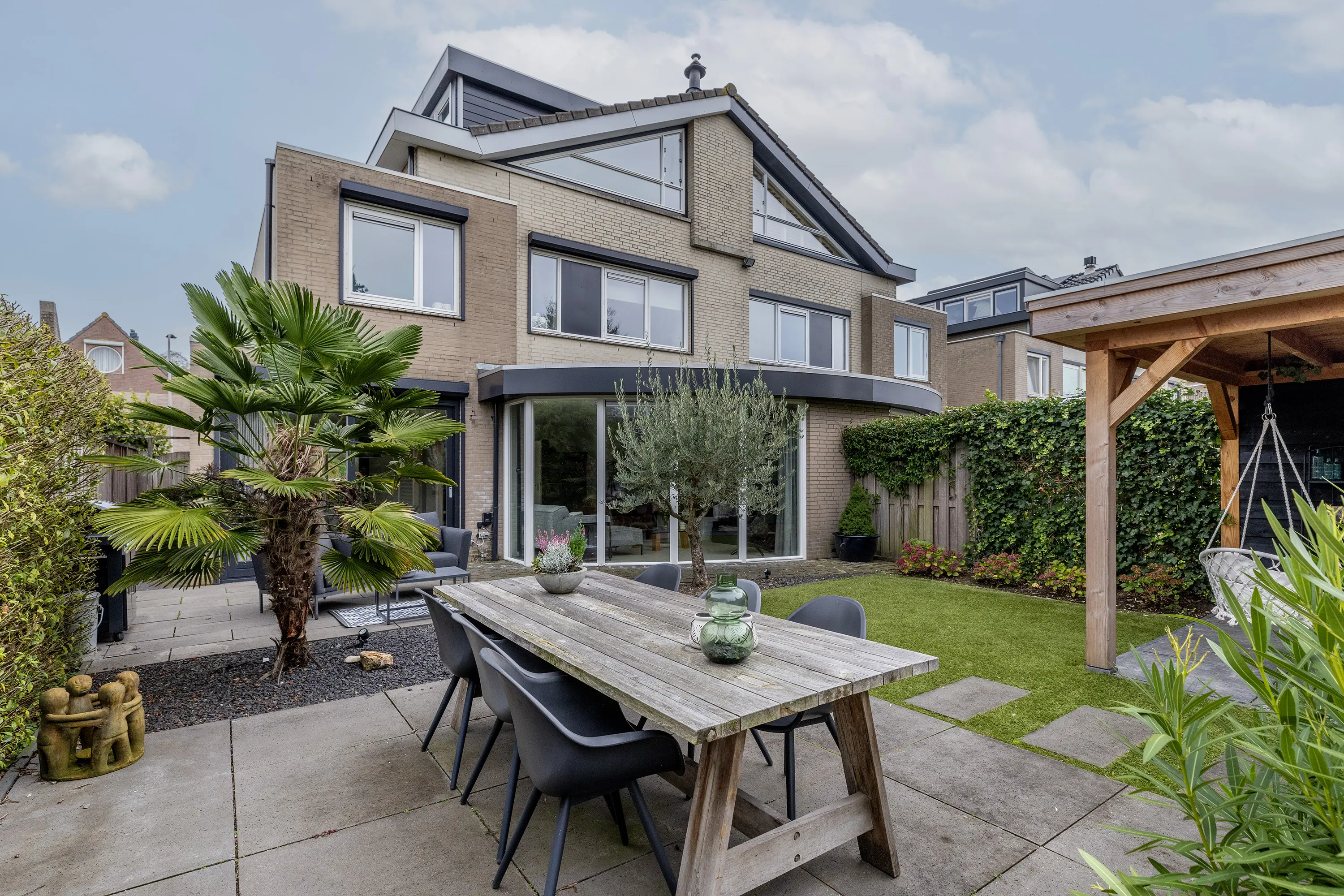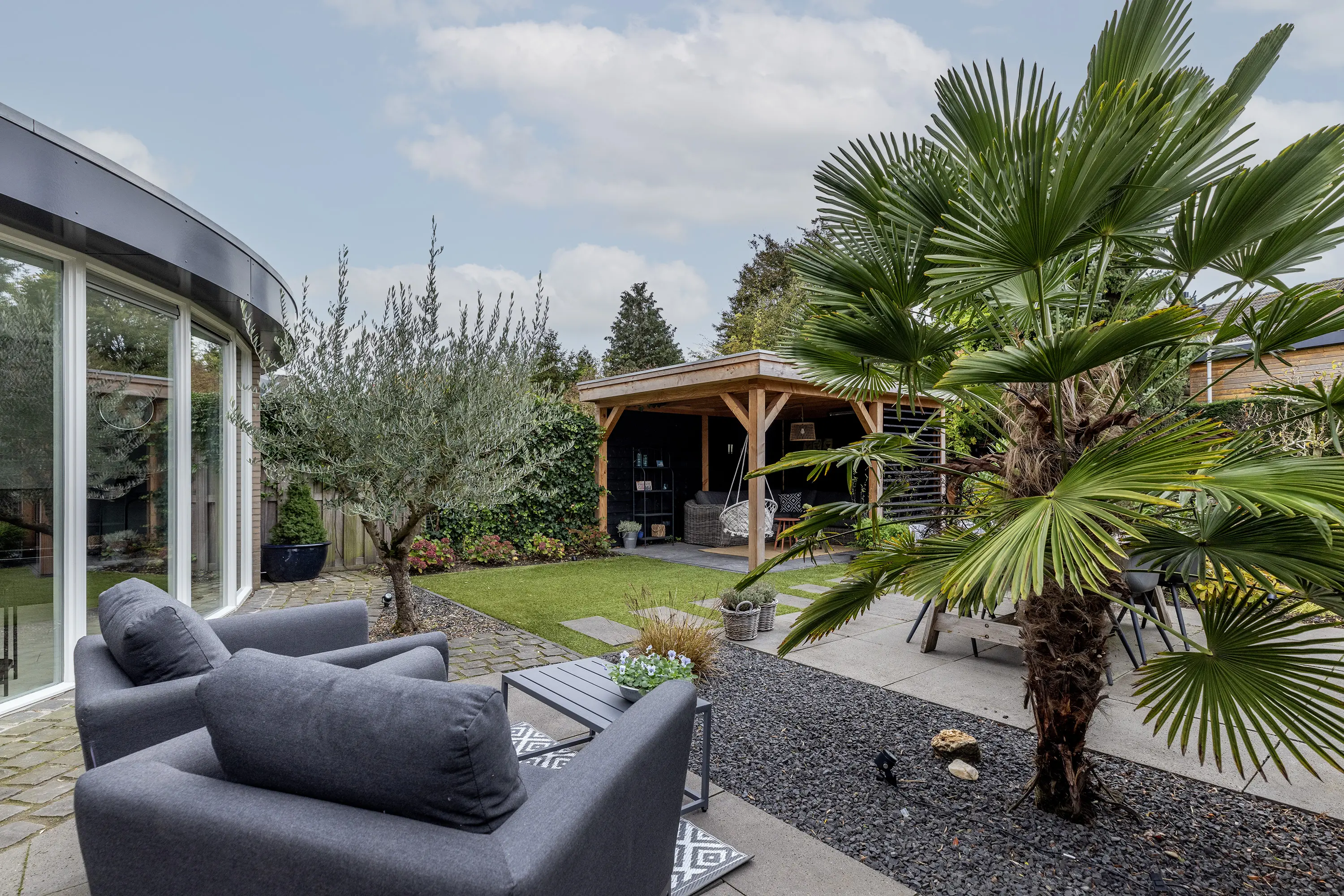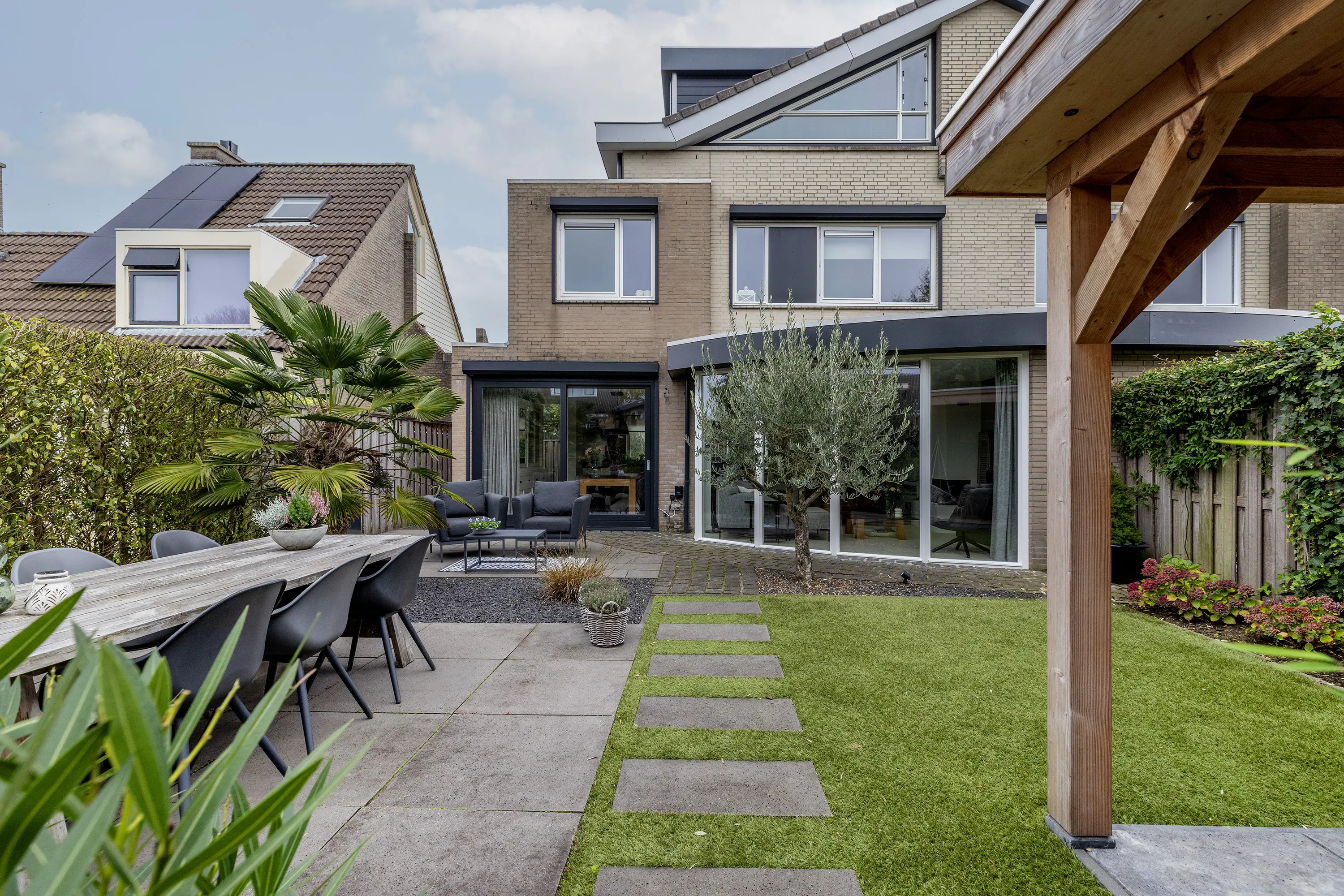 De achtertuin ligt op het westen en is een ware oase van rust. Fraai aangelegd met kunstgras, volwassen groen – waaronder een olijfboom, palm en perenboom – en een recent vernieuwde beschoeiing en vlonderterras aan de waterkant. Achter in de tuin bevindt zich een sfeervolle veranda van Douglas hout, perfect voor een loungehoek met uitzicht over de gezellige tuin.