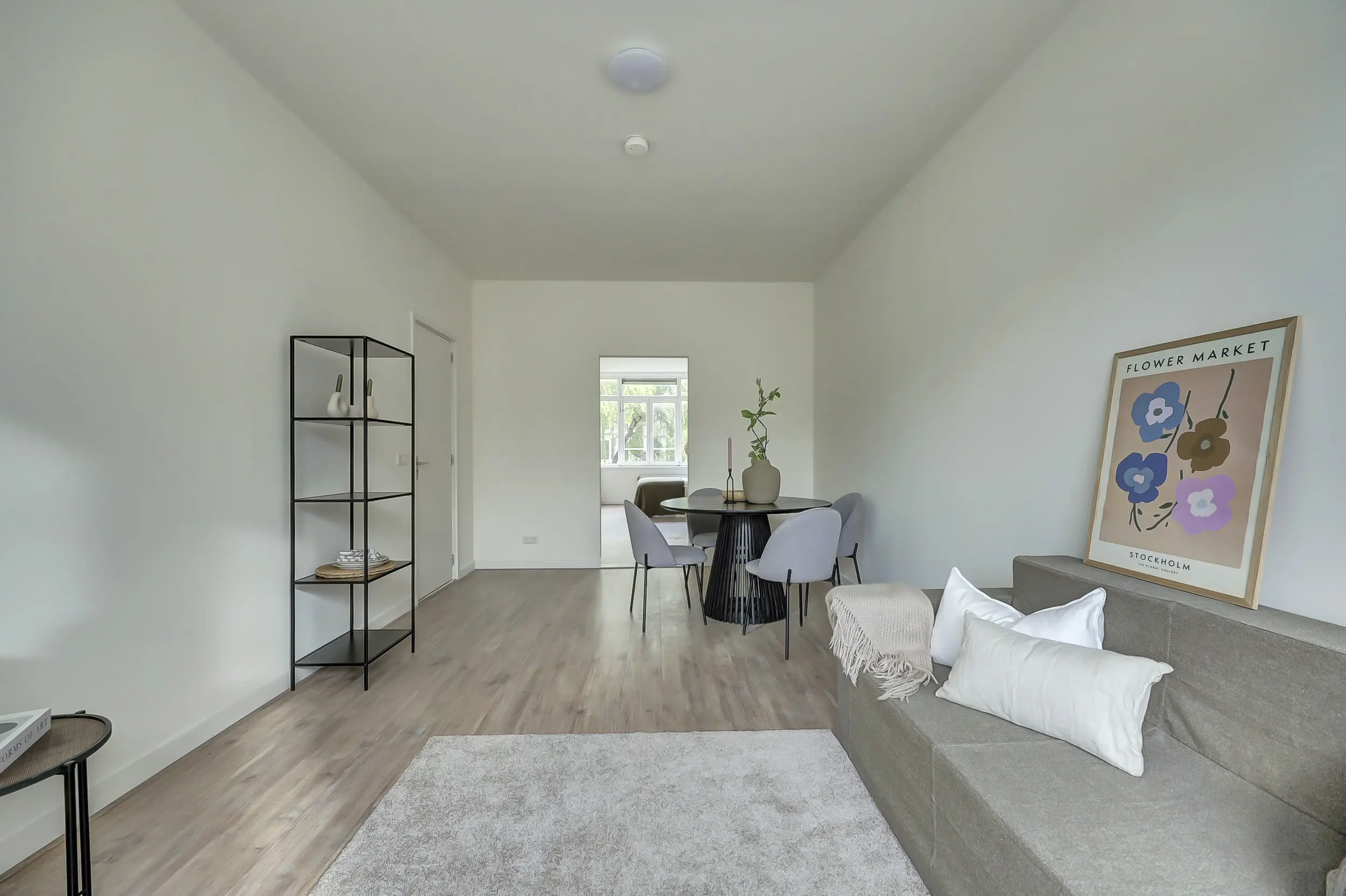 Je komt binnen in een kleine hal en hebt van daaruit direct toegang tot zowel het toilet, de keuken aan de achterzijde als de woonkamer. We stappen de woonkamer en-suite in, waar je aan de achterkant een heerlijke ruimte hebt om een grote eethoek te creëren — fantastisch om lange avonden te tafelen met vrienden en/of familie. Je zou er ook voor kunnen kiezen om de scheidingswand tussen de voor- en achterkamer te verwijderen, zodat je een royale doorzonwoonkamer krijgt.