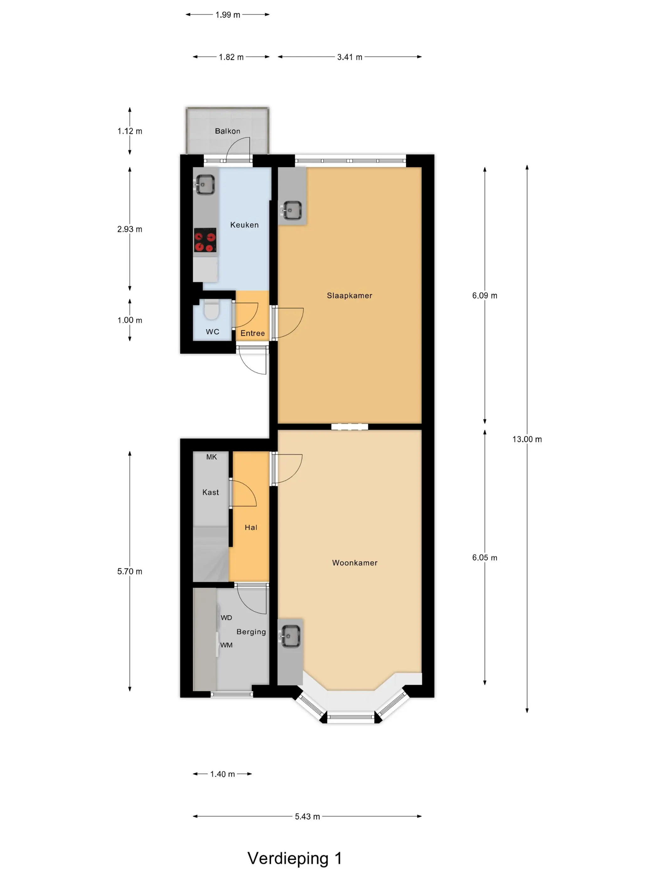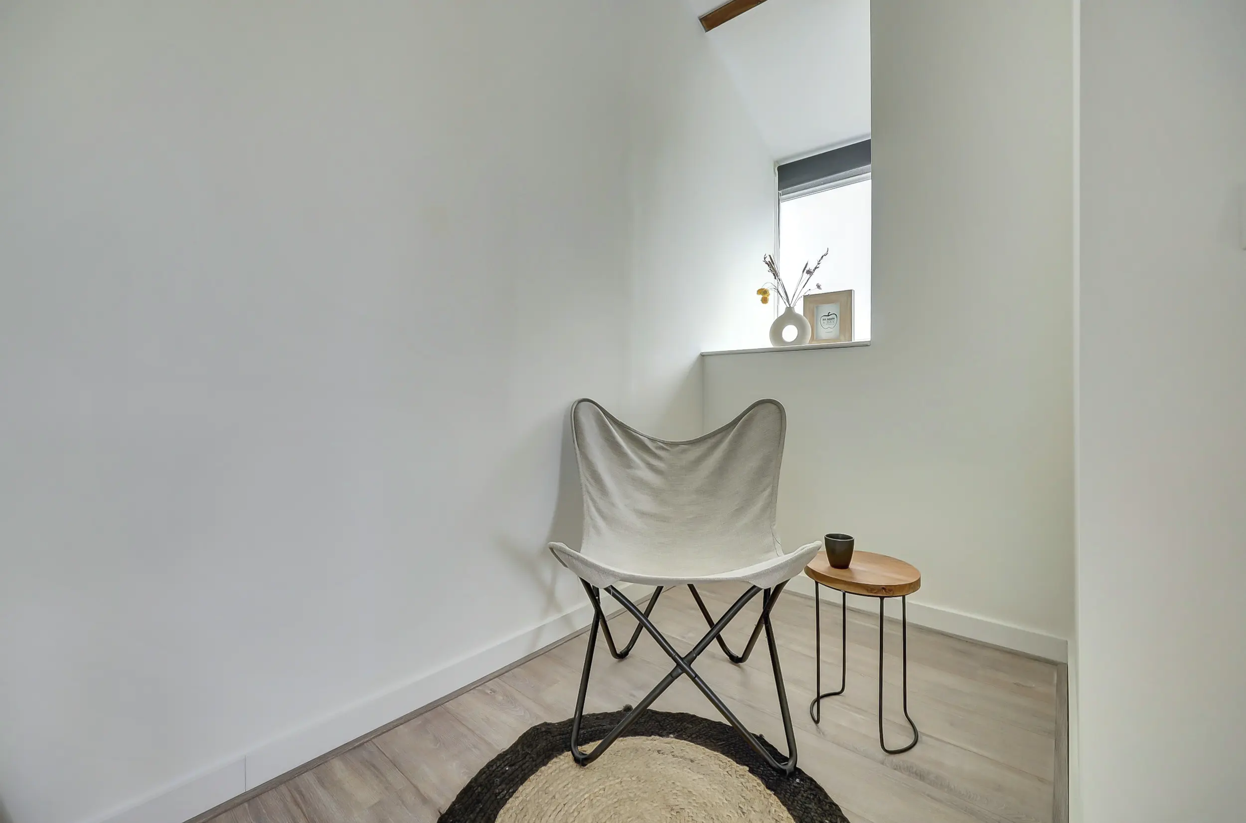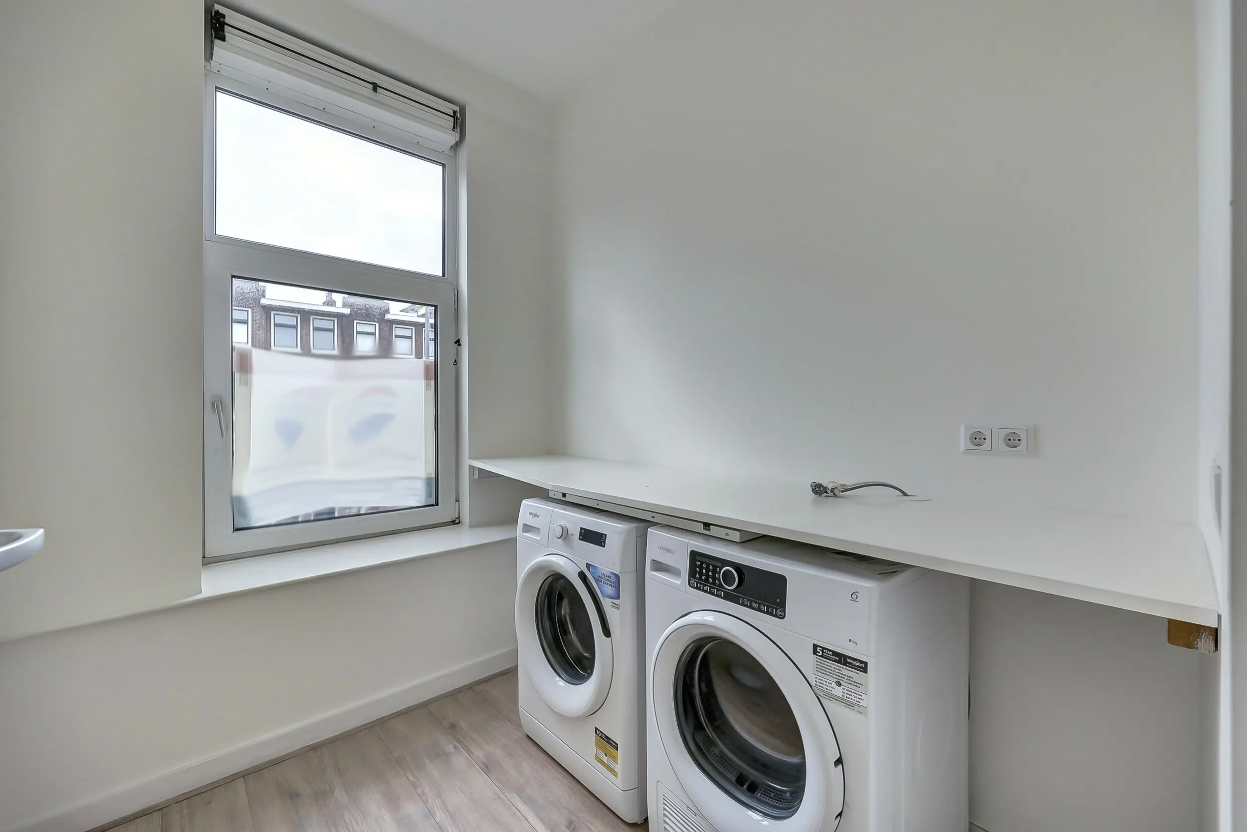 De voorkamer is een heerlijk lichte woonkamer met veel ruimte voor een grote zithoek en eventueel nog een werkplek. Vanuit de voorkamer stap je de hal aan de voorzijde in, die is voorzien van een grote kast waar de meters zijn geplaatst en waar je nog extra bergruimte hebt. De kleine kamer aan de voorzijde is voorzien van de aansluitingen voor wasmachine en droger.