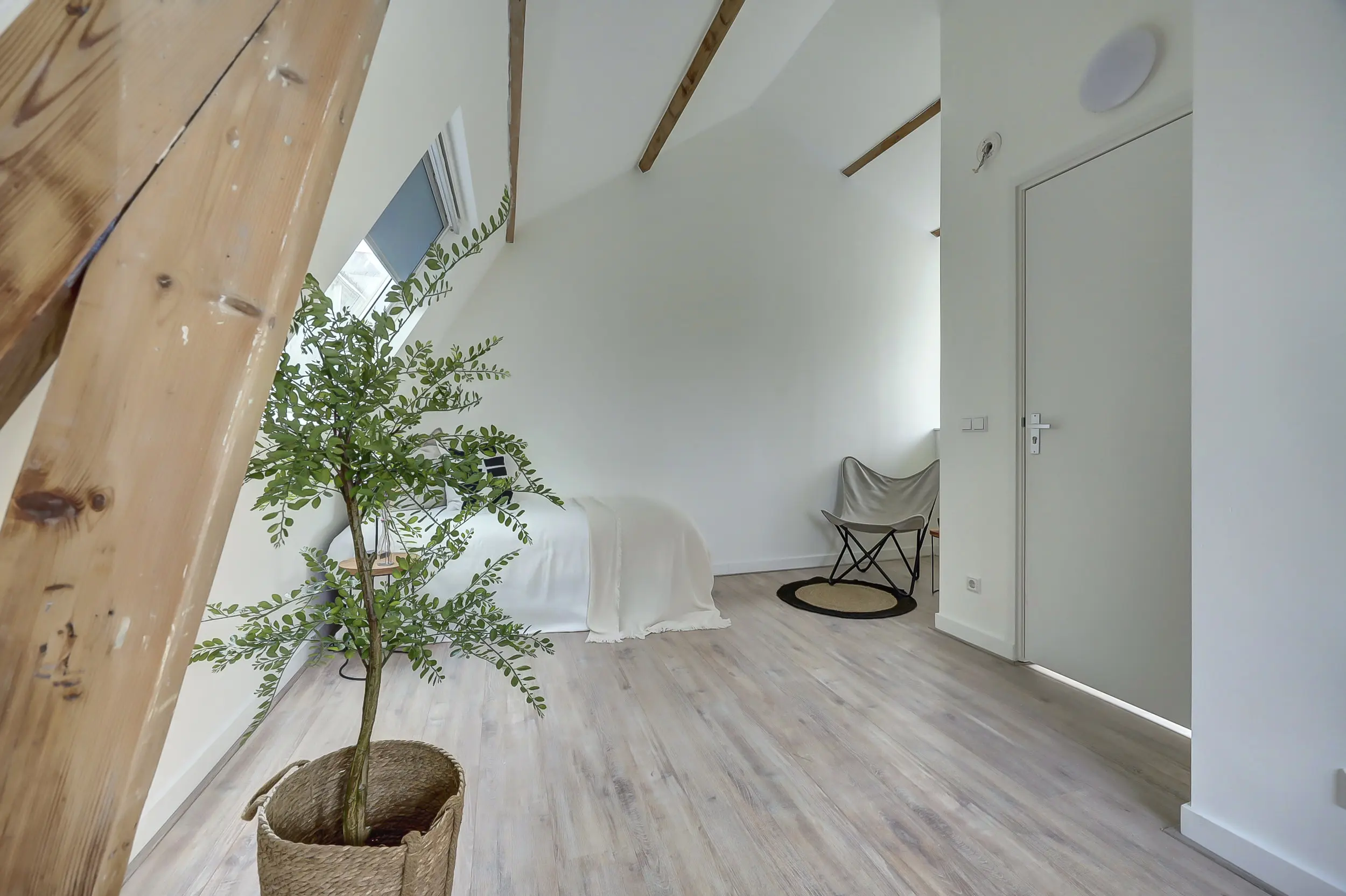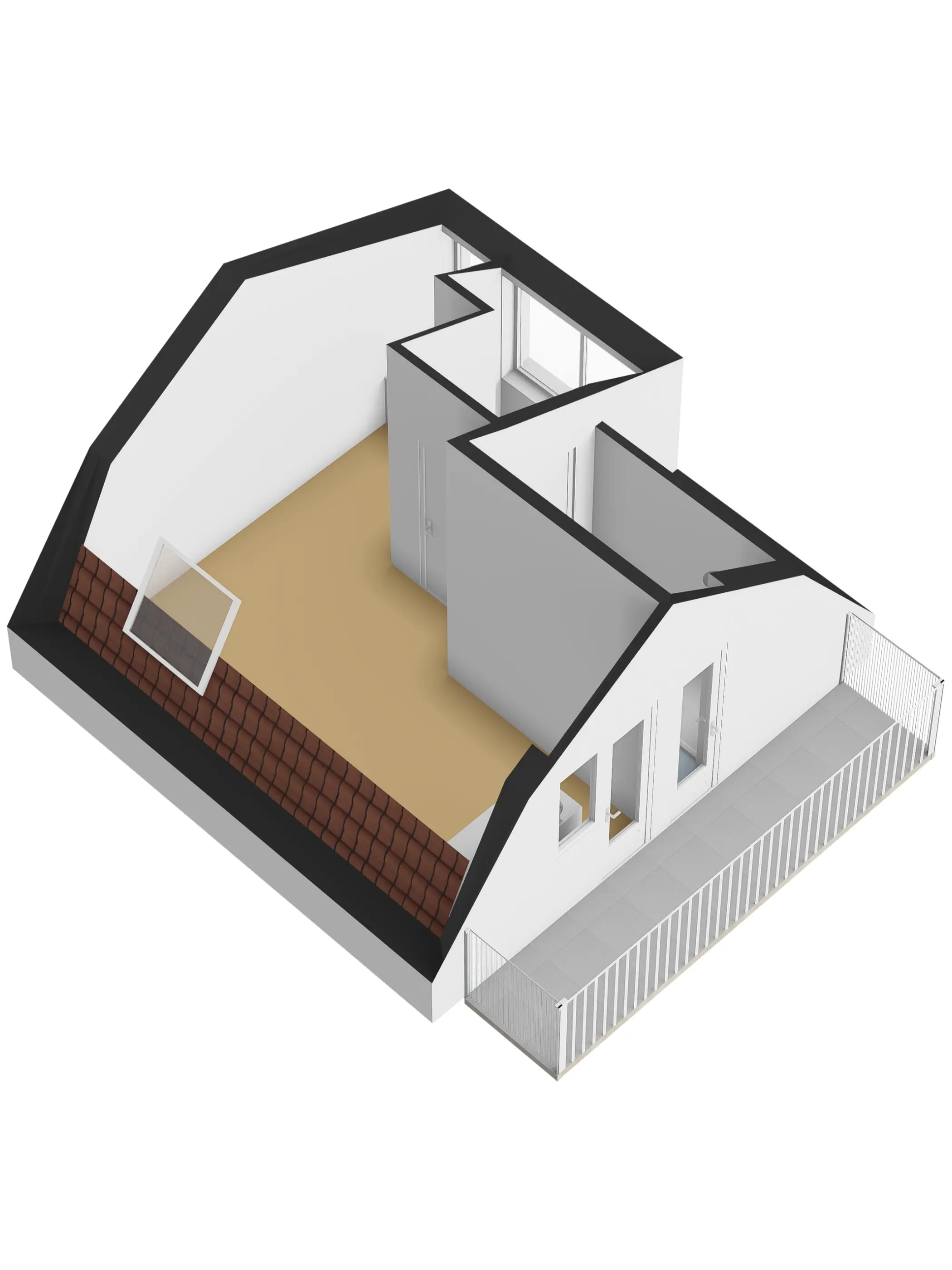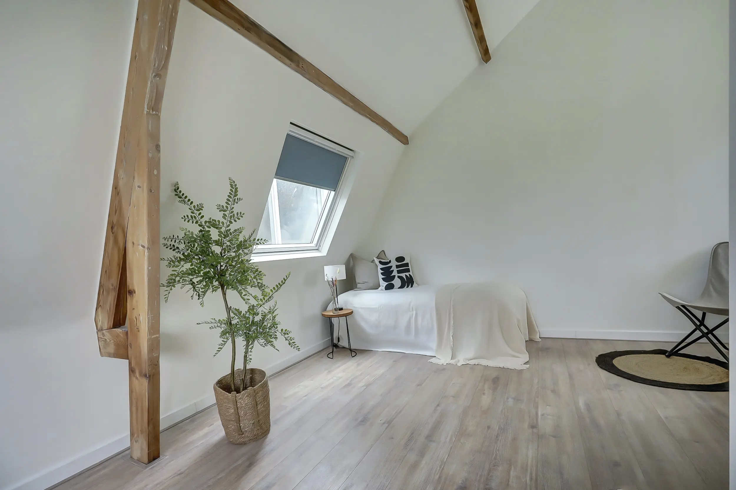 Met de trap lopen we naar de vierde verdieping, waar je beschikt over de achterste helft van de etage. Daar treffen we een sfeervolle slaapkamer met ruimte voor een groot tweepersoonsbed en voldoende plek voor kledingkasten. Vanuit deze kamer heb je toegang tot het balkon aan de achterzijde, dat ligt op het noorden — een fijn plekje om in de ochtend te genieten van een kop koffie in de zon!
