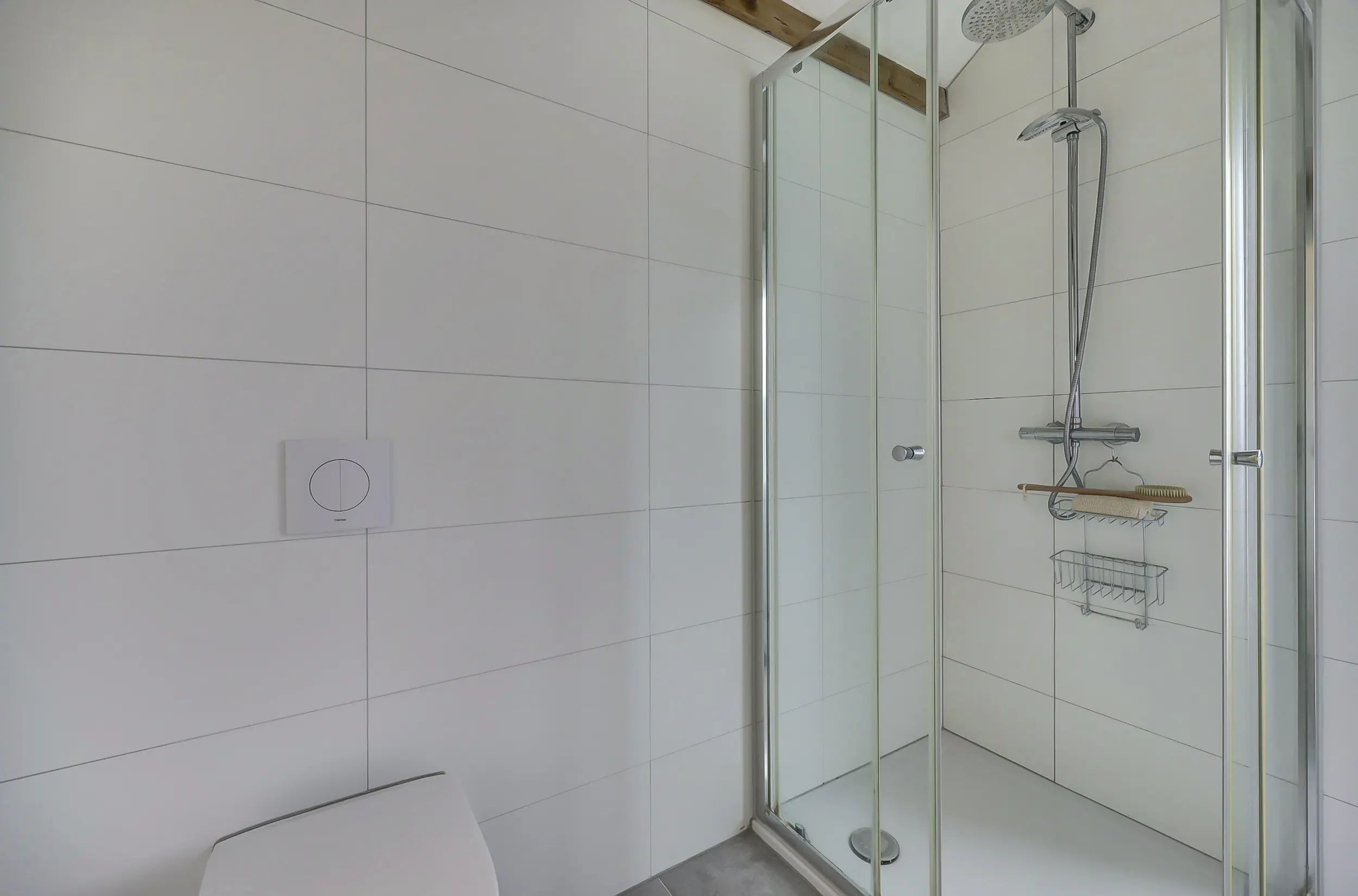 Daarnaast vinden we op deze etage de badkamer, die is voorzien van een grote douchecabine met zowel regendouche als handdouche, een tweede toilet, een dubbele wastafel met mengkranen, een grote spiegel erboven en een strak badkamermeubel. Ook vanuit de badkamer heb je toegang tot het balkon. De hoogte van het plafond maakt dit een bijzonder sfeervolle ruimte!