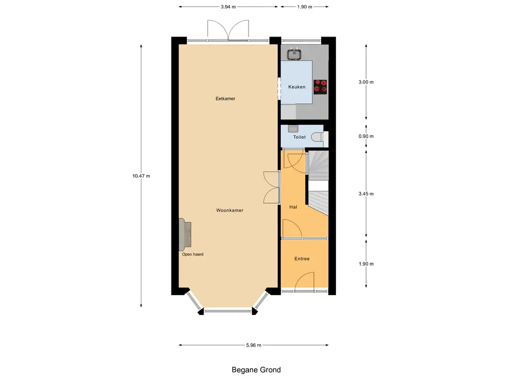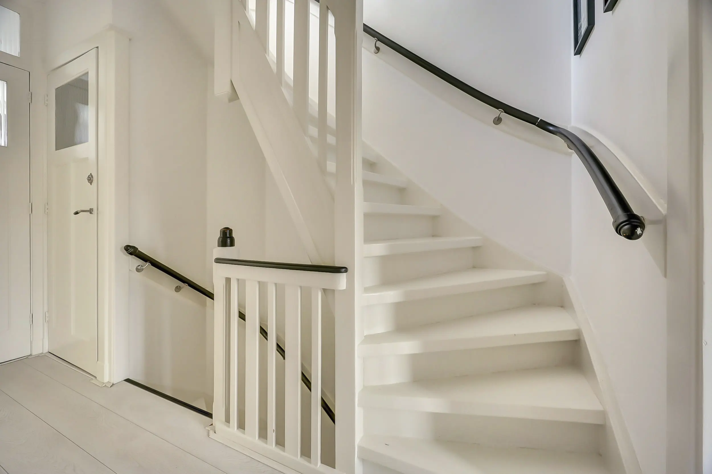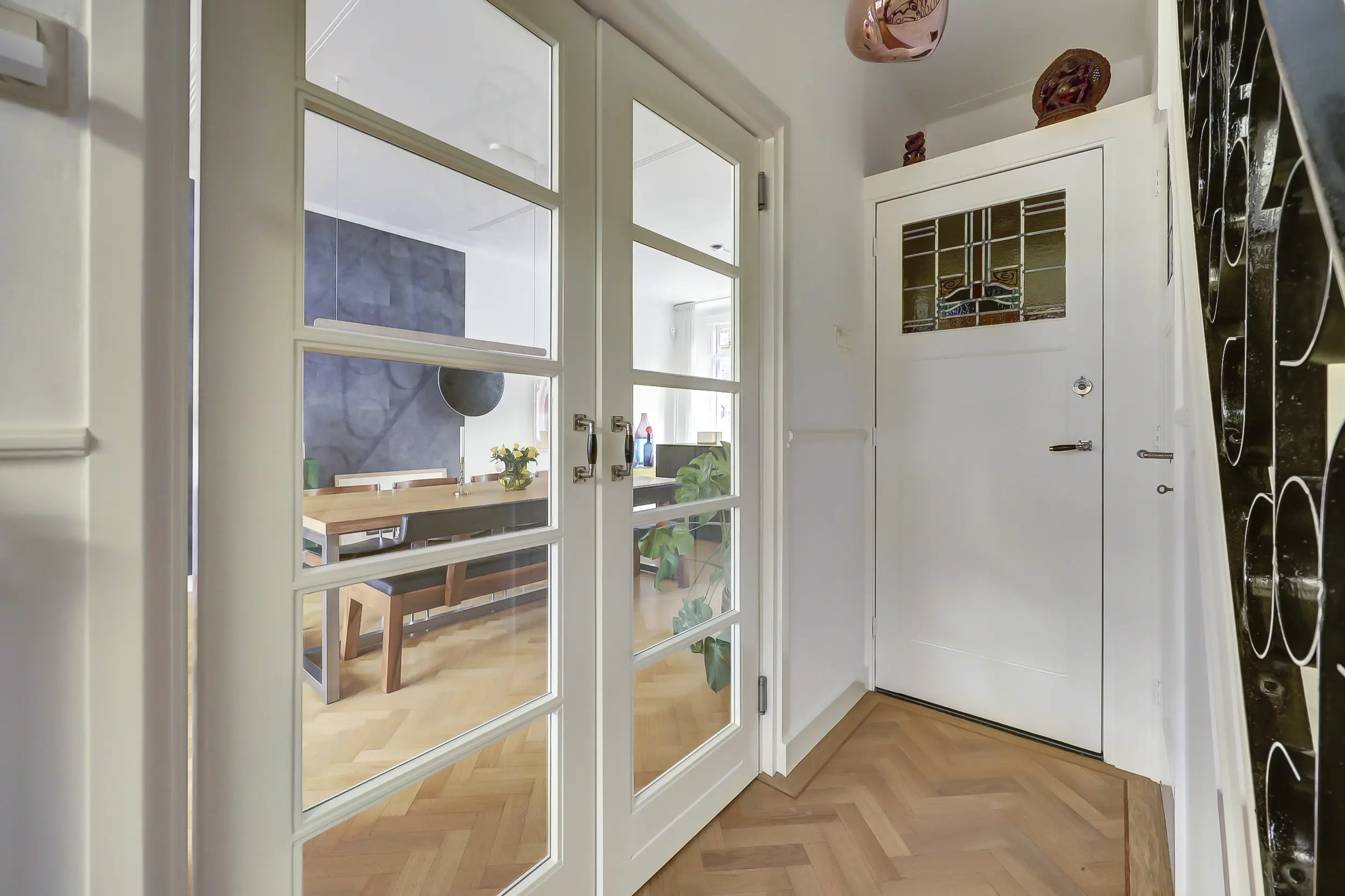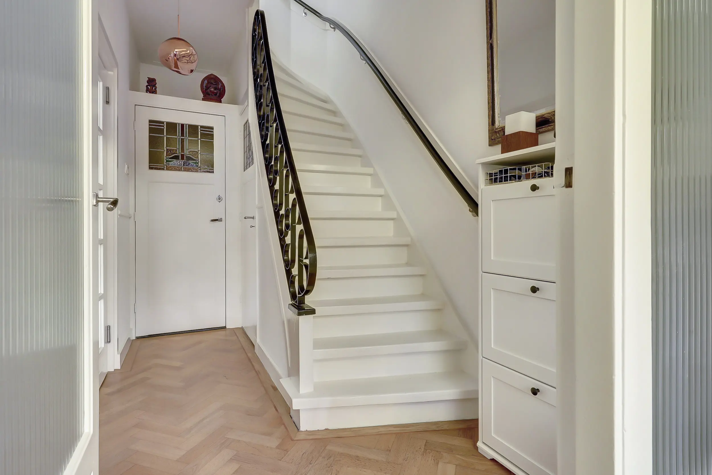 Via de voortuin bereik je de karakteristieke voordeur en stap je de charmante entree binnen met glas-in-loodramen en marmeren lambrisering. Vervolgens kom je in de hal met het toilet, de trap naar boven en toegang tot de kelder - perfect voor opslag, de wijnkelder en de ruimte waar je de wasmachine en droger kwijt kunt. Hier treffen we ook de meters voor gas, water en elektra.