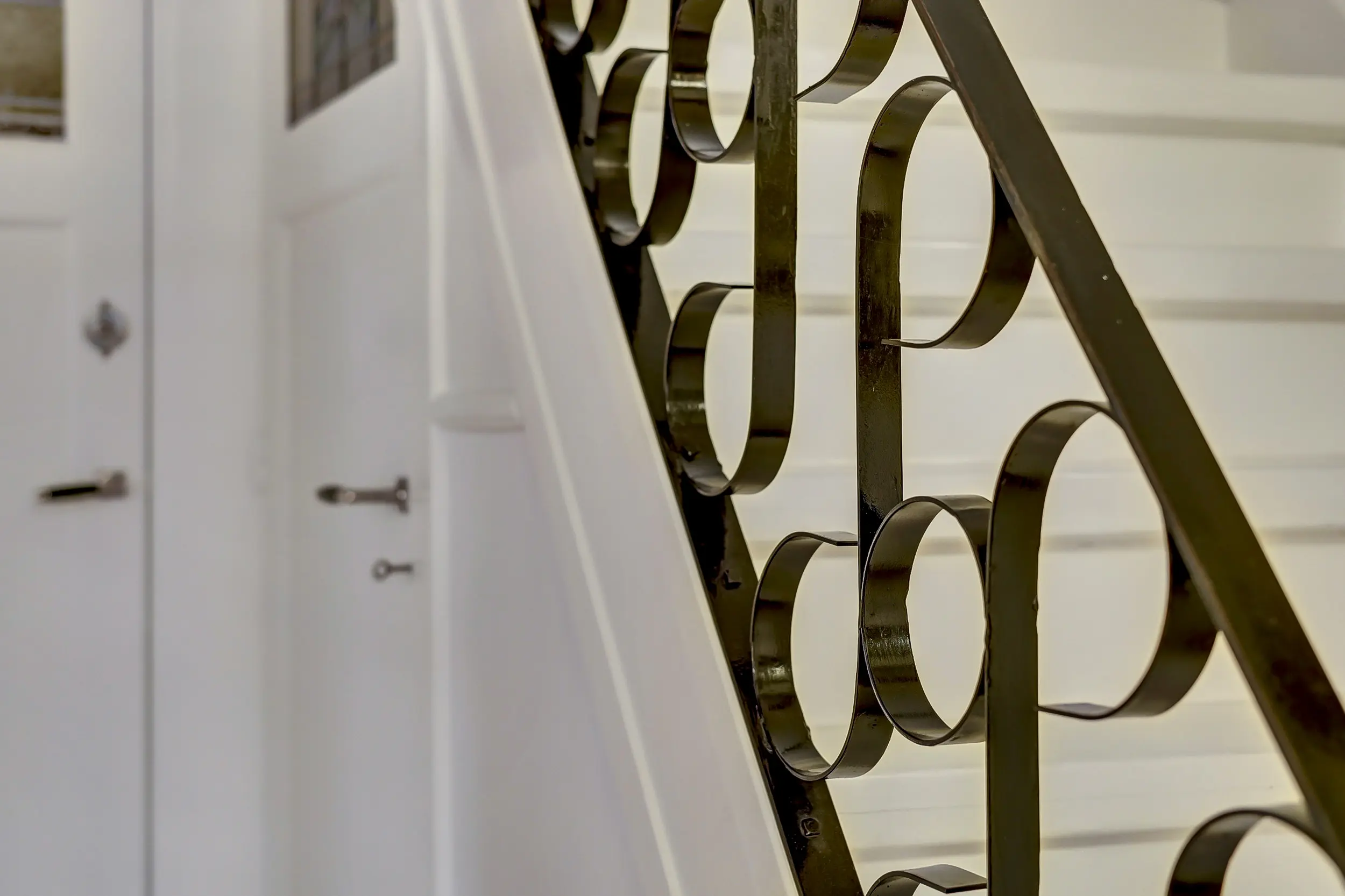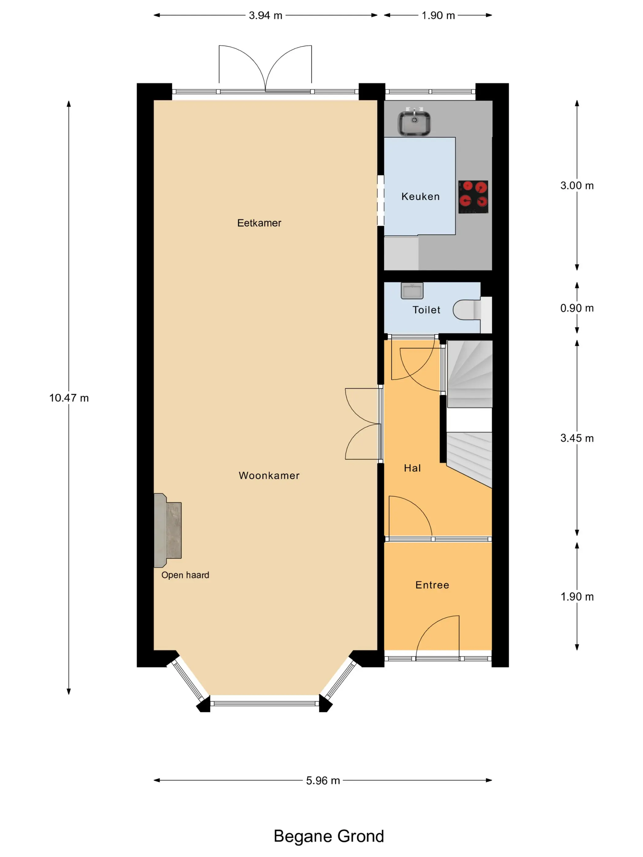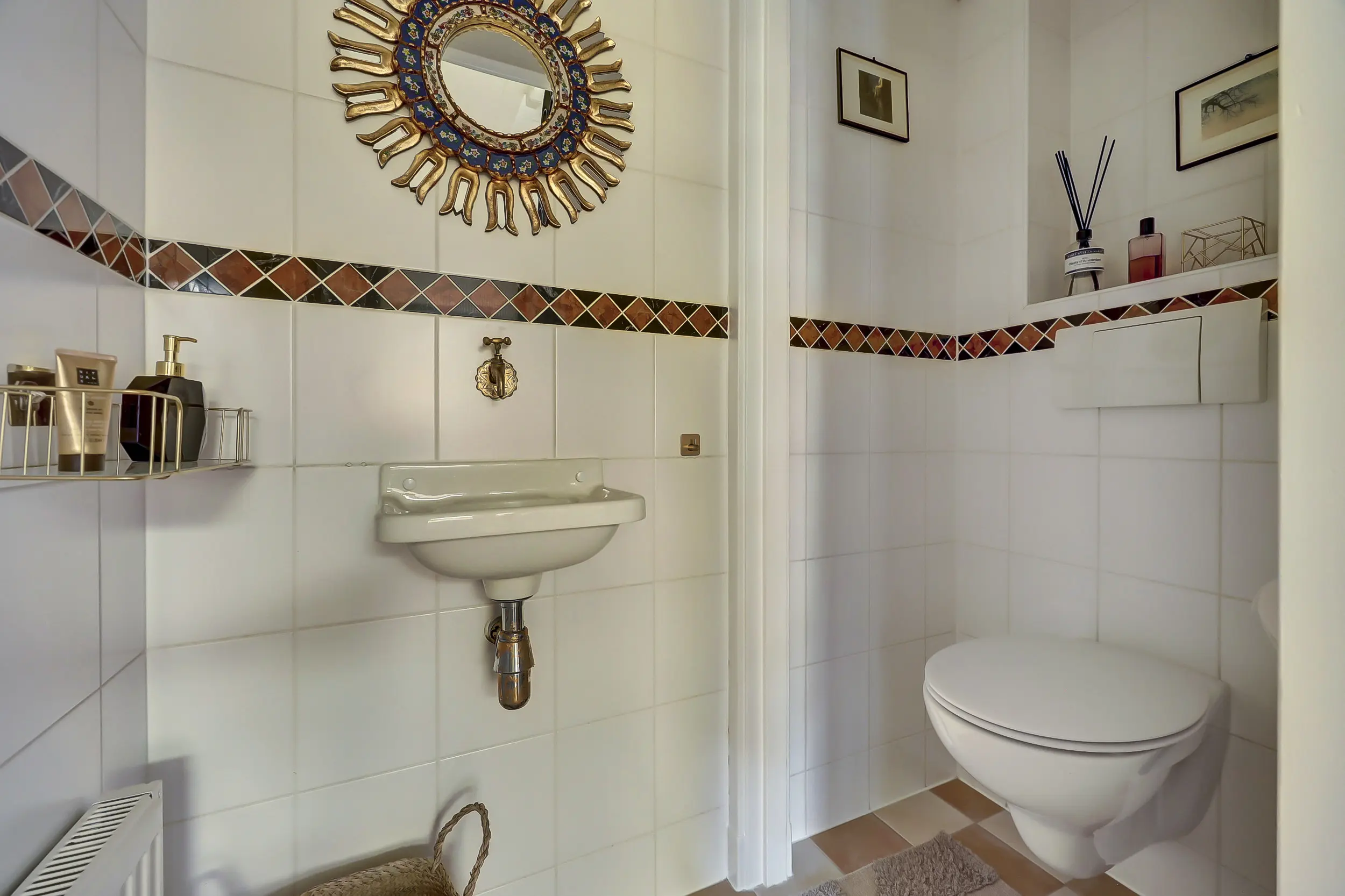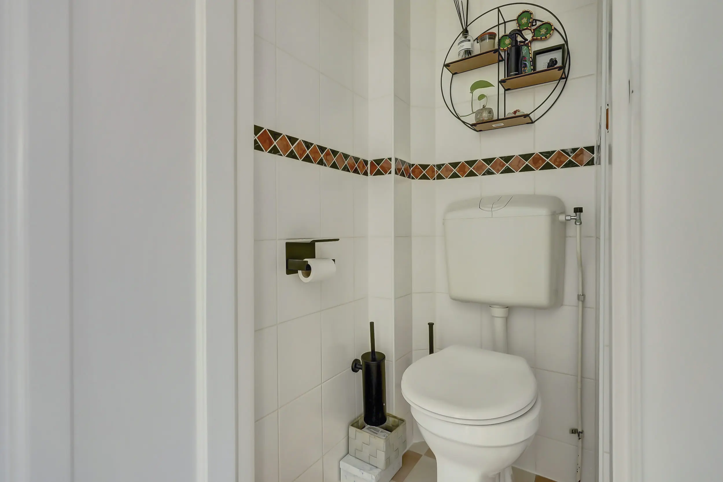 Via de voortuin bereik je de karakteristieke voordeur en stap je de charmante entree binnen met glas-in-loodramen en marmeren lambrisering. Vervolgens kom je in de hal met het toilet, de trap naar boven en toegang tot de kelder - perfect voor opslag, de wijnkelder en de ruimte waar je de wasmachine en droger kwijt kunt. Hier treffen we ook de meters voor gas, water en elektra.