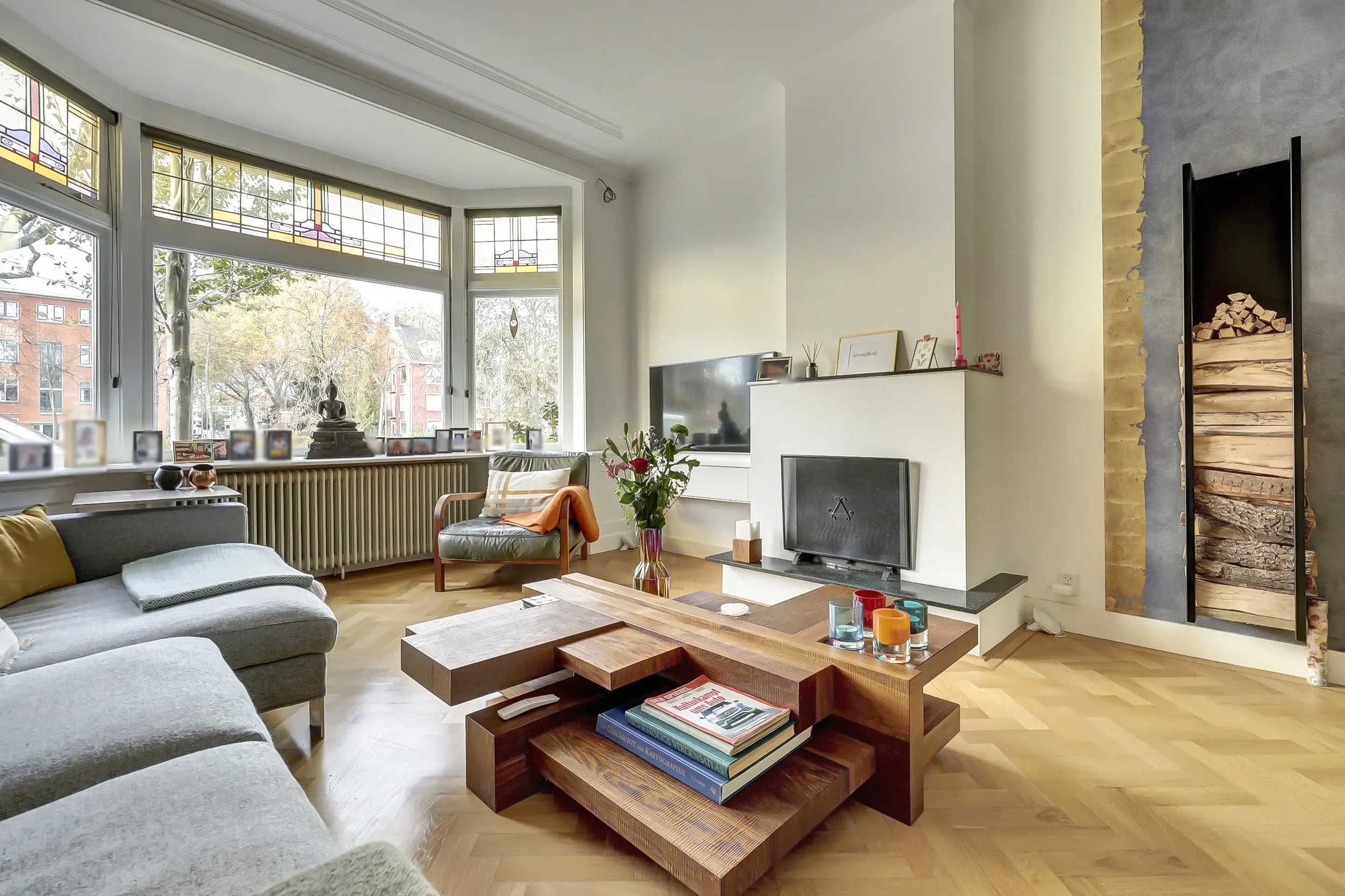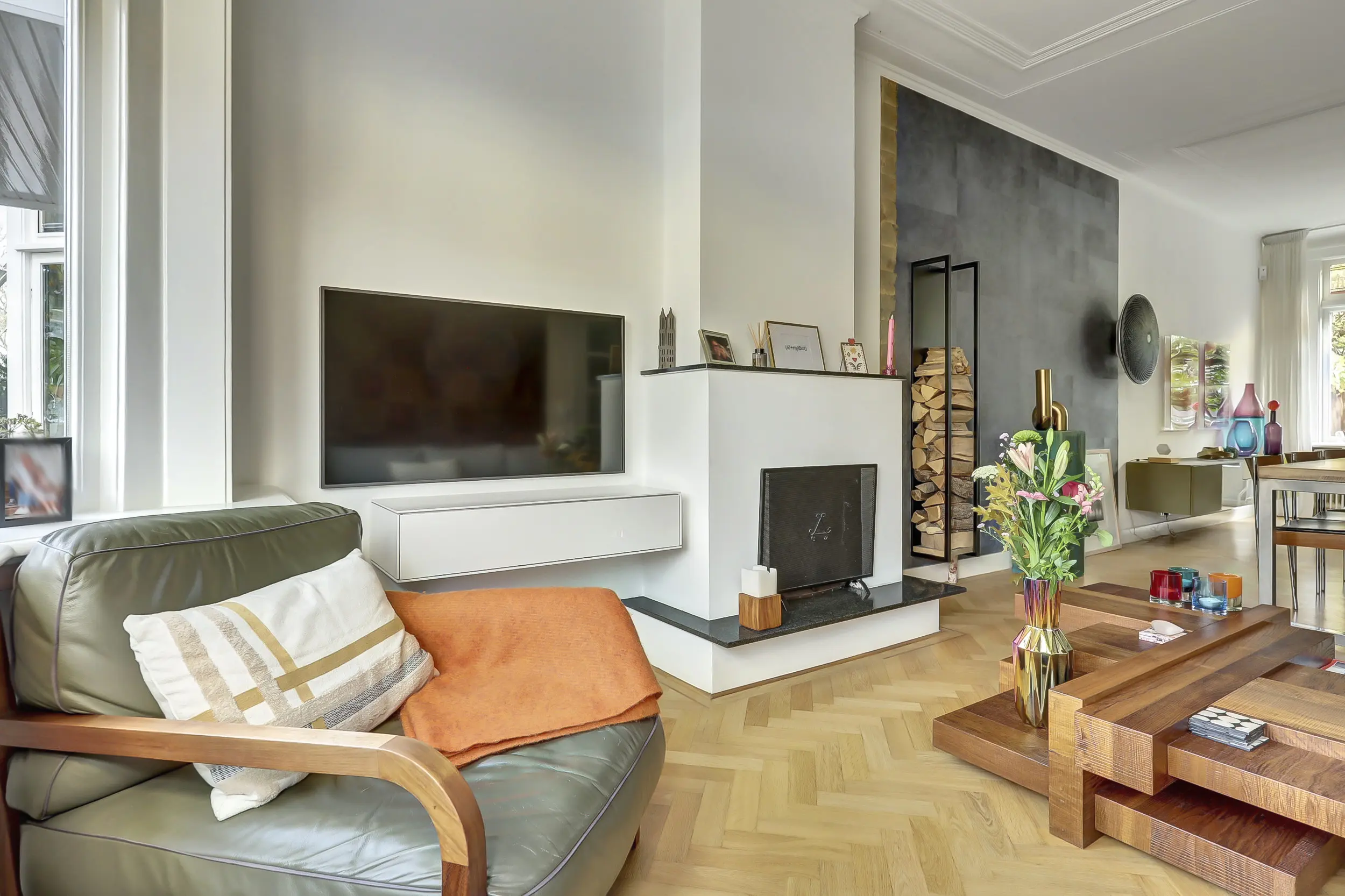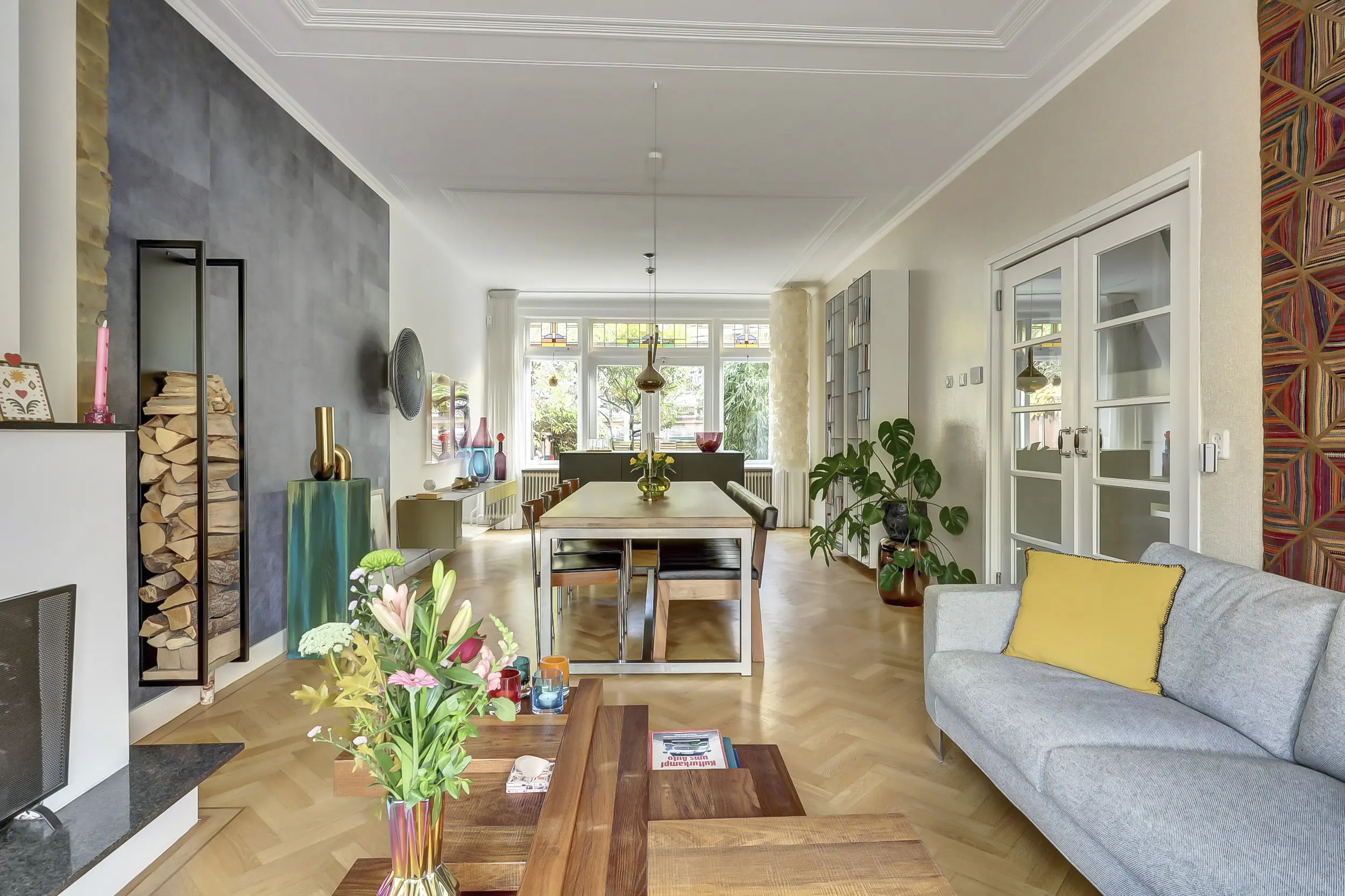 Dan betreden we door de dubbele klapdeuren met glas de woonkamer. Wat een ruimte met een prachtig plafond! De erker aan de voorzijde, het glas-in-lood en het uitzicht over het groen in de voortuin en de Vliet zijn werkelijk schitterend. In de voorkamer staat een open haard - dé plek voor je zithoek. Heerlijk gezellig bij het haardvuur.