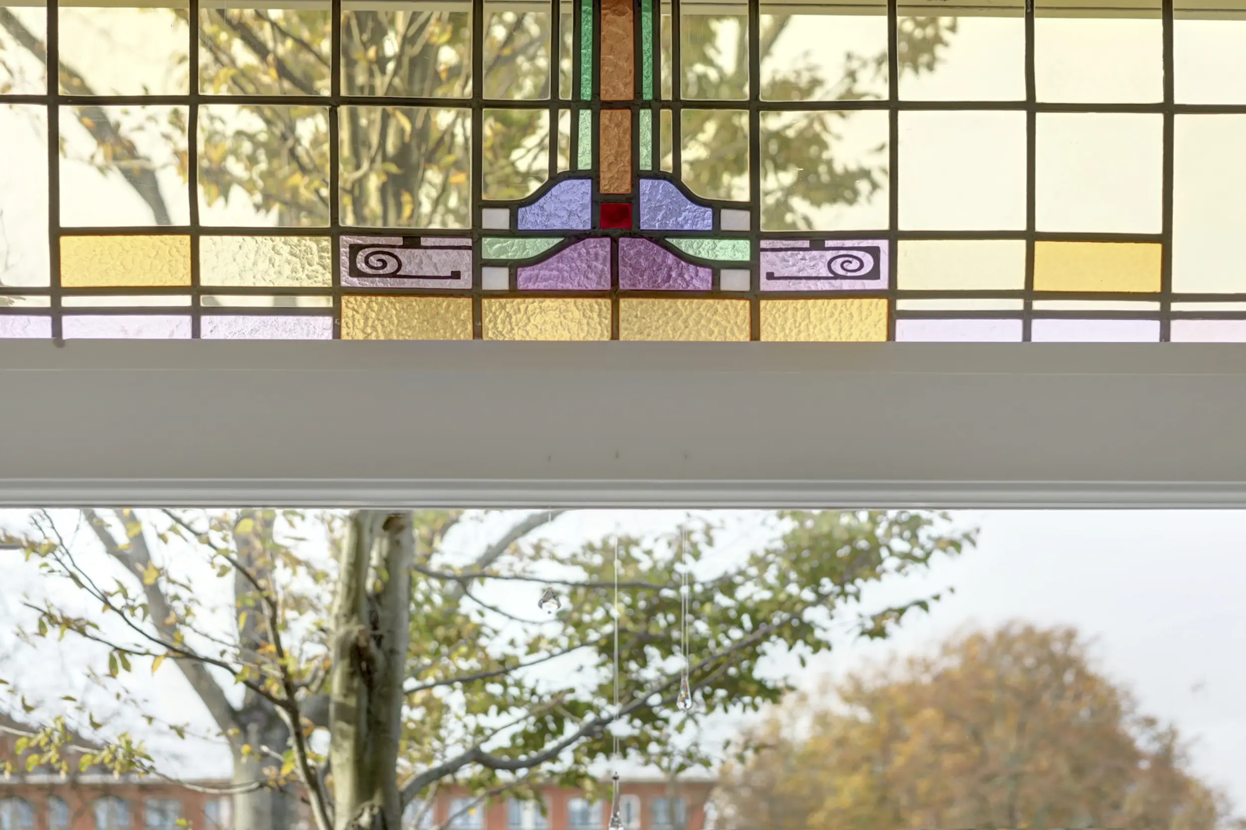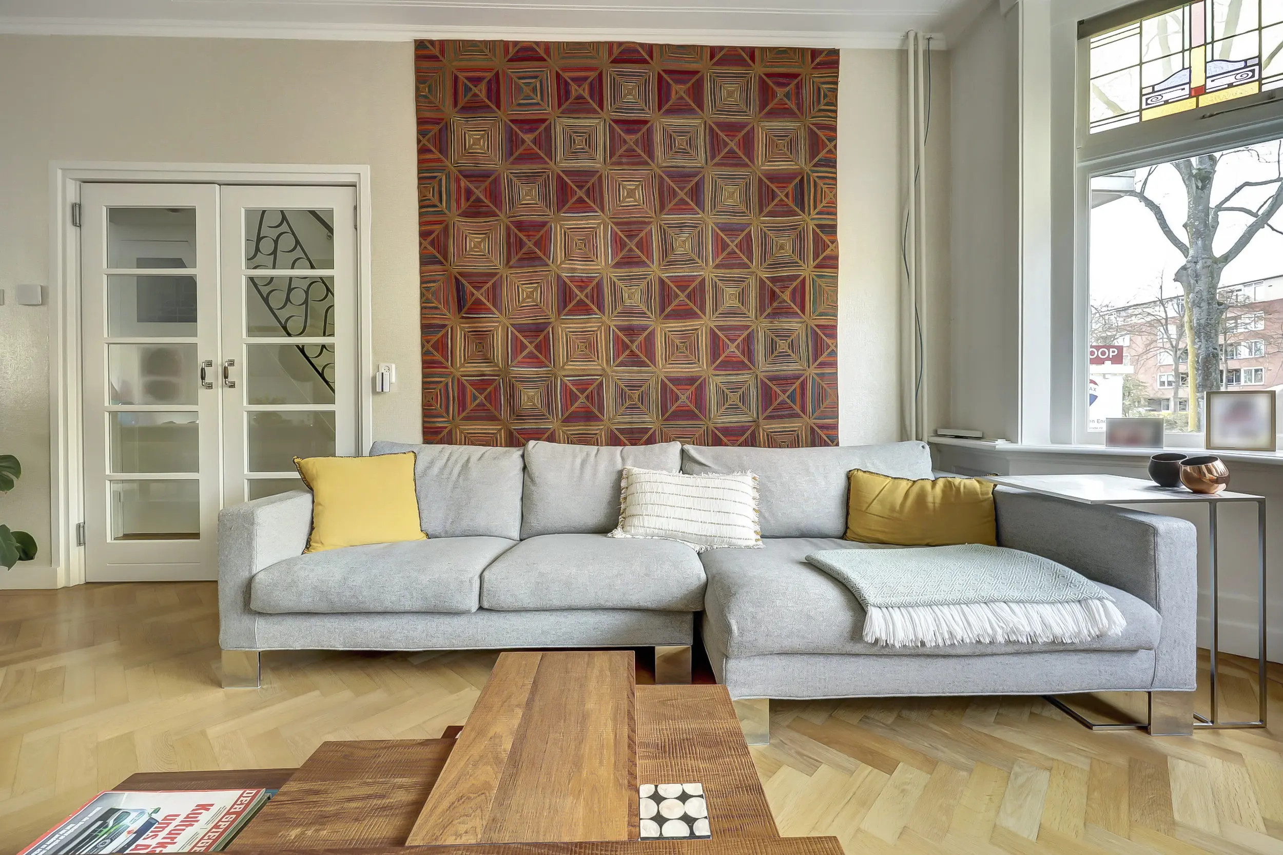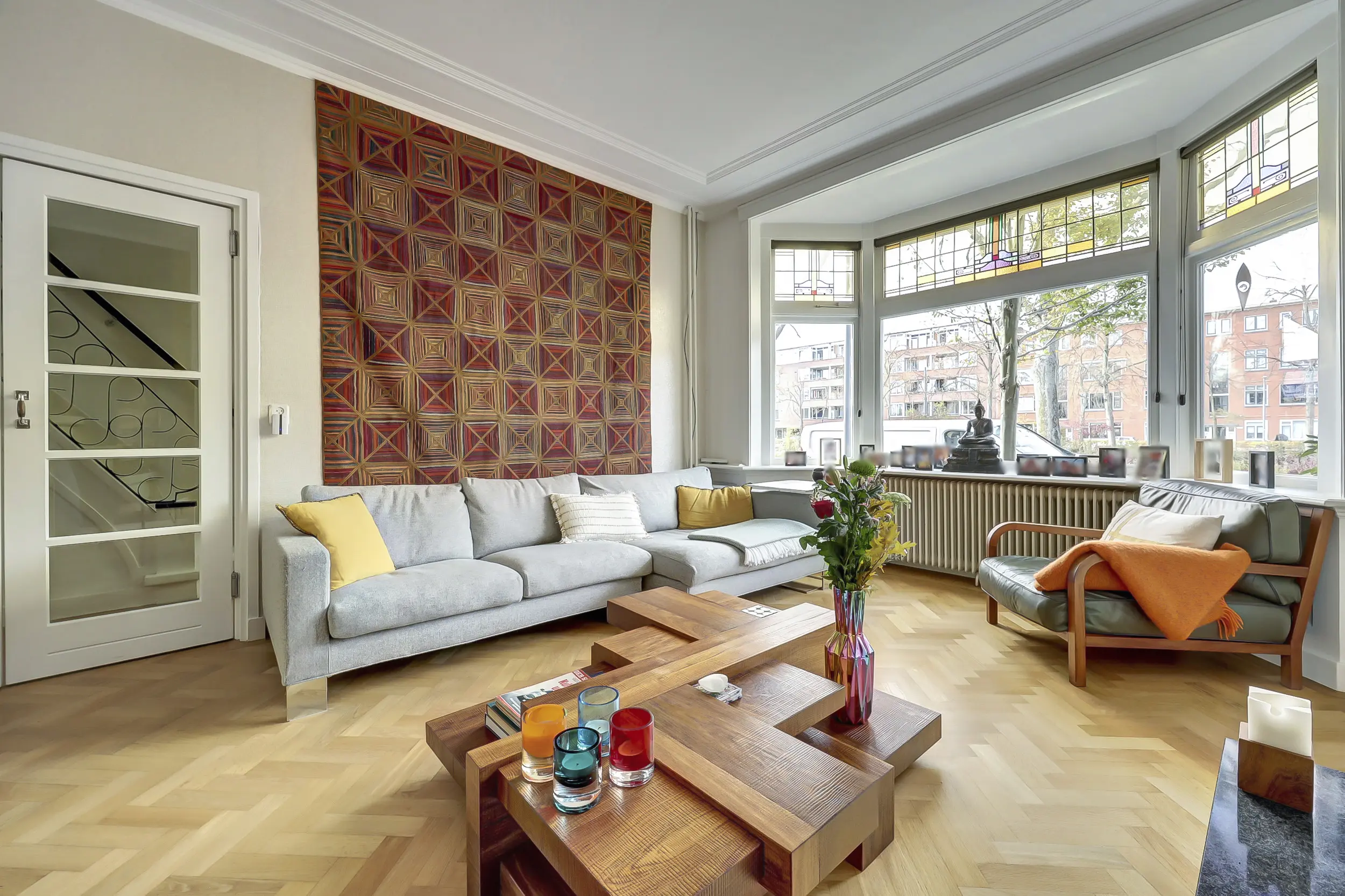 Dan betreden we door de dubbele klapdeuren met glas de woonkamer. Wat een ruimte met een prachtig plafond! De erker aan de voorzijde, het glas-in-lood en het uitzicht over het groen in de voortuin en de Vliet zijn werkelijk schitterend. In de voorkamer staat een open haard - dé plek voor je zithoek. Heerlijk gezellig bij het haardvuur.
