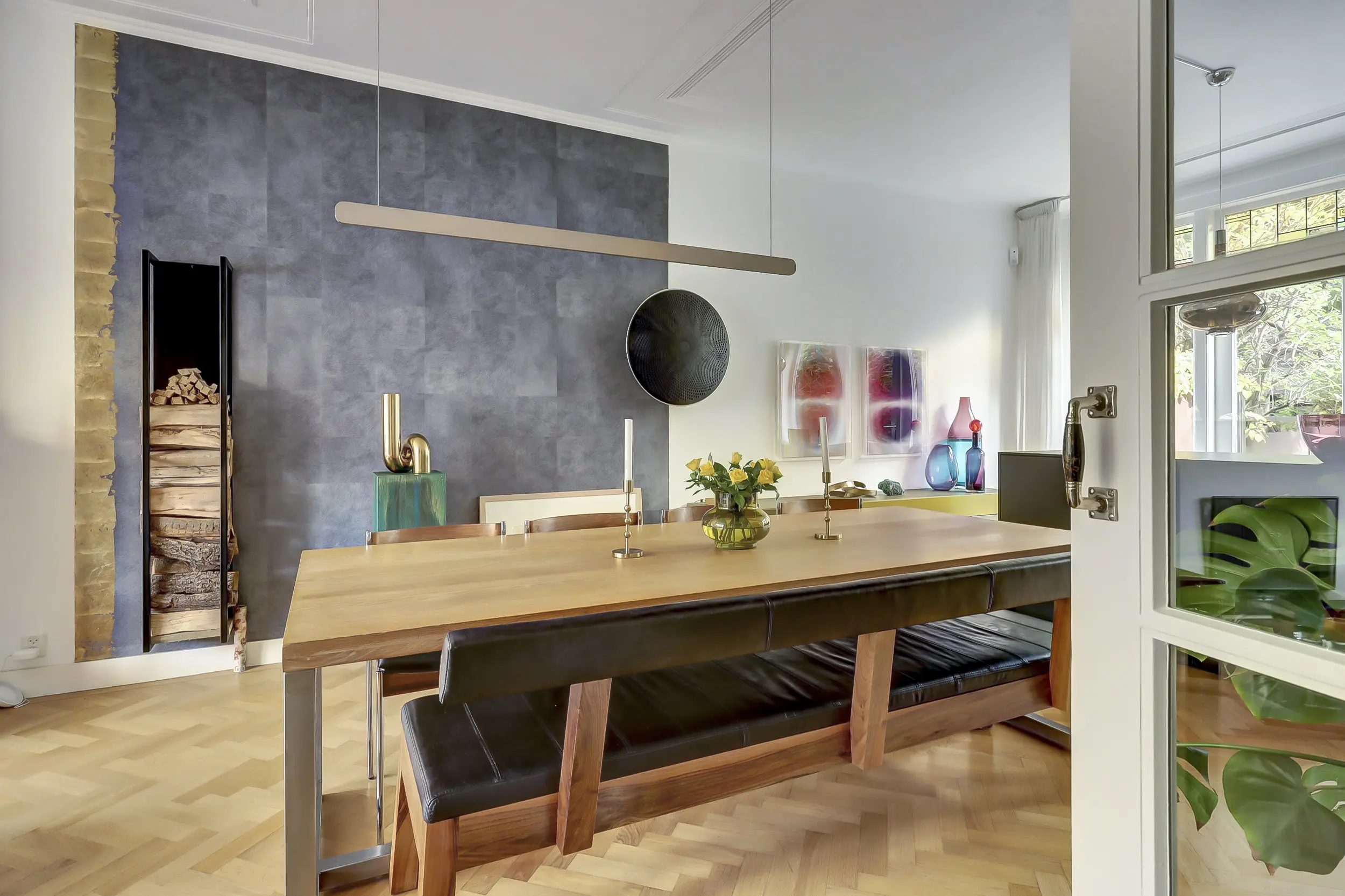 De eethoek sluit aan op het kookeiland. De Siematic keuken bestaat uit twee delen: het originele gedeelte achterin (voorheen bereikbaar via de hal, nu via de woonkamer) én het eiland, dat eraan is toegevoegd. Een slimme keuze, want hierdoor is de keuken echt deel van de woonkamer geworden.