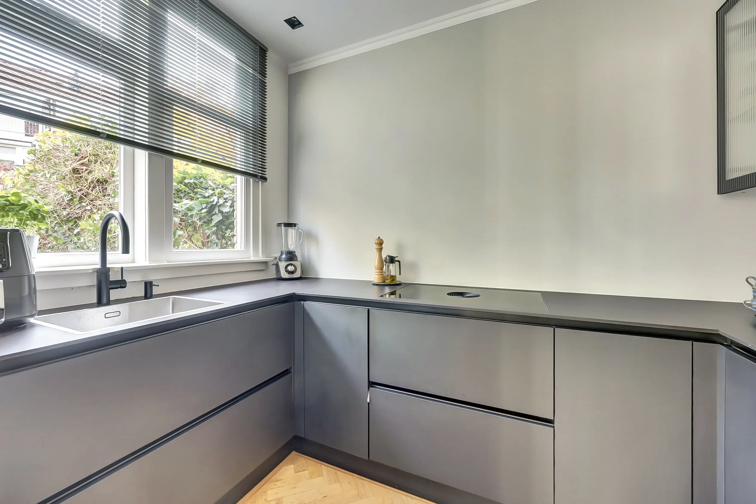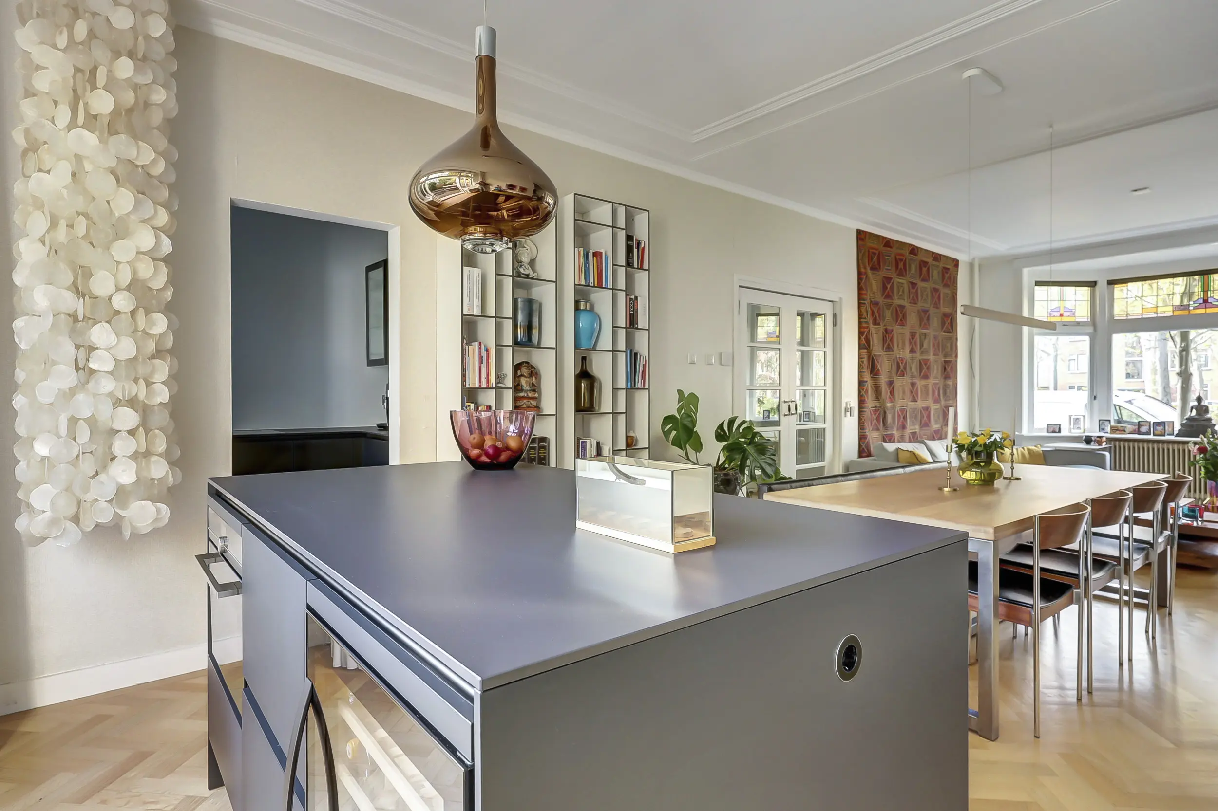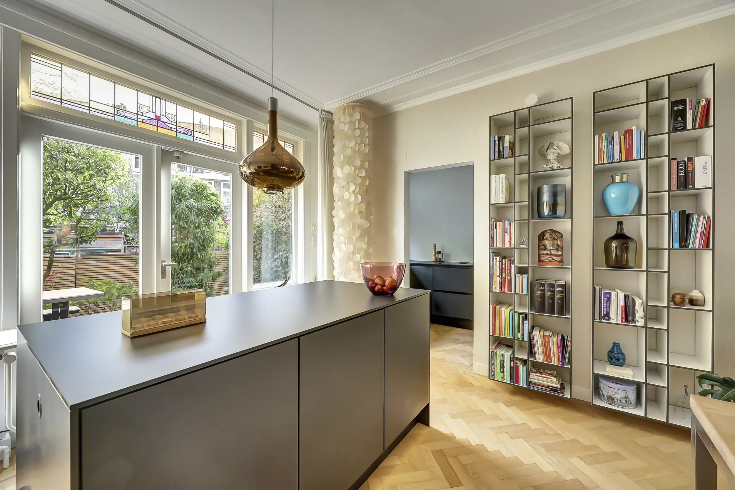 In het eiland vind je een wijnklimaatkast, de combi-oven en lekker veel bergruimte. Achter het eiland loop je via de dubbele openslaande deuren naar de tuin. Maar eerst nog even de originele keuken - in dezelfde stijl als het eiland. Hier zijn ingebouwd de grote koelkast, vriezer, vaatwasmachine, de Bora kookplaat en de verzonken RVS spoelbak met Quooker en zeepdispenser in het keukenblad. In de kastjes en laden heb je alle ruimte voor opslag. En op het keramieken keukenblad is voldoende werkruimte om prachtige gerechten te bereiden. Door het grote raam aan de achterzijde komt lekker veel licht binnen!