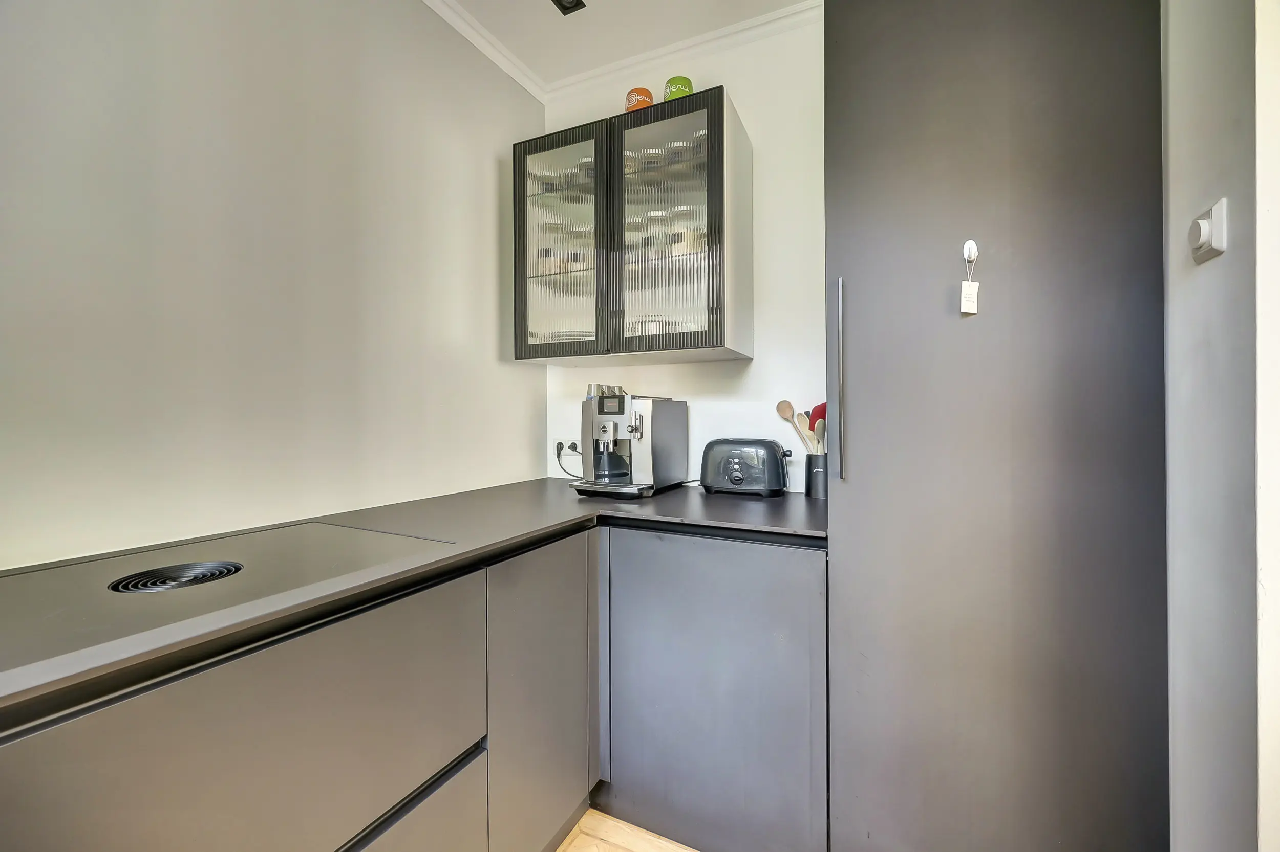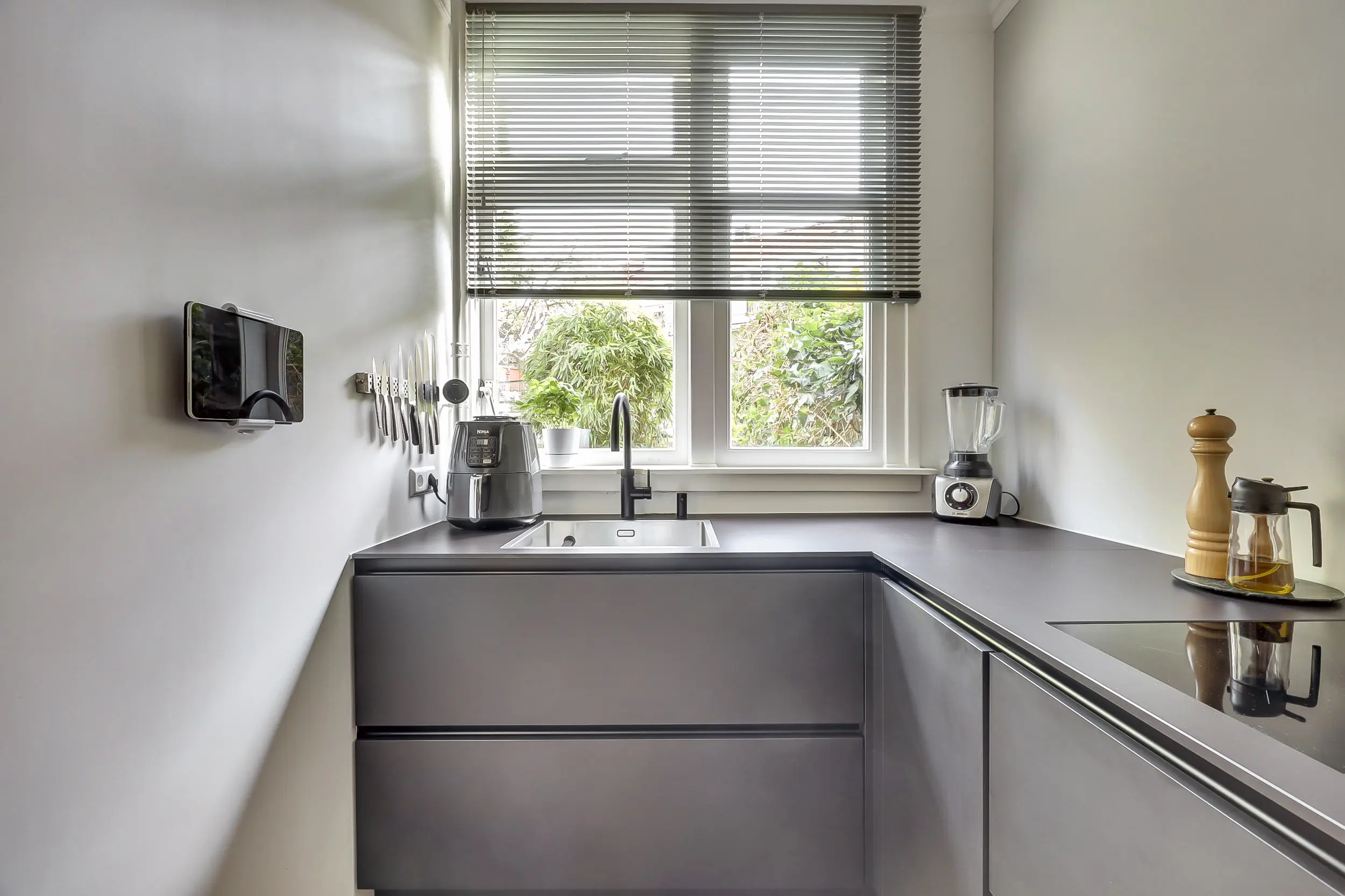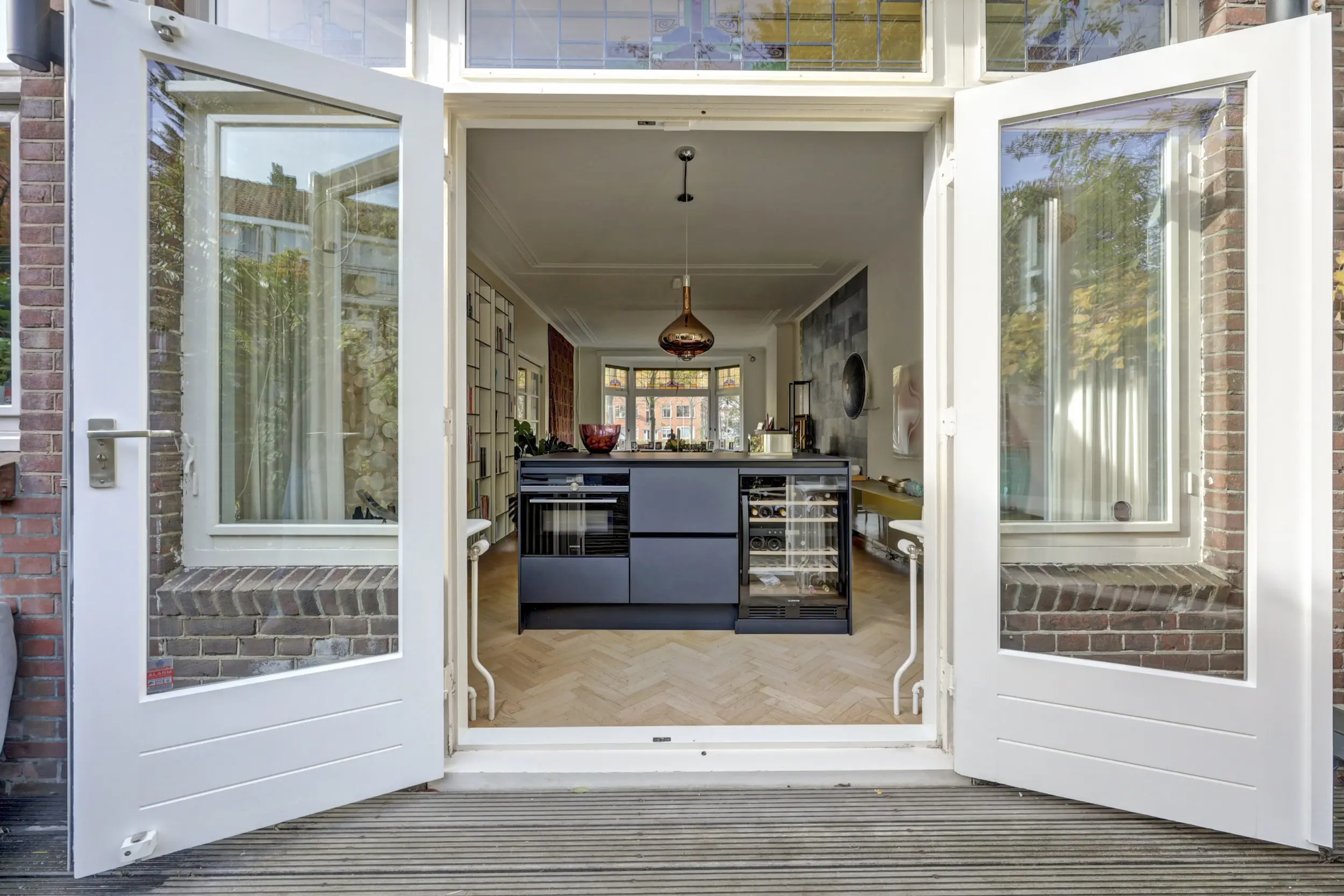 In het eiland vind je een wijnklimaatkast, de combi-oven en lekker veel bergruimte. Achter het eiland loop je via de dubbele openslaande deuren naar de tuin. Maar eerst nog even de originele keuken - in dezelfde stijl als het eiland. Hier zijn ingebouwd de grote koelkast, vriezer, vaatwasmachine, de Bora kookplaat en de verzonken RVS spoelbak met Quooker en zeepdispenser in het keukenblad. In de kastjes en laden heb je alle ruimte voor opslag. En op het keramieken keukenblad is voldoende werkruimte om prachtige gerechten te bereiden. Door het grote raam aan de achterzijde komt lekker veel licht binnen!