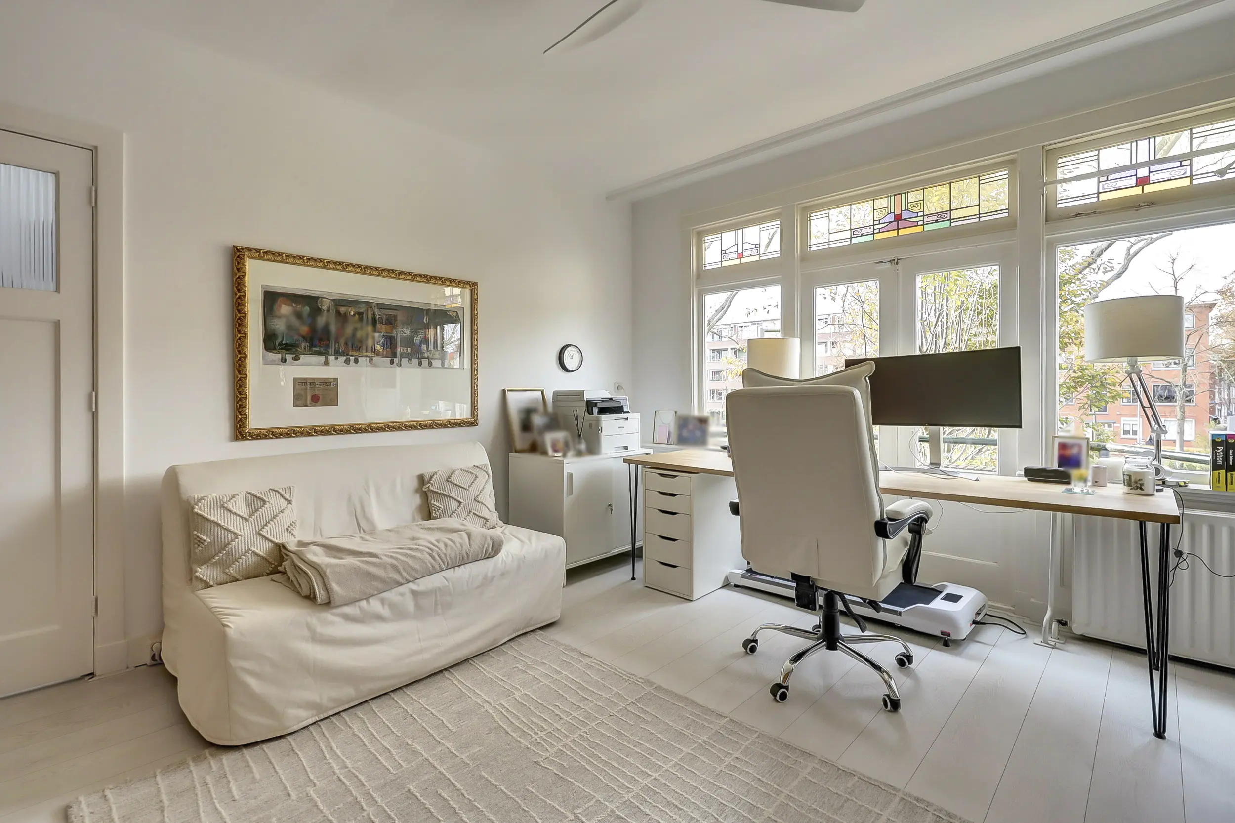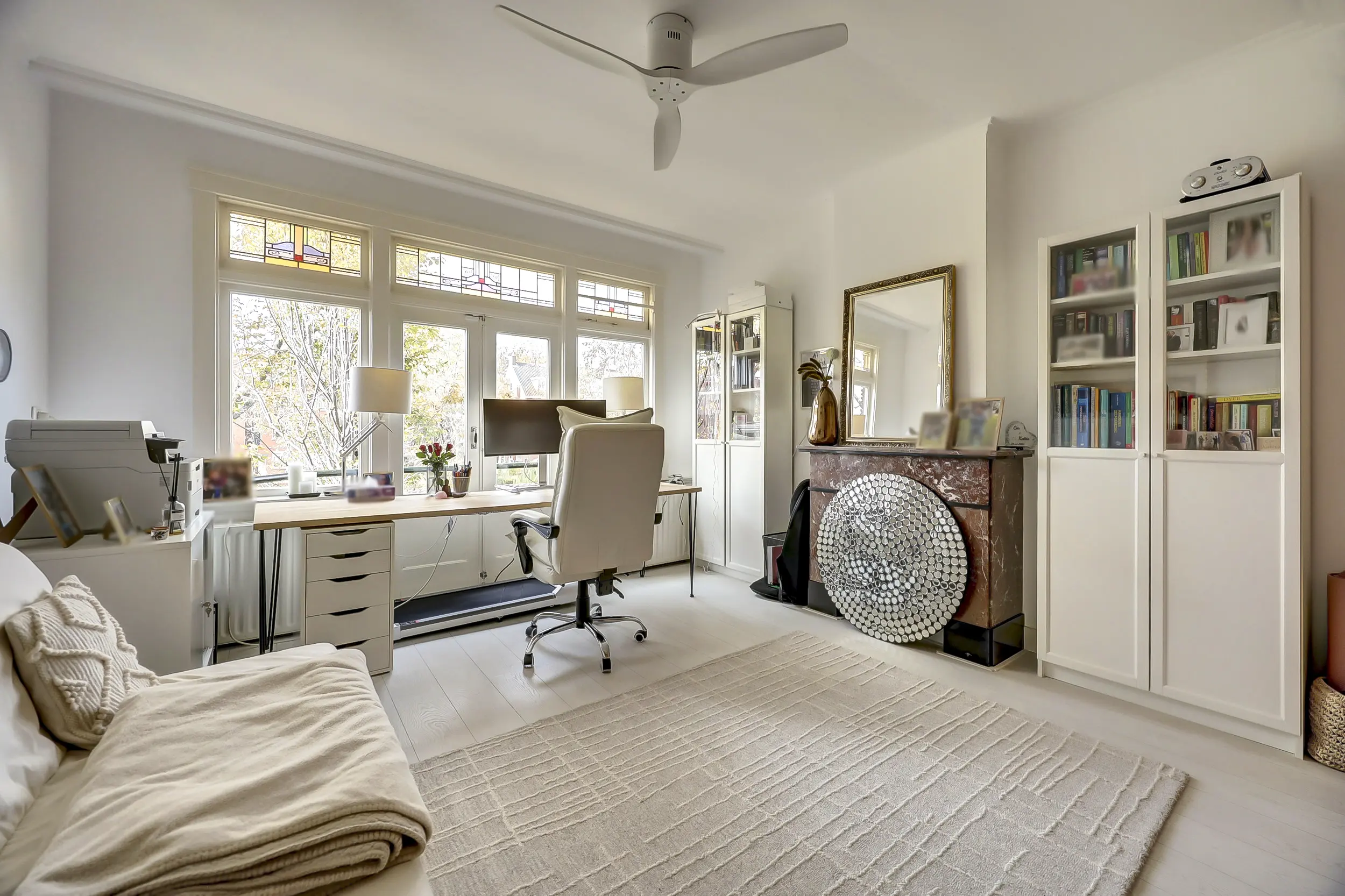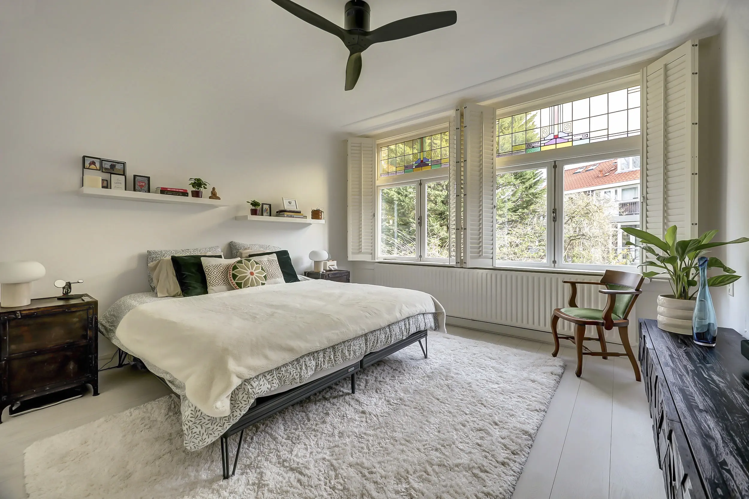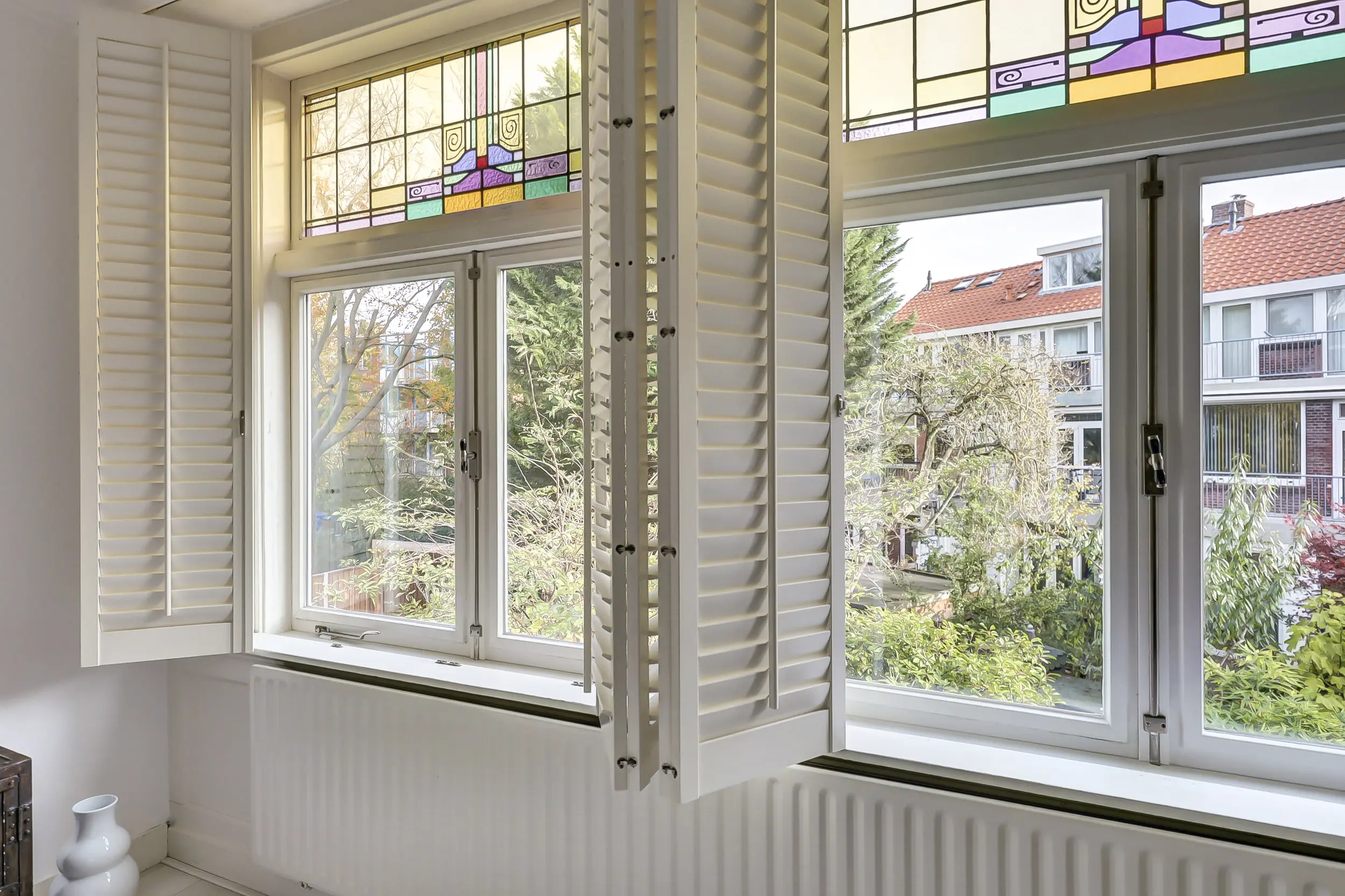 De tweede slaapkamer aan de voorzijde van ca. 20 m² is misschien wel de mooiste ruimte. Een heerlijk ruime kamer met over de gehele breedte een ingebouwde kledingkast. Aan de voorzijde openslaande deuren naar het balkon waar je prachtig uitkijkt over de Vliet! In deze kamer valt ook het glas-in-lood weer op, wat blijft dat toch mooi!