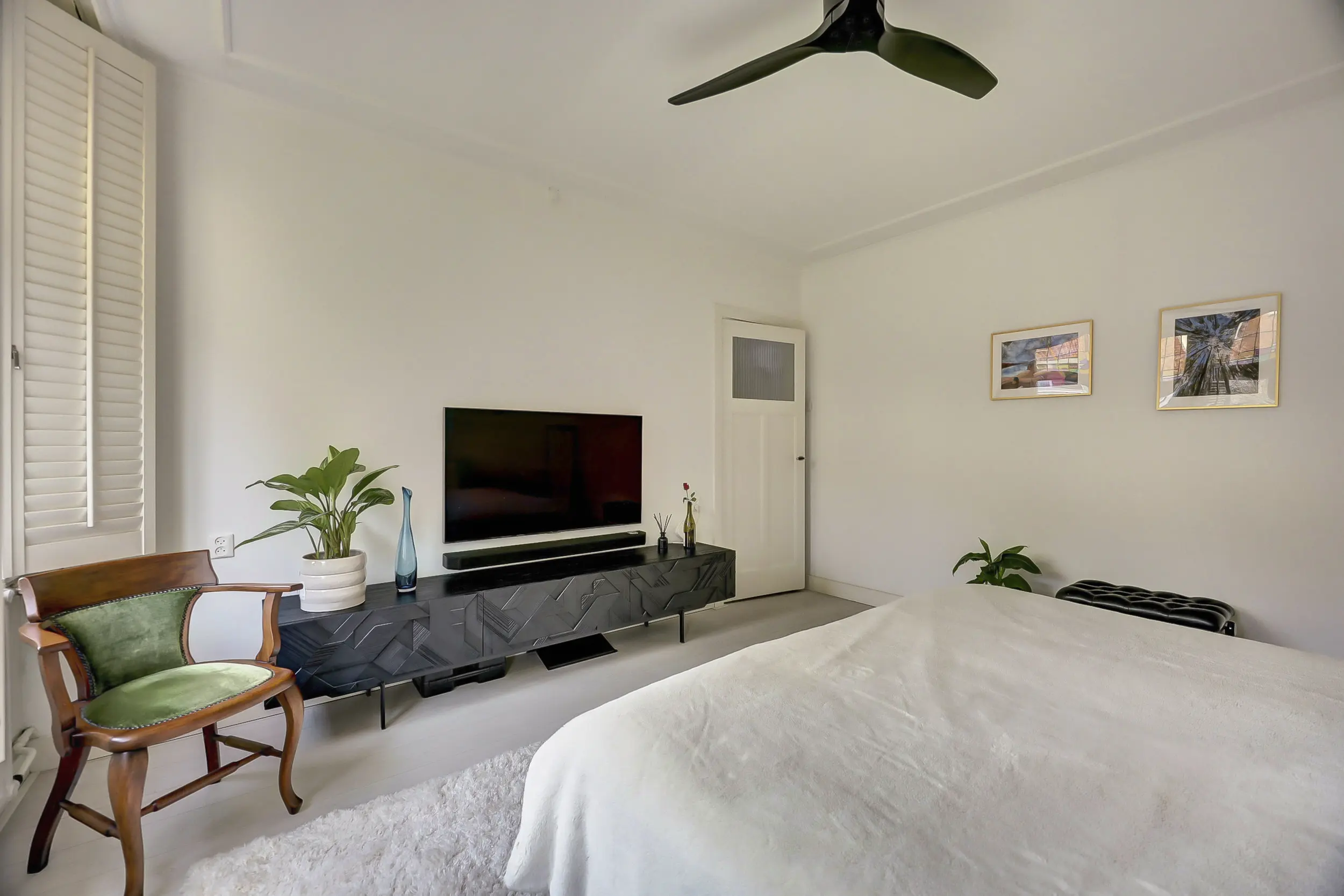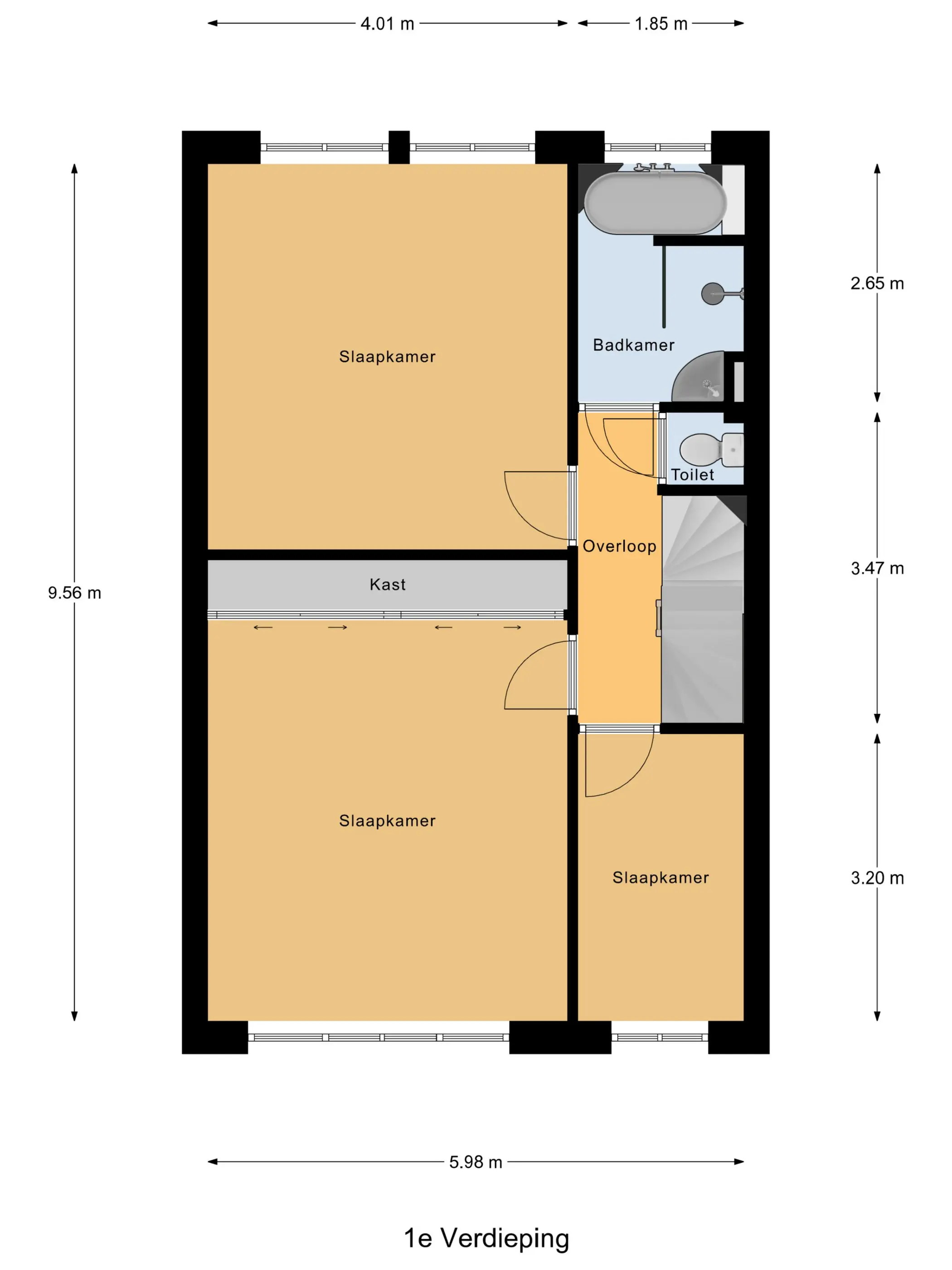Via de trap komen we op de eerste verdieping. Hier treffen we een drietal kamers. De hoofdslaapkamer aan de achterzijde van ca. 17 m² is heerlijk licht door de grote ramen aan de achterzijde. Er is ruimte genoeg voor een groot tweepersoonsbed en een grote kledingkast. De shutters geven de ruimte extra veel sfeer!