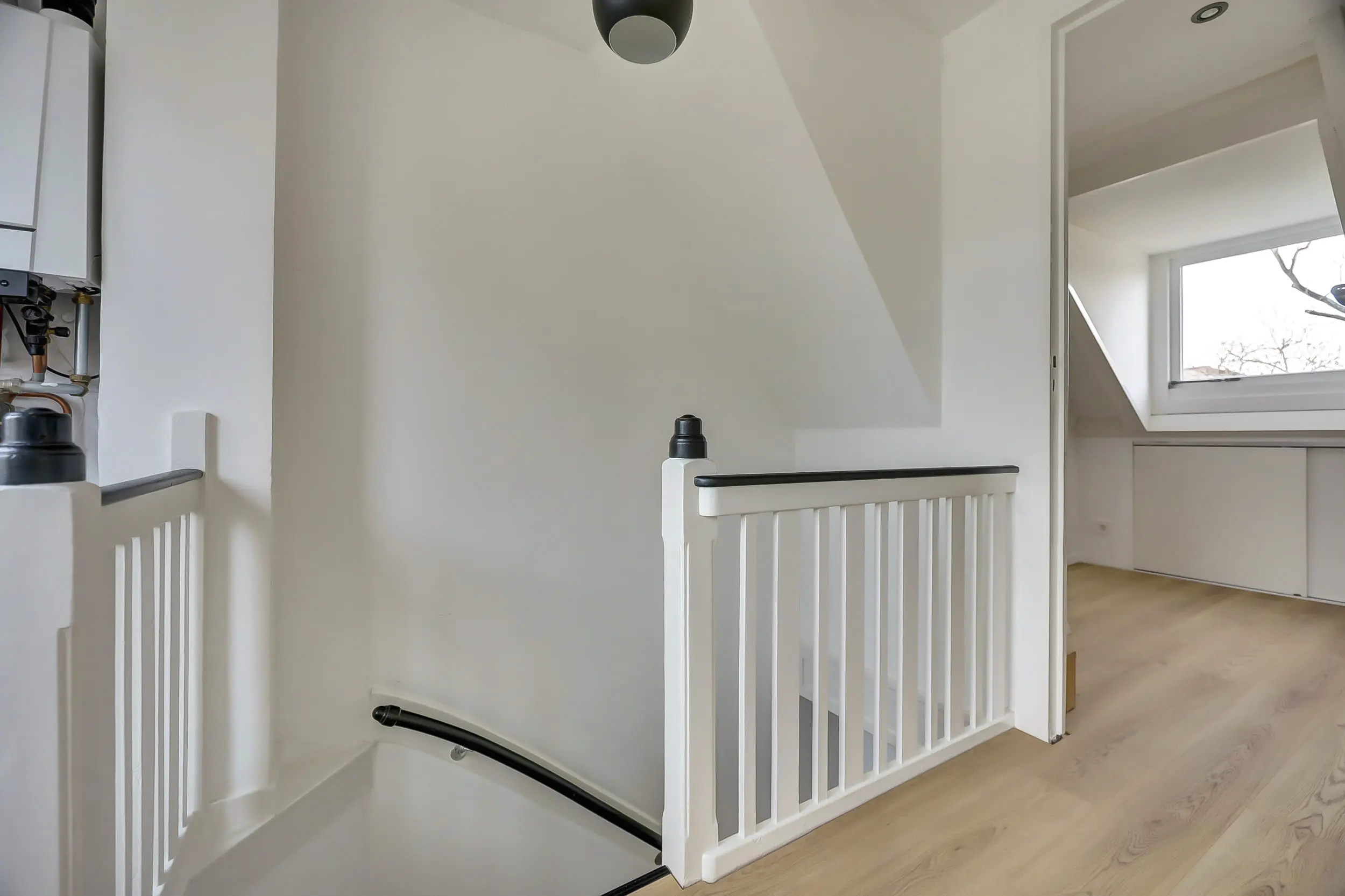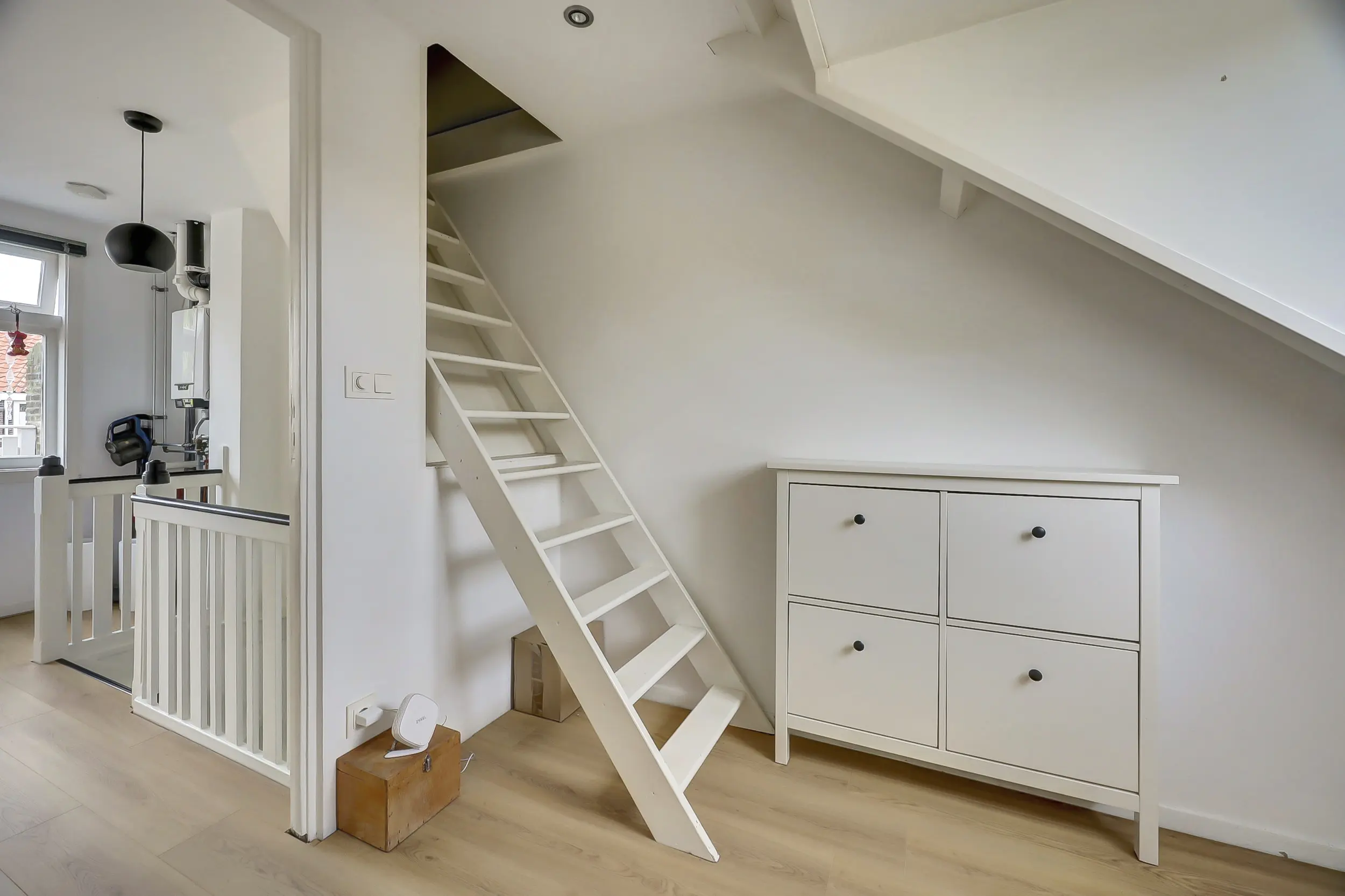We vervolgen onze weg naar de tweede verdieping, zéker geen zolderverdieping. Op de overloop is een praktische werkplek gemaakt bij het raam aan de voorzijde. Hier staat ook een fraaie kast waarin wasmachine en droger op werkhoogte passen, met daaronder opbergruimte voor wasmiddelen. Handig! Op de overloop treffen we de opstelplaats van de CV-ketel en toegang tot twee grote kamers en het dakterras.