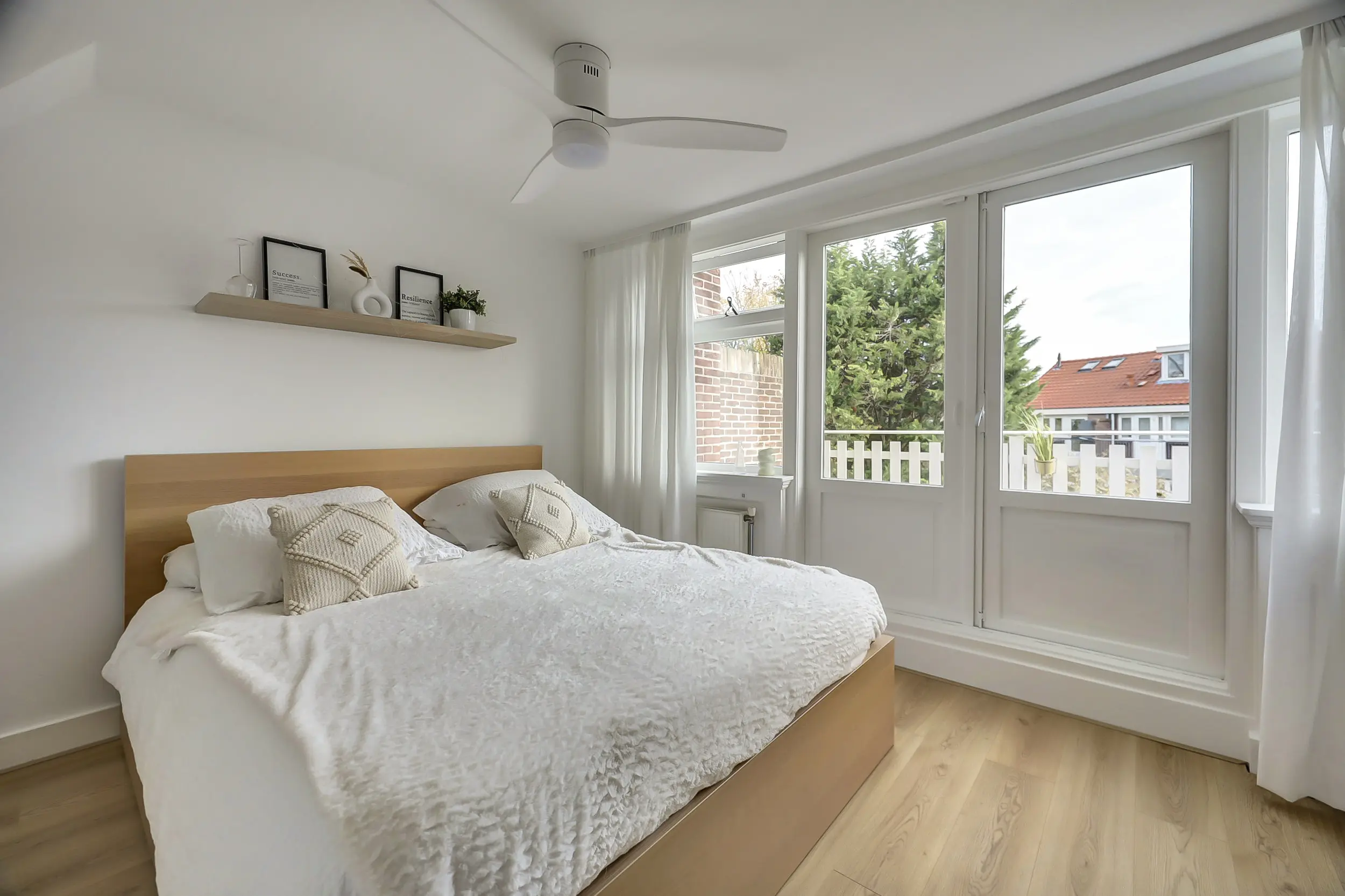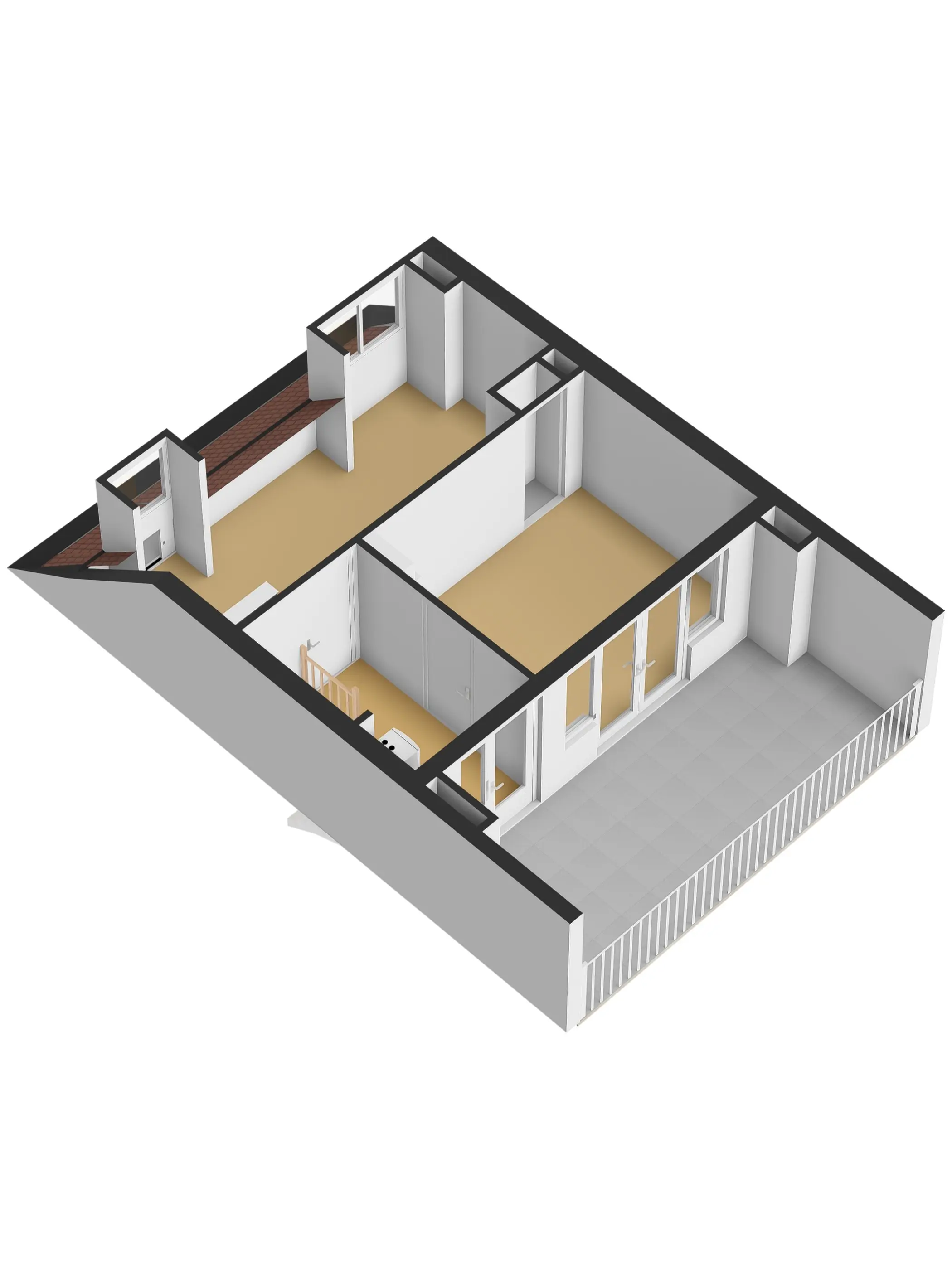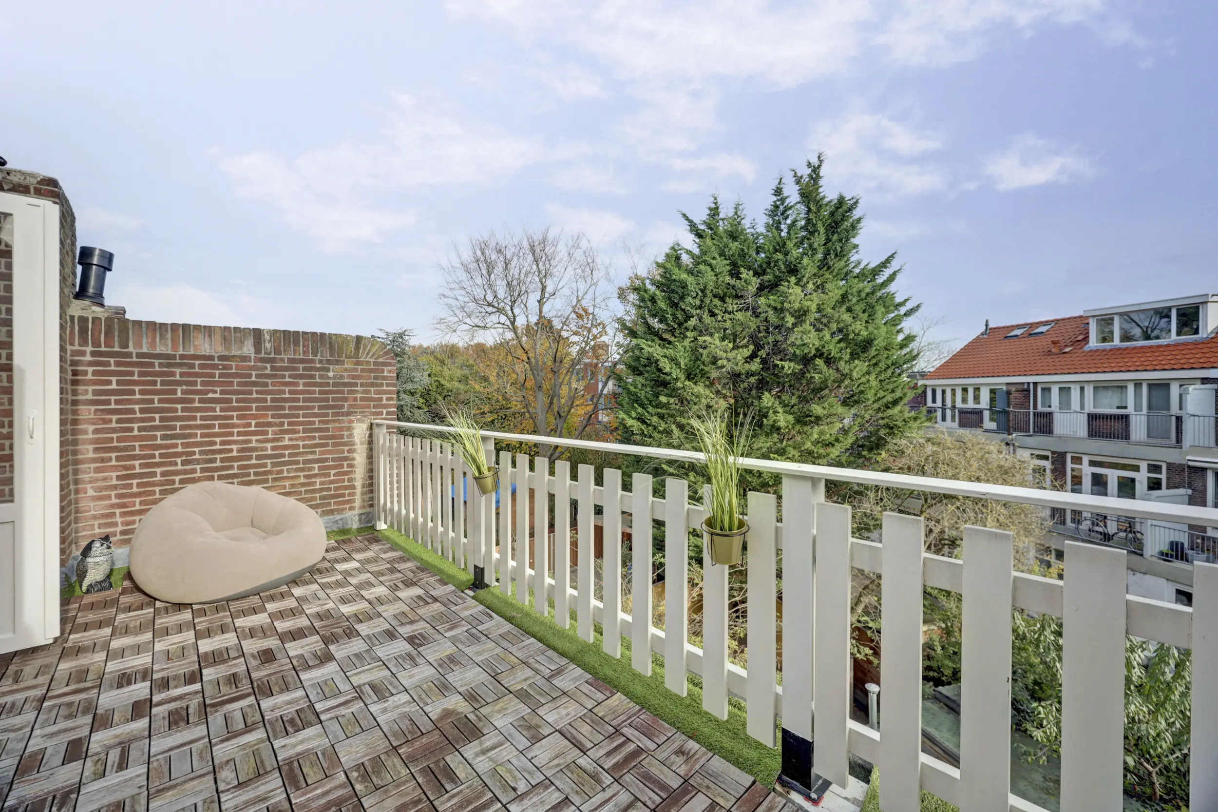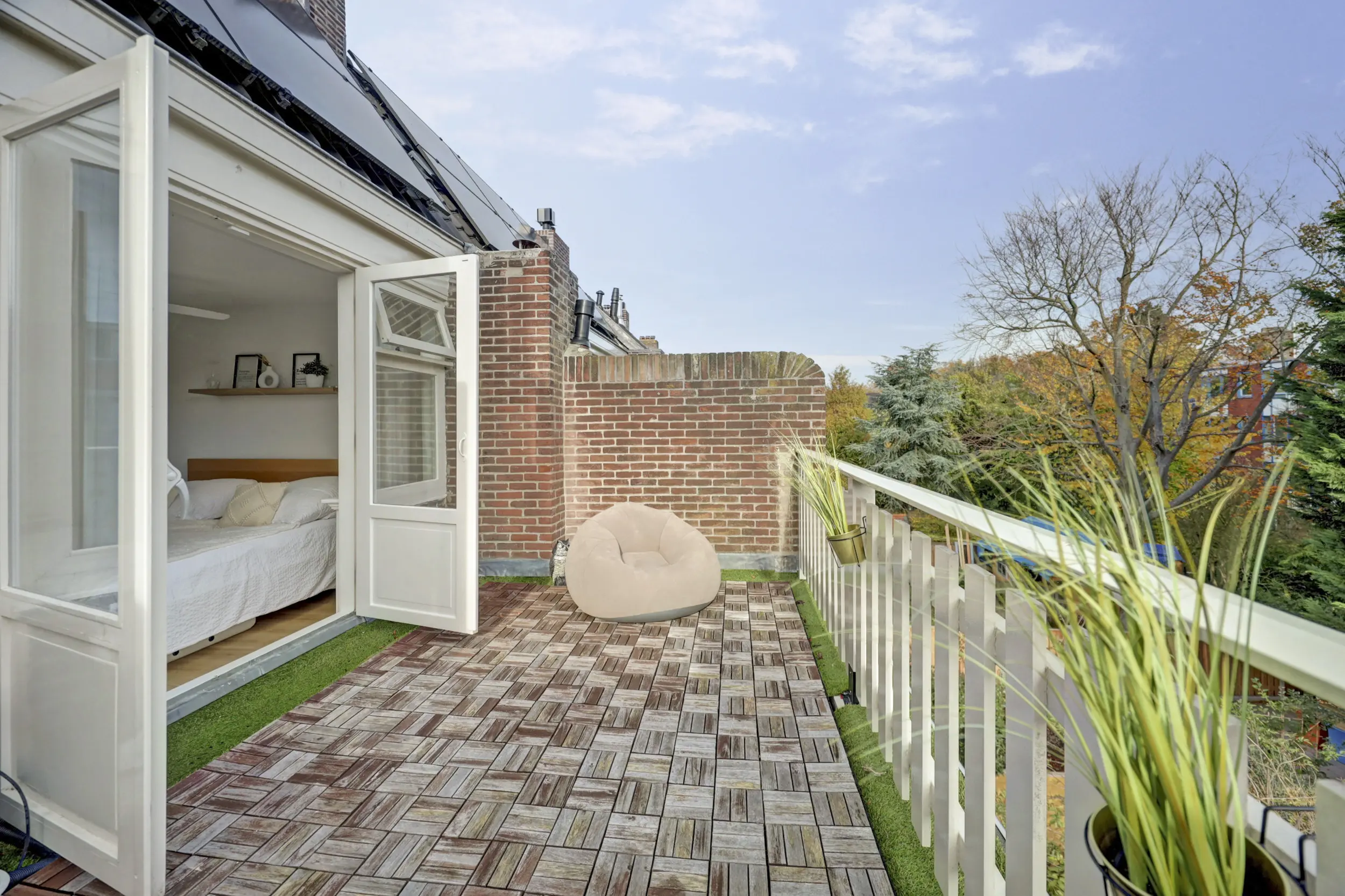 De slaapkamer aan de achterzijde is ca. 12 m² groot. Een perfecte slaapkamer met dubbele openslaande deuren naar het dakterras van 16 m². Wat een heerlijke plek om wat te relaxen of bijvoorbeeld lekker de was te laten drogen. Via deze kamer heb je toegang tot de helft van de zolder waar je bijvoorbeeld de kerstspullen kunt opbergen.