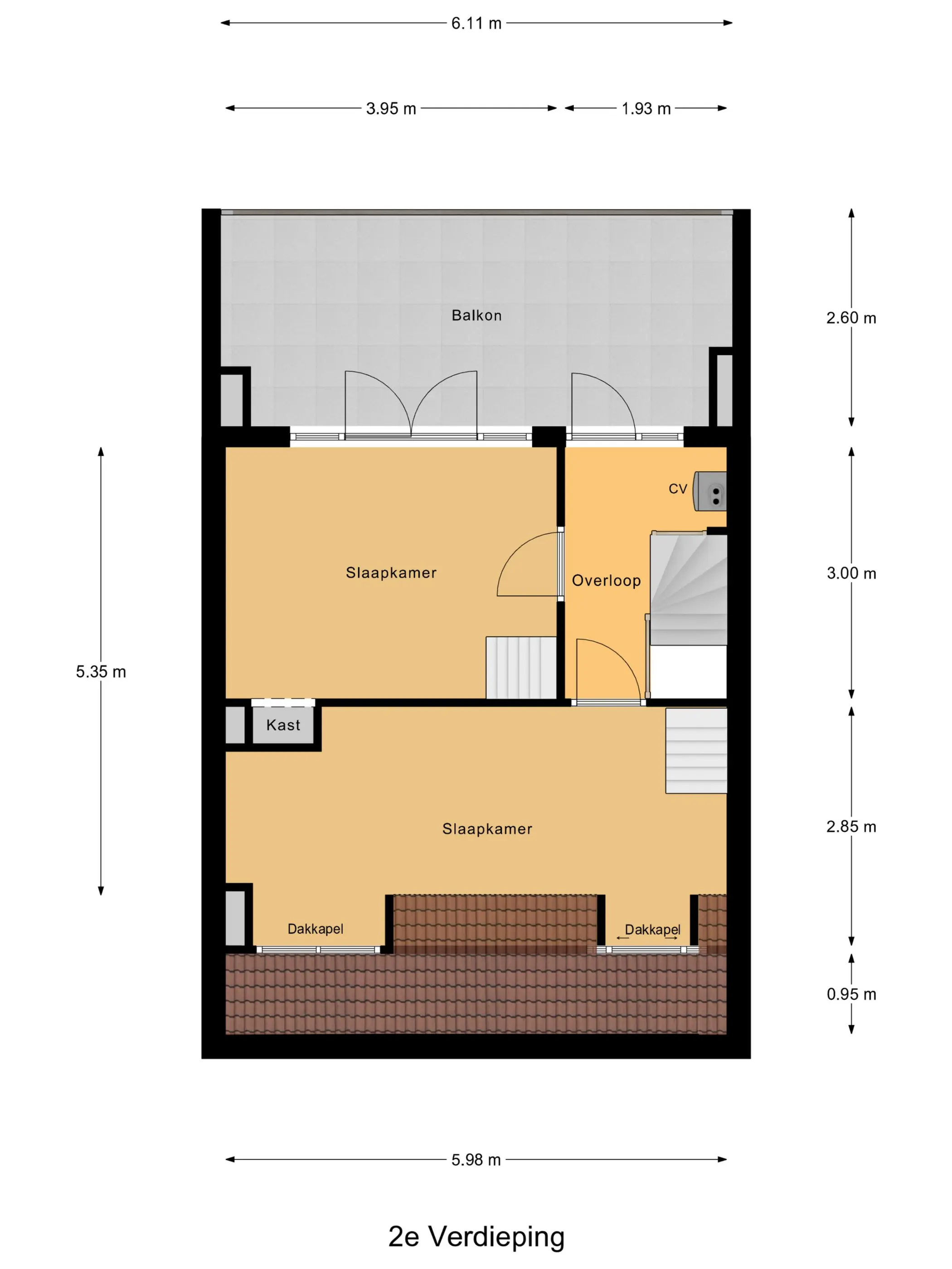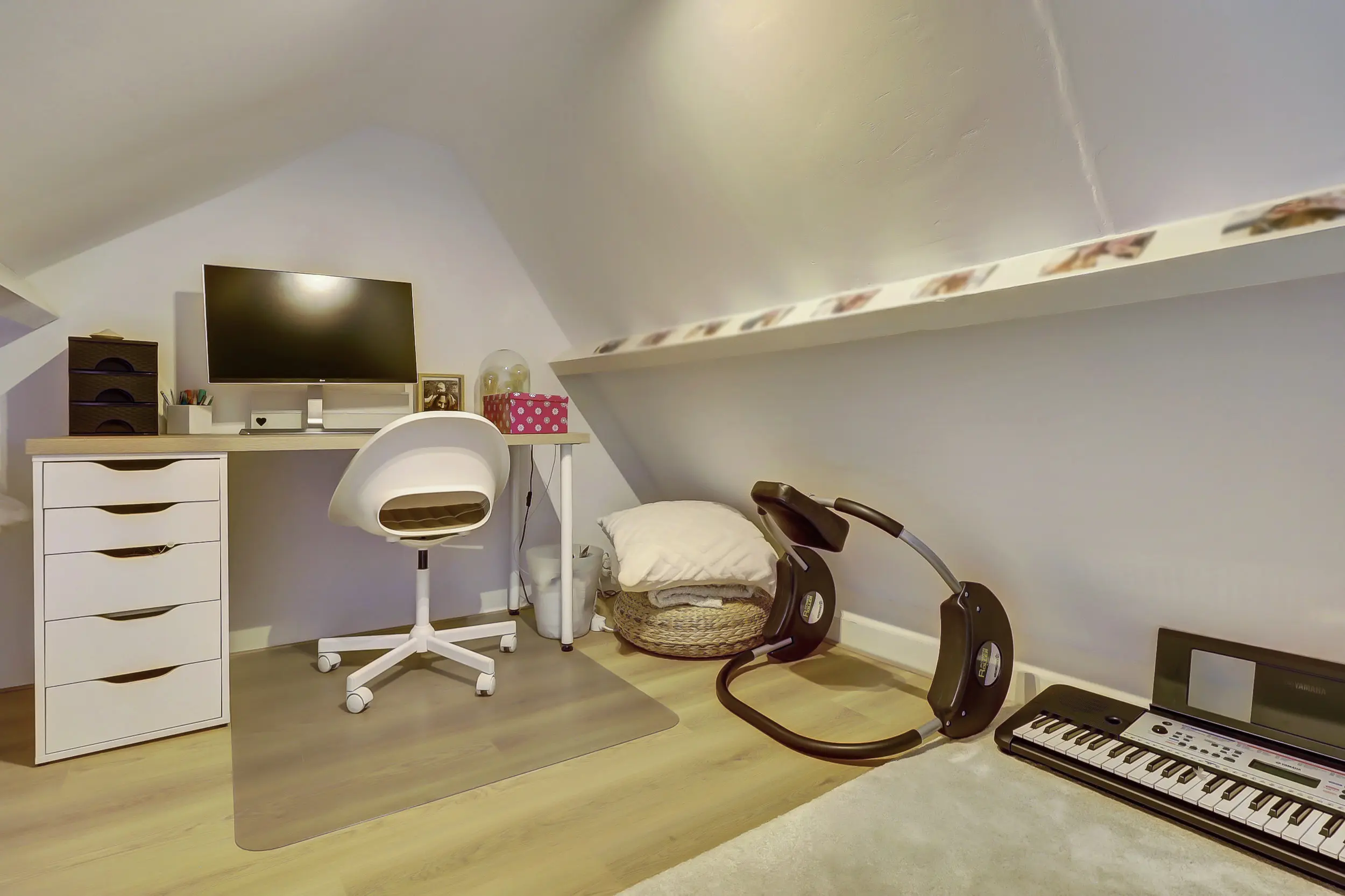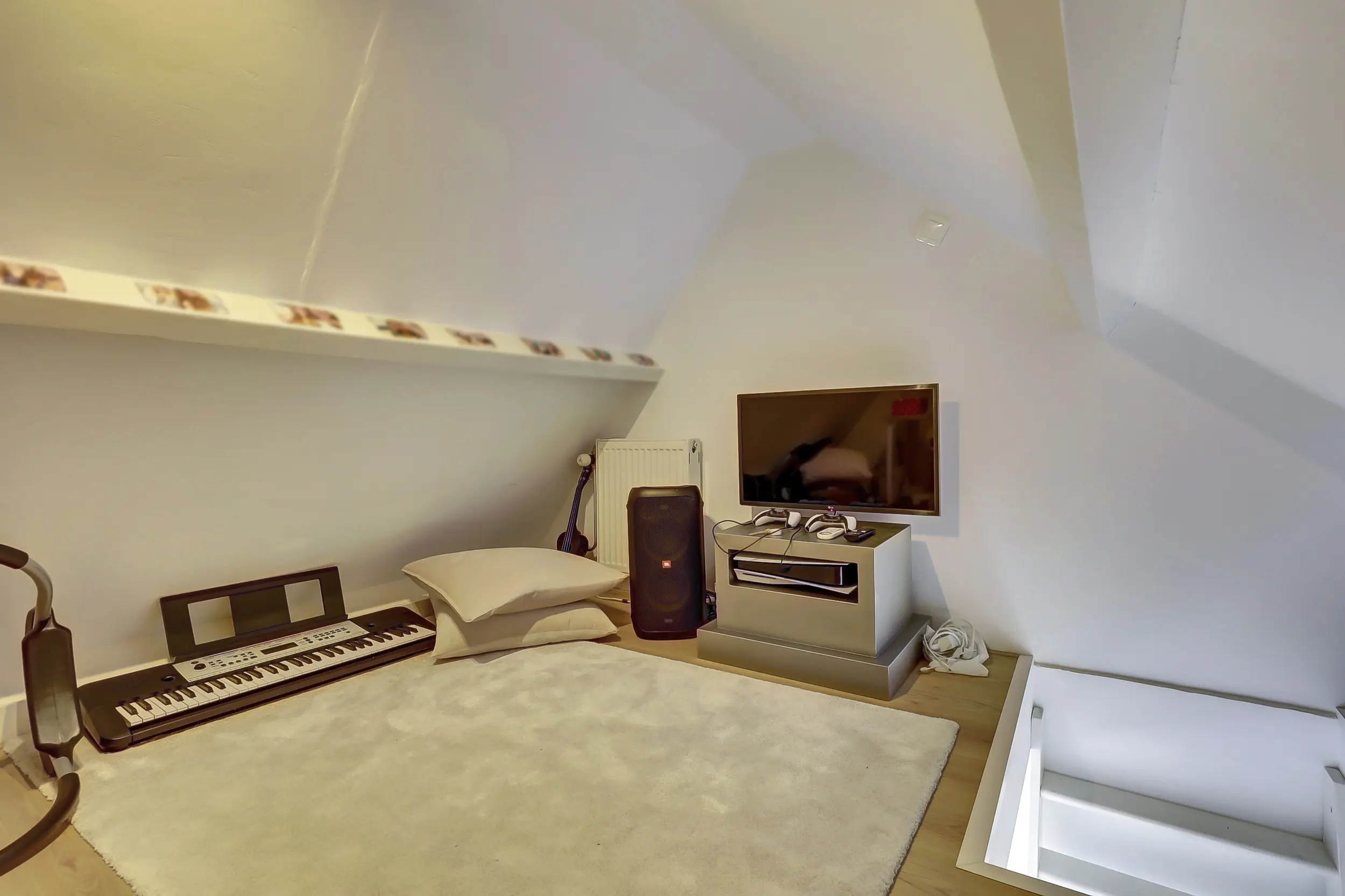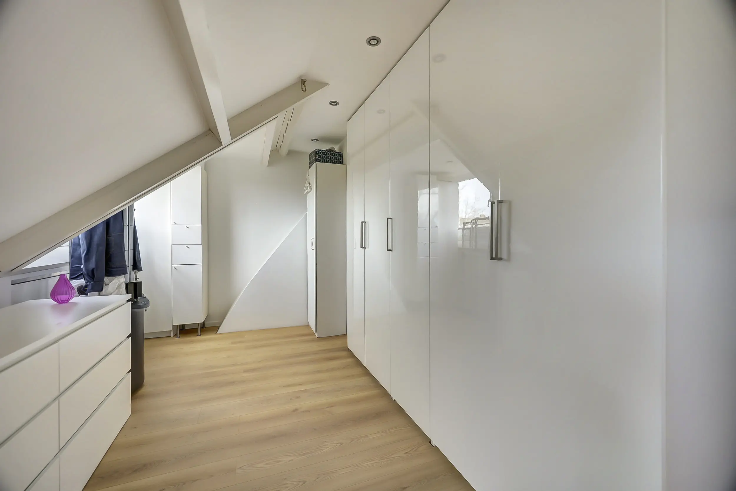 De kamer aan de voorzijde is met ca. 16 m² heerlijk ruim. Genoeg ruimte voor een tweepersoons bed en een grote kledingkast. Maar ook dit zou een perfecte werkkamer of hobbykamer kunnen zijn, heerlijk rustig boven! Met de vaste trap heb je toegang tot de andere helft van de zolder waar ook nog eenvoudig een bureau past.