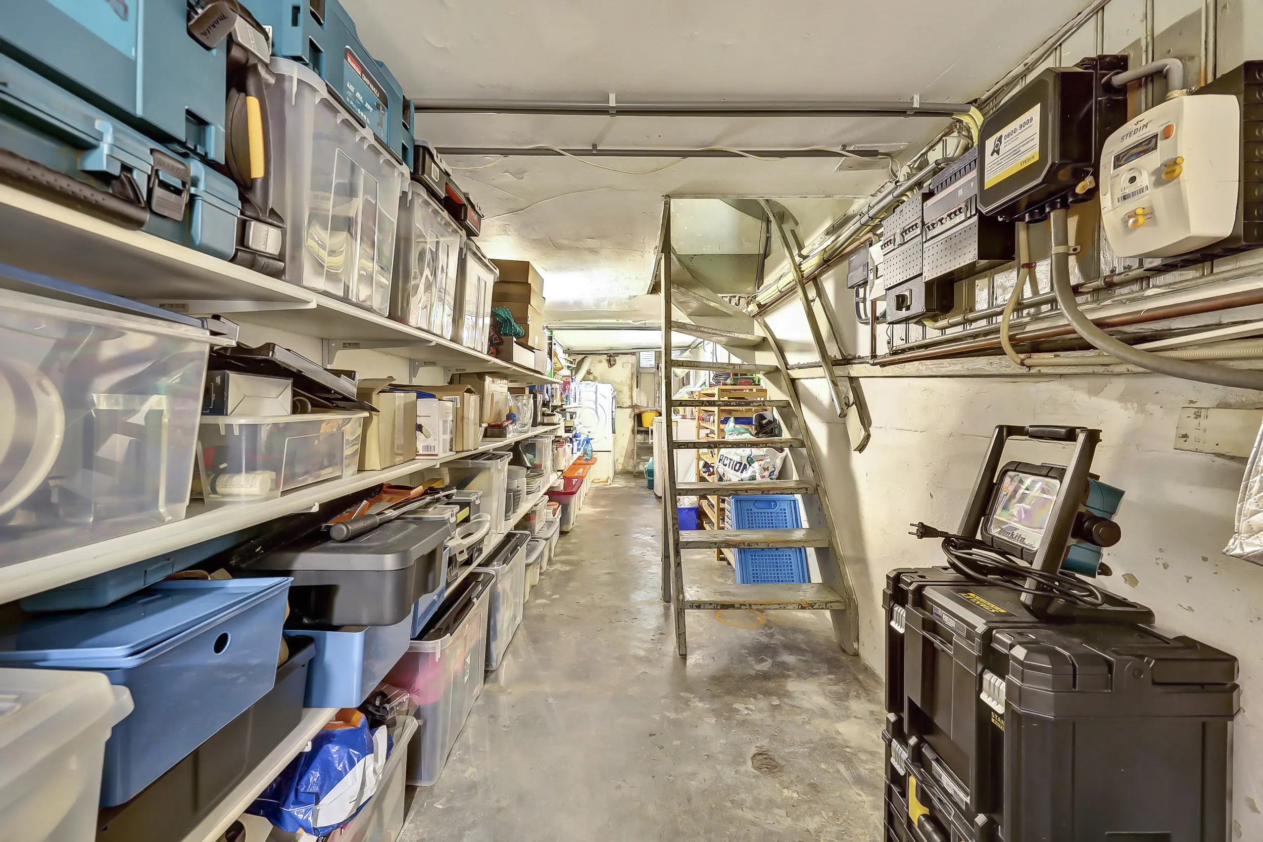 In de kelder zoals eerder gezegd veel bergruimte en de opstelplaats voor de wasmachine en droger. Hier treffen we ook de meters voor GWE en via de kelder heb je ook toegang tot de tuin, dus je kunt je tuingereedschap fijn rechtstreeks kwijt in de kelder.