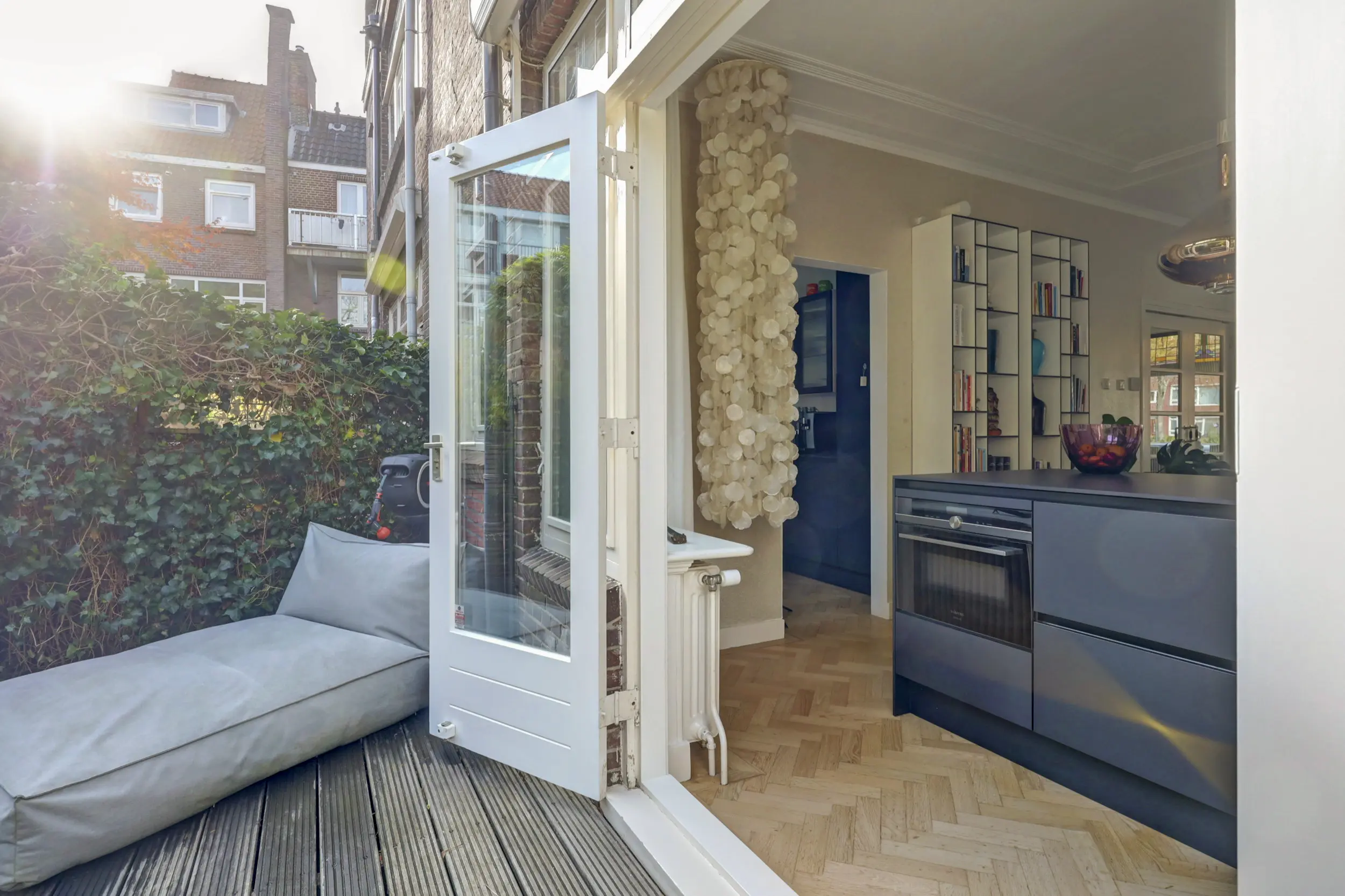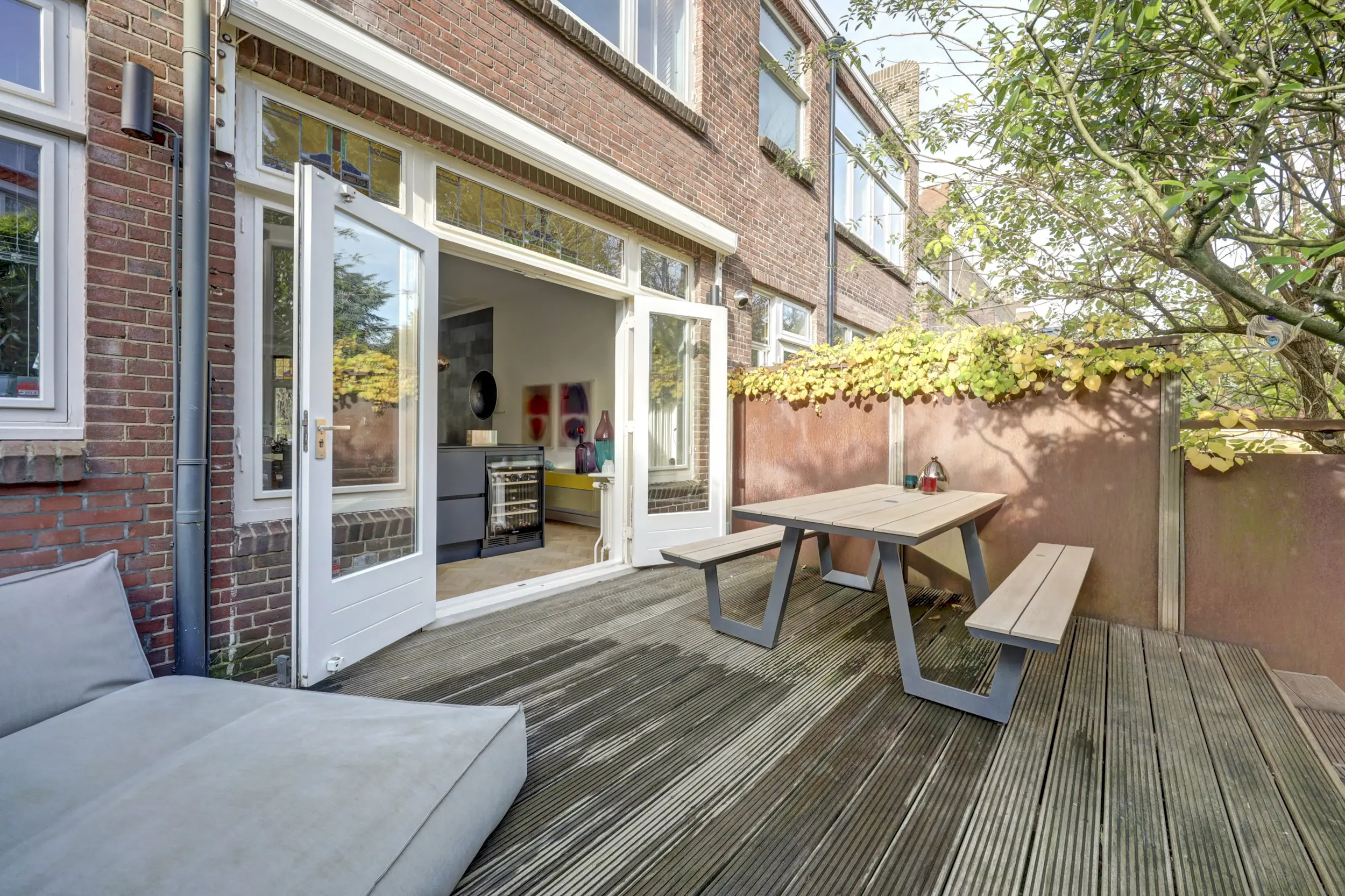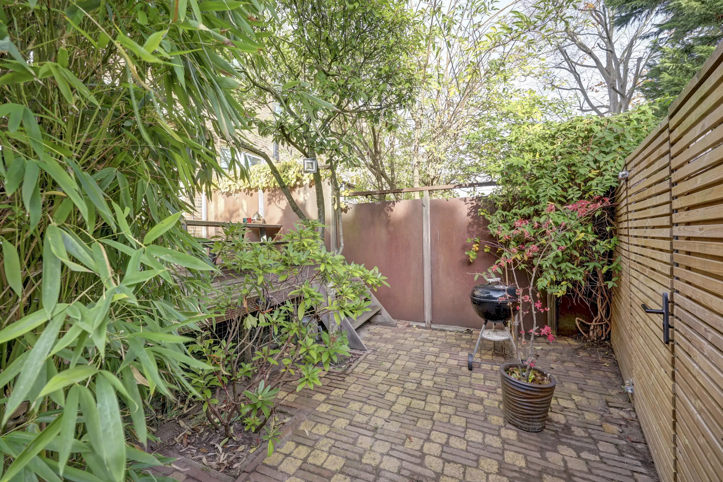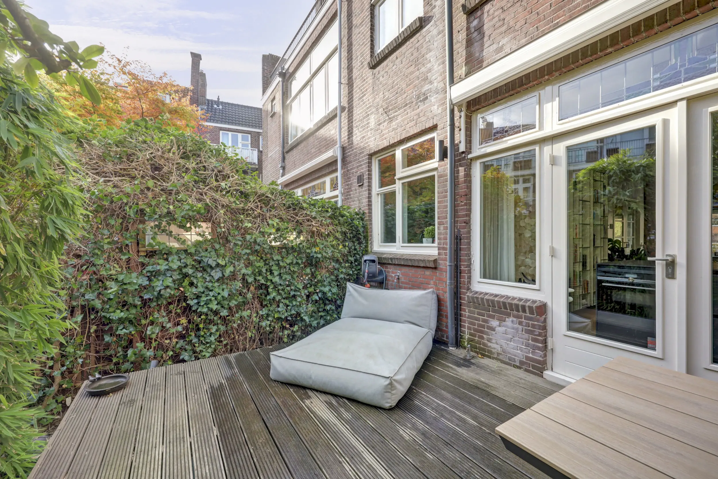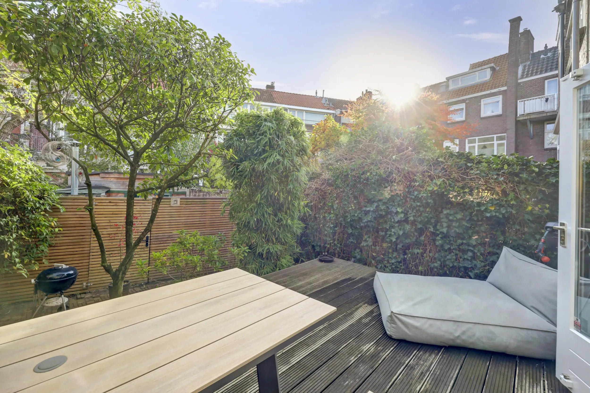 Via de openslaande deuren lopen we de tuin in. De tuin is verdeeld in 2 delen, het eerste deel in het verlengde van de woonkamer is een heerlijke plek om lekker wat te werken, gezellig te borrelen, uitgebreid te eten of lekker even de krant te lezen. Een mooie plek voor een grote tuintafel en een relaxstoel. Voor het tweede deel loop je een paar treden naar beneden. Een heerlijk stukje groen, betegeld en ruimte voor zowel de BBQ als eventueel je fiets. Via het afgesloten achterpad kom je namelijk eenvoudig achter in de tuin! Een heerlijke groene stadstuin!