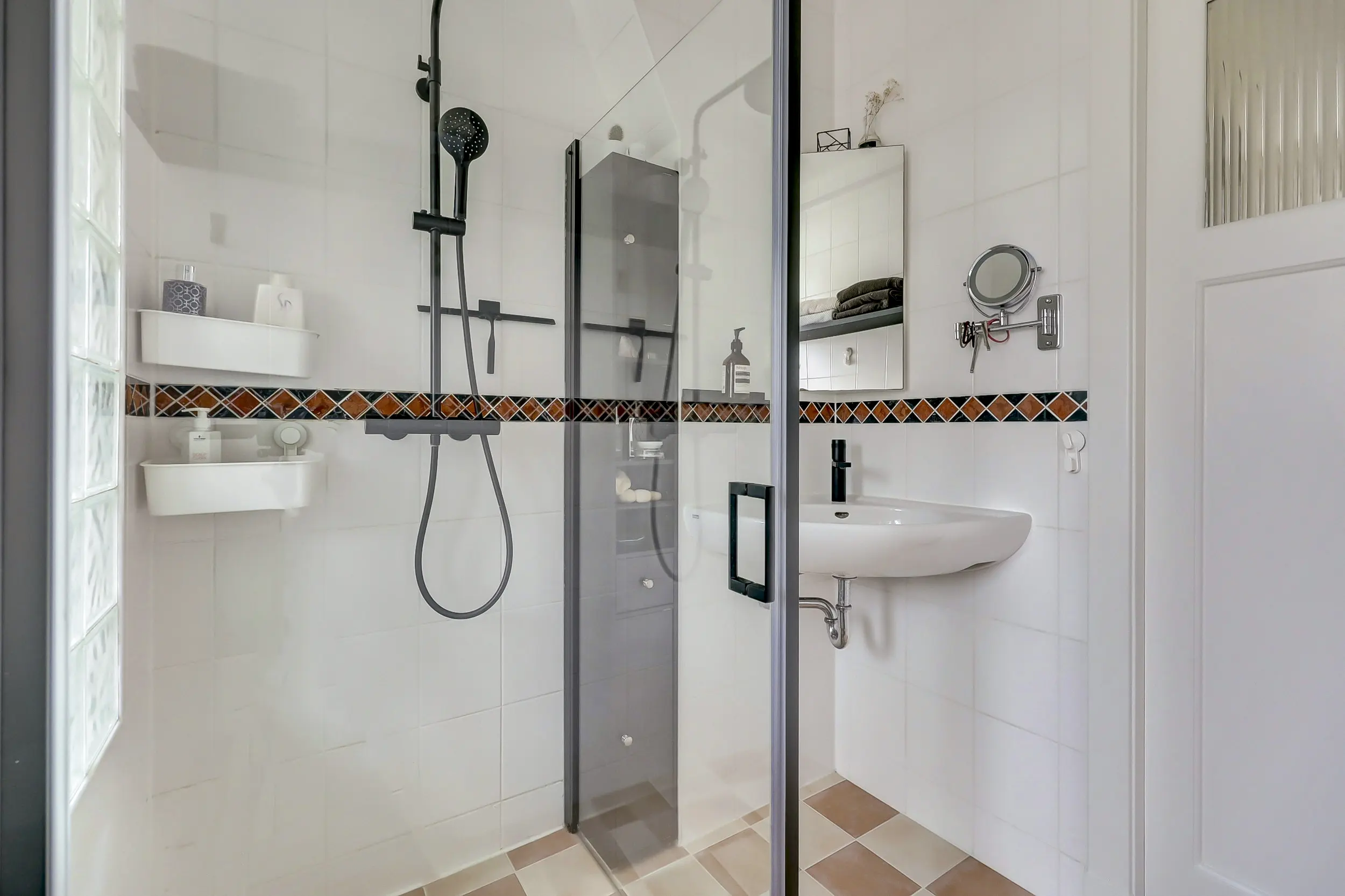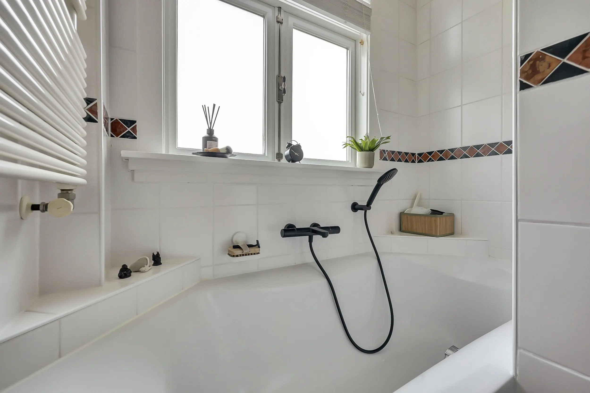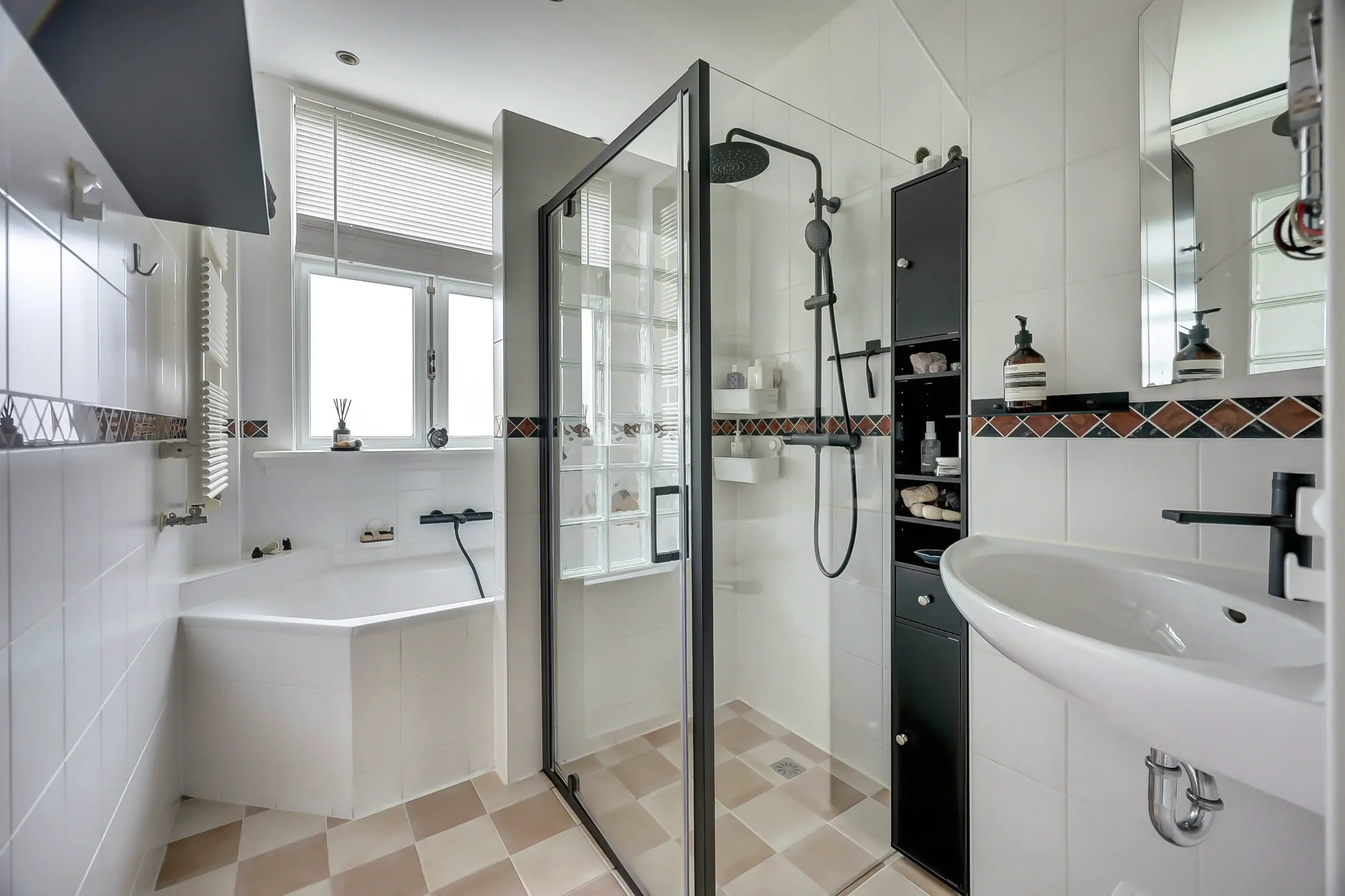 Aan de achterzijde treffen we de badkamer die wel heel goed ingedeeld is. De badkamer beschikt over een ruime douchecabine, een ligbad en een wastafel met spiegel erboven. Daarnaast is er ruimte voor een kast voor je badkamerspulletjes en een radiator om de handdoeken aan te drogen. Op de overloop heb je toegang tot het tweede toilet.