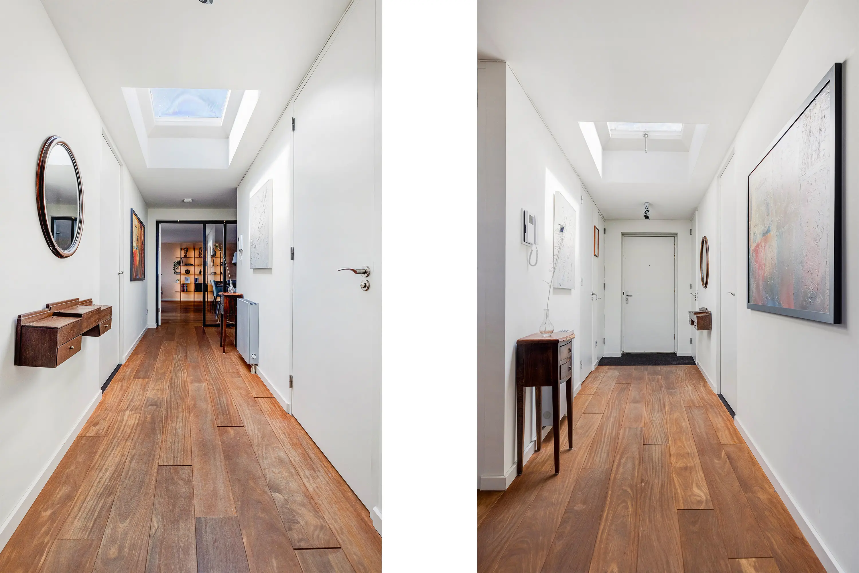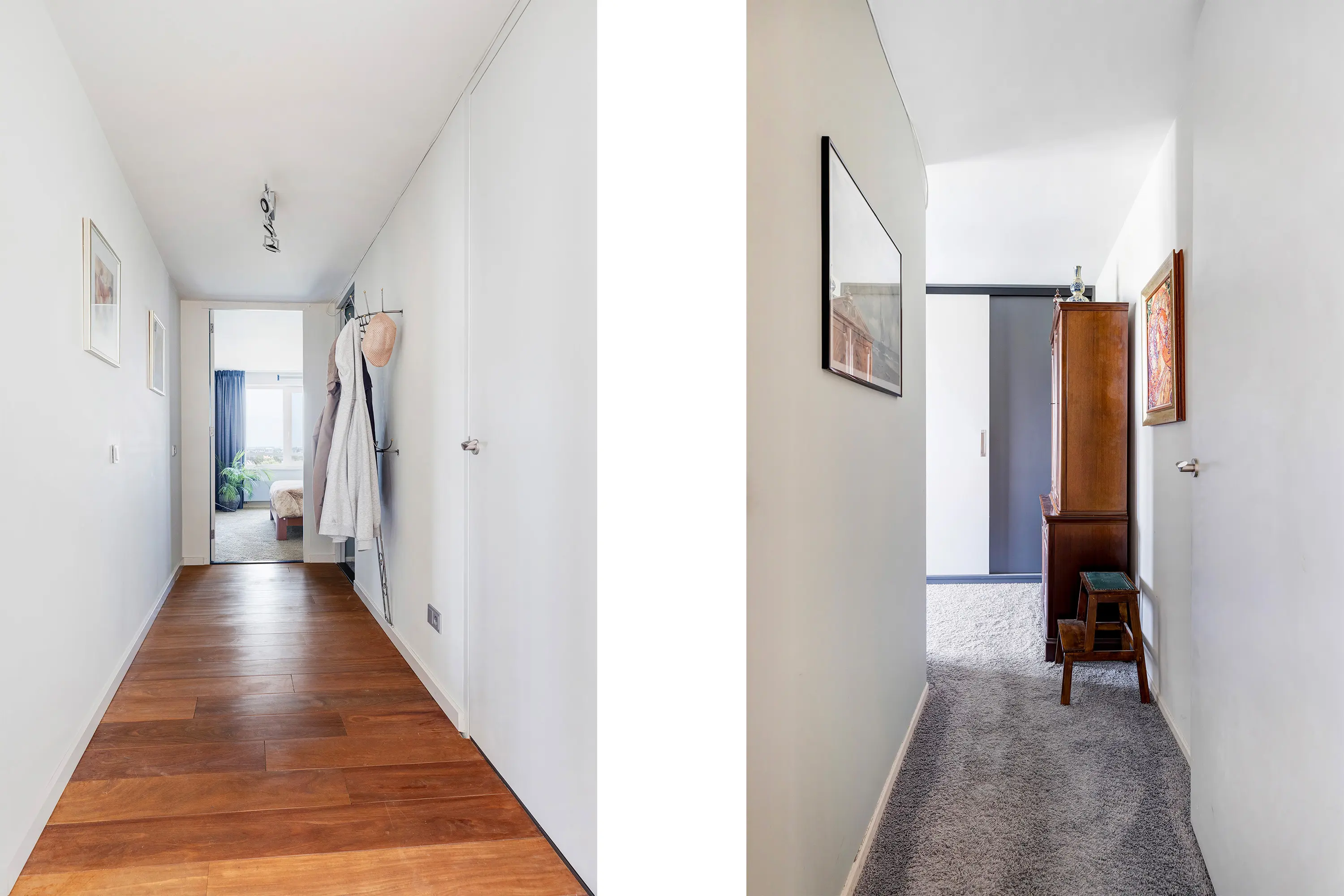 Via de lift of trap komt u op de vijfde verdieping, waar u wordt verwelkomd door een ruime en lichte hal met toegang tot de woningen op deze verdieping. Entree in de hal van het appartement met een prachtige dakkoepel, die veel natuurlijk licht binnenlaat. Hier bevinden zich de meterkast, een zeer ruim toilet met hangend closet en wastafelmeubel, en toegang tot de slaapkamers, badkamer en living.