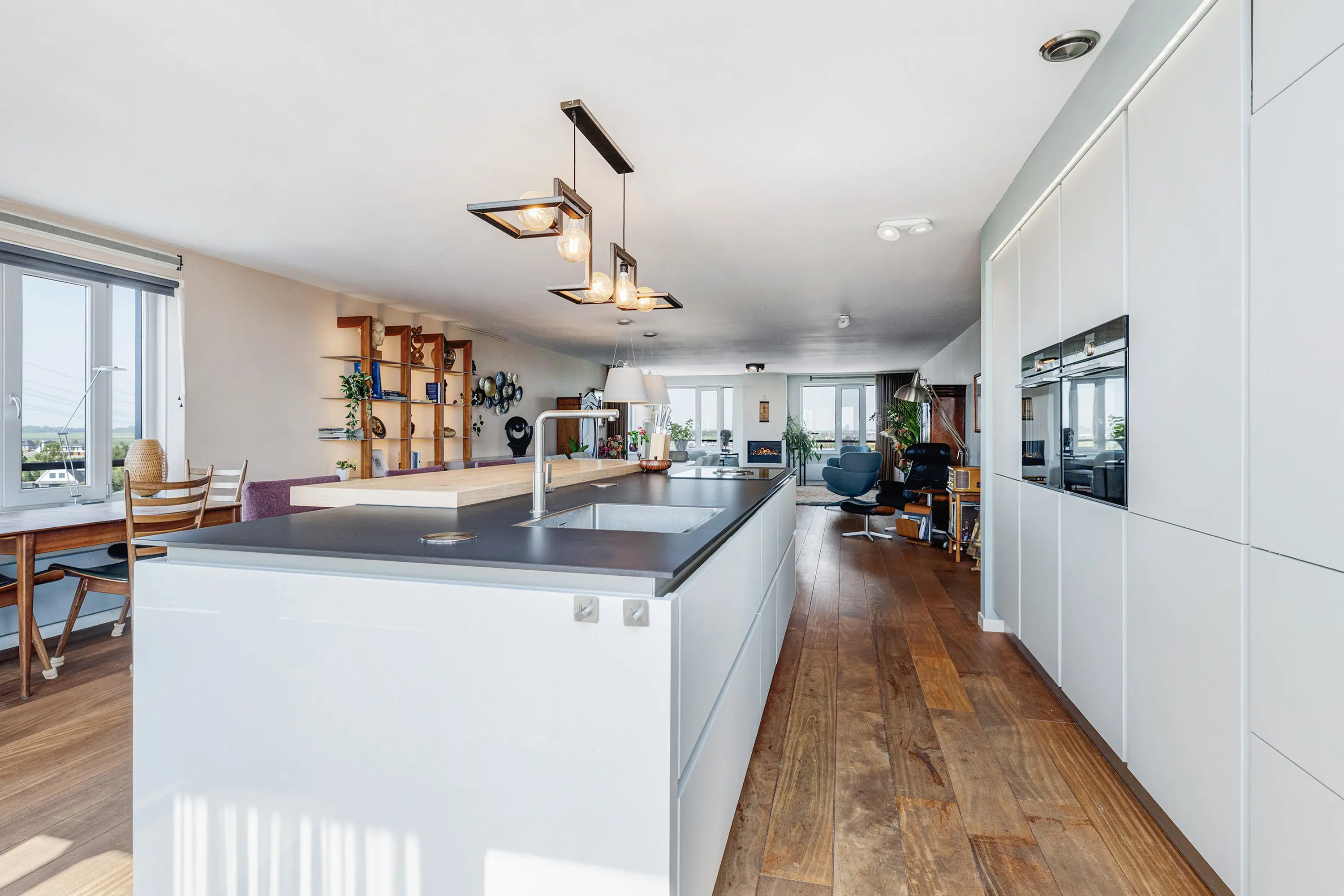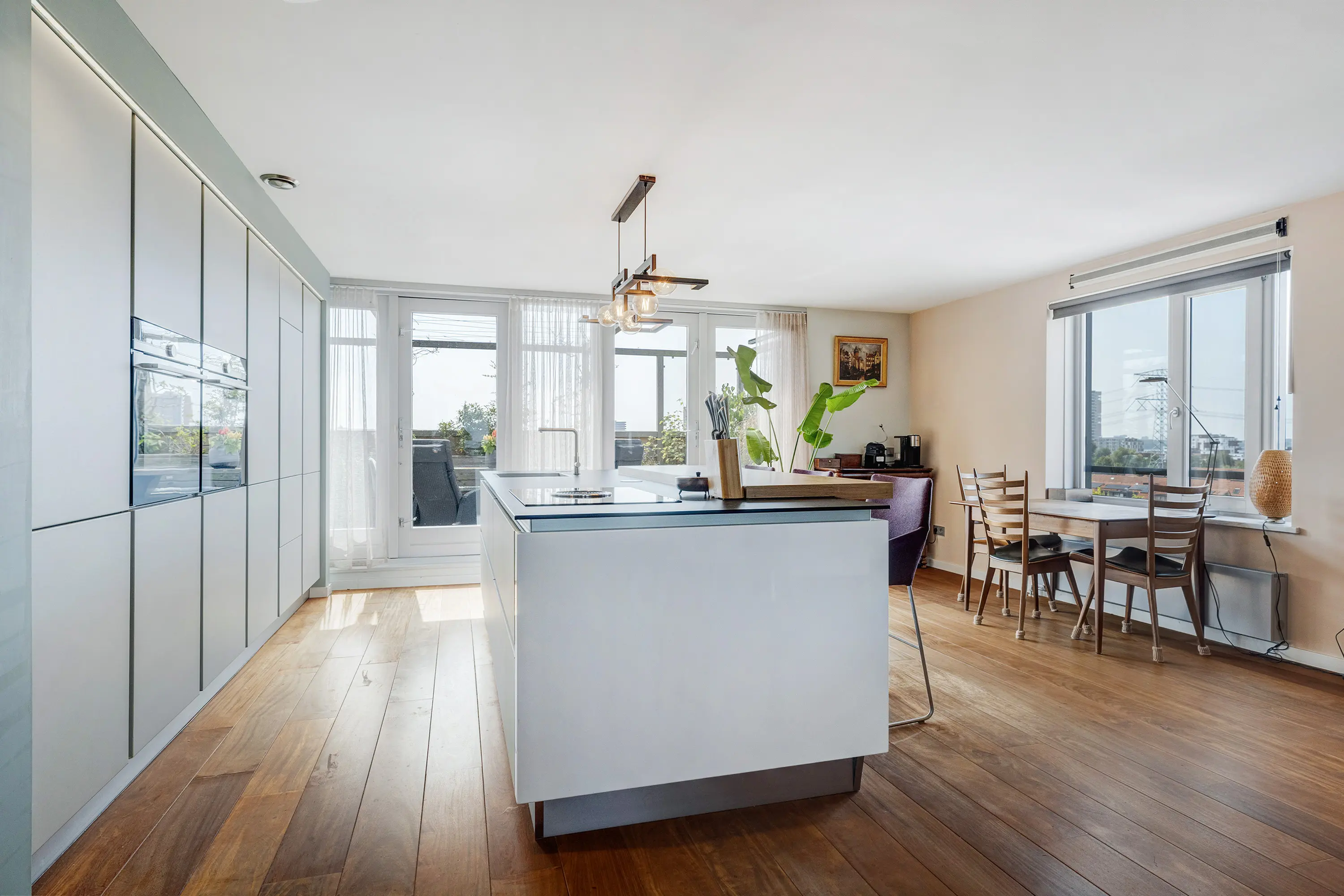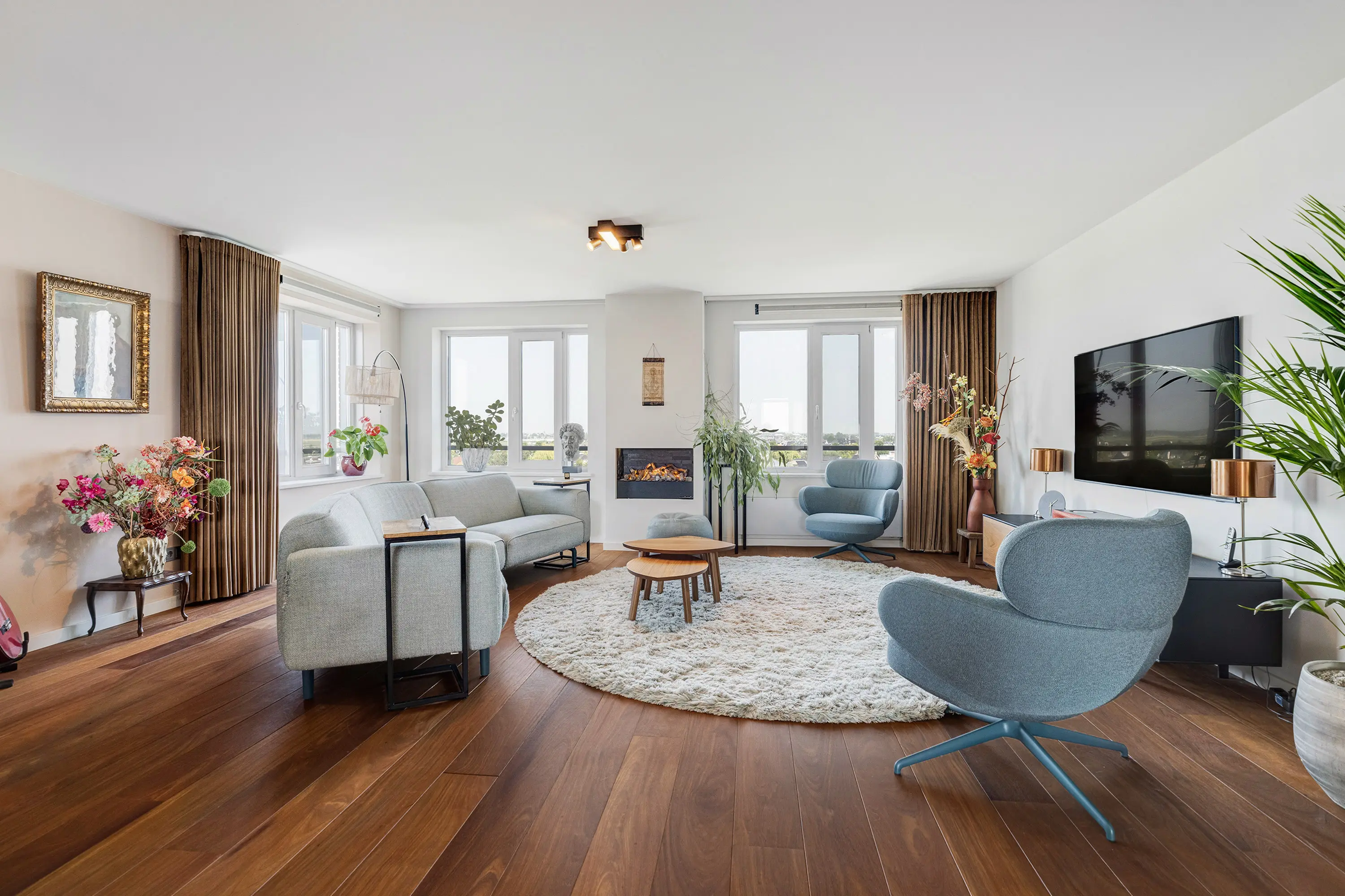De grote living van ruim 82 m² (inclusief keuken) is het middelpunt van het appartement. Dankzij de vele ramen geniet u hier het hele jaar door van prachtig vrij uitzicht over het groene Nesselande. De woonkamer is voorzien van een houten vloer en een elektrische waterhaard, die zorgen voor een gezellige sfeer.
