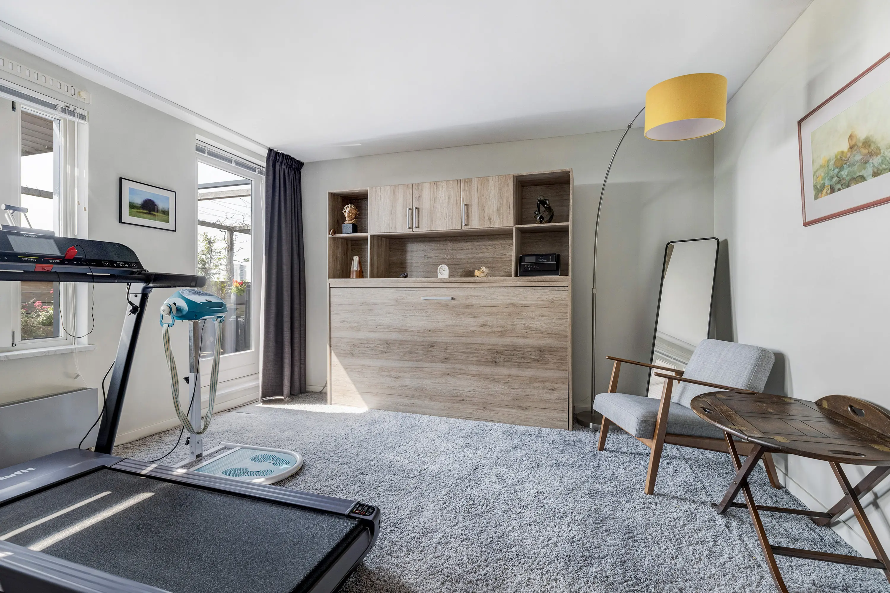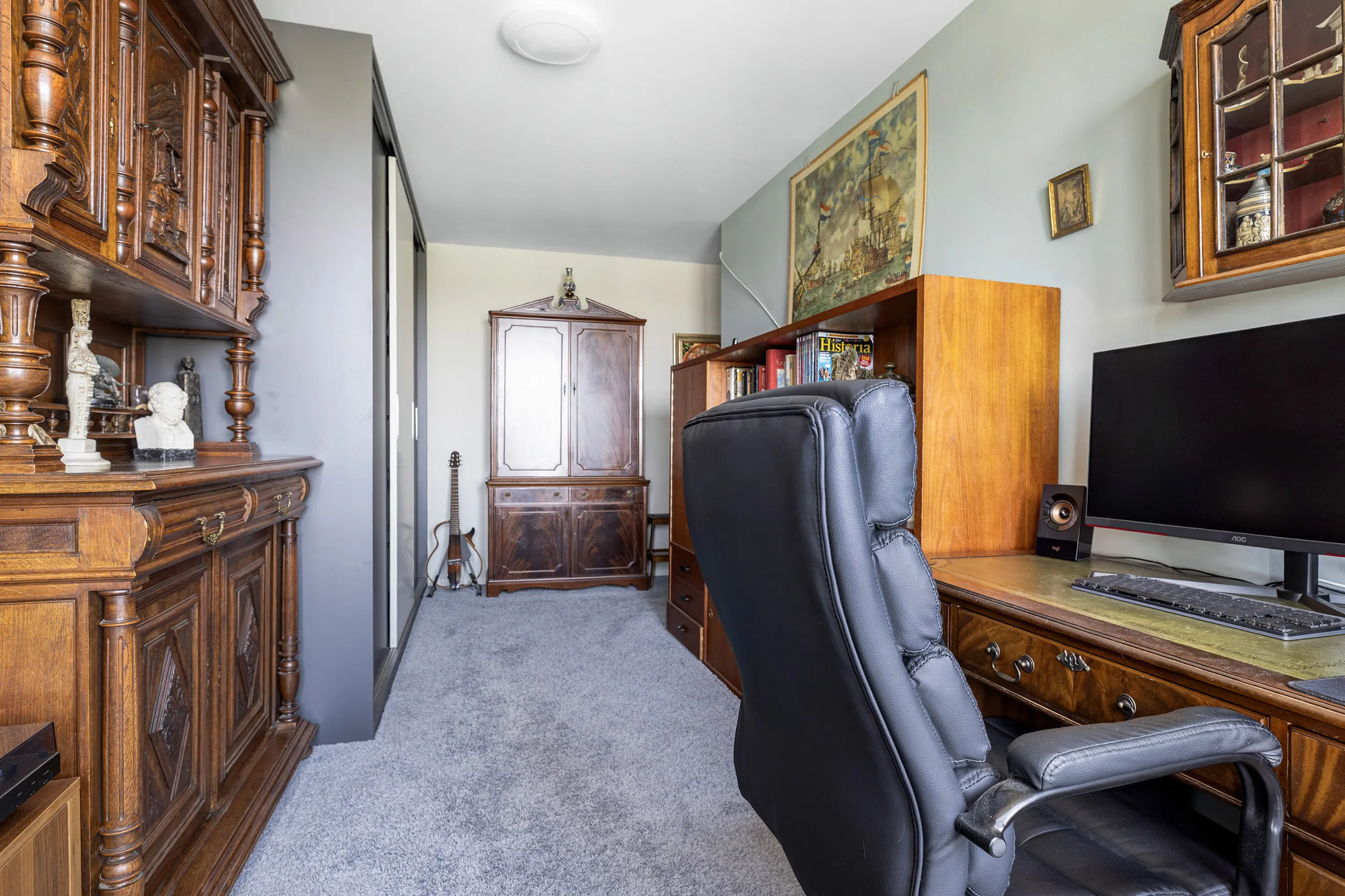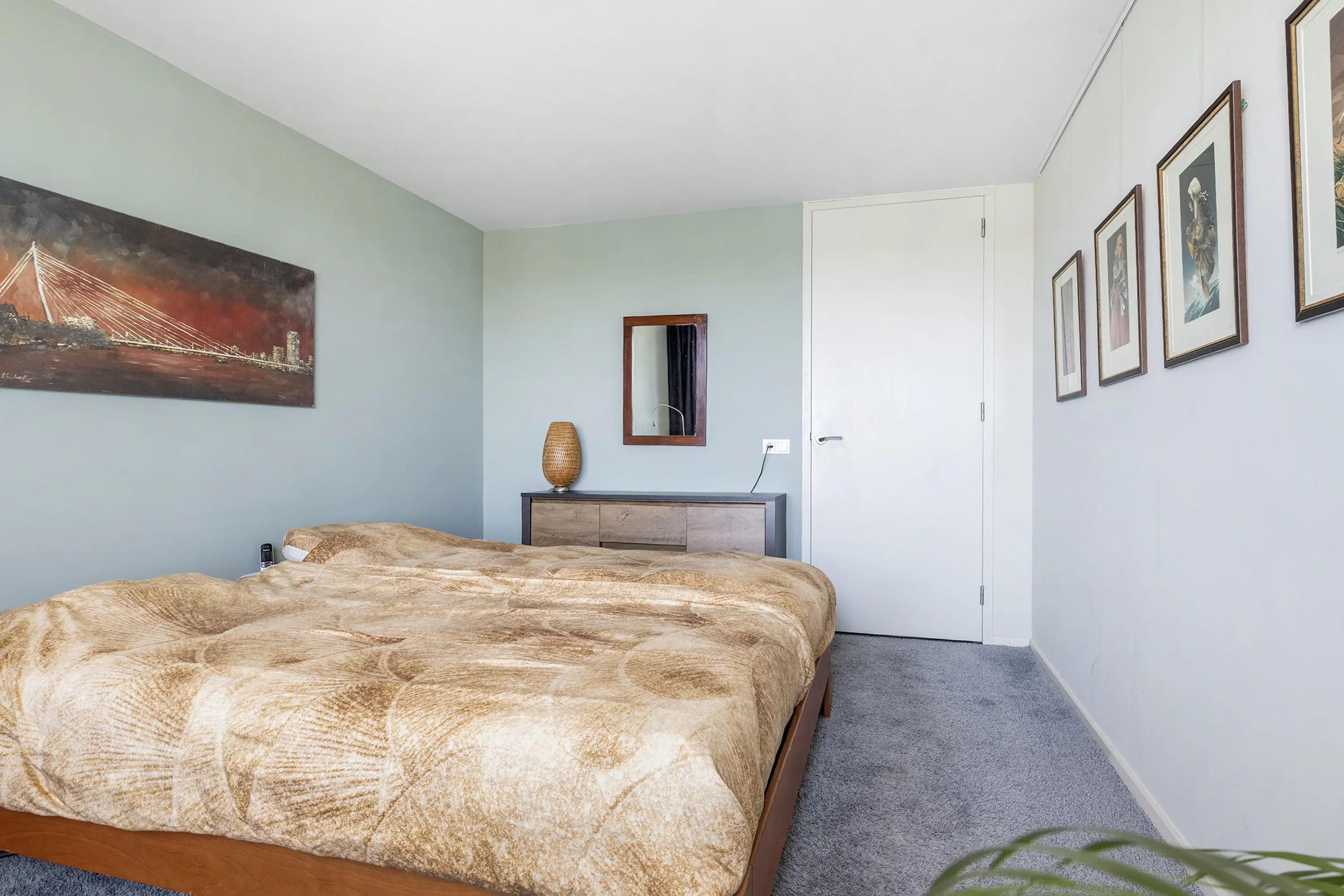 De hoofdslaapkamer van circa 18 m² heeft toegang tot het terras en beschikt over een vaste inbouwkast. De andere twee slaapkamers, gelegen aan de voorzijde, zijn eveneens ruim en voorzien van vloerbedekking, ideaal voor gasten, kinderen of een thuiskantoor.