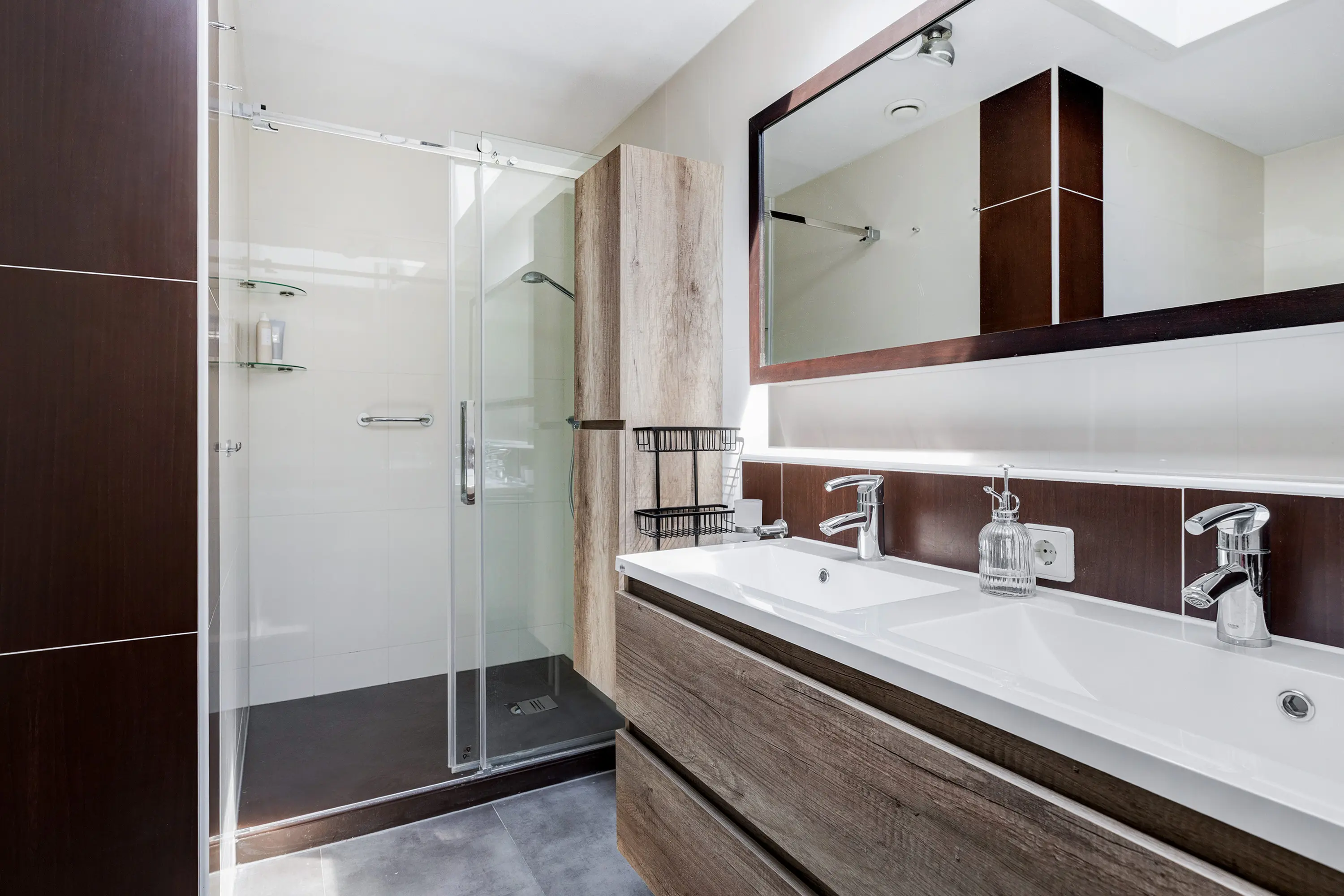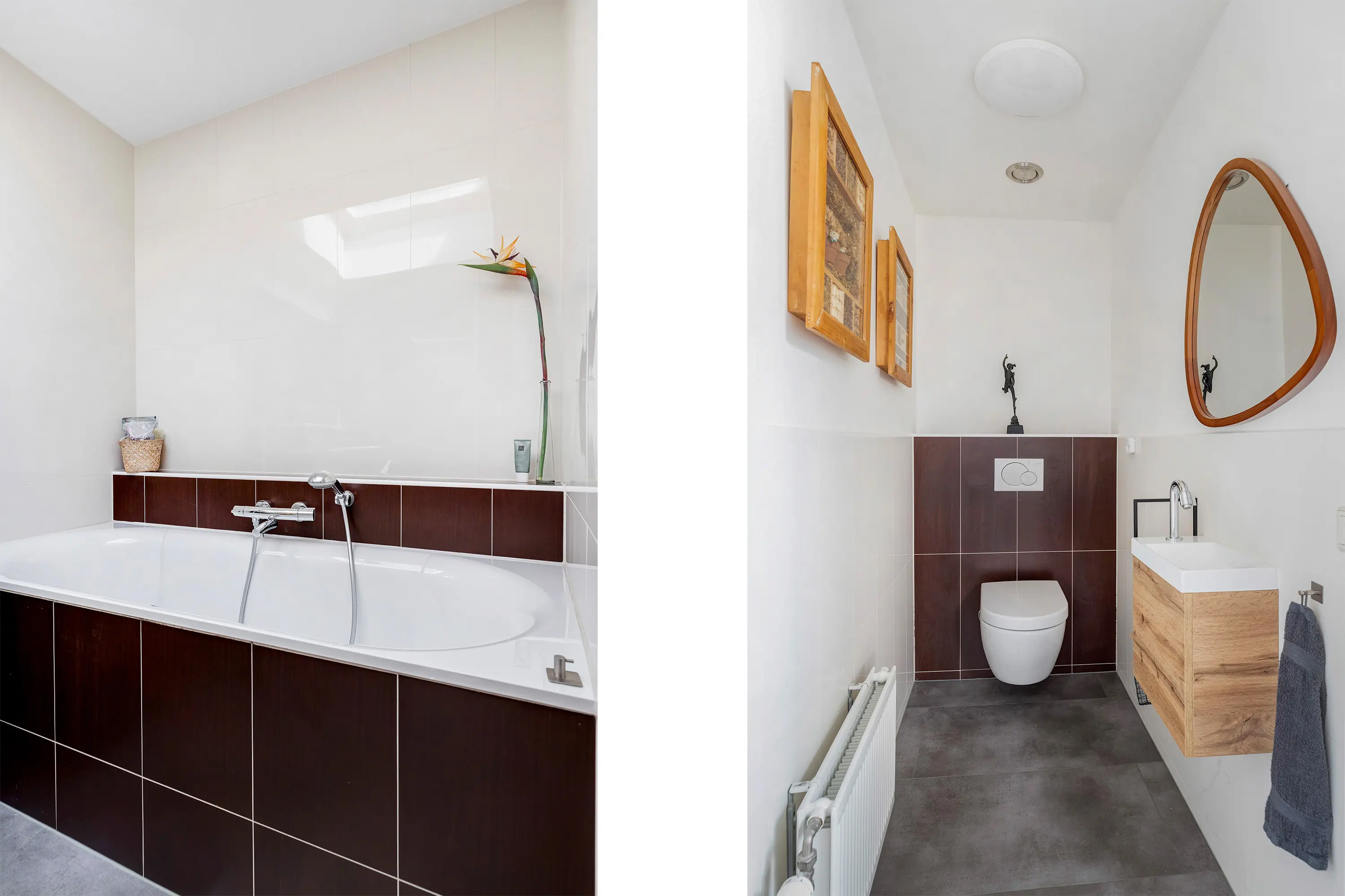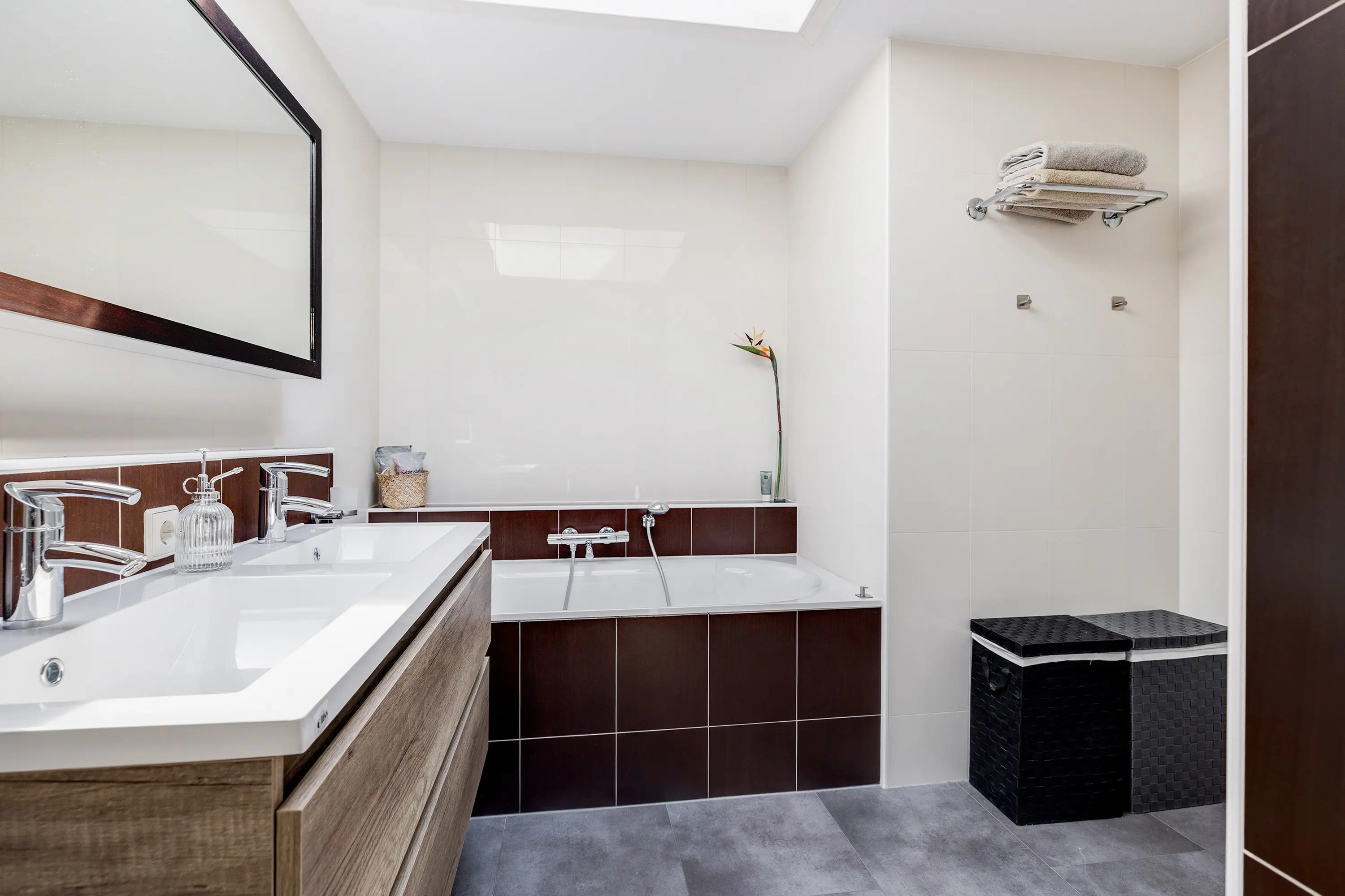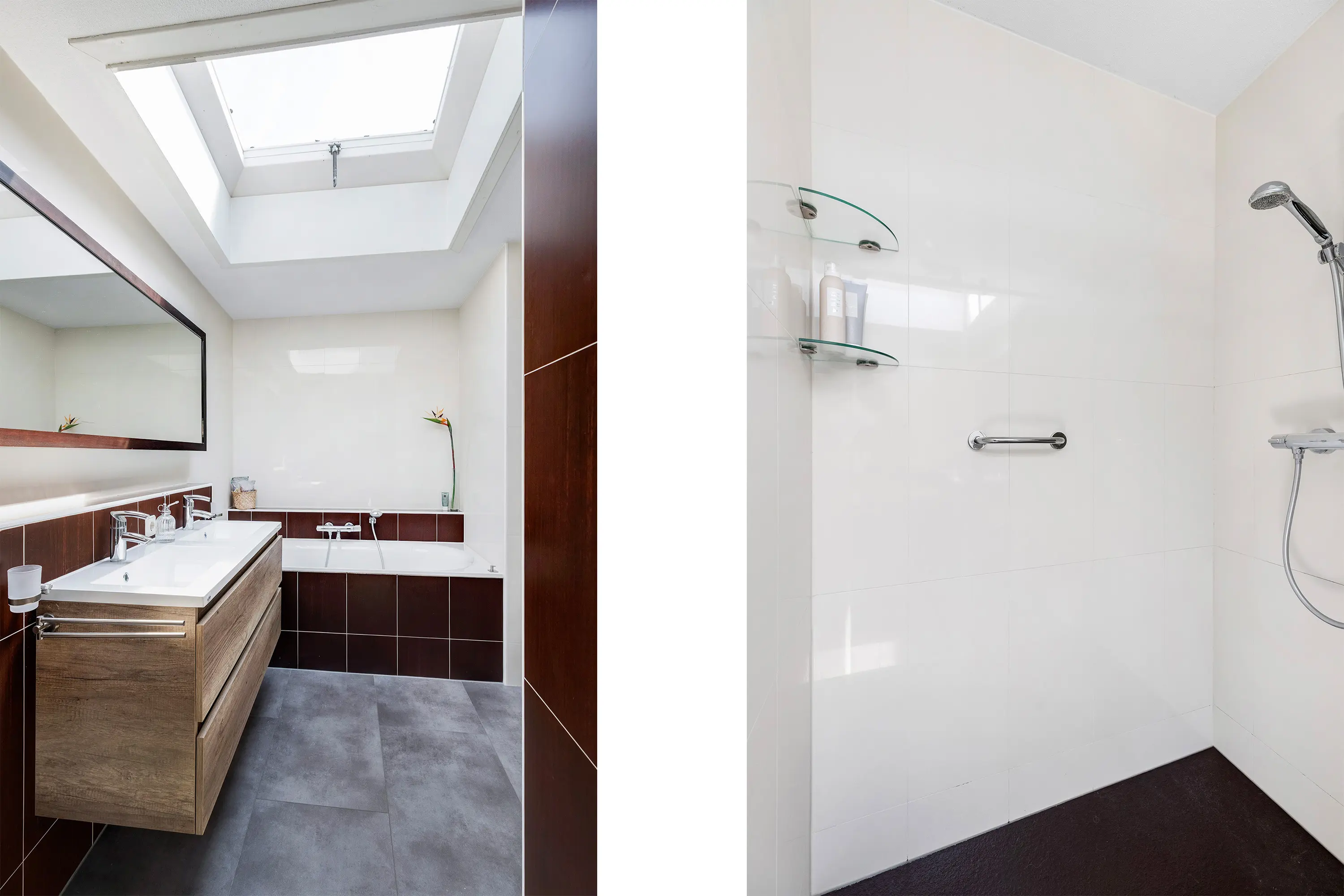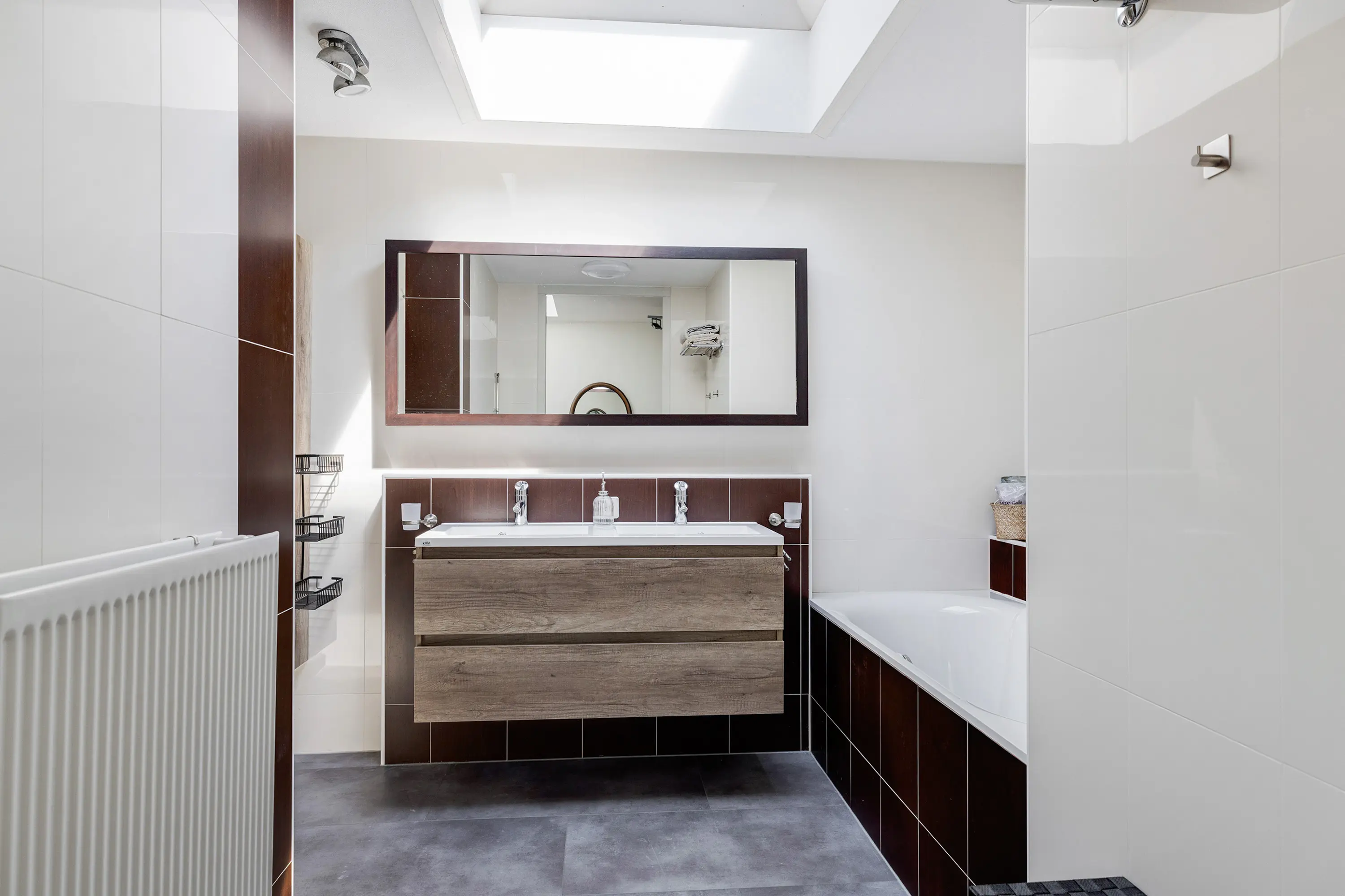 De lichte badkamer (ca. 8 m²) beschikt over een ligbad, inloopdouche en dubbel wastafelmeubel met grote spiegel en verlichting. De grote dakkoepel zorgt voor extra lichtinval. Alle voorzieningen maken deze badkamer tot een luxe ruimte voor ontspanning en rust.