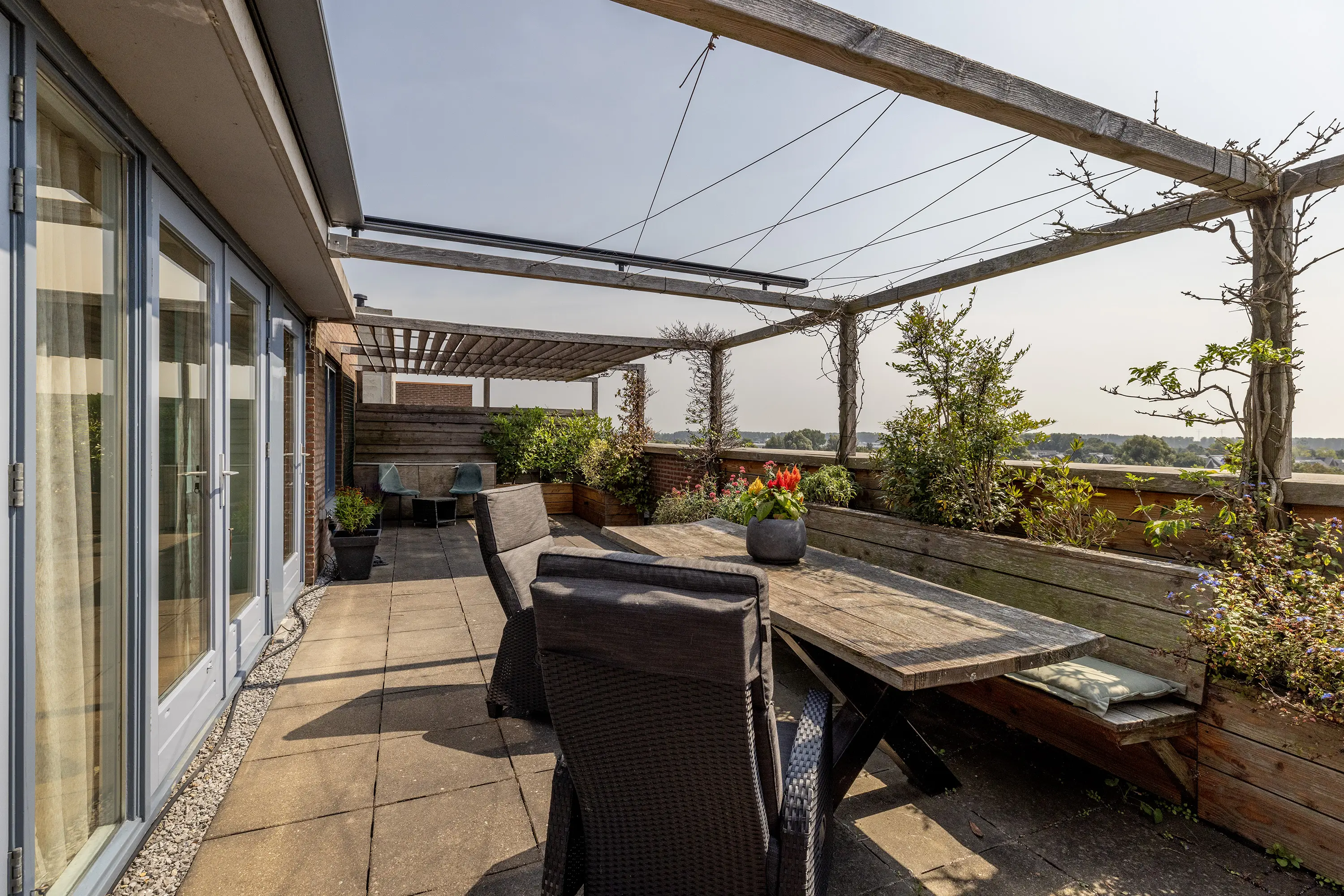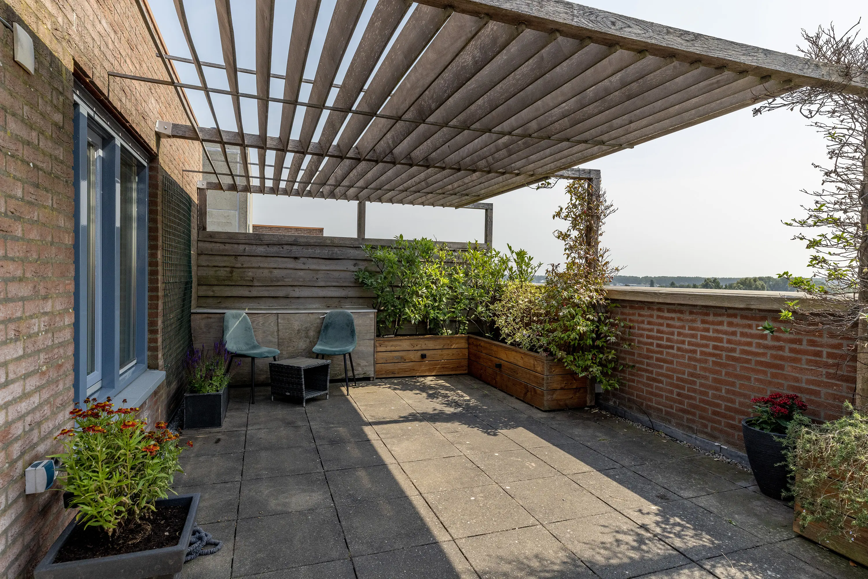 Via twee openslaande deuren stapt u op het schitterende terras van circa 47 m² gelegen op het zuiden. Hier kunt u in alle privacy genieten van zon, groen en rust. Het terras is uitgerust met vaste plantenbakken, een elektrische zonwering (5 m breed), pergola, irrigatiesysteem en sfeervolle verlichting, perfect voor lange zomerse avonden of gezellige BBQ's.