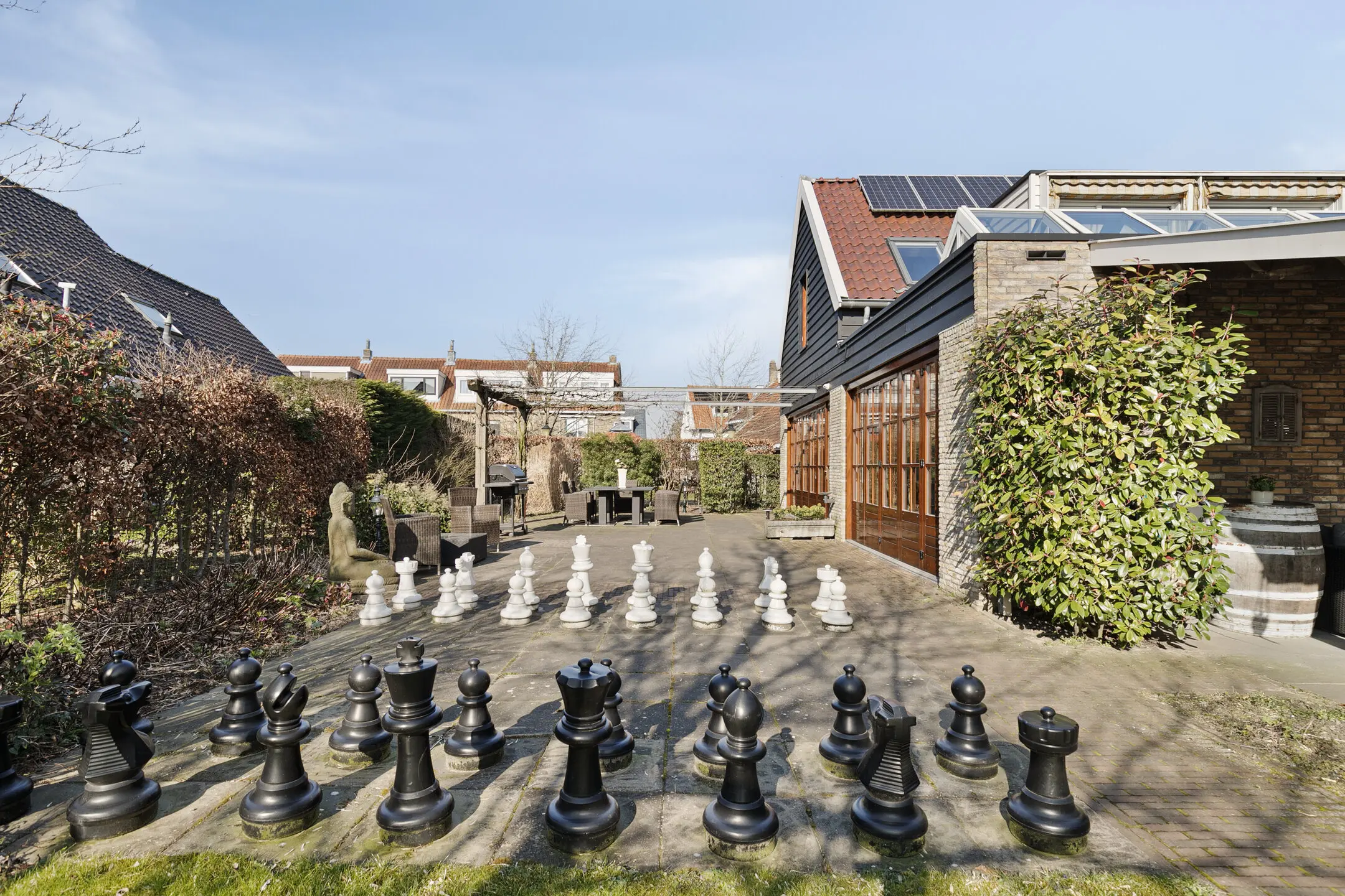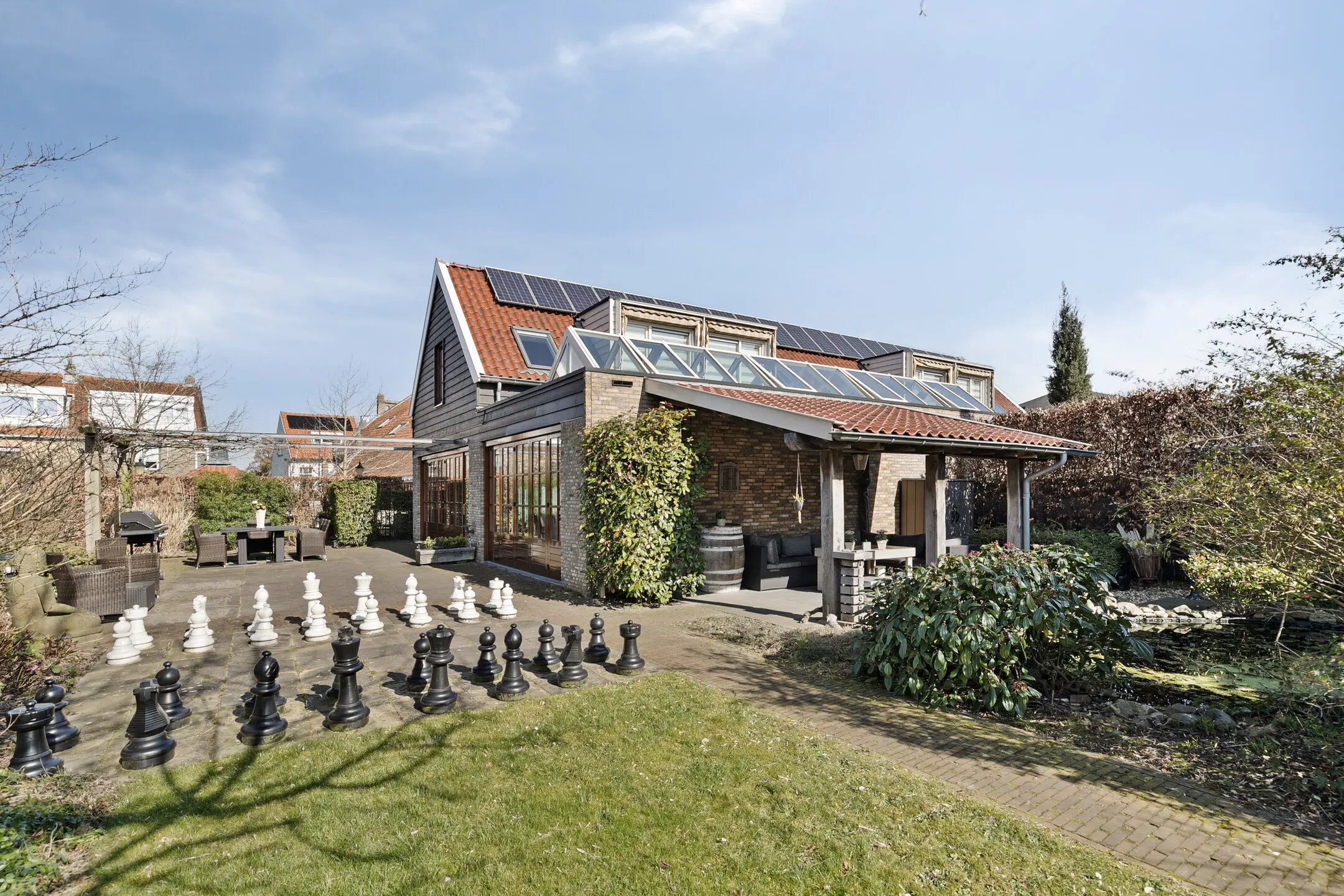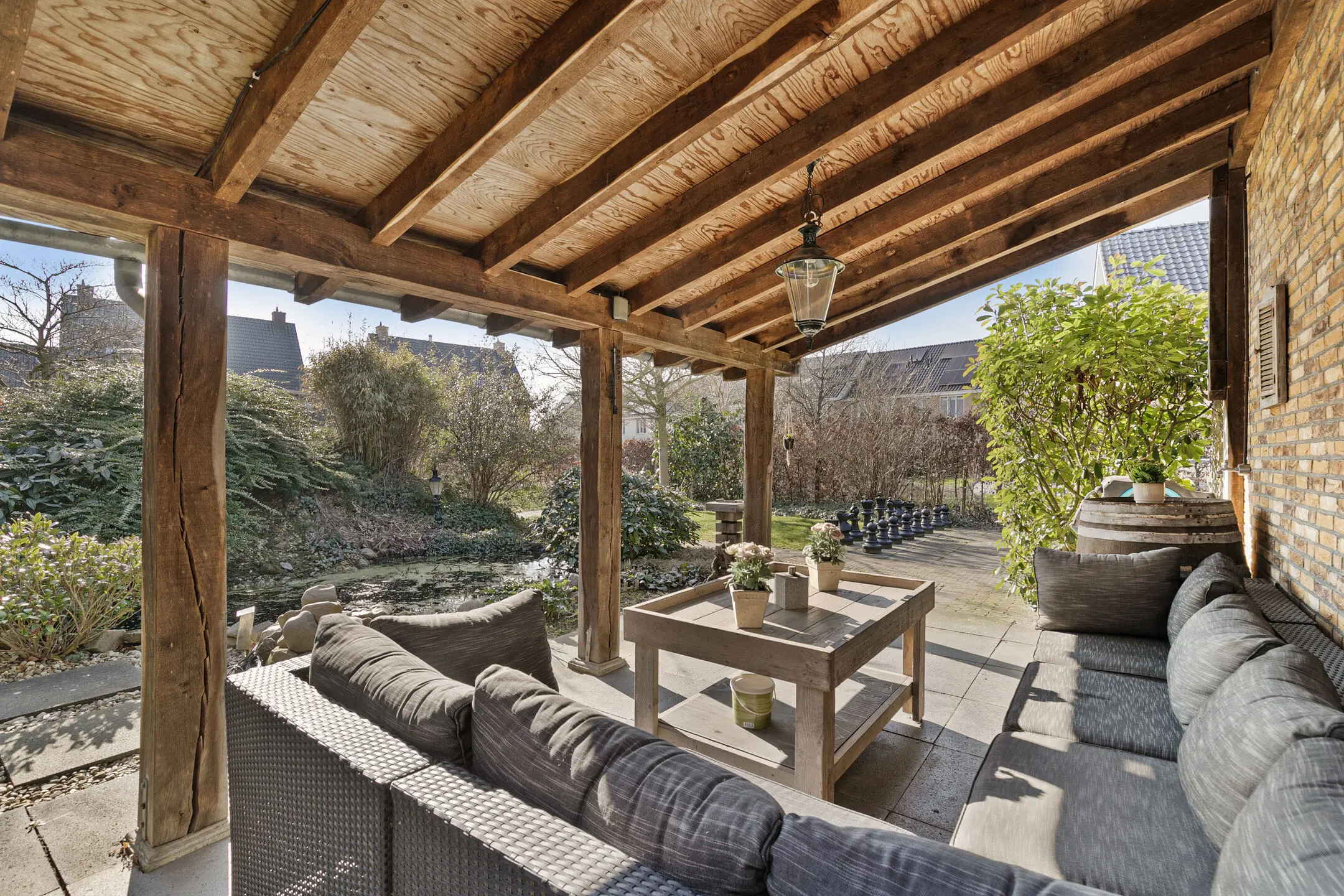 De tuin is onder architectuur ontworpen met verschillende mogelijkheden om van het buitenleven te kunnen genieten. Deze fantastische zuidgerichte tuin is voorzien van sierbestrating, sierbeplanting, een gezellige overkapping die grenst aan een sfeervolle vijver, buitenkraan en verlichting.