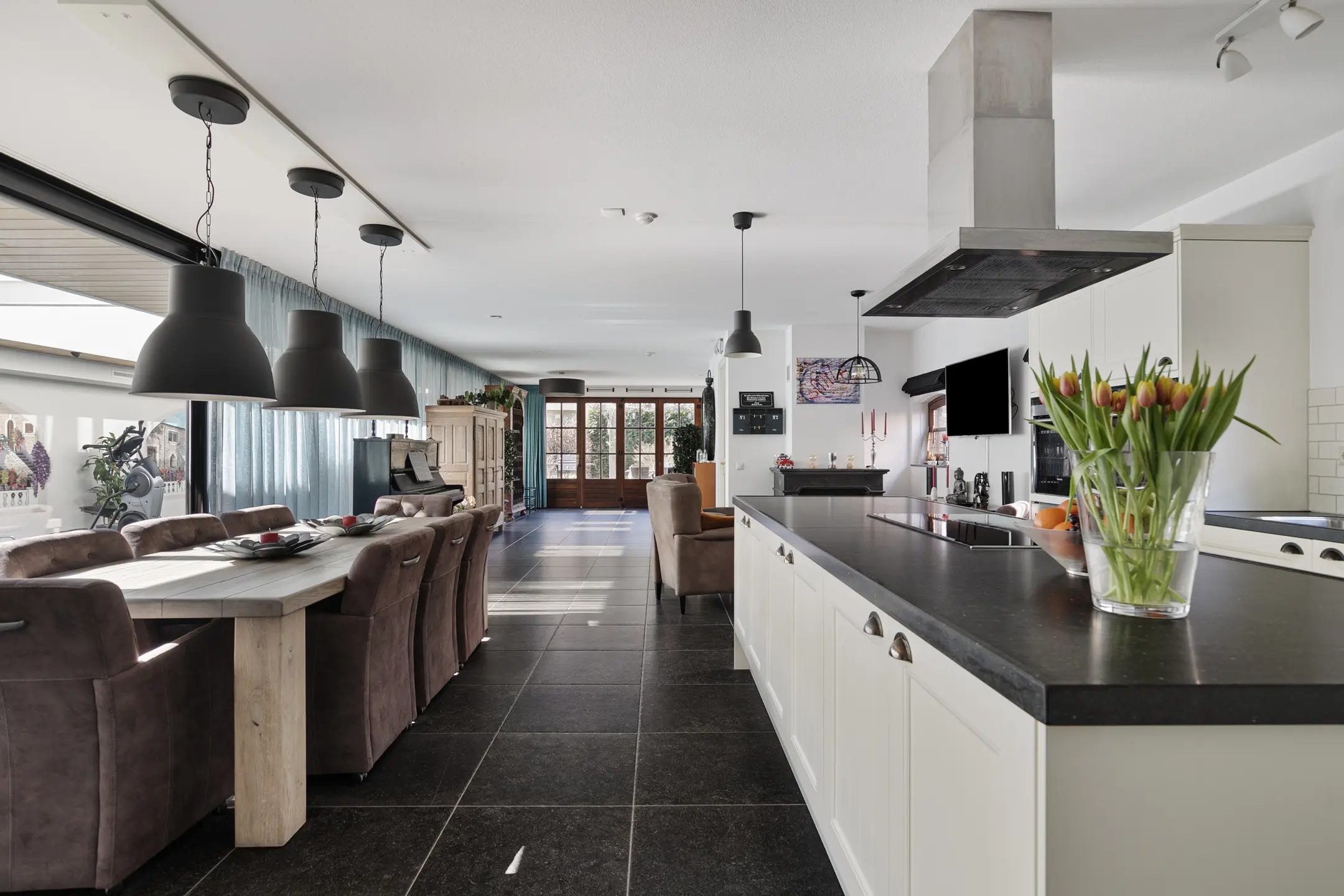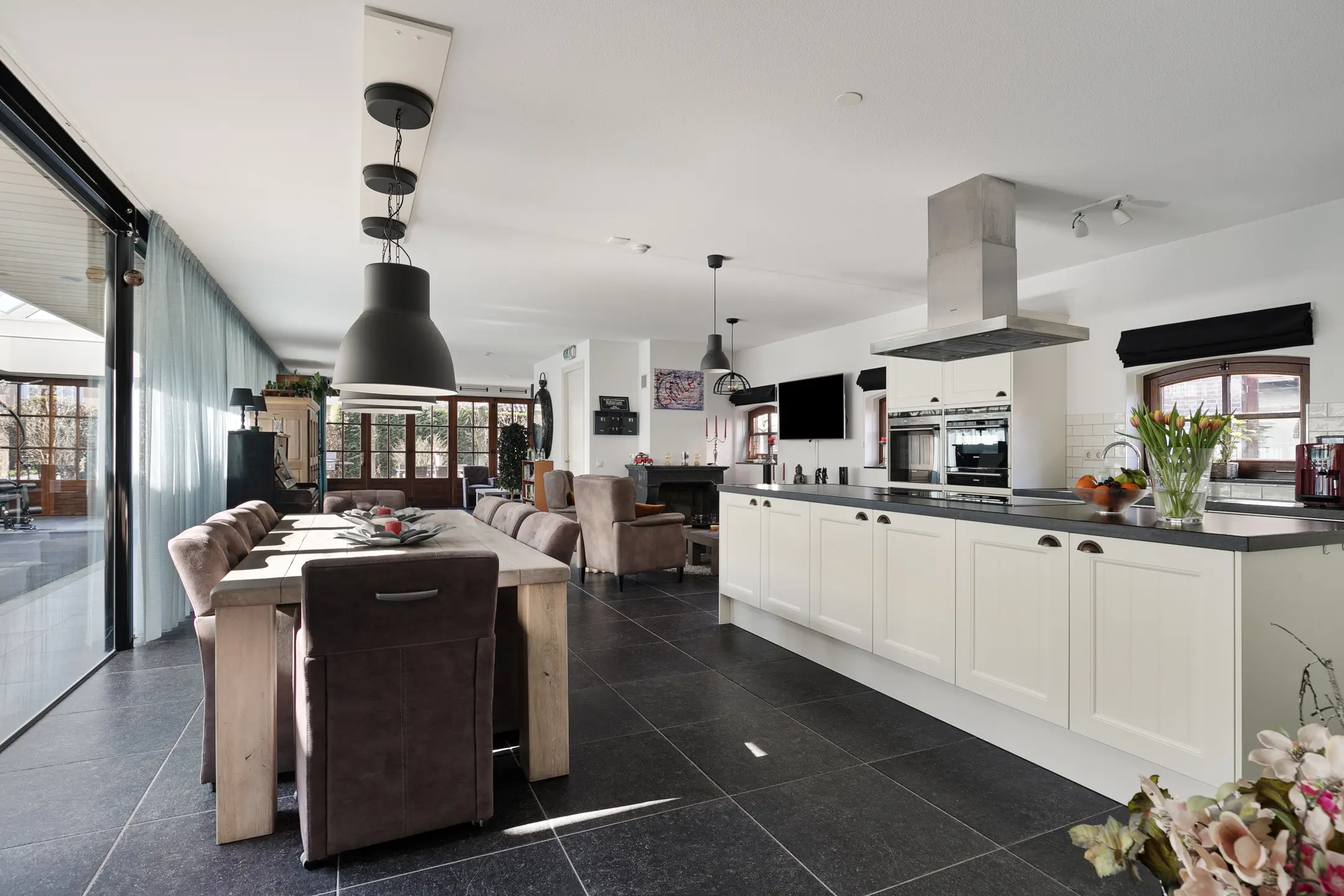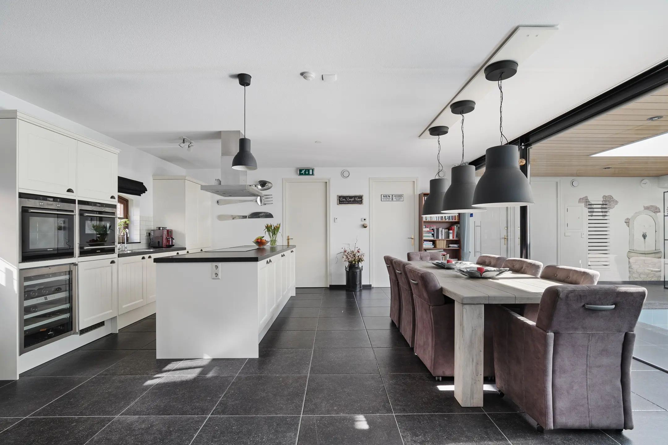 De moderne open keuken is uitgevoerd in een rechte opstelling met een royaal kookeiland. Deze complete keuken is voorzien van een apparaatkast met diverse inbouwapparatuur zoals een grote koelkast en een extra kleine koelkast, een grote vrieskast, oven met warmhoudlade, combi ovenmagnetron, een wijnkast met twee zones, een vaatwasser en een dubbele spoelbak met een Quooker kraan. Het kookeiland beschikt over een inductie kookplaat, RVS afzuigkap en servieskasten. Het geheel is uitgevoerd in lichte kleuren en afgewerkt met een composiet aanrechtblad en natuurstenen vloer met vloerverwarming. Via een deur heeft u toegang tot de toiletruimtes.