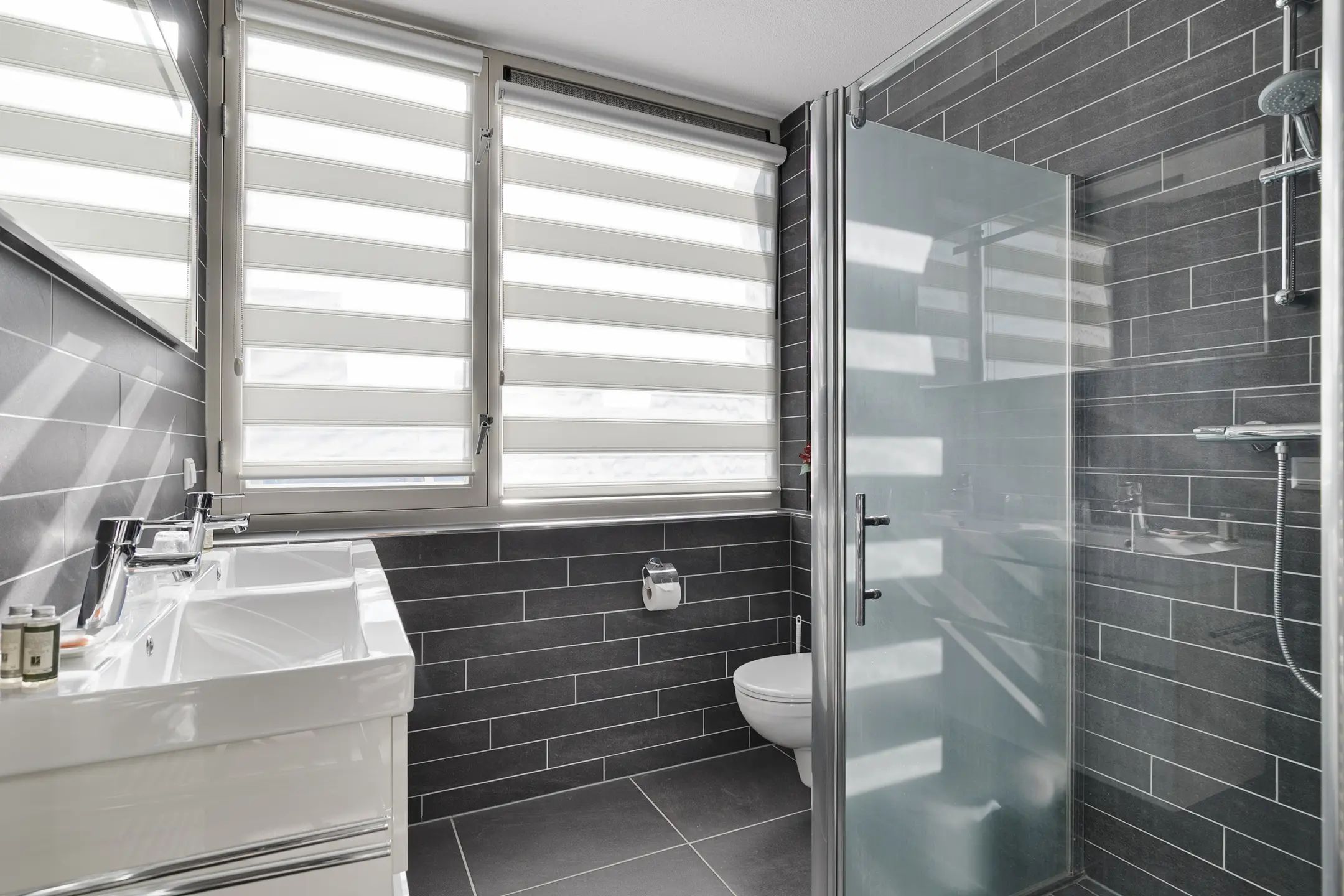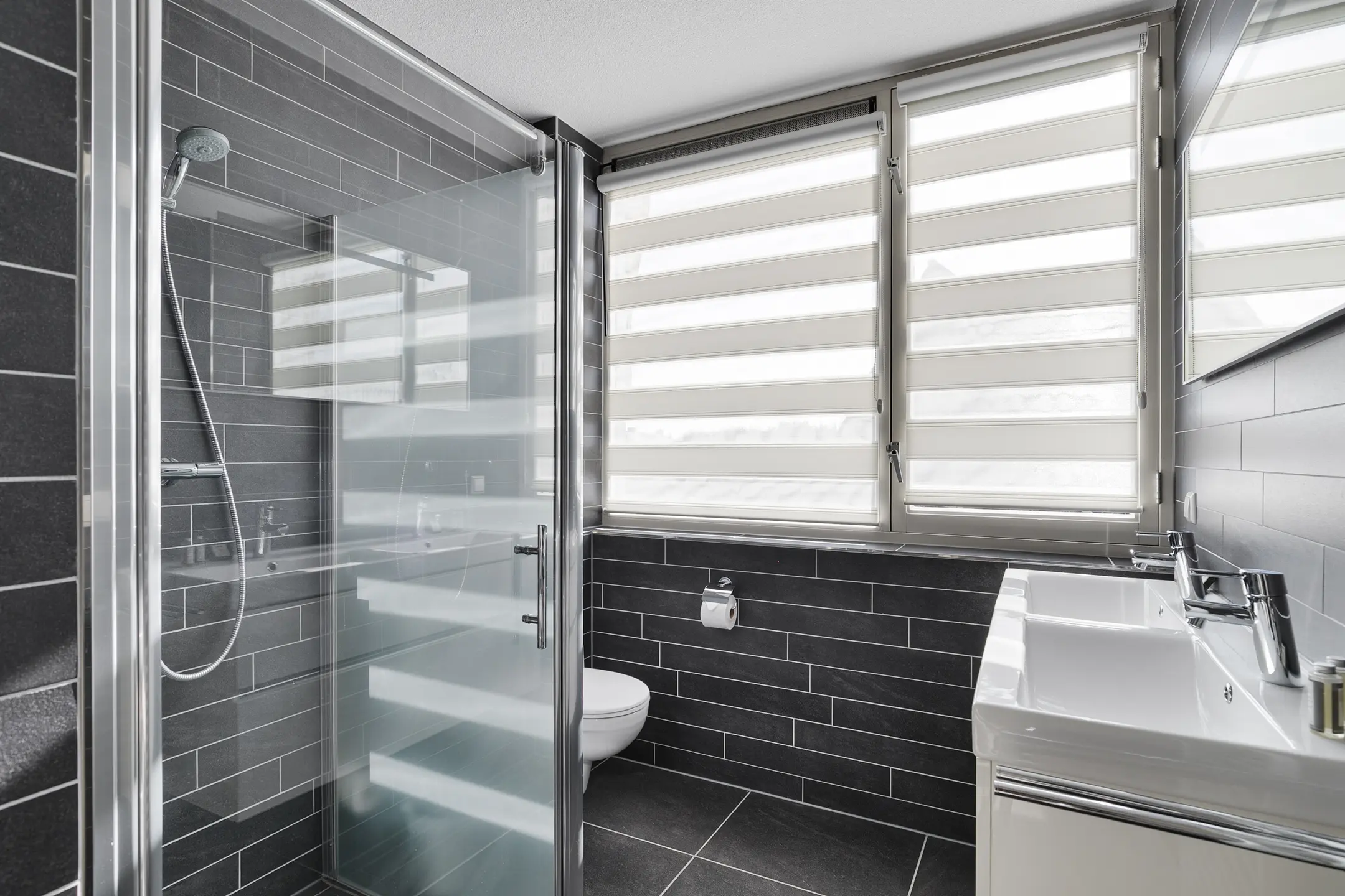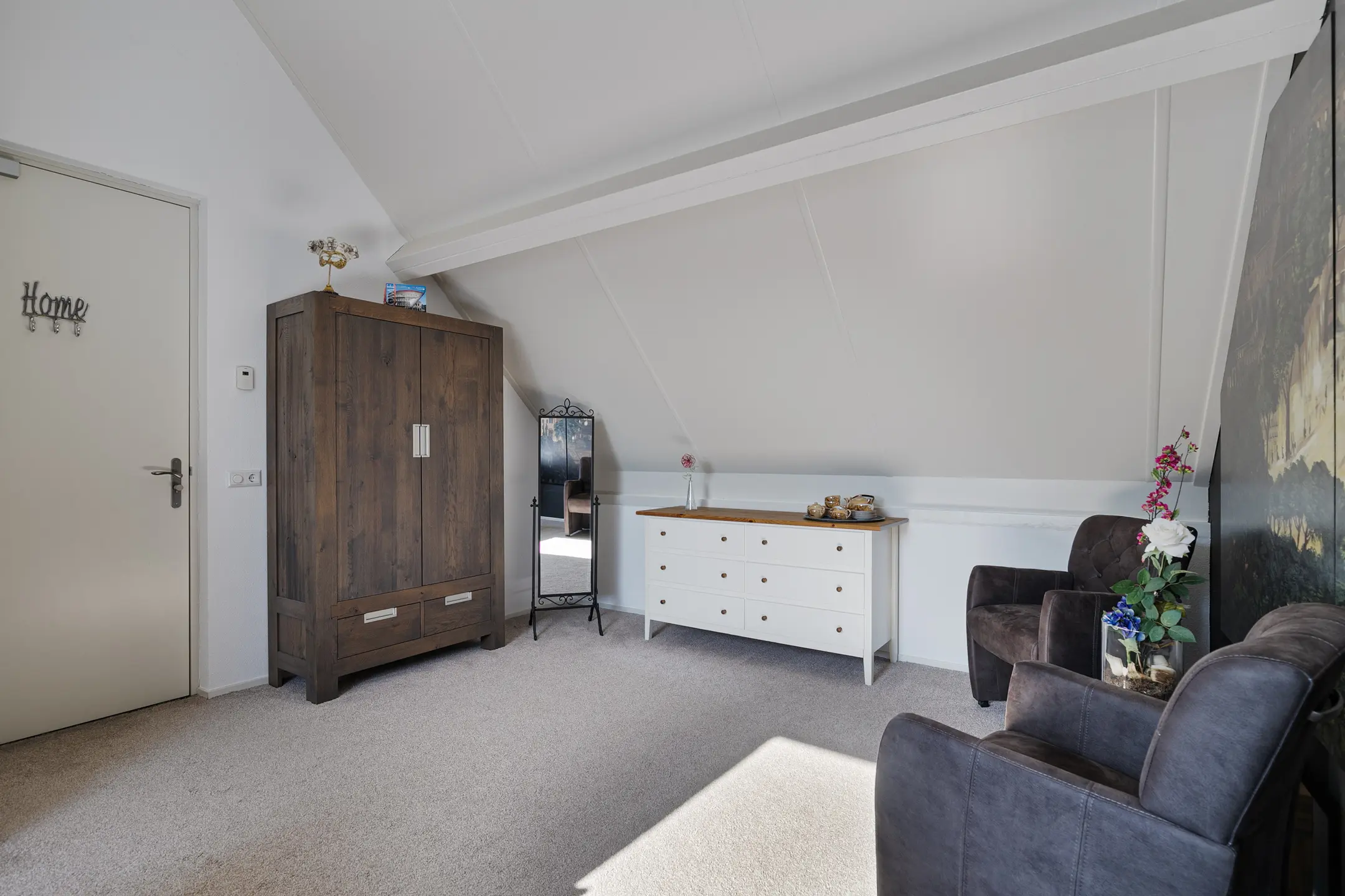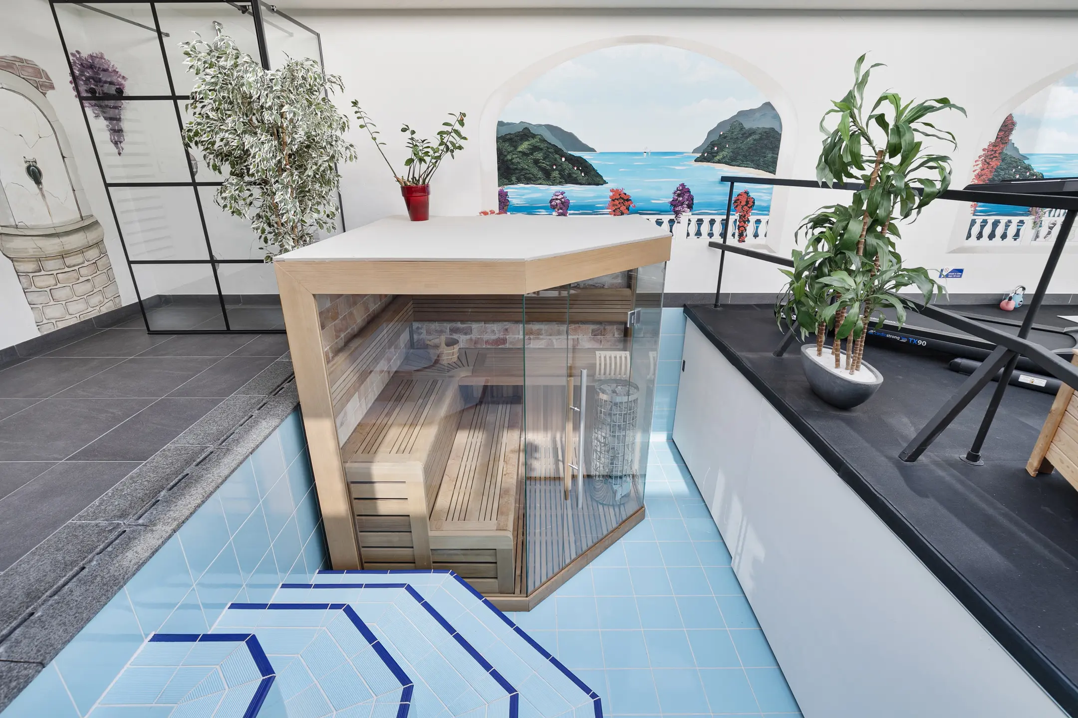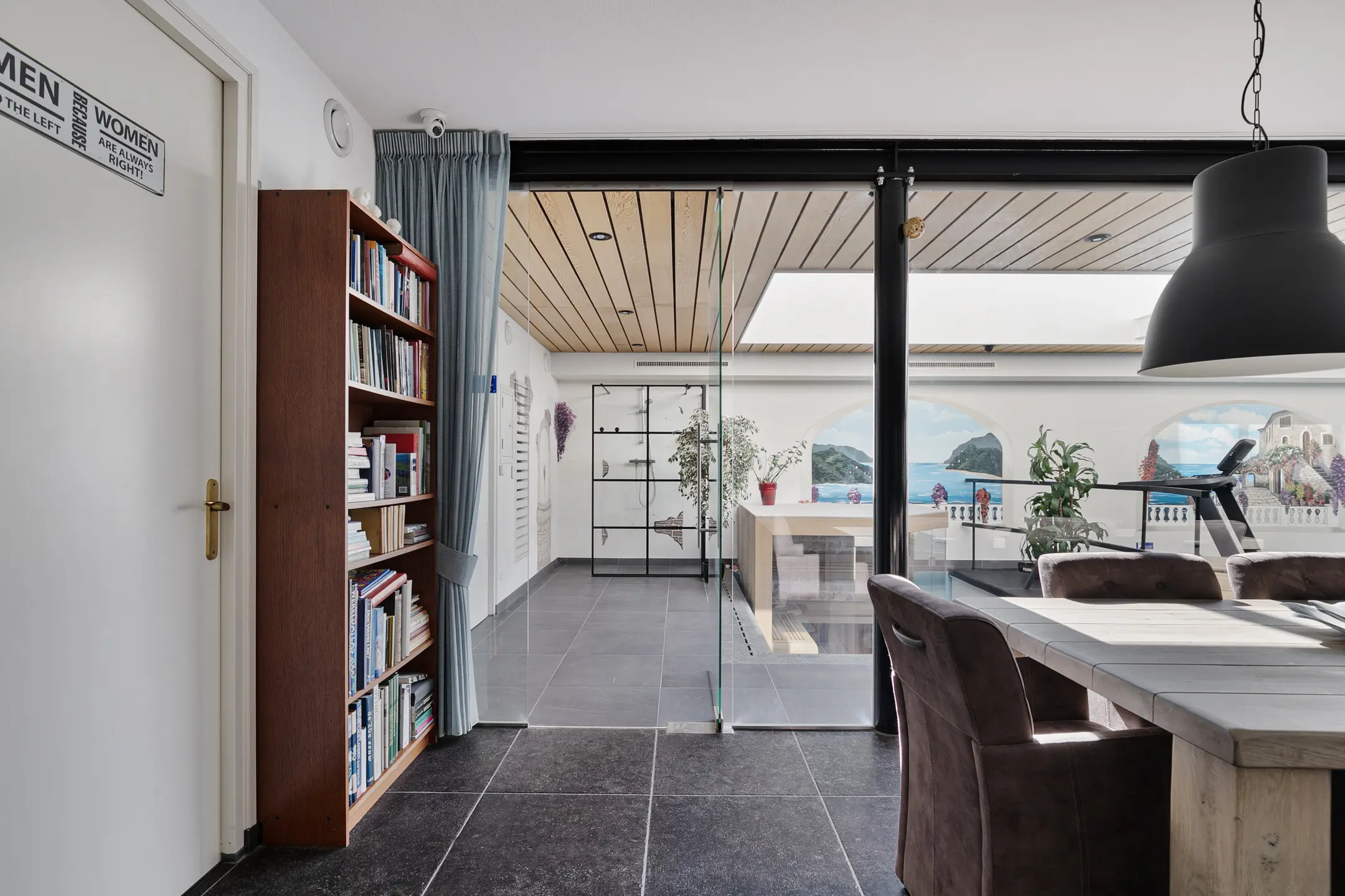 De woonruimte en de wellnessruimte zijn op een prachtige wijze van elkaar gescheiden door elegante glazen wanden. Deze transparante afscheiding zorgt voor een open en ruimtelijk gevoel, terwijl beide zones toch hun eigen karakter en sfeer behouden. Dankzij het glas blijft de natuurlijke lichtinval optimaal benut en ontstaat er een subtiele verbinding tussen ontspanning en woongenot.