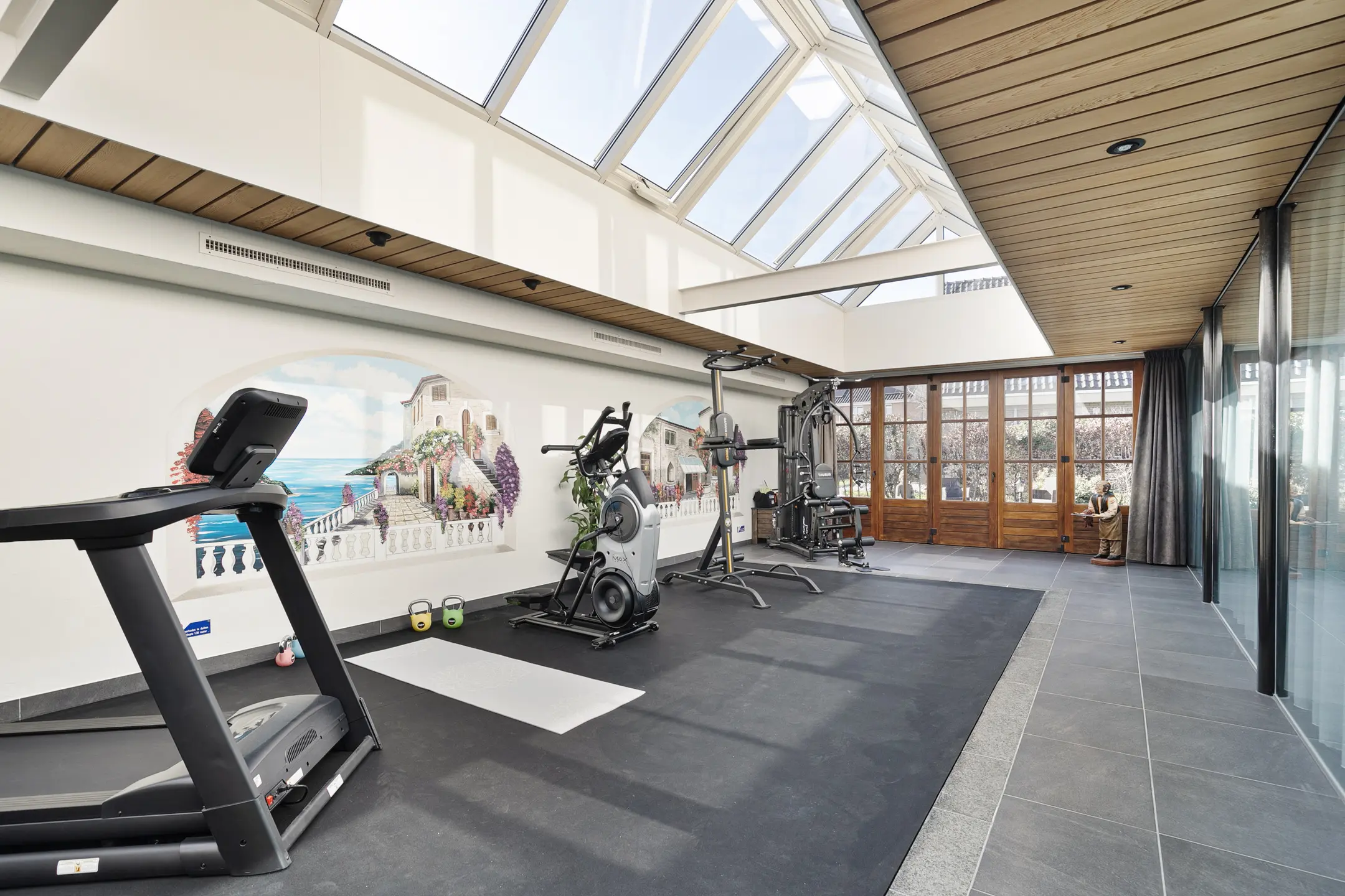 De wellnessruimte beschikt over een overdekt zwembad, sauna, douche en sportruimte. Voor de wellnessruimte zijn twee aparte toiletruimtes gerealiseerd. De wellnessruimte baadt in natuurlijk licht dankzij een indrukwekkend plafond met maar liefst 24 dakramen. Deze dakramen zijn individueel bedienbaar via een afstandsbediening, waardoor de lichtinval en ventilatie eenvoudig kunnen worden aangepast aan de gewenste sfeer en comfort.