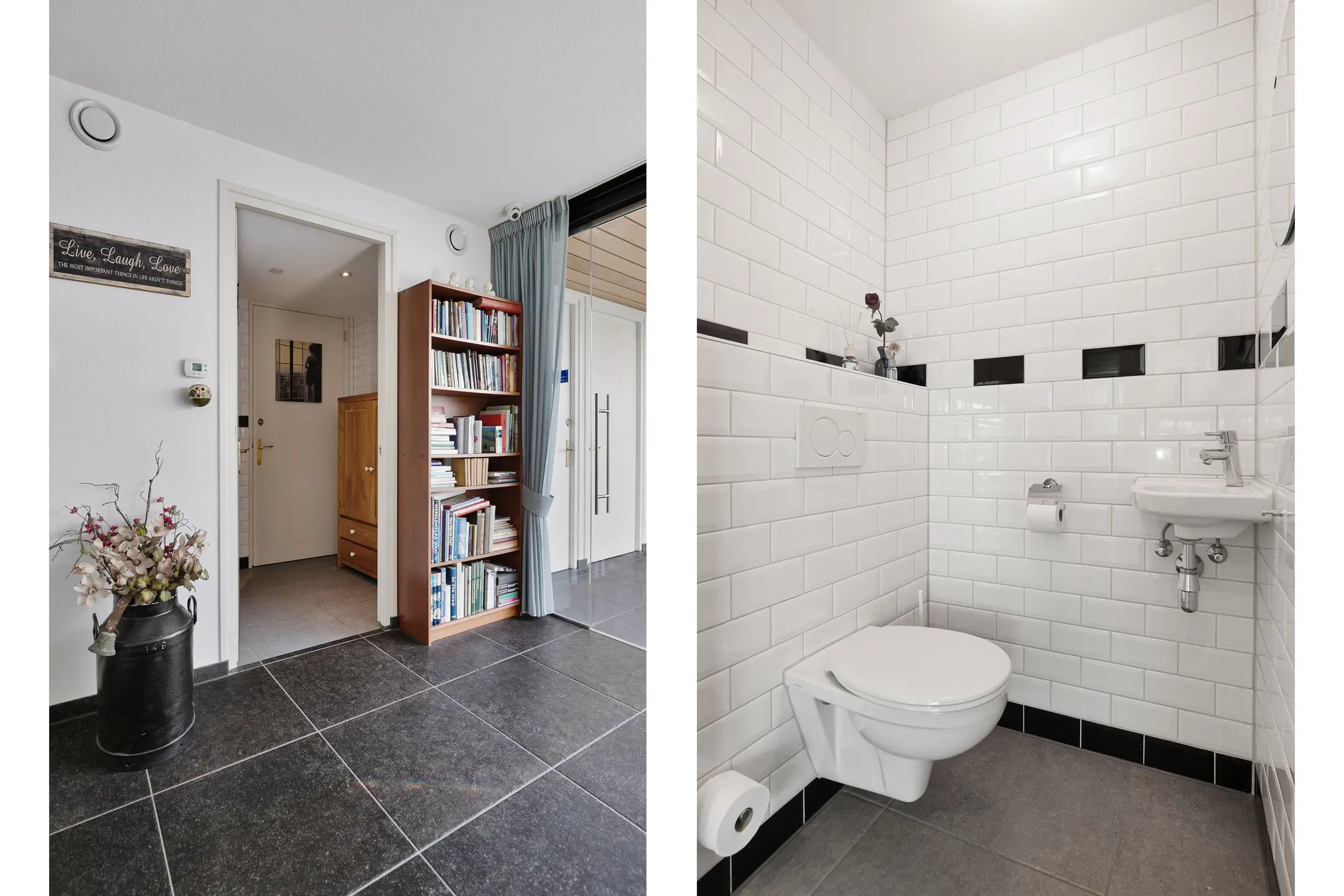 Twee aparte fraai afgewerkte toiletruimtes voorzien van een hangend toilet en fonteintje. De toiletruimtes zijn geheel betegeld met charmante metro tegels.