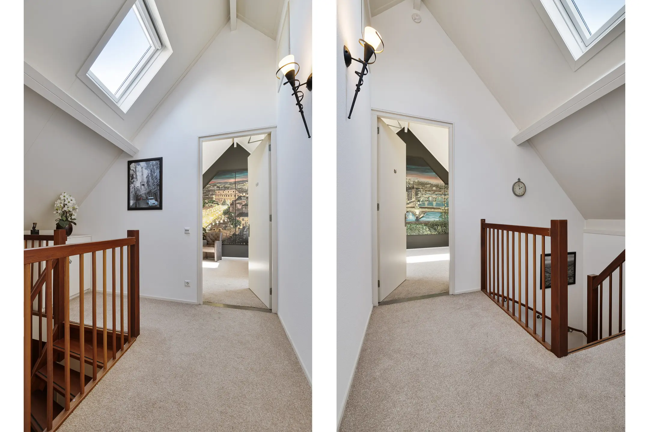 De hal aan de keukenkant biedt toegang tot een overloop met toegang tot twee slaapkamers.