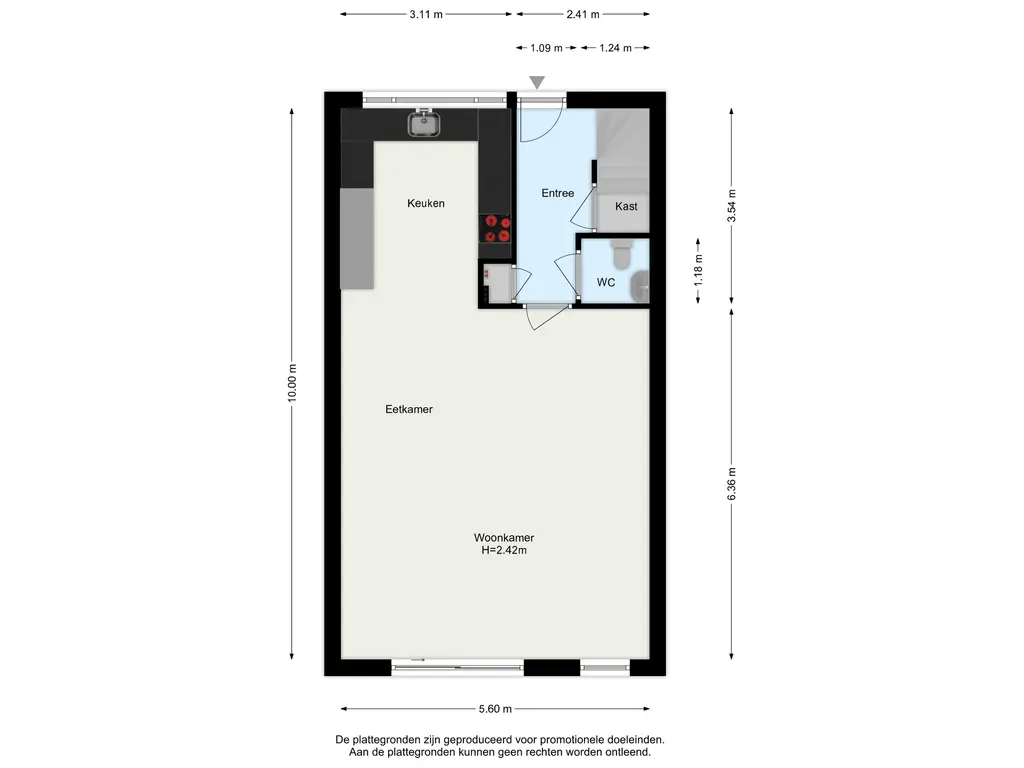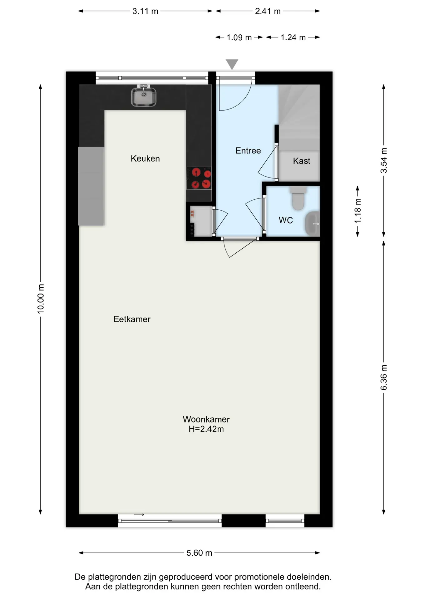 Bij binnenkomst wordt u verwelkomd in een ruime hal met een trap naar de eerste verdieping. Hier bevindt zich een praktische maatwerkkast onder de trap, ideaal voor opbergruimte. De hal leidt naar het toilet met hangend toilet en fonteintje, afgewerkt in strakke wit/grijze tinten. Een zwarte glazen paneeldeur geeft toegang tot de uitgebouwde woonkamer (ca. 36 m²) met grote schuifpui aan de achterzijde, die volop daglicht binnenlaat. De vloer is voorzien van sfeervolle plavuizen in houtlook met vloerverwarming, en de muren en plafonds zijn glad gestuct.