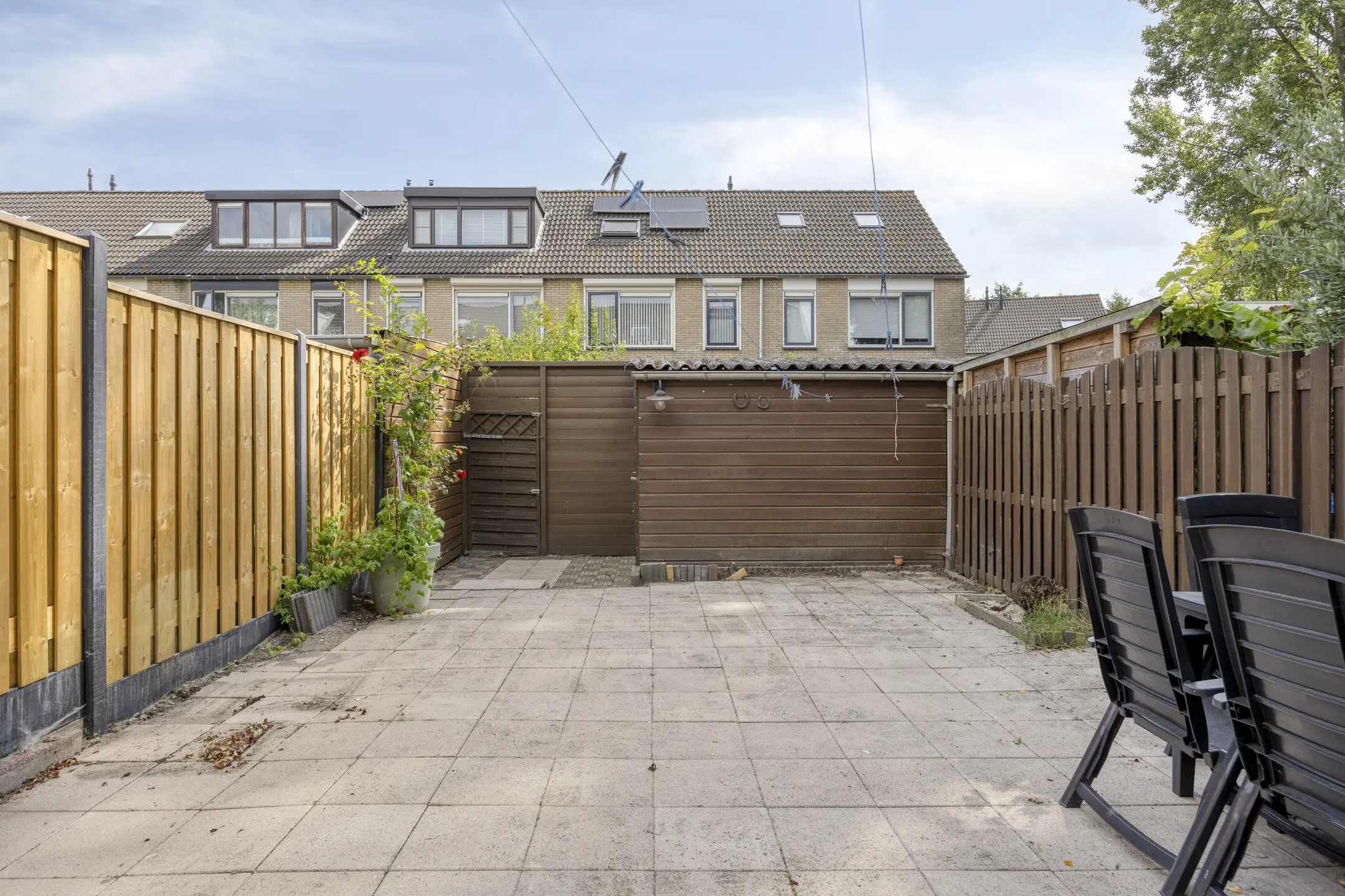 Achtertuin op het oosten met houten berging