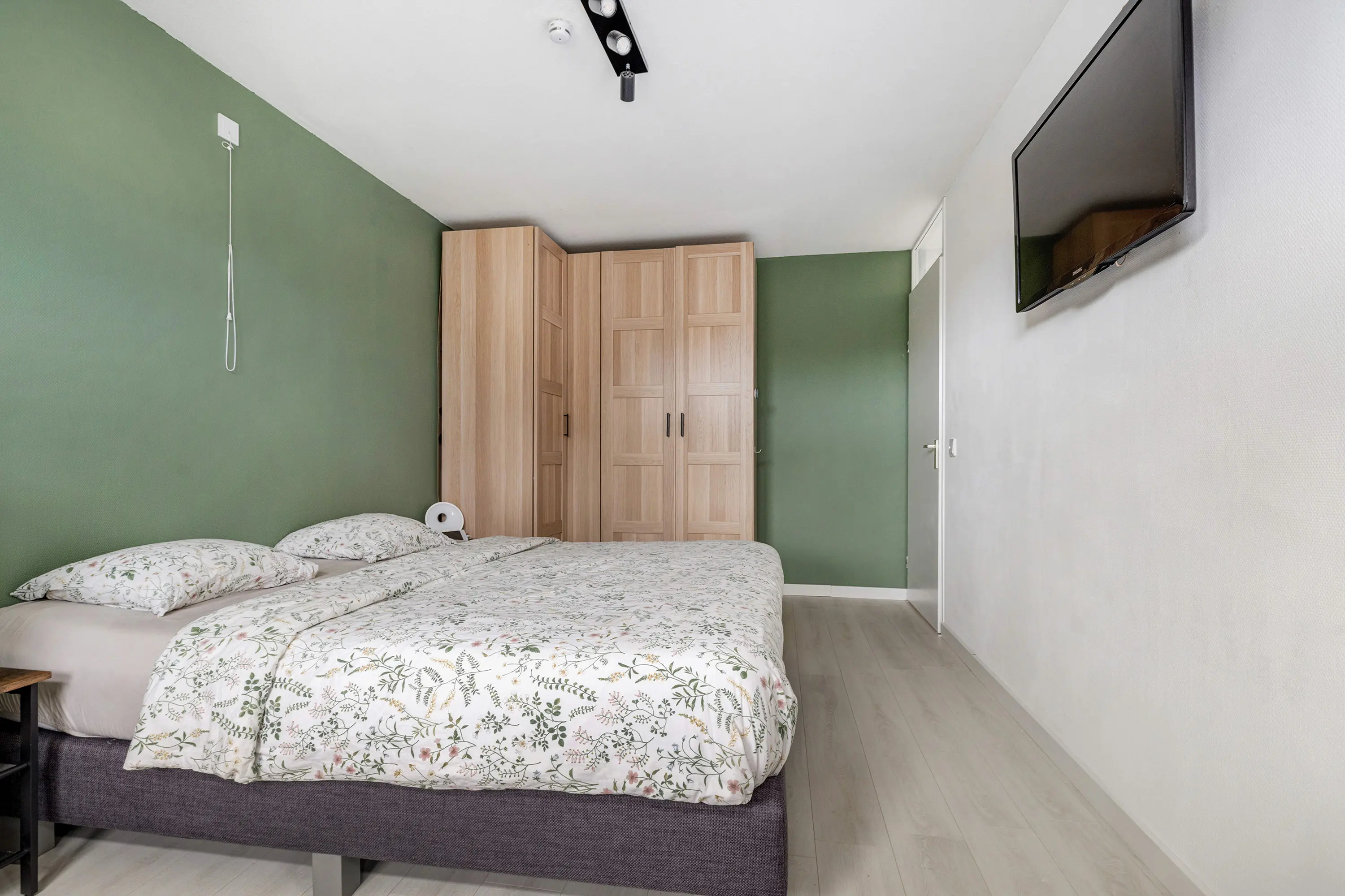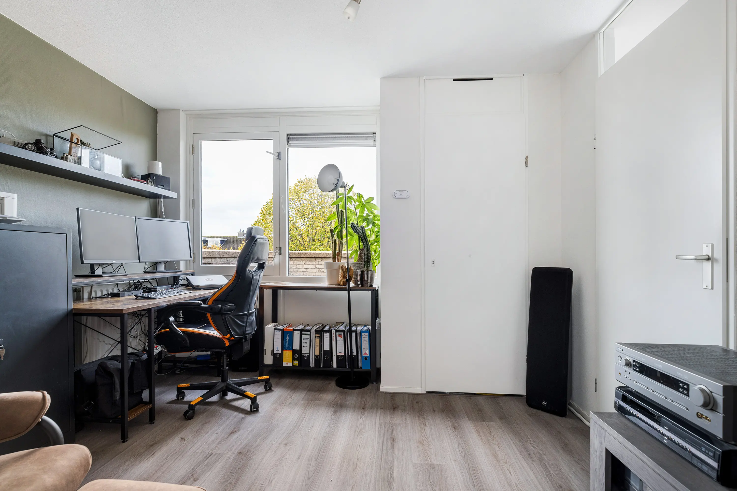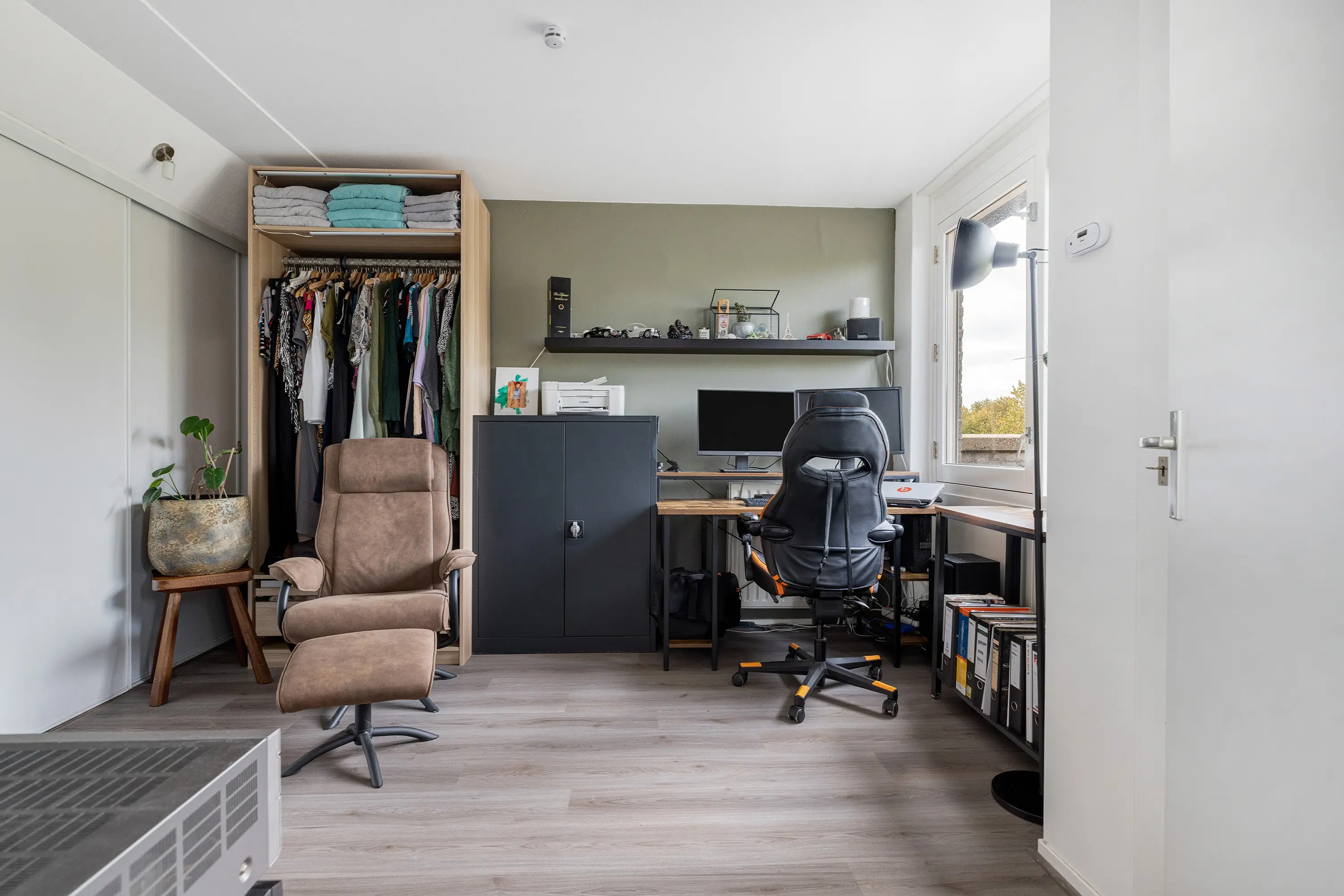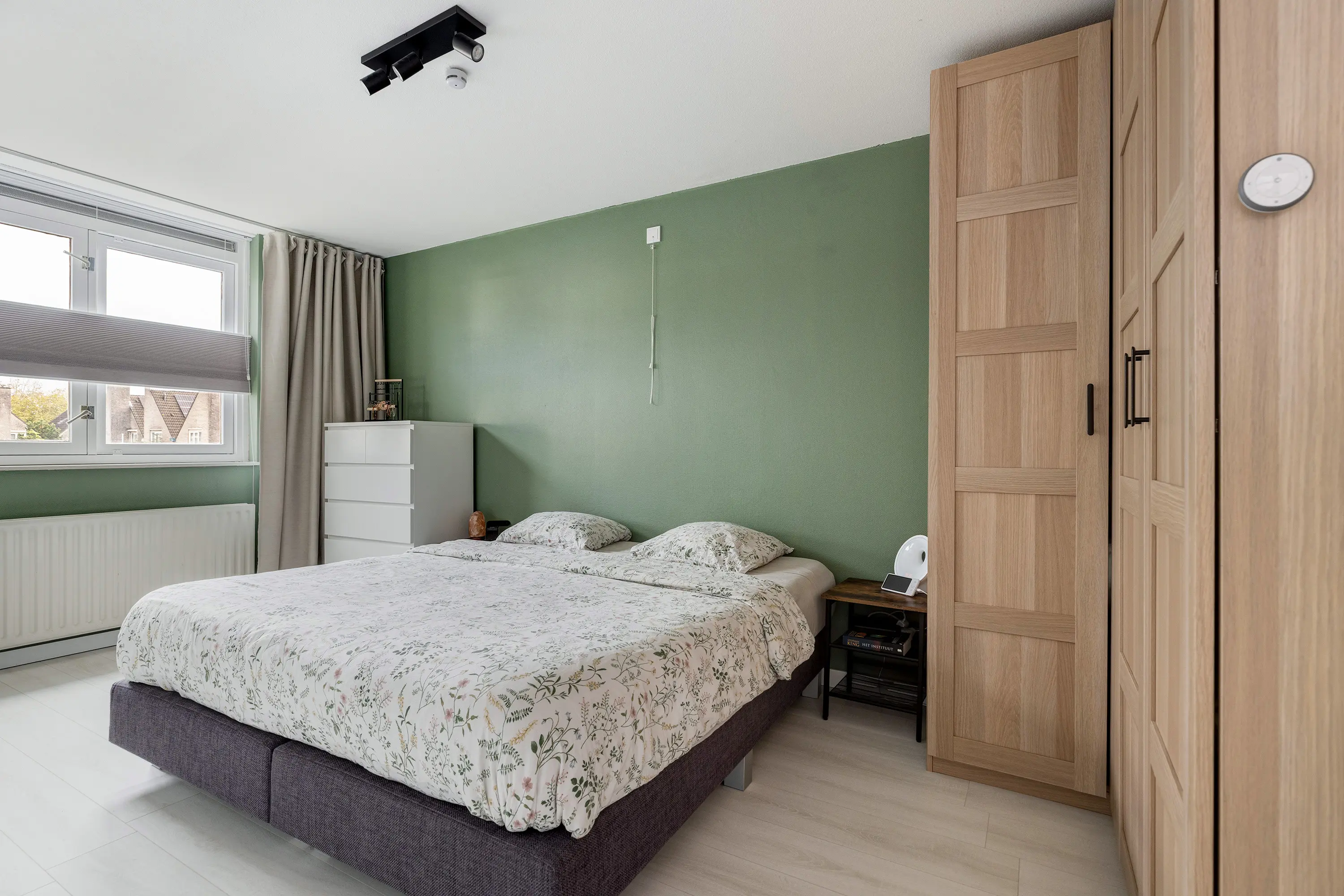 De slaapkamer (ca. 13 m²) is voorzien van een vaste schuifkastenwand, een aparte kast met de CV-ketel, en een elektrisch bedienbaar rolluik. De wasruimte heeft een dakraam voor natuurlijk licht en ventilatie. Via een deur (met handmatig bedienbaar rolluik) stap je het zonnige dakterras op het zuidwesten op, een heerlijke plek om te genieten van de middag- en avondzon.