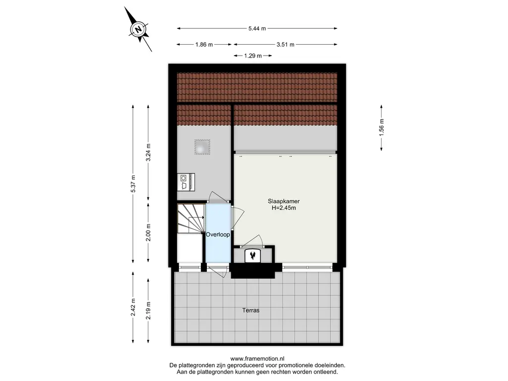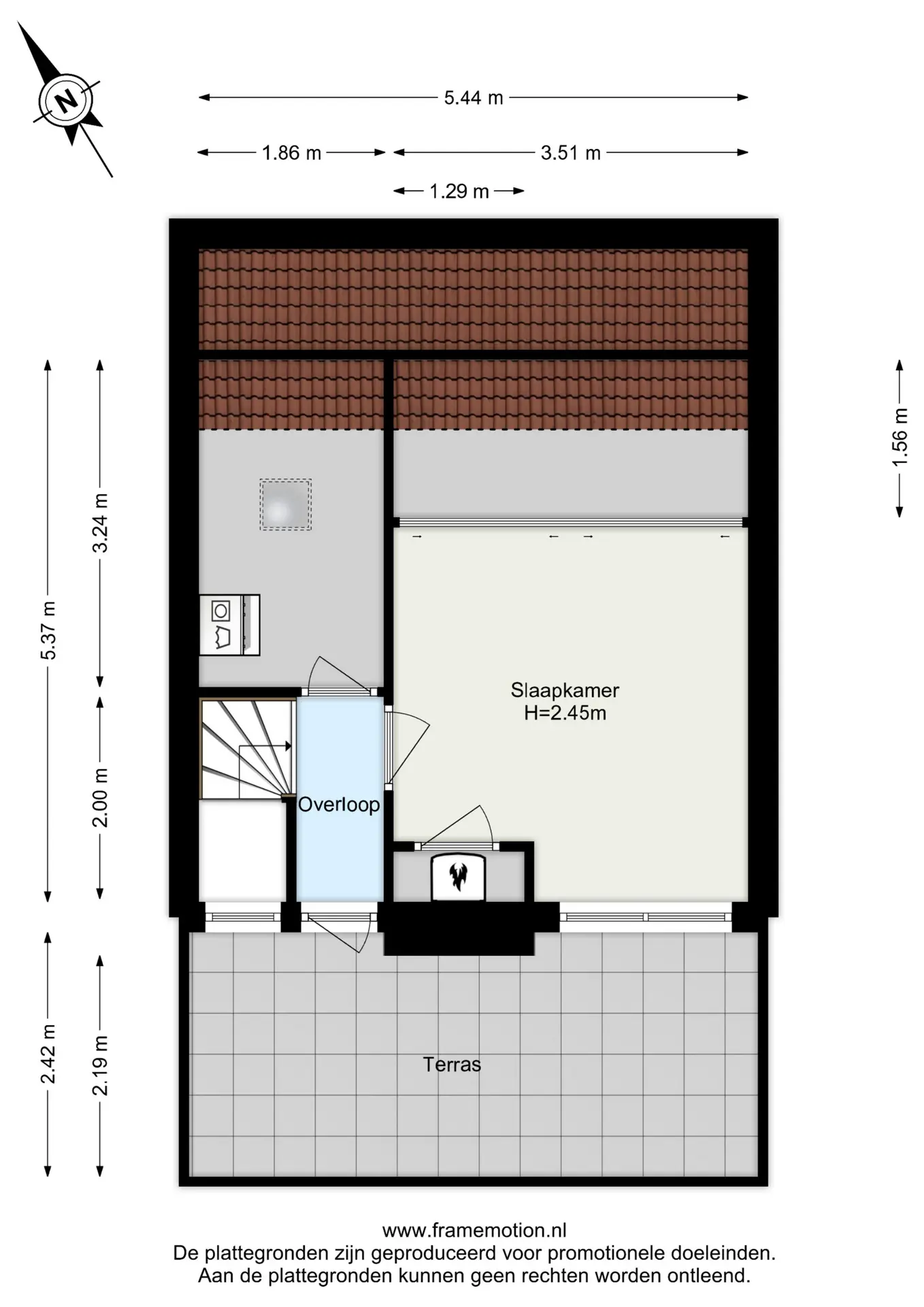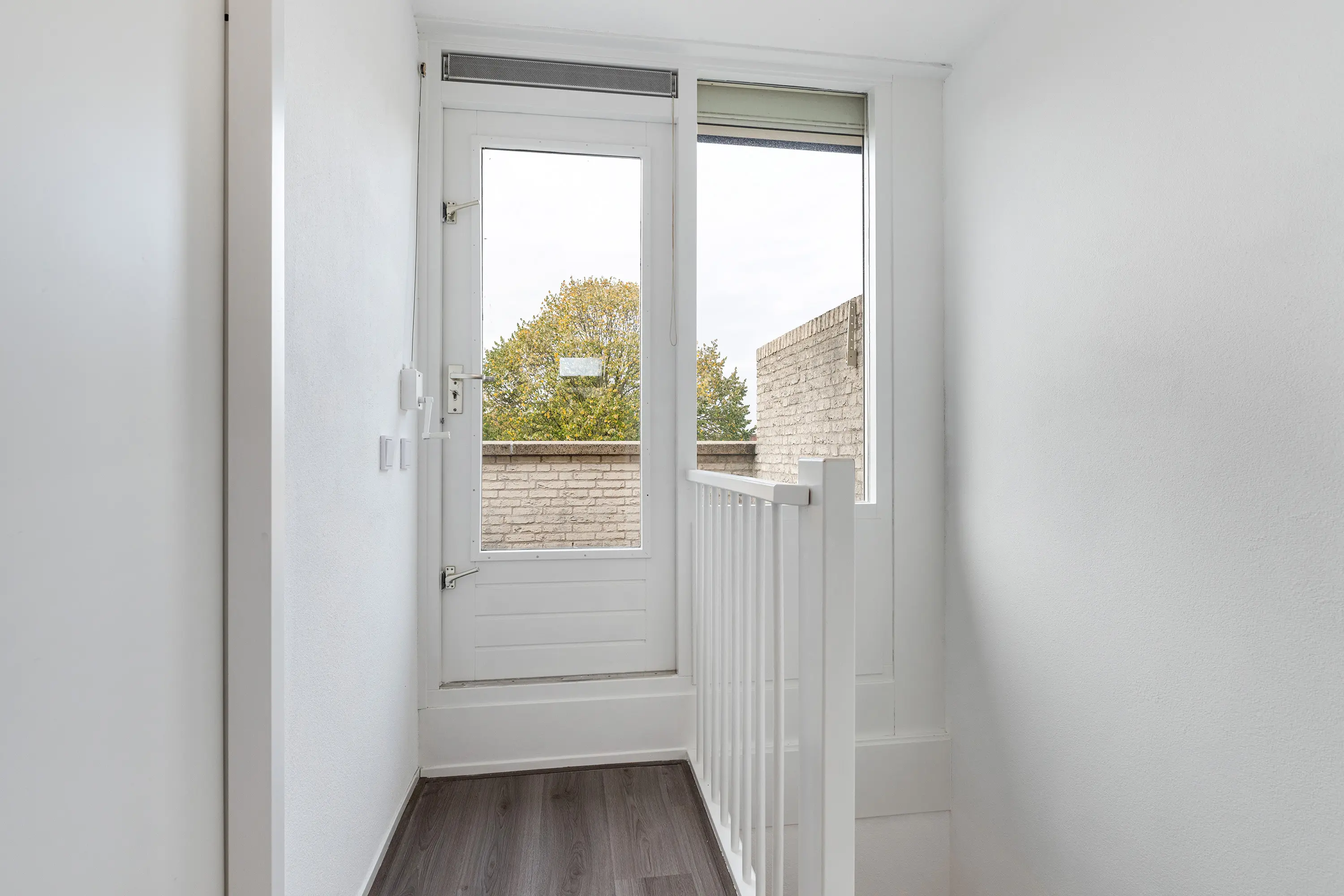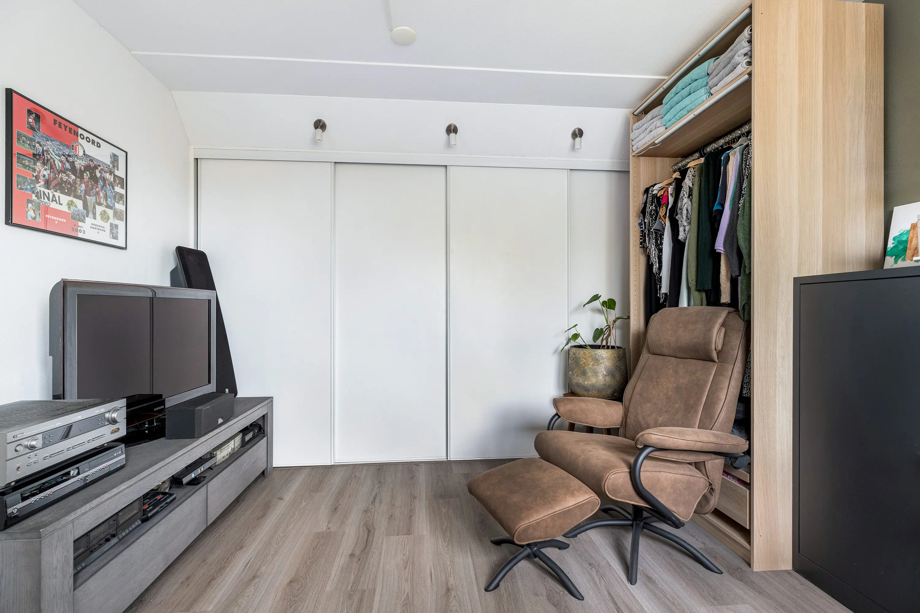 De slaapkamer (ca. 13 m²) is voorzien van een vaste schuifkastenwand, een aparte kast met de CV-ketel, en een elektrisch bedienbaar rolluik. De wasruimte heeft een dakraam voor natuurlijk licht en ventilatie. Via een deur (met handmatig bedienbaar rolluik) stap je het zonnige dakterras op het zuidwesten op, een heerlijke plek om te genieten van de middag- en avondzon.