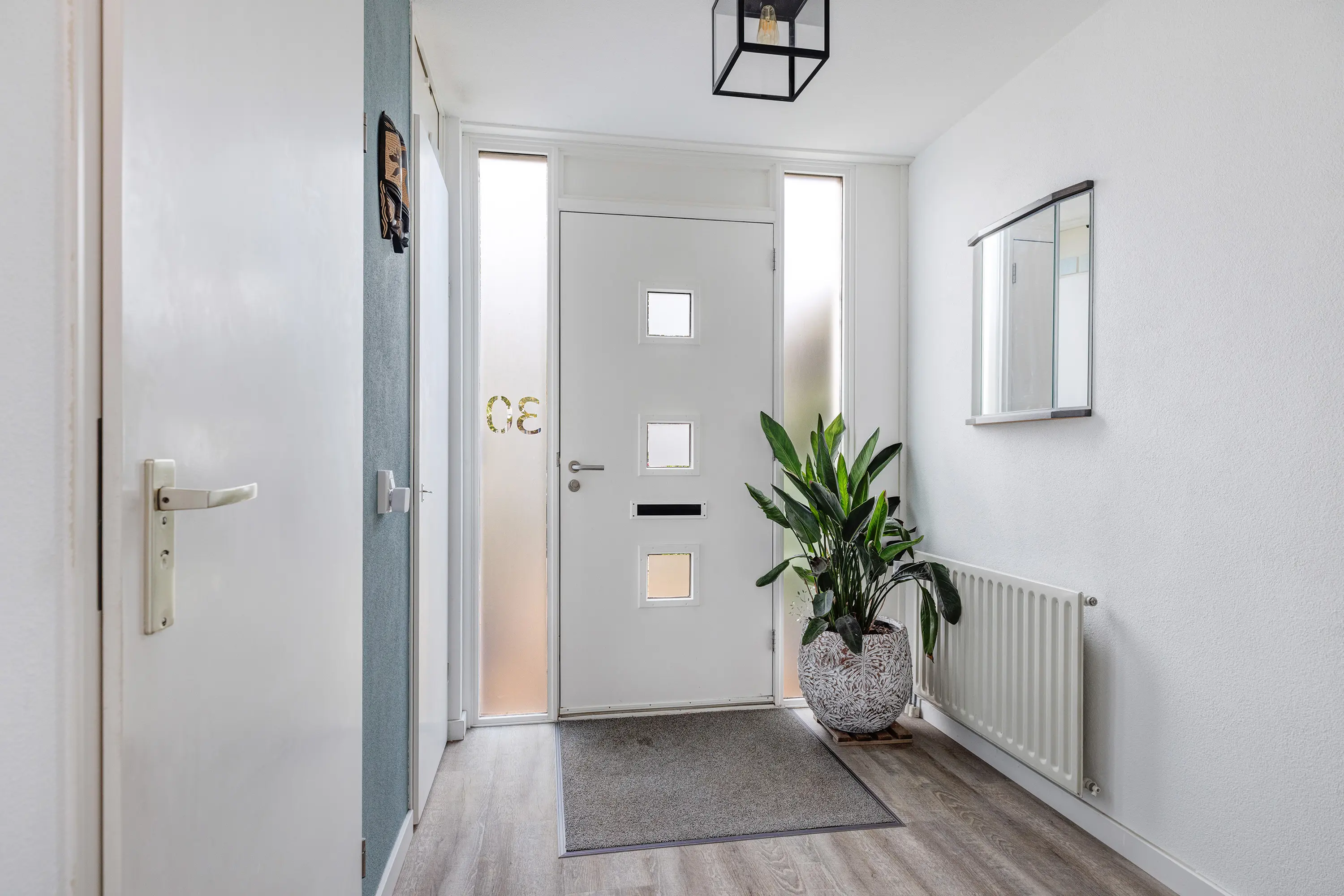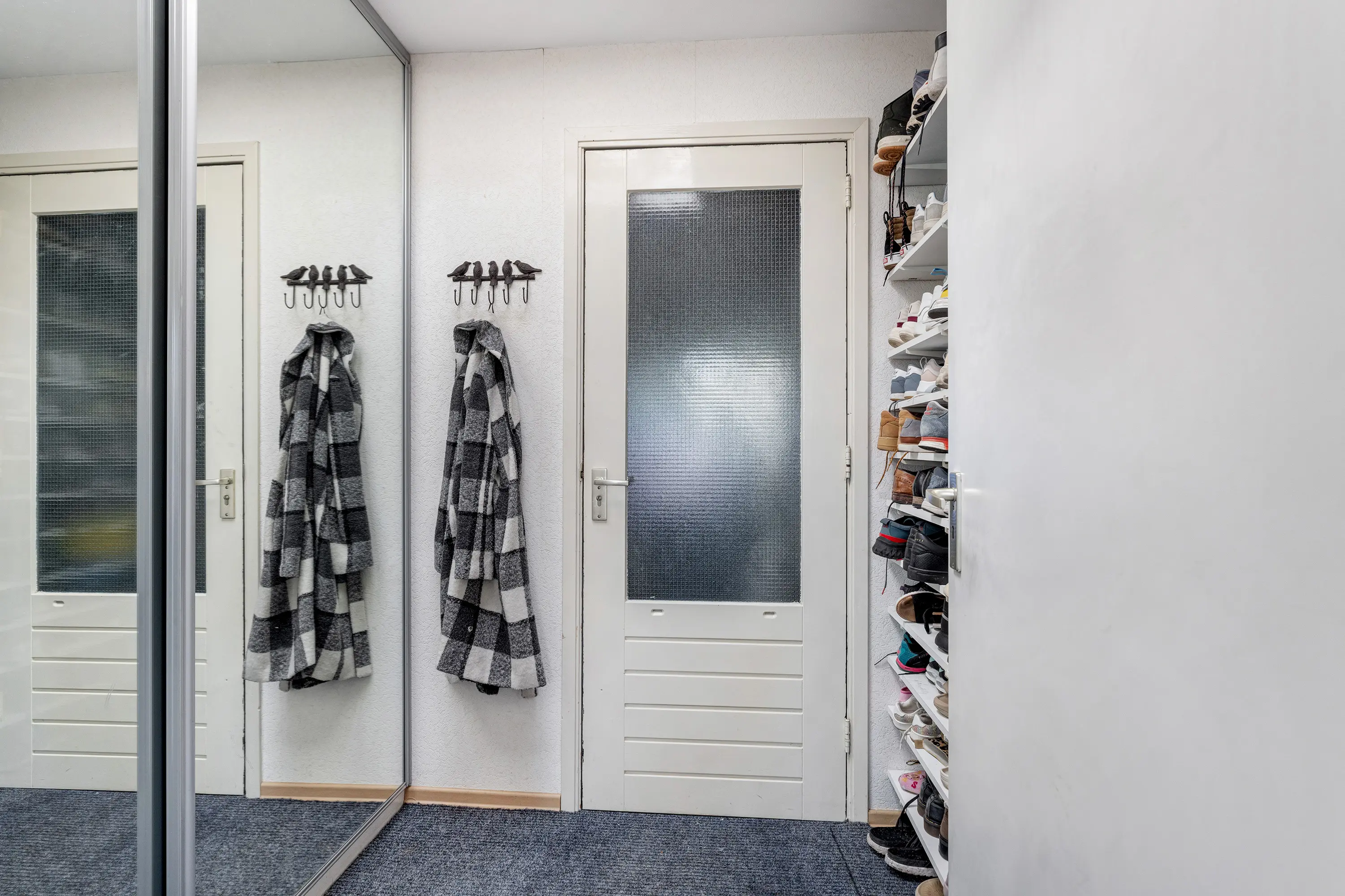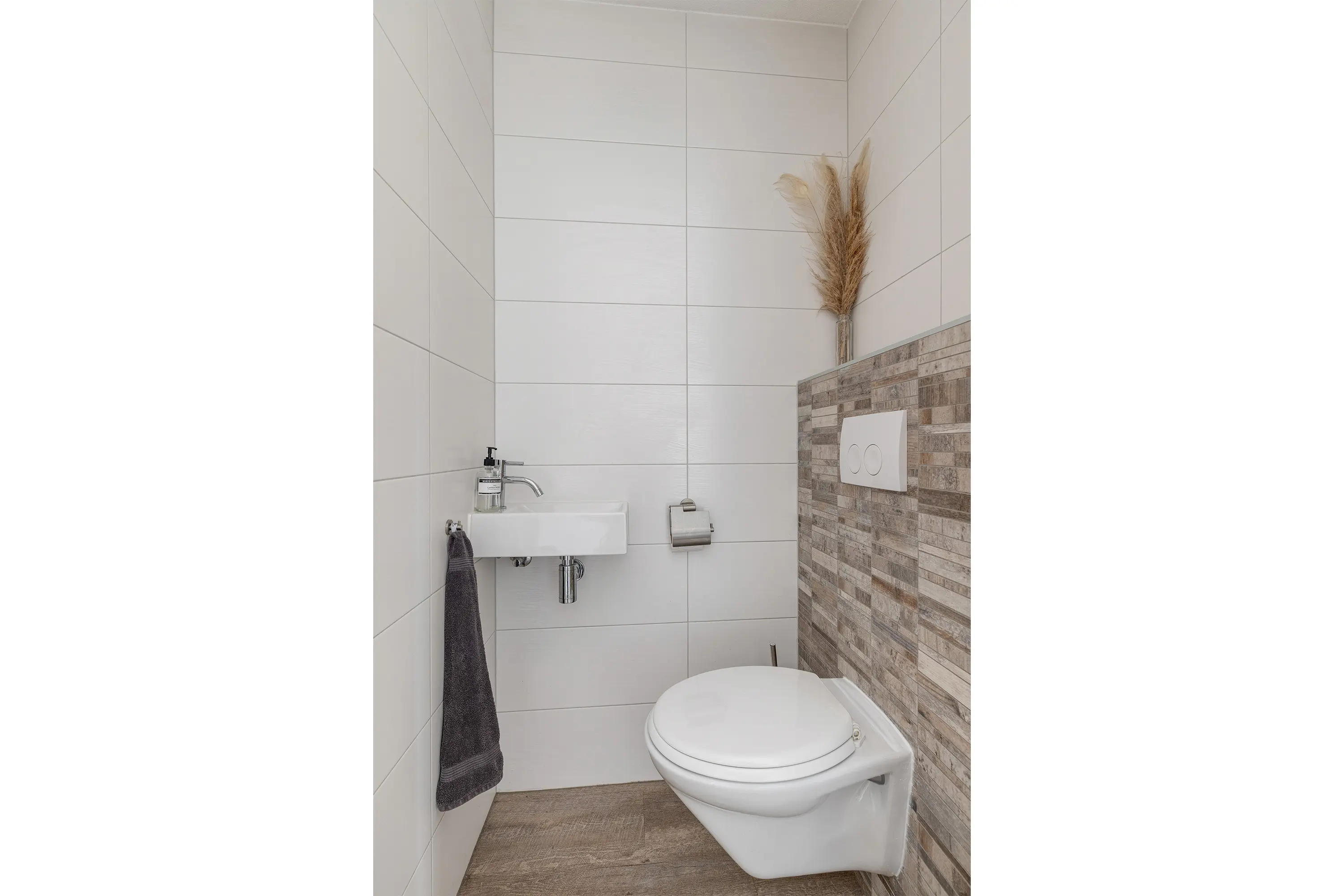 Via de entree kom je in de hal met de meterkast (vernieuwd in 2022) en een moderne toiletruimte met hangend toilet en fonteintje.
