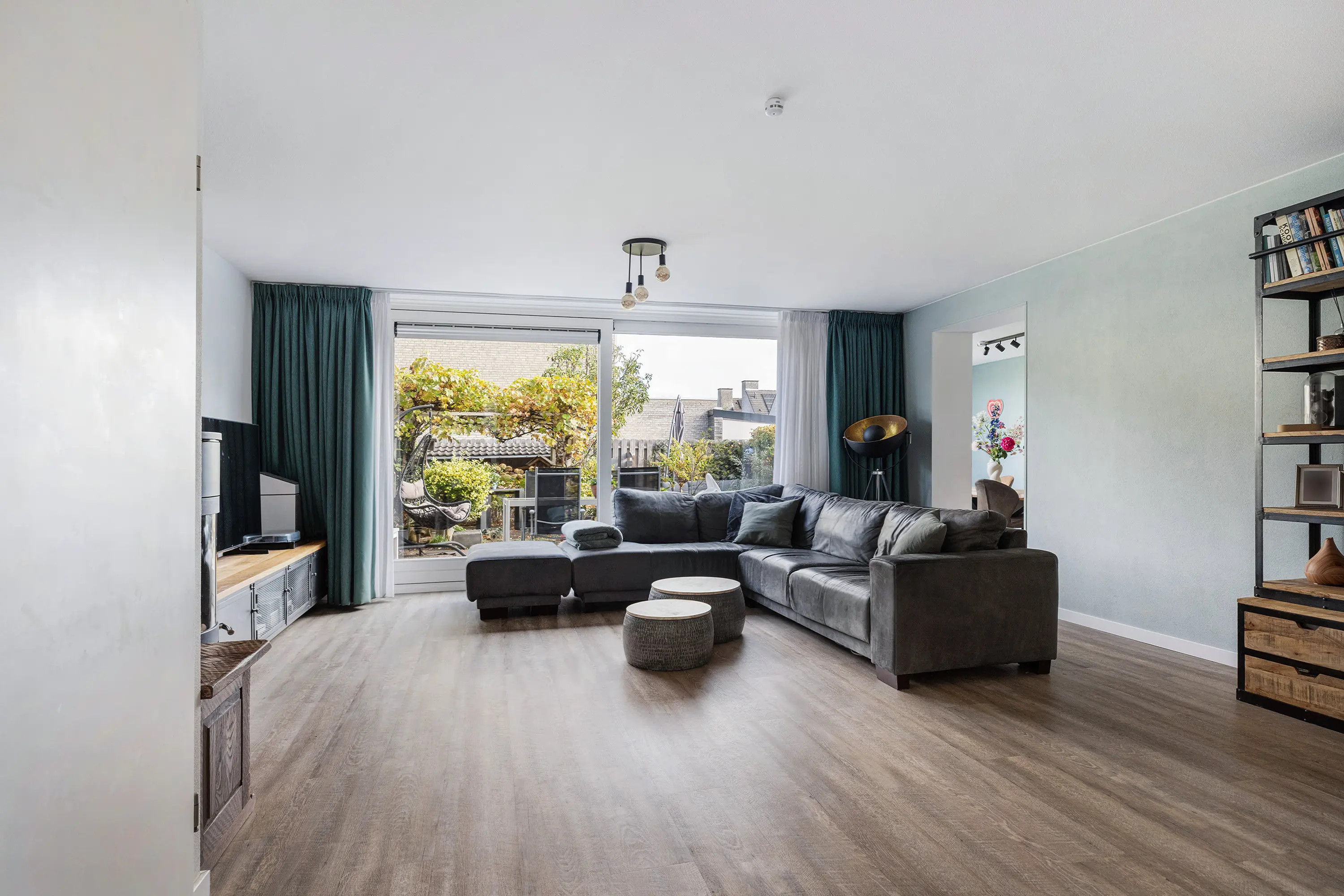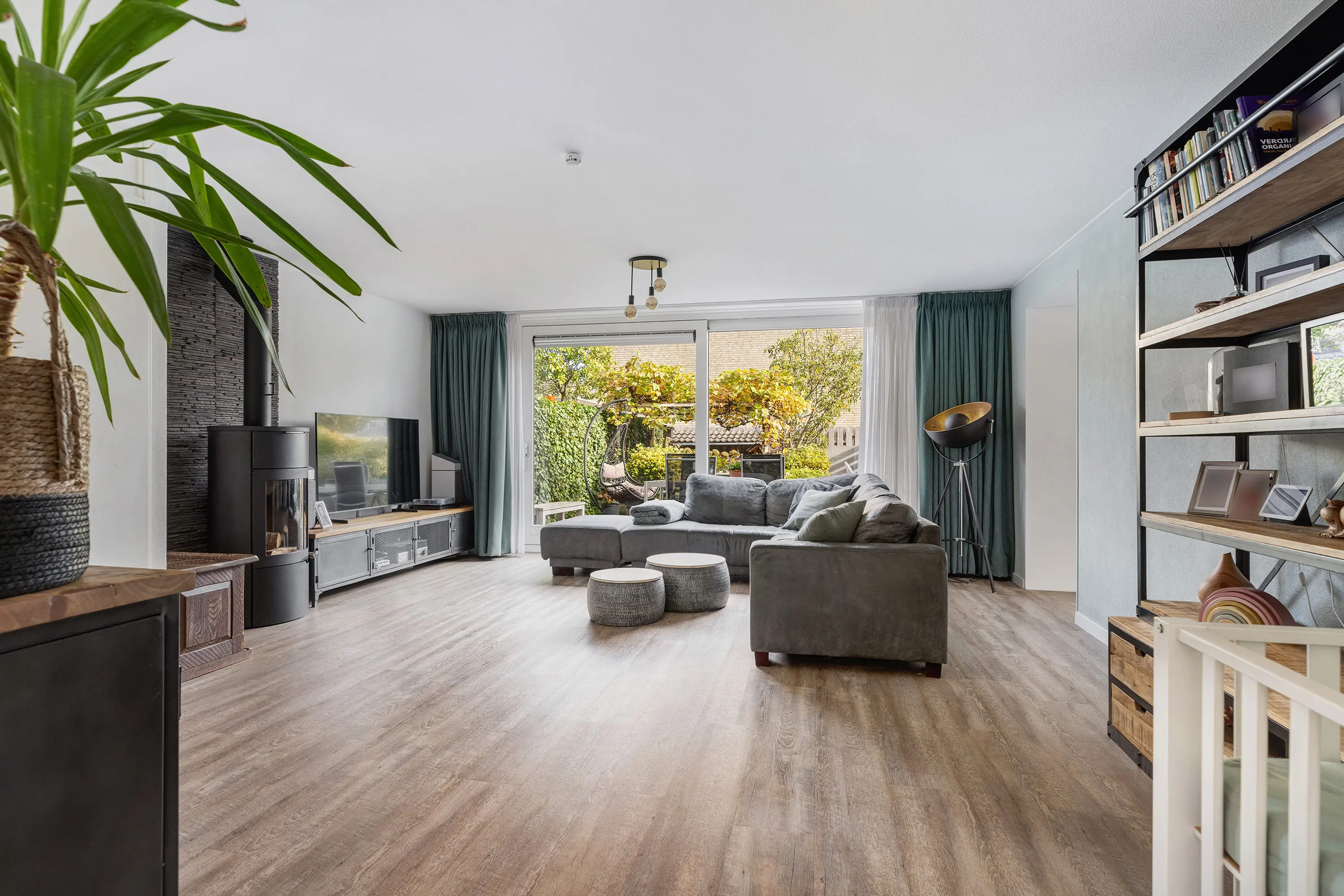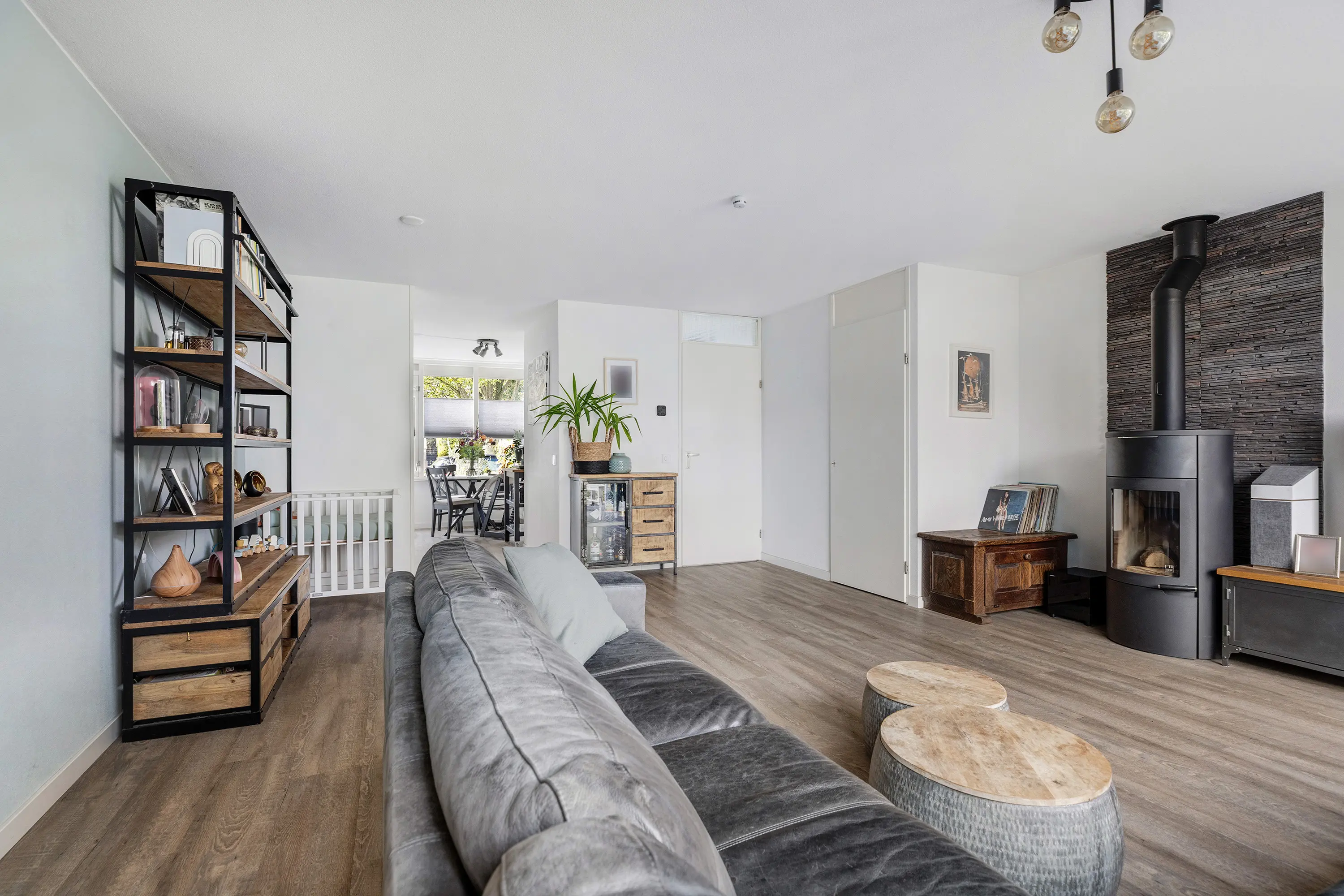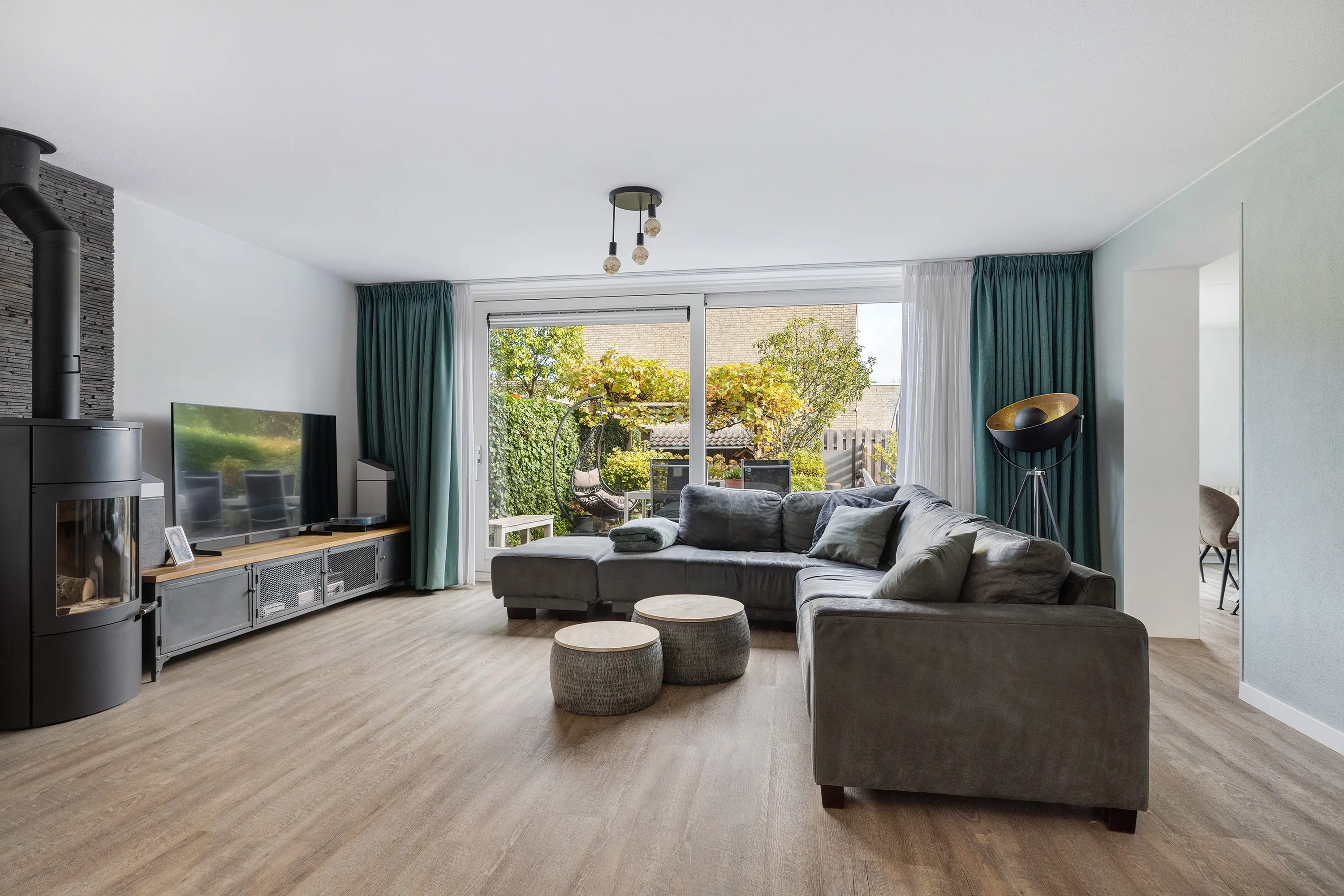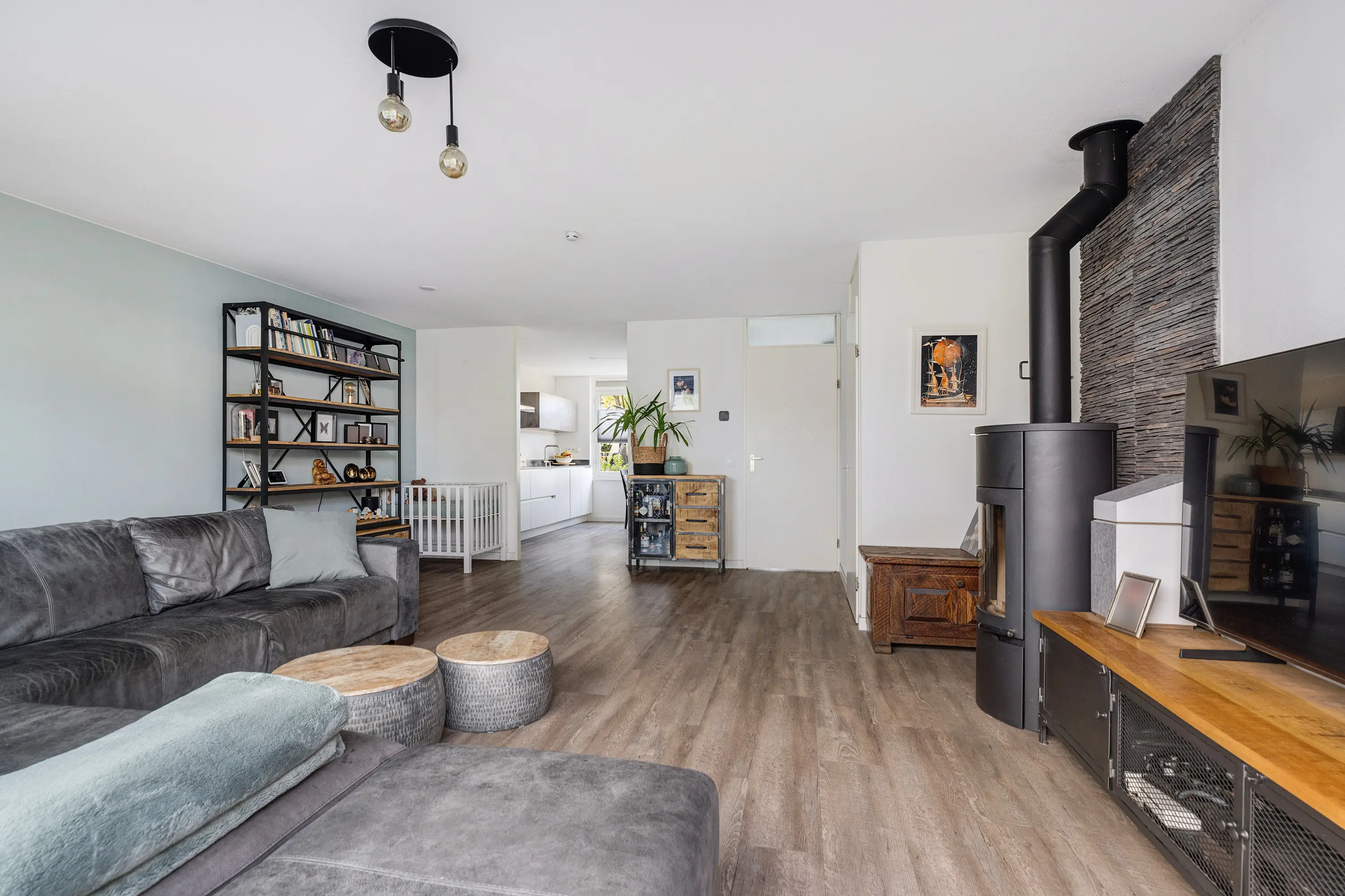 De woonkamer (ca. 34 m²) is heerlijk licht dankzij de brede schuifpui aan de achterzijde en is voorzien van een PVC-vloer met vloerverwarming. De vrijstaande houtkachel zorgt voor extra sfeer en warmte tijdens koude dagen. Onder de trap bevindt zich een handige trapkast voor extra bergruimte.