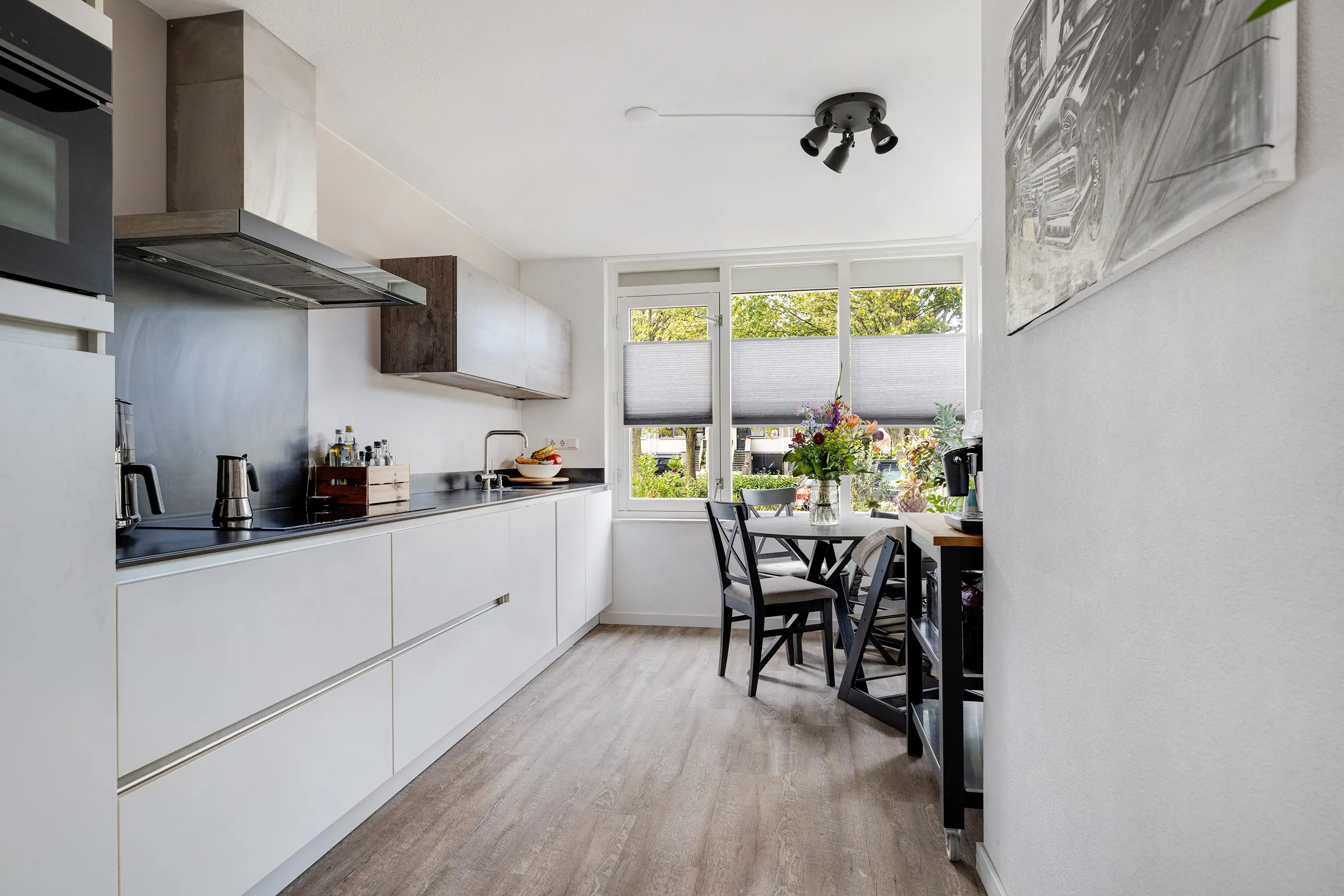 Aan de voorzijde ligt de woonkeuken (ca. 11 m²), met grote ramen en uitzicht op de singel. De keuken is modern uitgevoerd in een rechte opstelling en voorzien van een inductiekookplaat met RVS afzuigkap, combi-oven, koelkast, vaatwasser en een kokend waterkraan. Hier is voldoende plek voor een eettafel, een echte woonkeuken waar je samen kunt koken en tafelen.