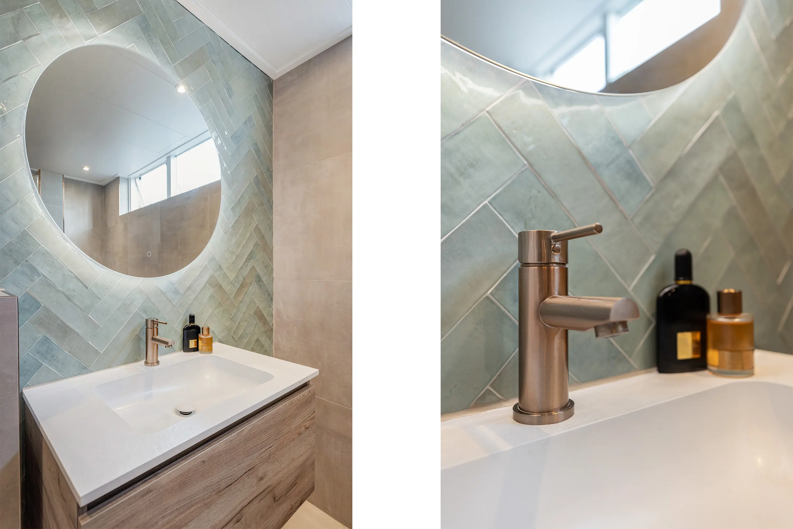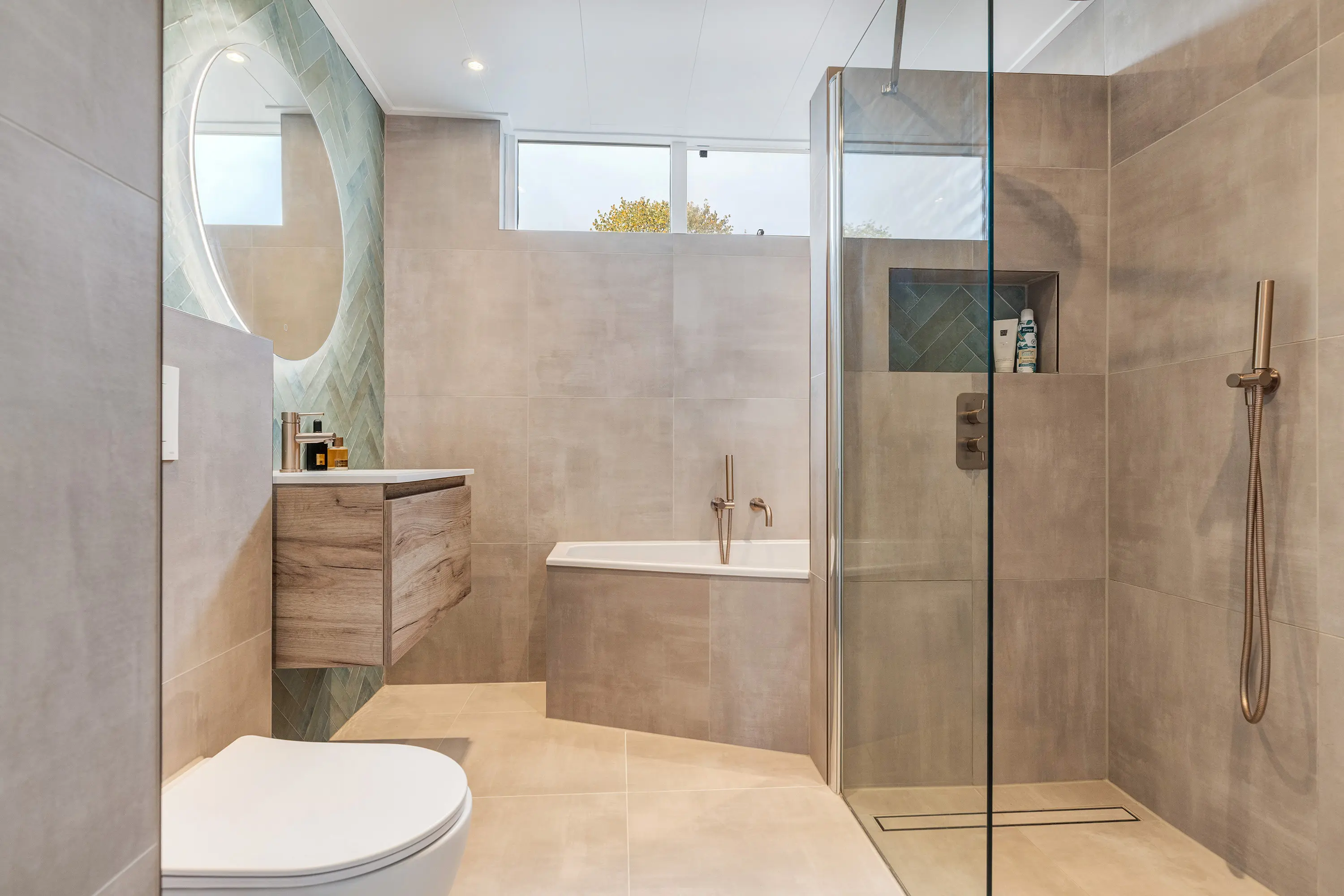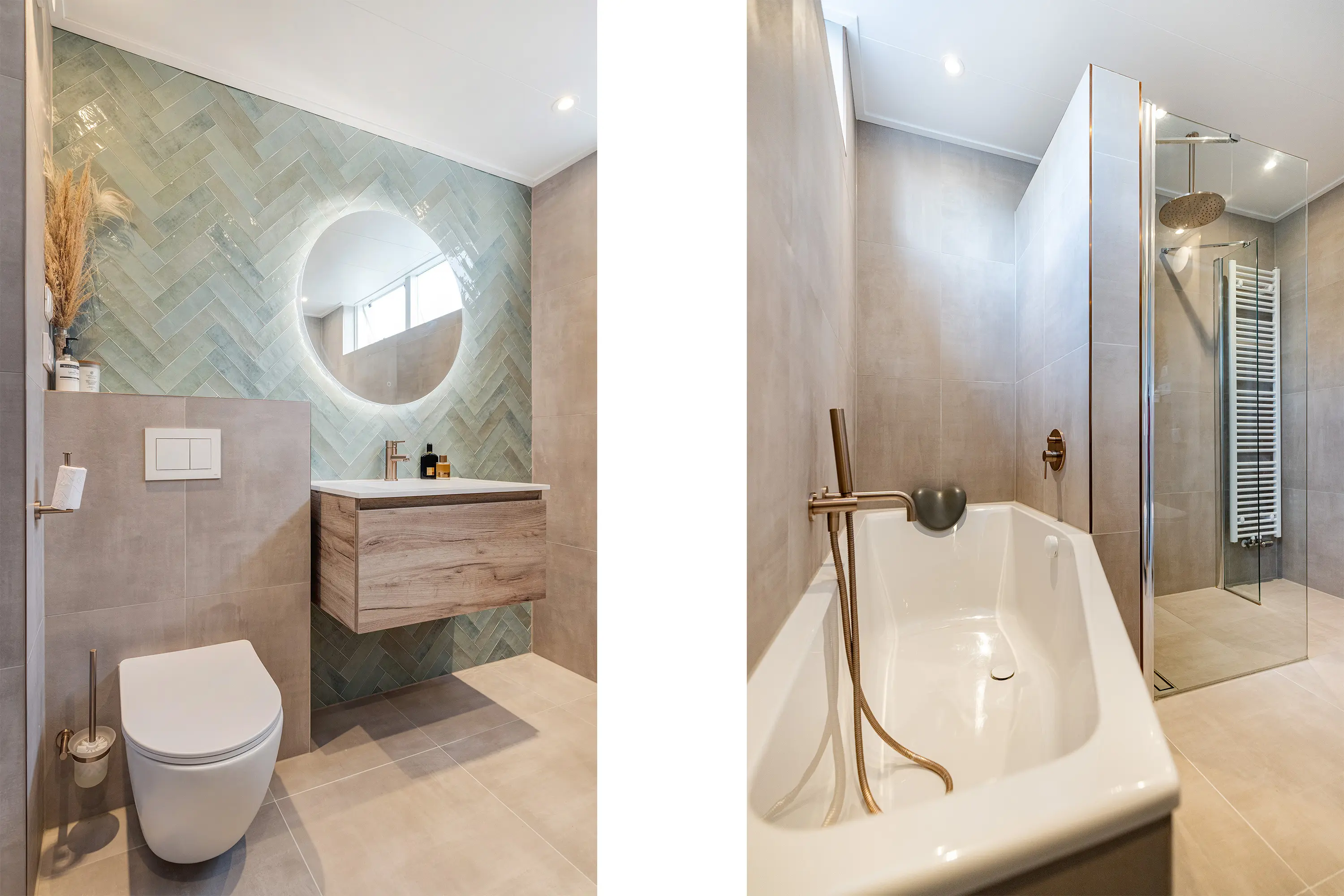 De badkamer (ca. 6 m²), vernieuwd in 2023, is een ware blikvanger. De combinatie van beige tinten, een houten wastafelmeubel en diagonaal betegelde groene wandtegels zorgt voor een moderne en warme uitstraling. De badkamer beschikt over een ligbad, een aparte inloopdouche met glazen wand, en stijlvolle rosékleurige kranen en regendouche. De verlichte en verwarmde spiegel maakt het geheel compleet.