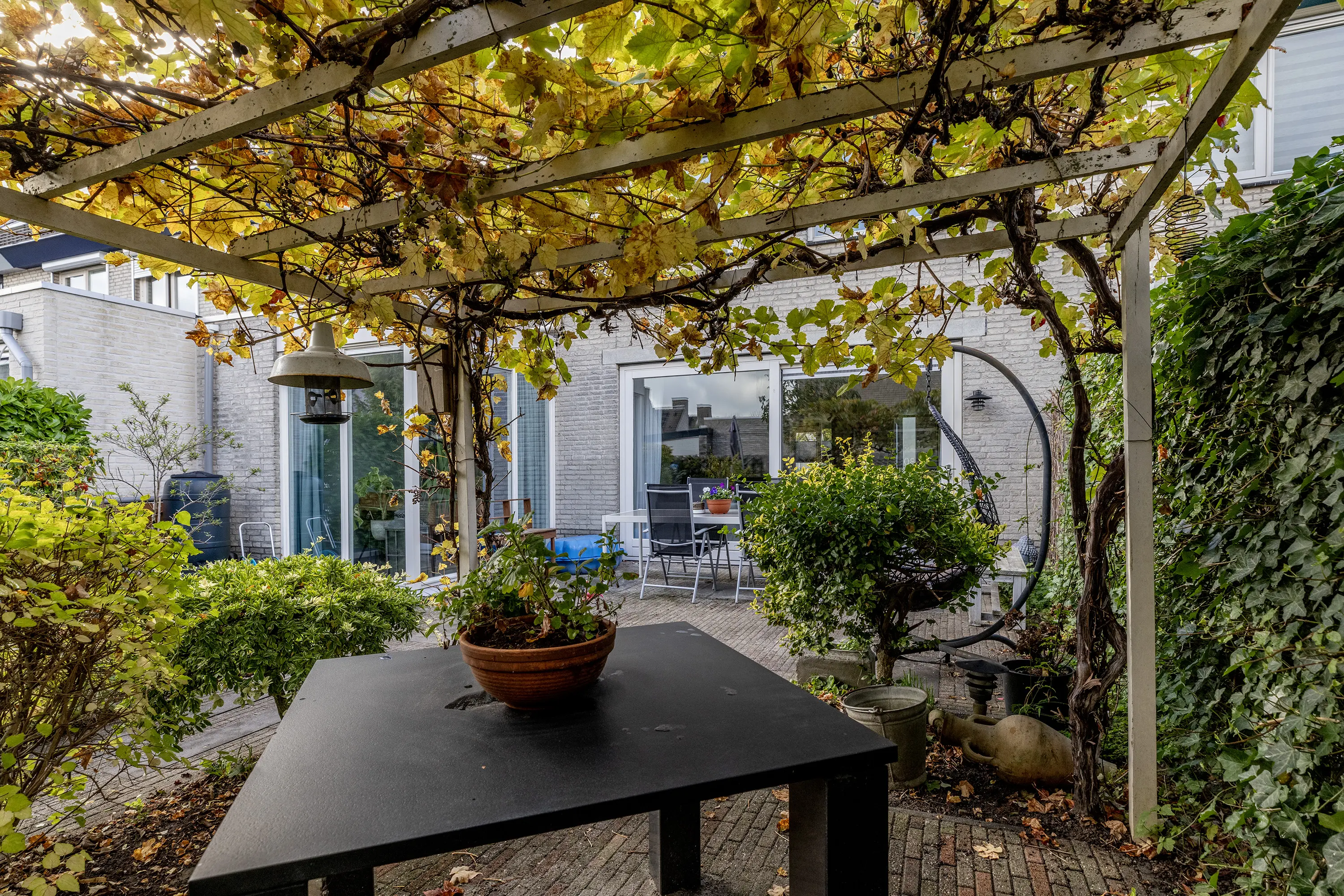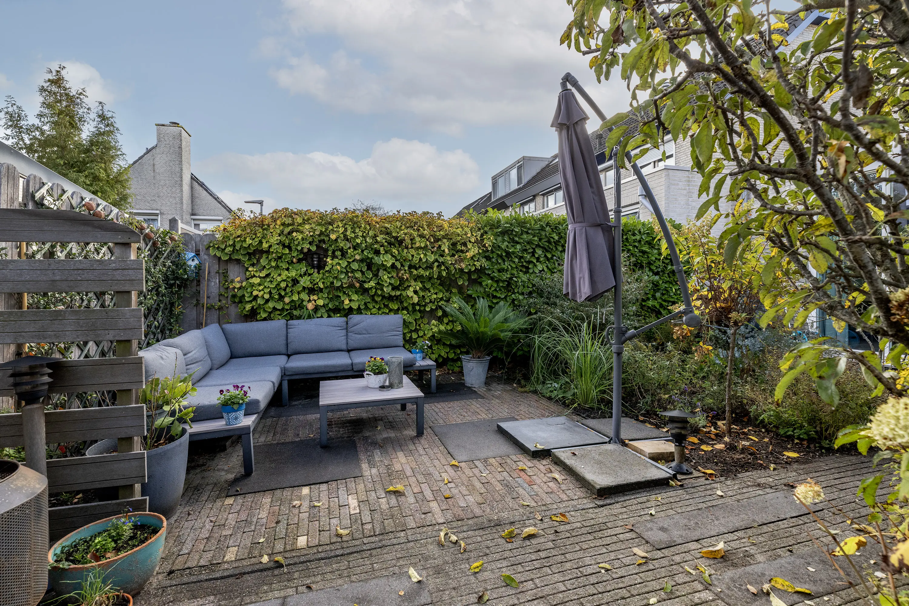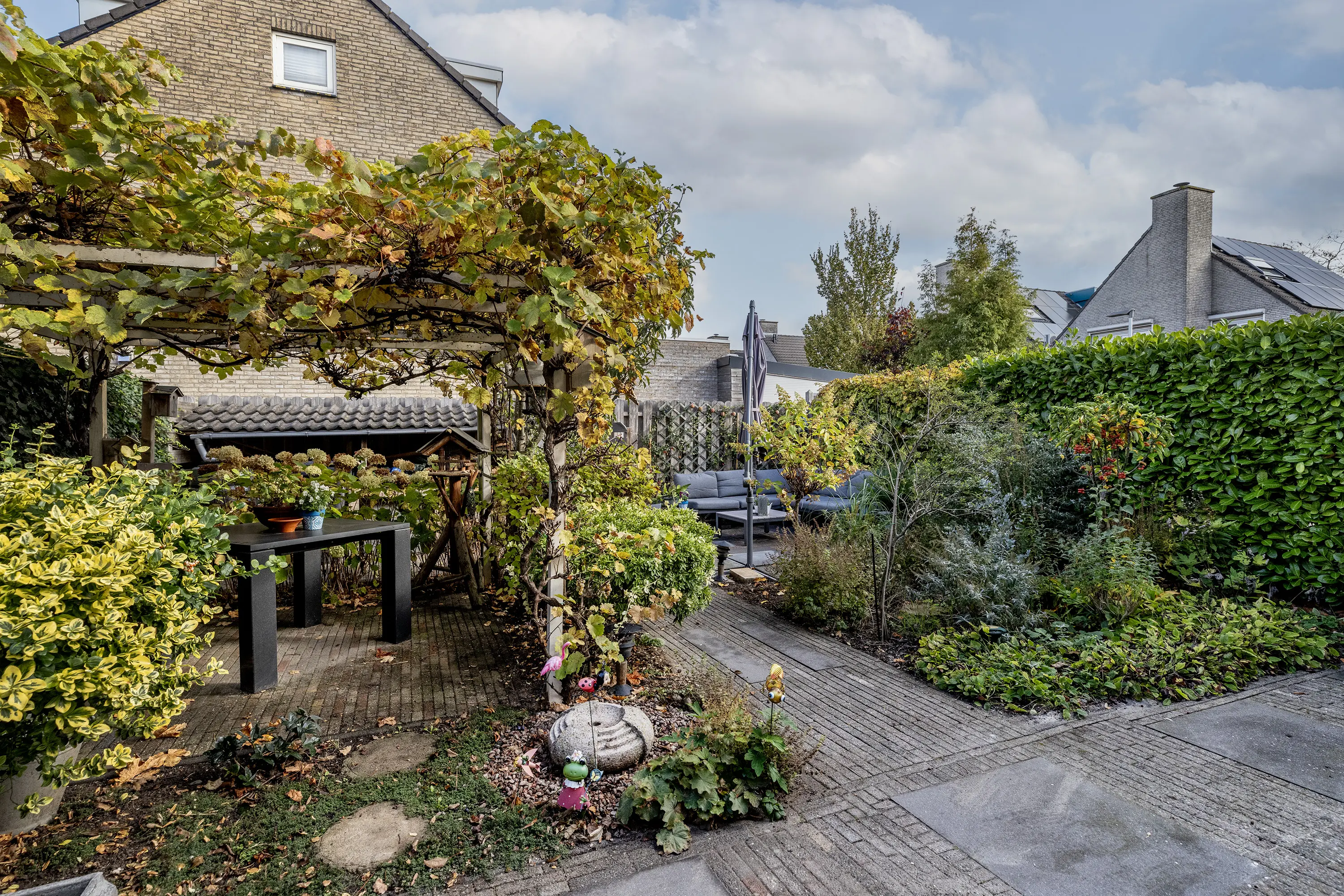 De achtertuin ligt op het noordoosten en is sfeervol aangelegd met veel groen, sierbestrating en een prachtige pergola begroeid met druivenranken. Verder vind je hier een appelboom, een kruidentuin, een regenwatertank en een ruim houthok, een heerlijke tuin waar binnen en buiten in elkaar overlopen.